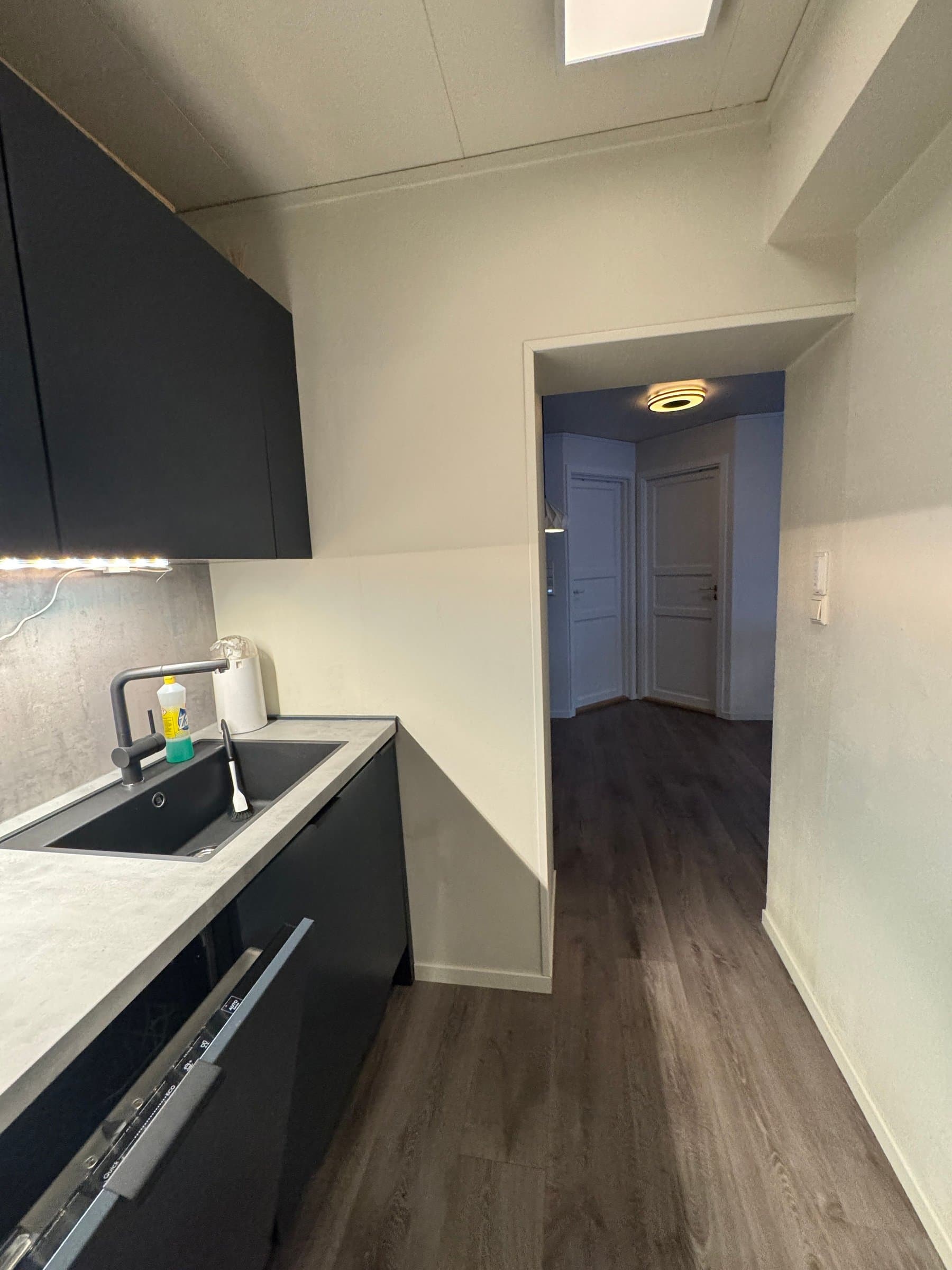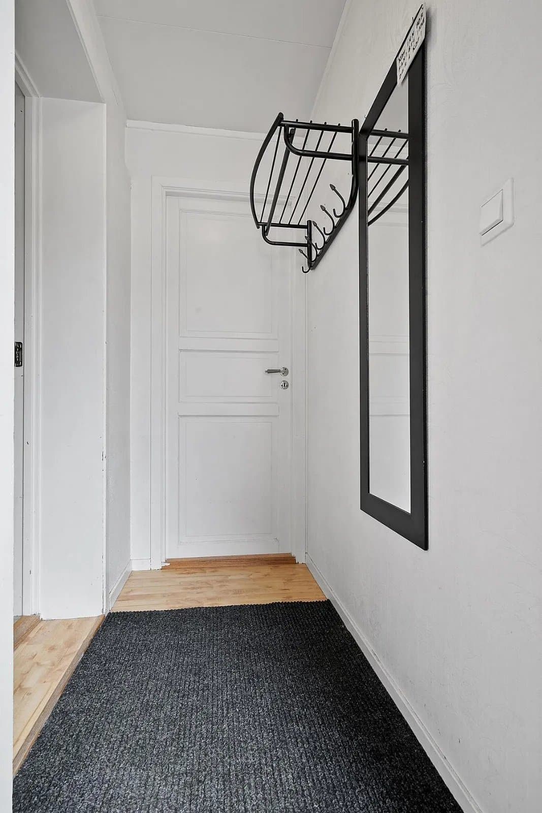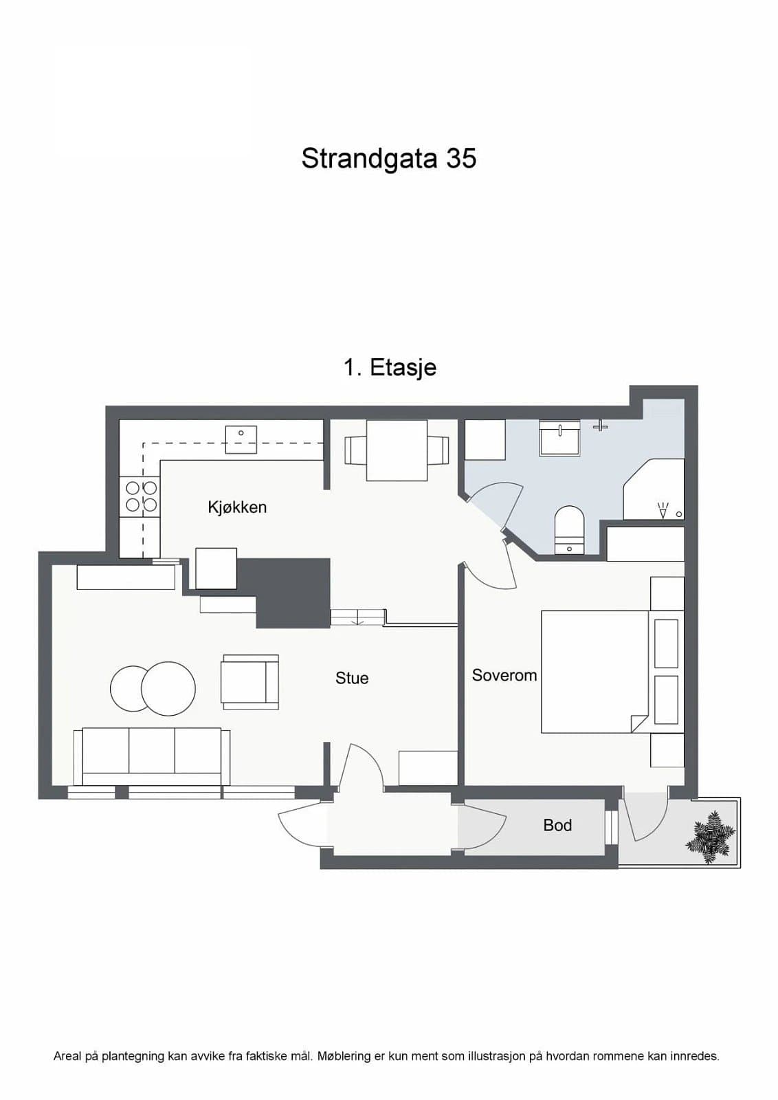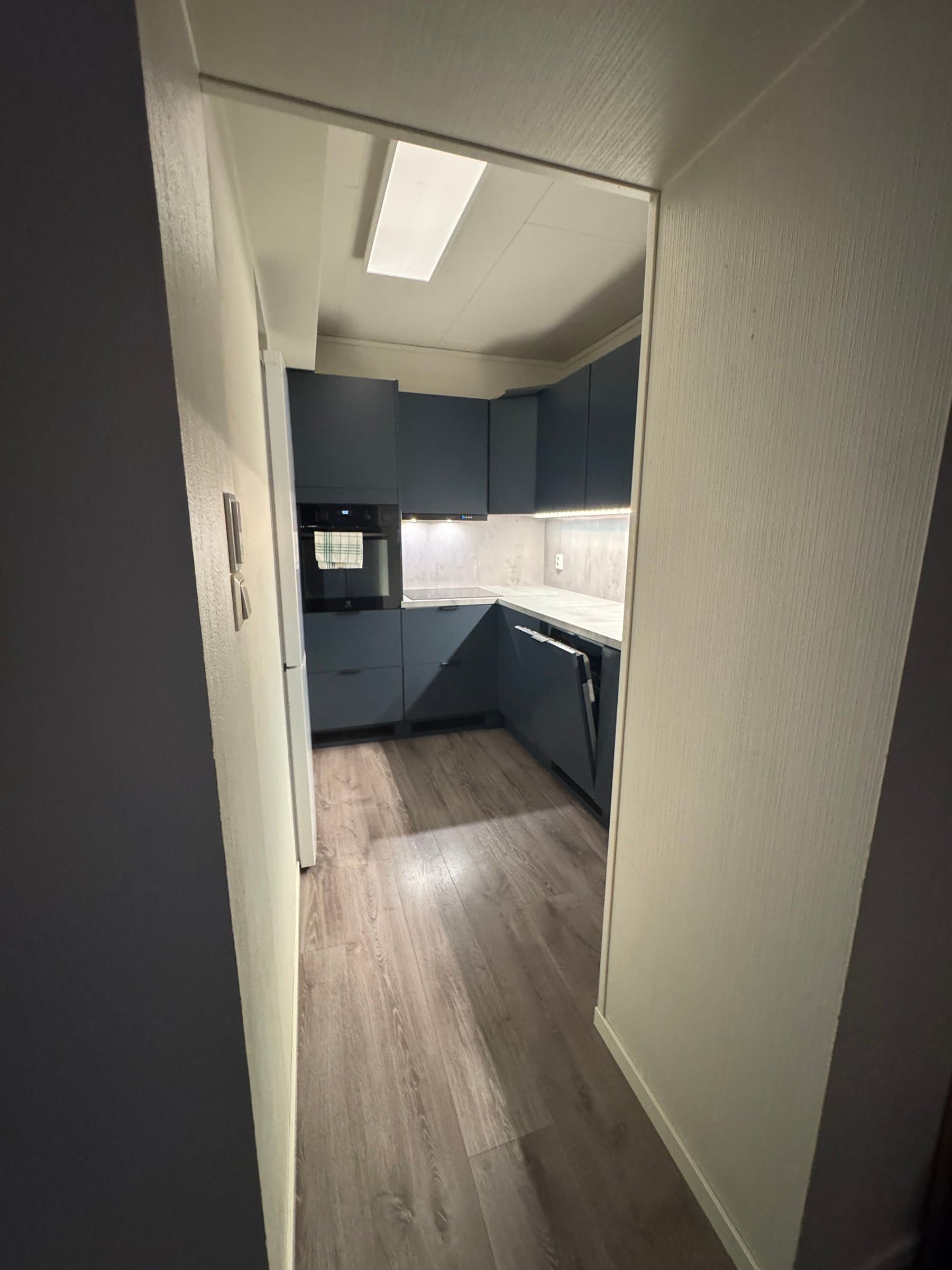 Vindfang/gang Boligen har direkte adkomst via overbygd trapp fra gateplan. Vindfanget gir et meget godt førsteinntrykk av leiligheten og er pent innredet med laminat på gulv og hvitmalte vegger. Det er montert åpen garderobeløsning, og direkte tilknyttet innvendig bod. Fra vindfanget er det inngang til en tilsvarende lys entrédel mot stuen, der det er montert en praktisk skyvedørsgarderobe for oppbevaring og oppheng av ytterklær. Kjøkken oppgradert i 2020 Kjøkkenet er designet i en hendig L-form og byr på god benke- og lagringsplass. Innredningen har Blå, glatte fronter, betongfarget laminatbenkeplater, og underlimtvaske. Over benken er det montert belysning og betongfargede våtromsplater. Videre har kjøkkenet ventilator over kokesone, integrert stekeovn , integrert koketopp , plass for kjøleskap og integrert oppvaskmaskin. På gulvet er det lagt laminat. Stue/spisestue Leiligheten har en romslig og særdeles tiltalende vinkelstue over to nivåer. Hit strømmer dagslyset inn i rikelig monn fra gode, sydøstvendte vindusflater. Salongdelen har sjenerøs takhøyde, laminatgulv, hvitmalte vegger, brytningsvegg i Osloblå, samt god plass for sofaløsning med tilhørende møblement. To trinn opp innbyr spisestuen til hyggelig middagsselskaper i gode venners lag. Laminatgulv og hvitmalte vegger er smakfullt oppbrutt av en lysgrå brytningsvegg. Ut mot stuen er det hvitmalt rekkverk. Selvsagt er det god plass for spisebord. Bad/wc/vaskerom Det delikate badet ble oppgradert i 2018. Det ble lagt nytt, grått gulvbelegg, montert hvite flisplater på vegg, samt nytt sanitærutstyr og innredning. Rommet har gulvvarme, trippelt speilskap med overlys, og heldekkende servant på mørkt servantmøblement. I tillegg finnes det gulvstående toalett, dusjkabinett med vegger og skyvedør i glass, samt opplegg for vaskemaskin og tørketrommel. Soverom og garderobe Boligen har et stort og pent soverom med direkte utgang til den lune luftebalkongen. Rommet har laminatgulv, Osloblå vegger,en hvitmalt brytningsvegg og to doble, integrerte garderober