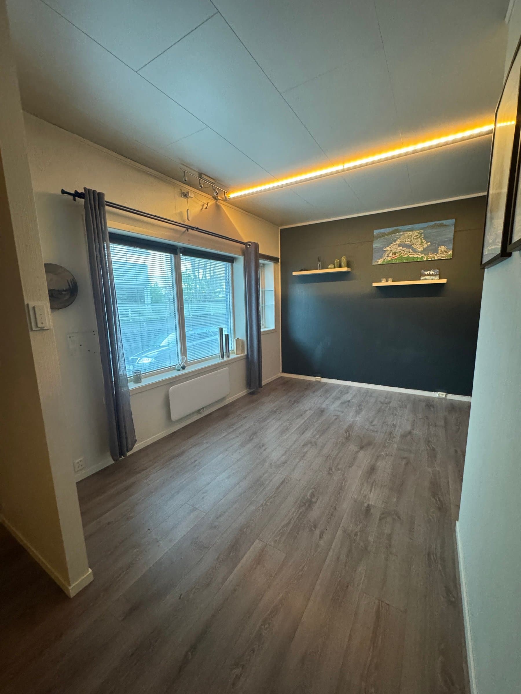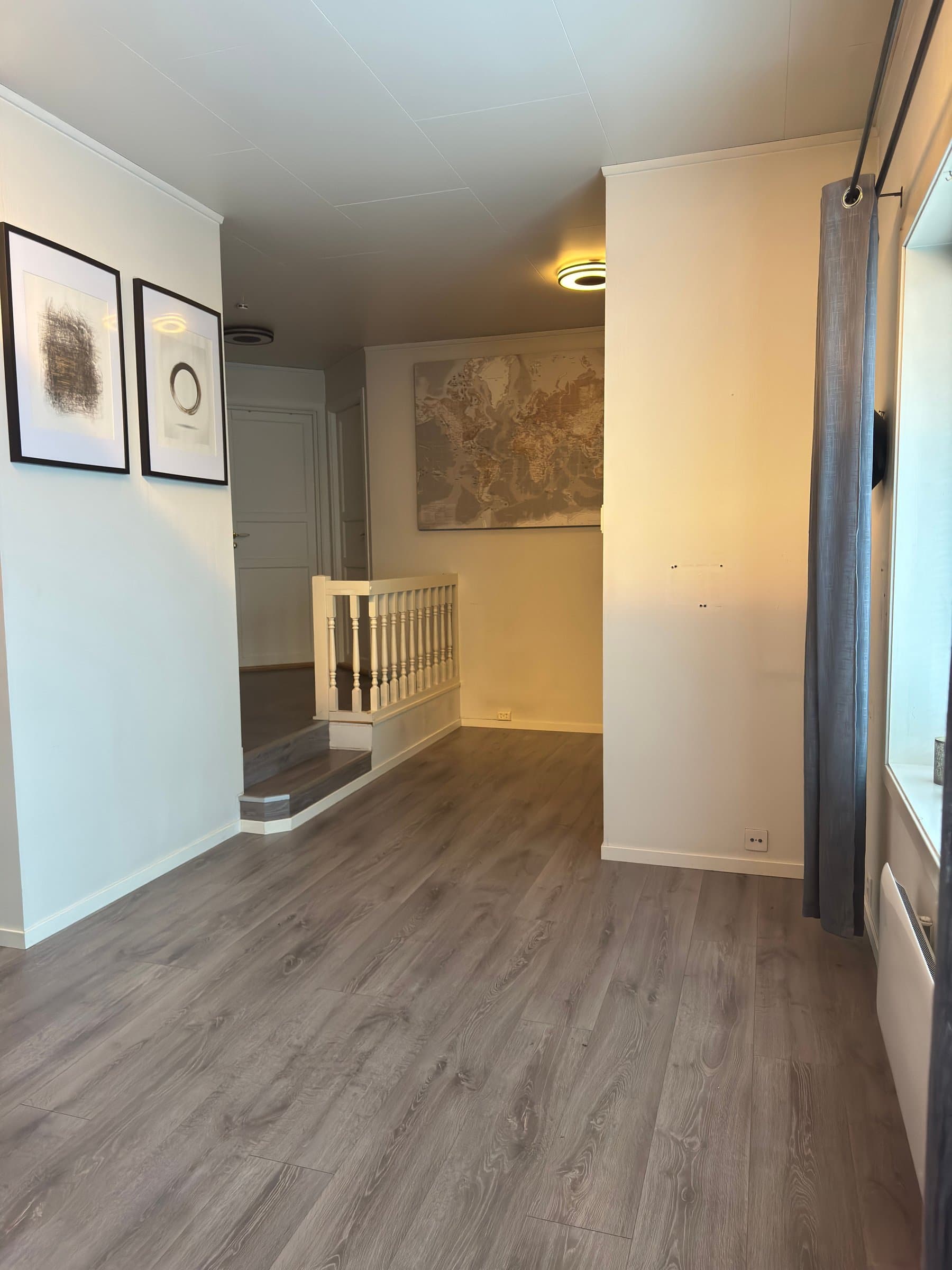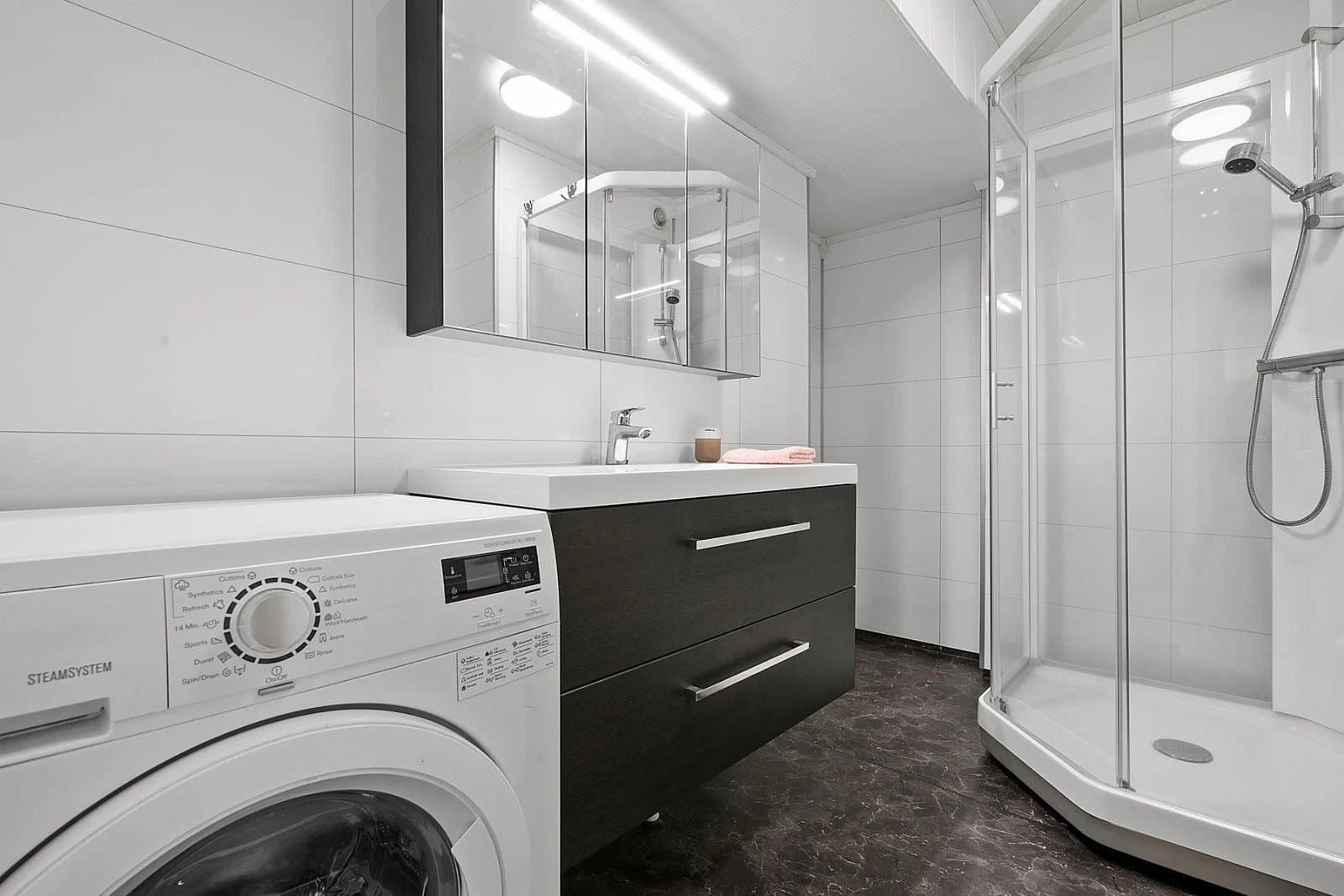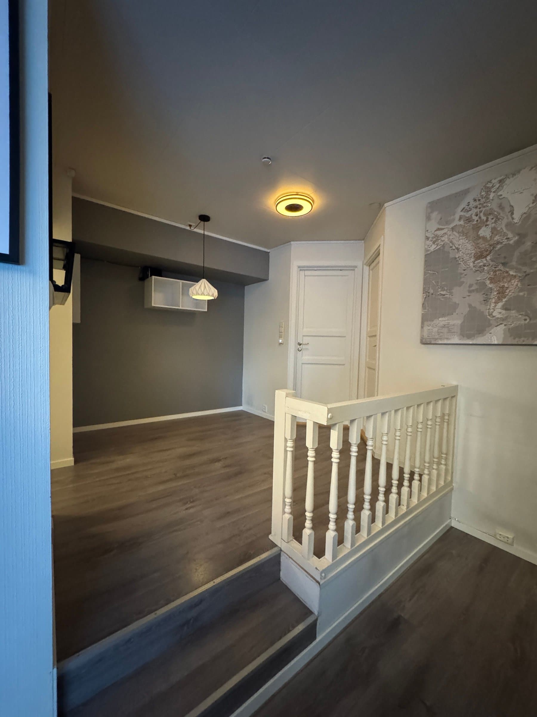 Vindfang/gang Boligen har direkte adkomst via overbygd trapp fra gateplan. Vindfanget gir et meget godt førsteinntrykk av leiligheten og er pent innredet med laminat på gulv og hvitmalte vegger. Det er montert åpen garderobeløsning, og direkte tilknyttet innvendig bod. Fra vindfanget er det inngang til en tilsvarende lys entrédel mot stuen, der det er montert en praktisk skyvedørsgarderobe for oppbevaring og oppheng av ytterklær. Kjøkken oppgradert i 2020 Kjøkkenet er designet i en hendig L-form og byr på god benke- og lagringsplass. Innredningen har Blå, glatte fronter, betongfarget laminatbenkeplater, og underlimtvaske. Over benken er det montert belysning og betongfargede våtromsplater. Videre har kjøkkenet ventilator over kokesone, integrert stekeovn , integrert koketopp , plass for kjøleskap og integrert oppvaskmaskin. På gulvet er det lagt laminat. Stue/spisestue Leiligheten har en romslig og særdeles tiltalende vinkelstue over to nivåer. Hit strømmer dagslyset inn i rikelig monn fra gode, sydøstvendte vindusflater. Salongdelen har sjenerøs takhøyde, laminatgulv, hvitmalte vegger, brytningsvegg i Osloblå, samt god plass for sofaløsning med tilhørende møblement. To trinn opp innbyr spisestuen til hyggelig middagsselskaper i gode venners lag. Laminatgulv og hvitmalte vegger er smakfullt oppbrutt av en lysgrå brytningsvegg. Ut mot stuen er det hvitmalt rekkverk. Selvsagt er det god plass for spisebord. Bad/wc/vaskerom Det delikate badet ble oppgradert i 2018. Det ble lagt nytt, grått gulvbelegg, montert hvite flisplater på vegg, samt nytt sanitærutstyr og innredning. Rommet har gulvvarme, trippelt speilskap med overlys, og heldekkende servant på mørkt servantmøblement. I tillegg finnes det gulvstående toalett, dusjkabinett med vegger og skyvedør i glass, samt opplegg for vaskemaskin og tørketrommel. Soverom og garderobe Boligen har et stort og pent soverom med direkte utgang til den lune luftebalkongen. Rommet har laminatgulv, Osloblå vegger,en hvitmalt brytningsvegg og to doble, integrerte garderober