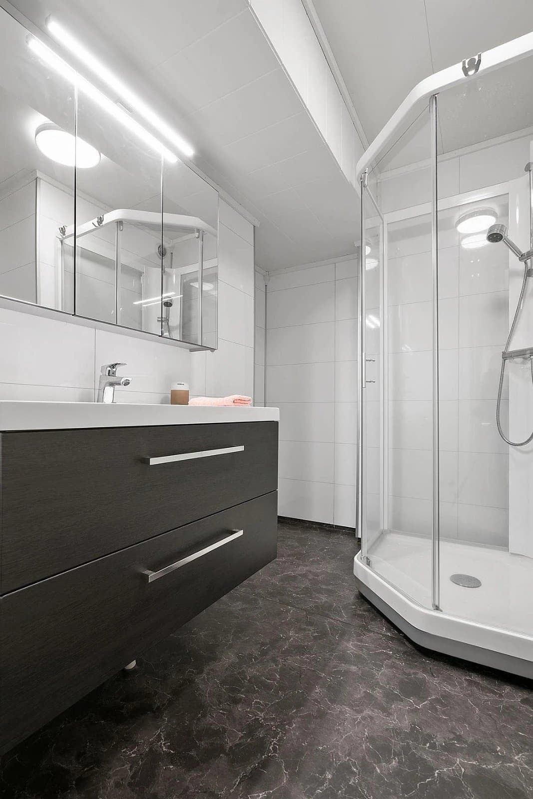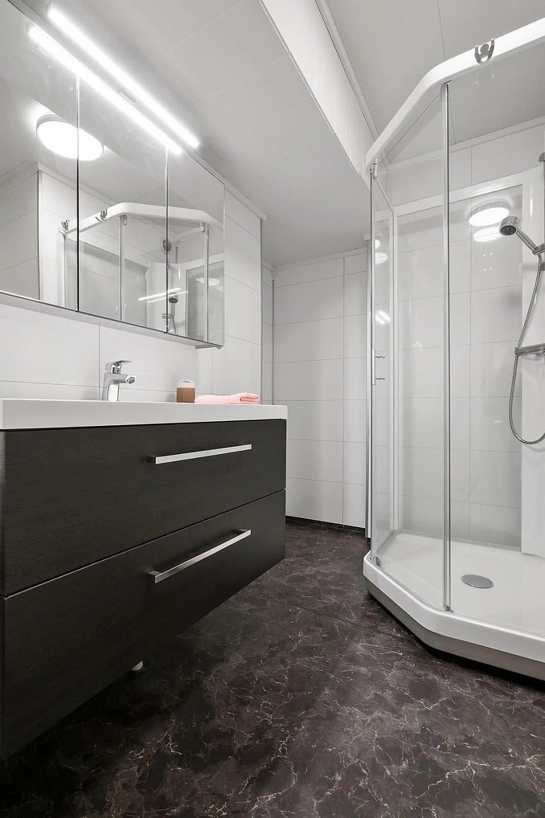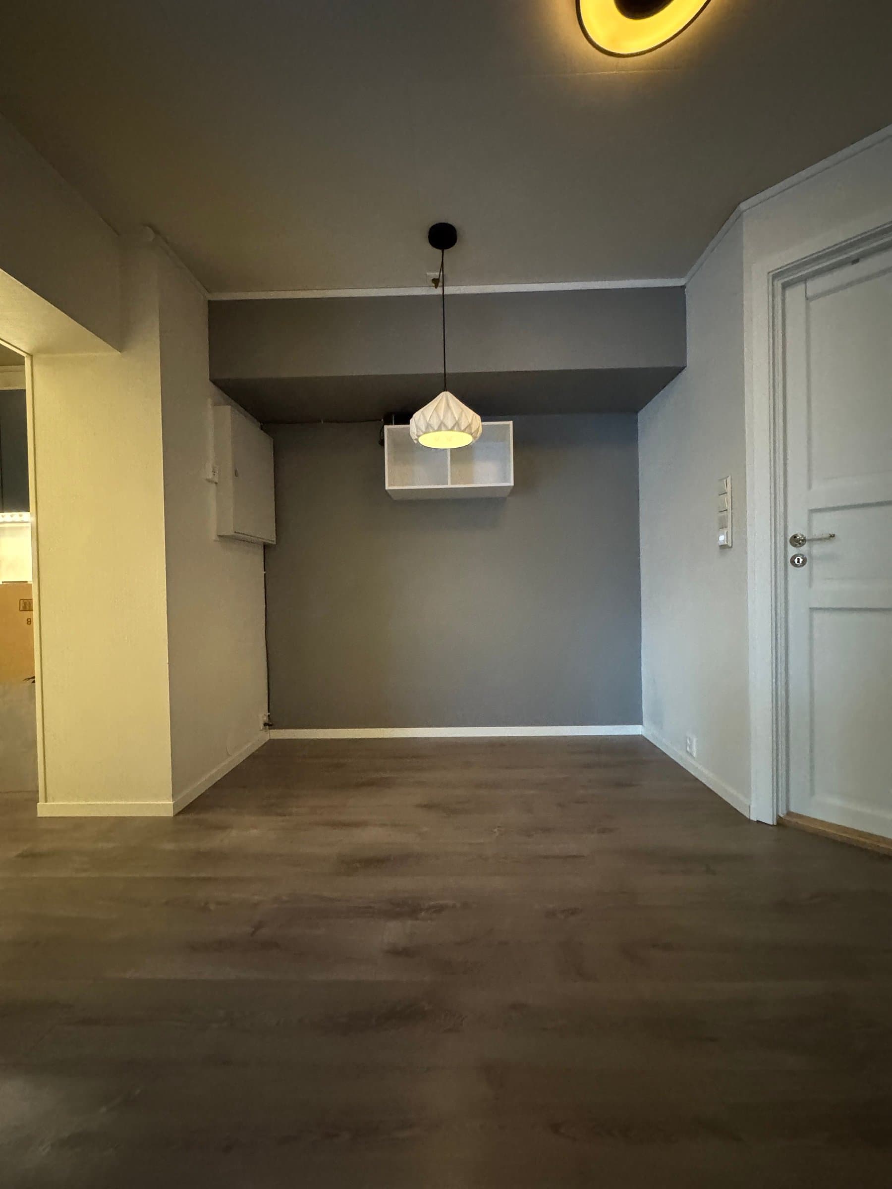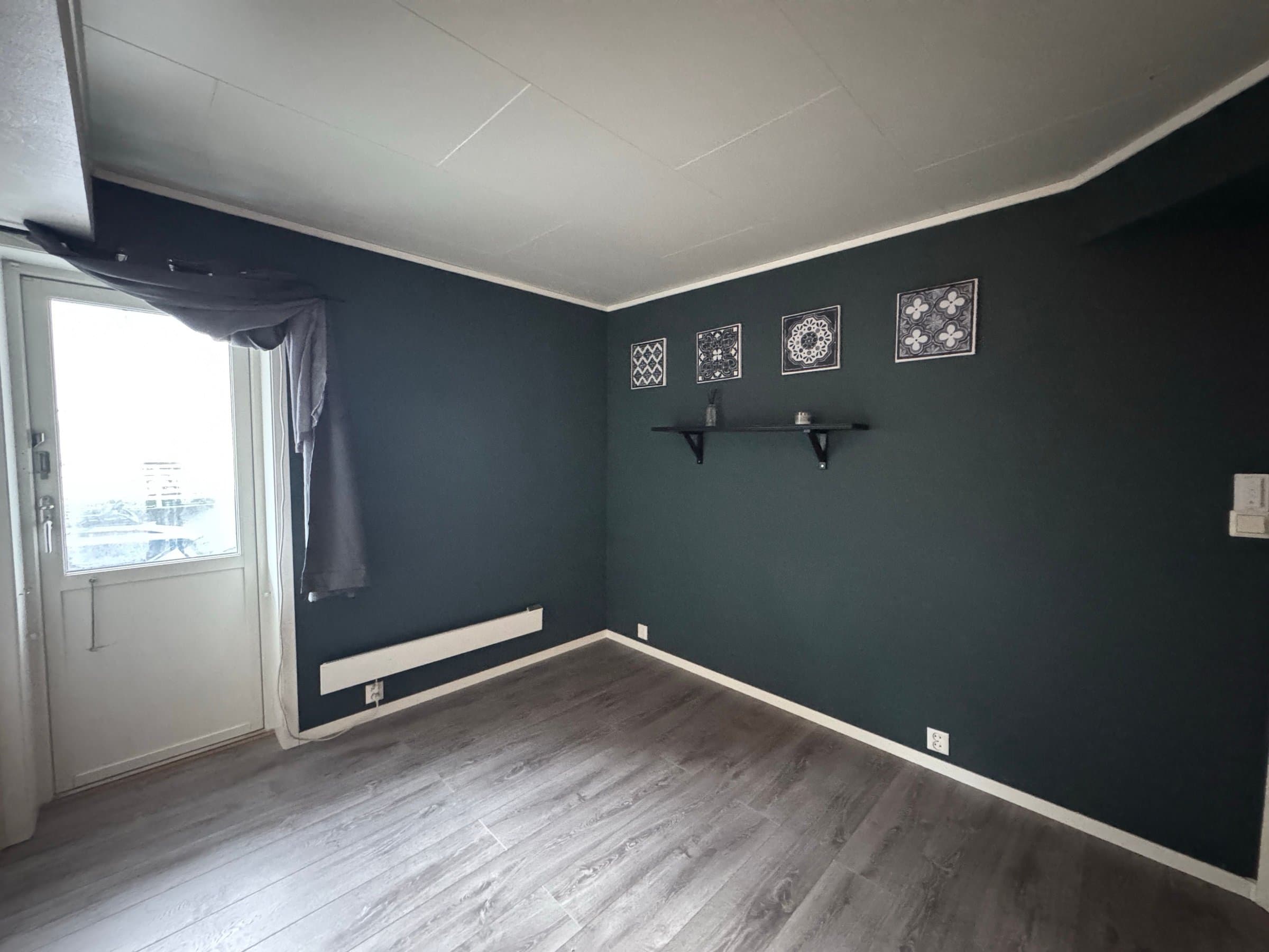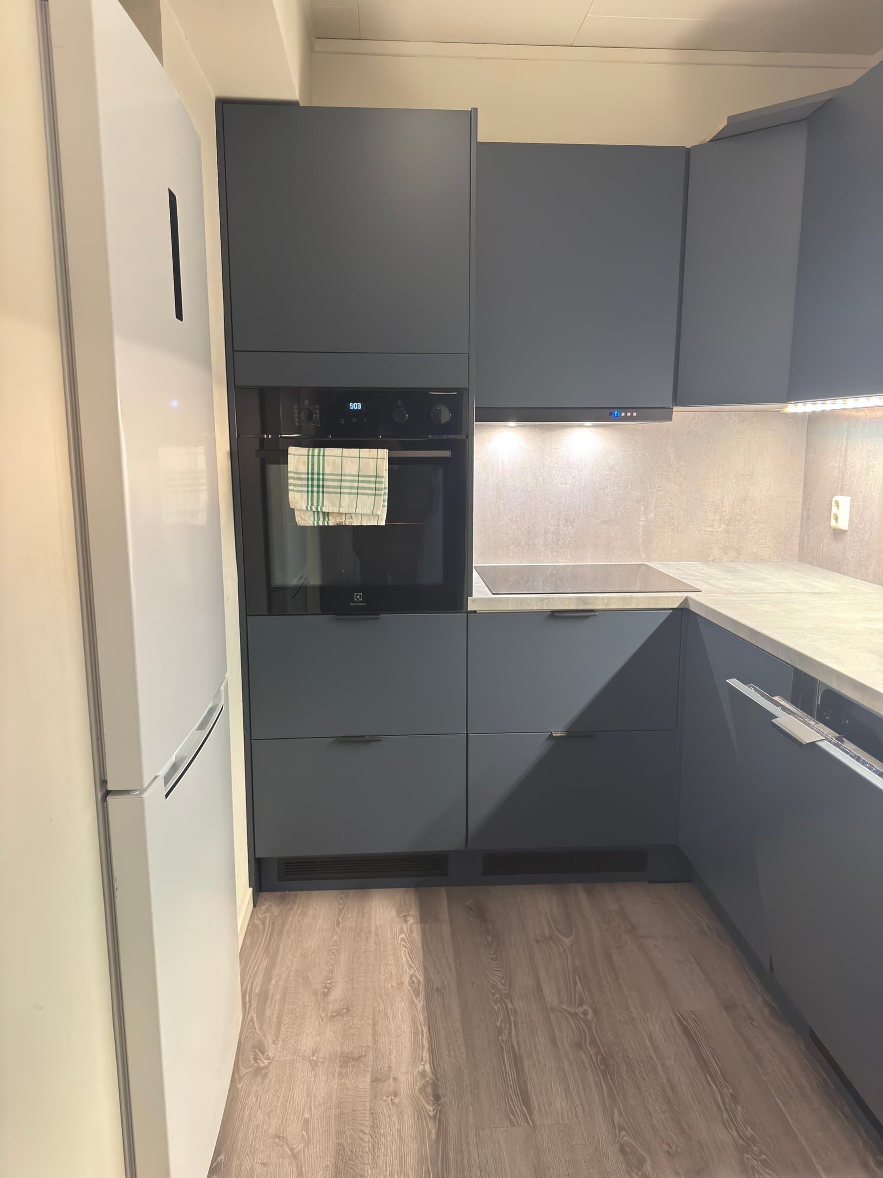 Vindfang/gang Boligen har direkte adkomst via overbygd trapp fra gateplan. Vindfanget gir et meget godt førsteinntrykk av leiligheten og er pent innredet med laminat på gulv og hvitmalte vegger. Det er montert åpen garderobeløsning, og direkte tilknyttet innvendig bod. Fra vindfanget er det inngang til en tilsvarende lys entrédel mot stuen, der det er montert en praktisk skyvedørsgarderobe for oppbevaring og oppheng av ytterklær. Kjøkken oppgradert i 2020 Kjøkkenet er designet i en hendig L-form og byr på god benke- og lagringsplass. Innredningen har Blå, glatte fronter, betongfarget laminatbenkeplater, og underlimtvaske. Over benken er det montert belysning og betongfargede våtromsplater. Videre har kjøkkenet ventilator over kokesone, integrert stekeovn , integrert koketopp , plass for kjøleskap og integrert oppvaskmaskin. På gulvet er det lagt laminat. Stue/spisestue Leiligheten har en romslig og særdeles tiltalende vinkelstue over to nivåer. Hit strømmer dagslyset inn i rikelig monn fra gode, sydøstvendte vindusflater. Salongdelen har sjenerøs takhøyde, laminatgulv, hvitmalte vegger, brytningsvegg i Osloblå, samt god plass for sofaløsning med tilhørende møblement. To trinn opp innbyr spisestuen til hyggelig middagsselskaper i gode venners lag. Laminatgulv og hvitmalte vegger er smakfullt oppbrutt av en lysgrå brytningsvegg. Ut mot stuen er det hvitmalt rekkverk. Selvsagt er det god plass for spisebord. Bad/wc/vaskerom Det delikate badet ble oppgradert i 2018. Det ble lagt nytt, grått gulvbelegg, montert hvite flisplater på vegg, samt nytt sanitærutstyr og innredning. Rommet har gulvvarme, trippelt speilskap med overlys, og heldekkende servant på mørkt servantmøblement. I tillegg finnes det gulvstående toalett, dusjkabinett med vegger og skyvedør i glass, samt opplegg for vaskemaskin og tørketrommel. Soverom og garderobe Boligen har et stort og pent soverom med direkte utgang til den lune luftebalkongen. Rommet har laminatgulv, Osloblå vegger,en hvitmalt brytningsvegg og to doble, integrerte garderober