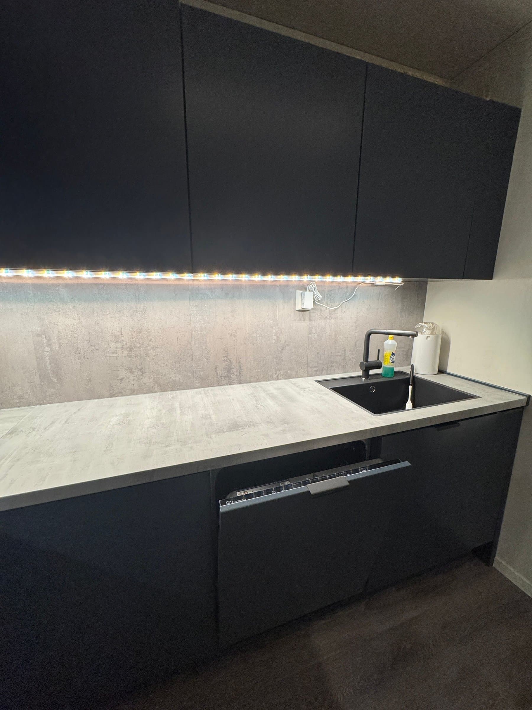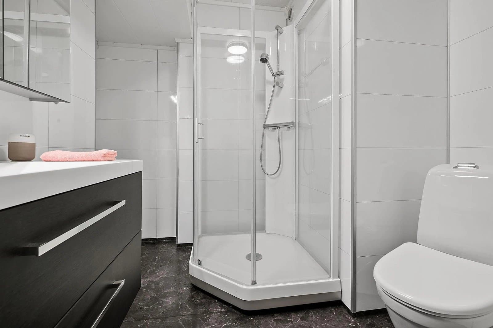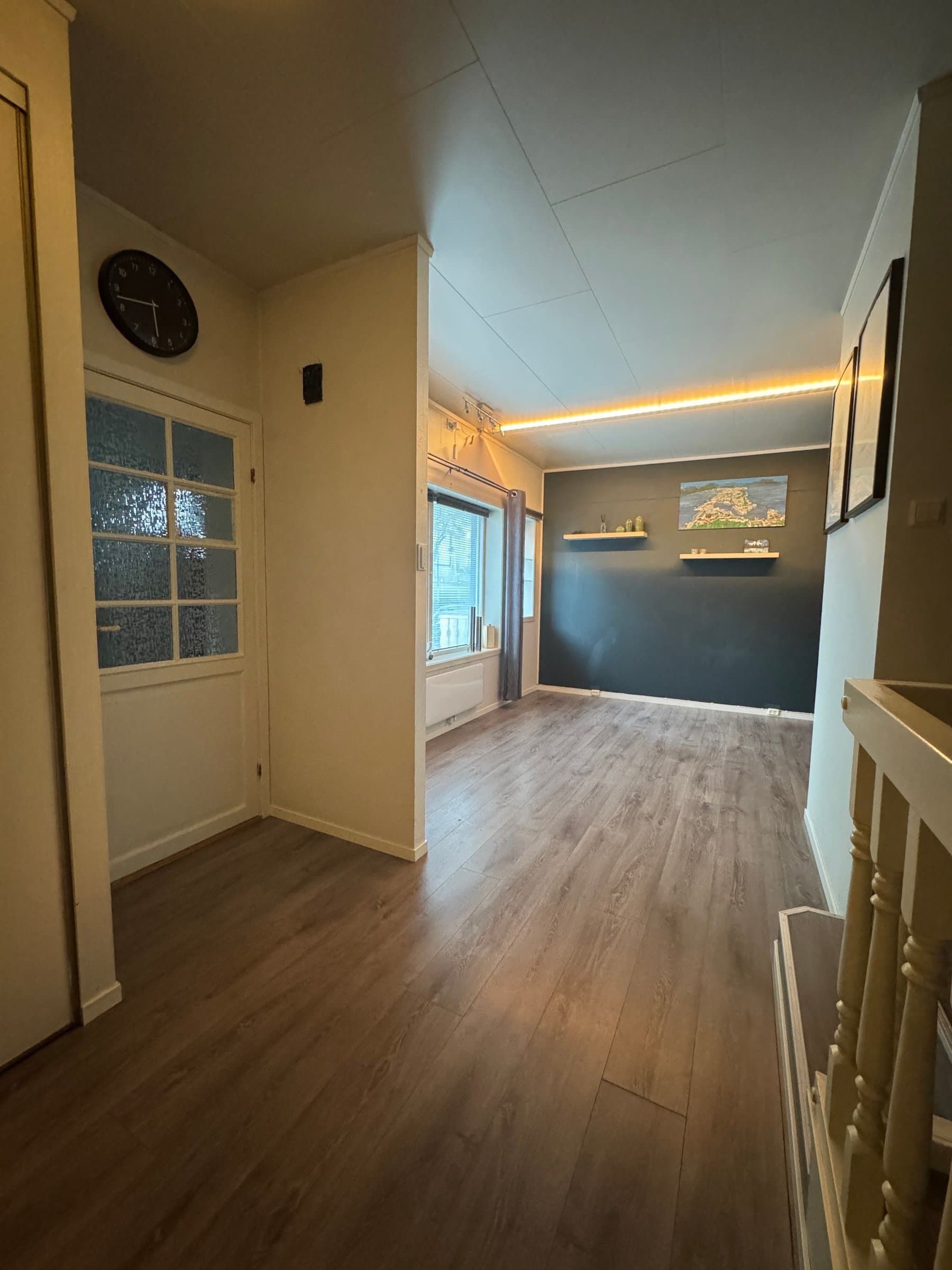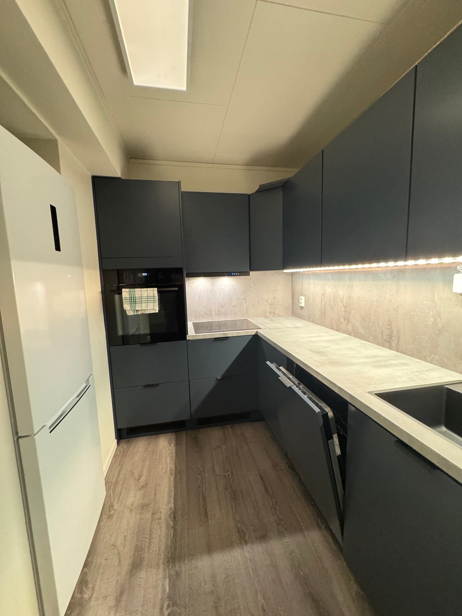 Vindfang/gang Boligen har direkte adkomst via overbygd trapp fra gateplan. Vindfanget gir et meget godt førsteinntrykk av leiligheten og er pent innredet med laminat på gulv og hvitmalte vegger. Det er montert åpen garderobeløsning, og direkte tilknyttet innvendig bod. Fra vindfanget er det inngang til en tilsvarende lys entrédel mot stuen, der det er montert en praktisk skyvedørsgarderobe for oppbevaring og oppheng av ytterklær. Kjøkken oppgradert i 2020 Kjøkkenet er designet i en hendig L-form og byr på god benke- og lagringsplass. Innredningen har Blå, glatte fronter, betongfarget laminatbenkeplater, og underlimtvaske. Over benken er det montert belysning og betongfargede våtromsplater. Videre har kjøkkenet ventilator over kokesone, integrert stekeovn , integrert koketopp , plass for kjøleskap og integrert oppvaskmaskin. På gulvet er det lagt laminat. Stue/spisestue Leiligheten har en romslig og særdeles tiltalende vinkelstue over to nivåer. Hit strømmer dagslyset inn i rikelig monn fra gode, sydøstvendte vindusflater. Salongdelen har sjenerøs takhøyde, laminatgulv, hvitmalte vegger, brytningsvegg i Osloblå, samt god plass for sofaløsning med tilhørende møblement. To trinn opp innbyr spisestuen til hyggelig middagsselskaper i gode venners lag. Laminatgulv og hvitmalte vegger er smakfullt oppbrutt av en lysgrå brytningsvegg. Ut mot stuen er det hvitmalt rekkverk. Selvsagt er det god plass for spisebord. Bad/wc/vaskerom Det delikate badet ble oppgradert i 2018. Det ble lagt nytt, grått gulvbelegg, montert hvite flisplater på vegg, samt nytt sanitærutstyr og innredning. Rommet har gulvvarme, trippelt speilskap med overlys, og heldekkende servant på mørkt servantmøblement. I tillegg finnes det gulvstående toalett, dusjkabinett med vegger og skyvedør i glass, samt opplegg for vaskemaskin og tørketrommel. Soverom og garderobe Boligen har et stort og pent soverom med direkte utgang til den lune luftebalkongen. Rommet har laminatgulv, Osloblå vegger,en hvitmalt brytningsvegg og to doble, integrerte garderober