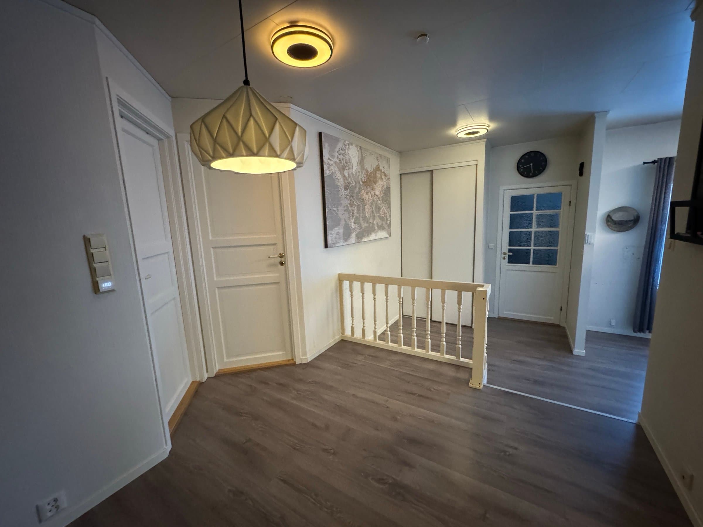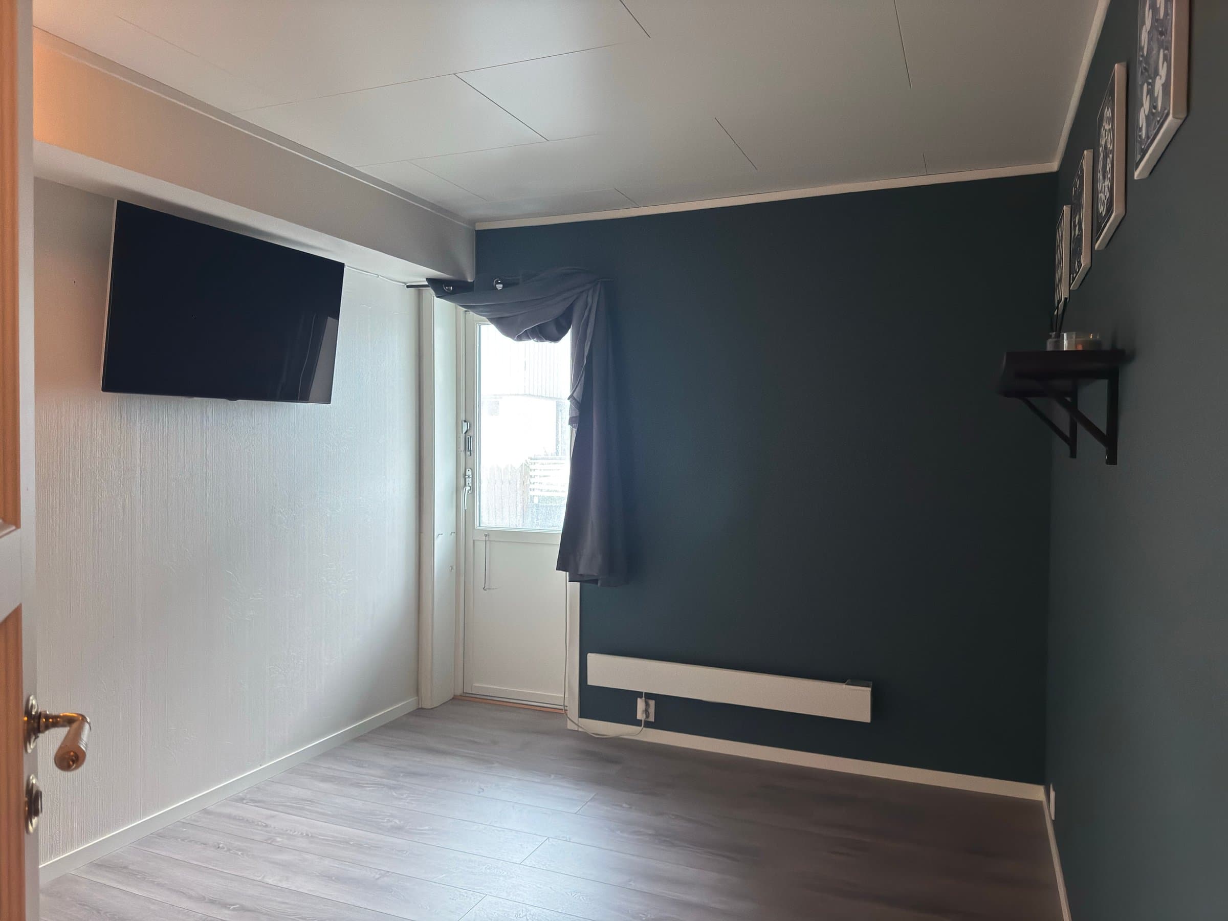Gulv: parkettlaminat, pvc-belegg Vegger: malt miljøtapet/glassfiberstrie,våtromsplater Tak/himlinger: malte himlingsplater.