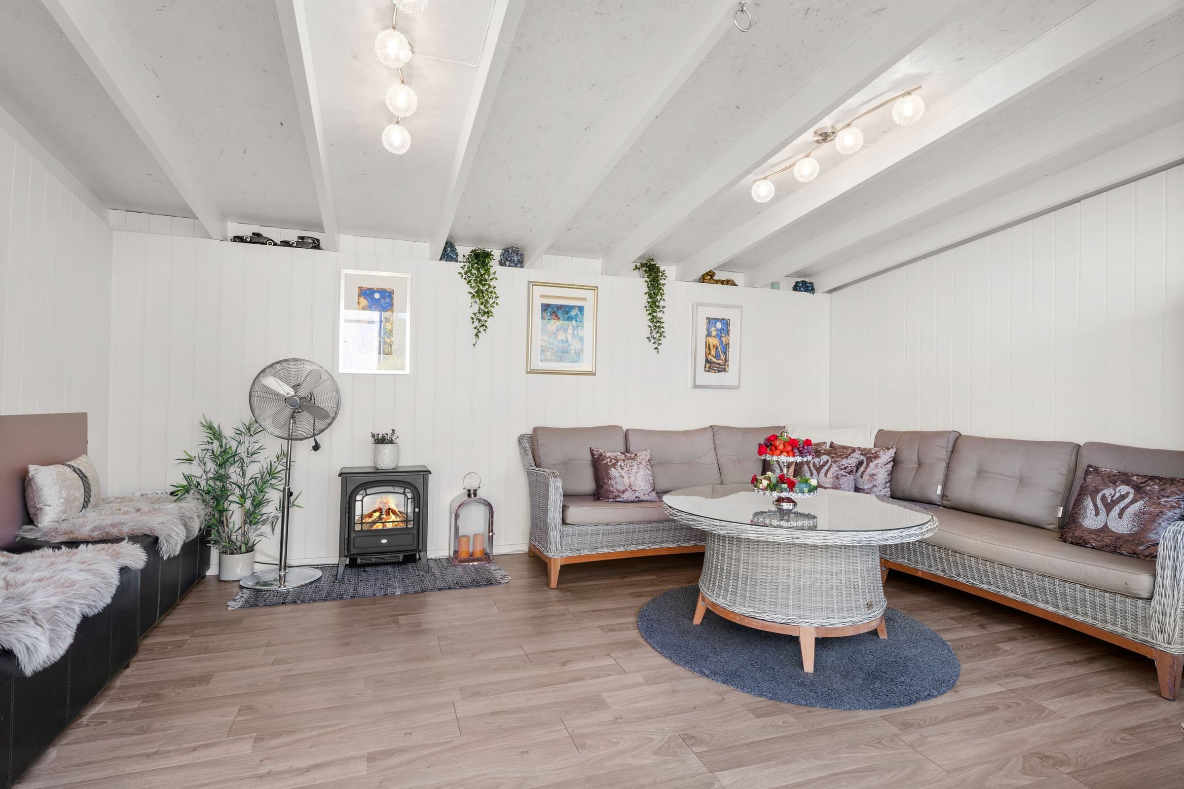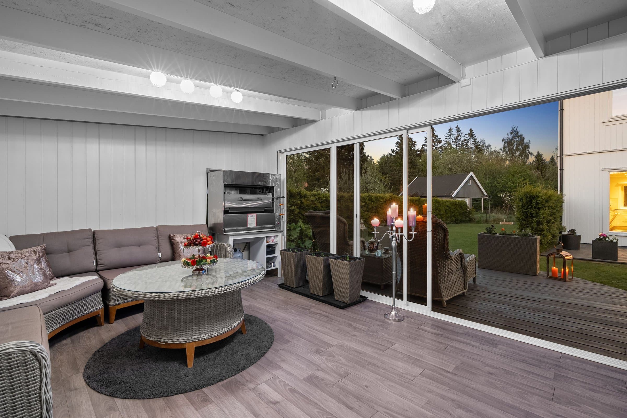 Innbydende lysthus med terrasse – et ekstra oppholdsrom året rundt På eiendommen finner du et sjarmerende lysthus på ca. 19 kvm, oppført i trekonstruksjoner etter tidstypisk byggeskikk i 2015. Dette er et flott tilbygg som fungerer som et ekstra oppholdsrom, enten du ønsker en rolig stund for deg selv, et sosialt samlingspunkt eller en lun vinterhage. Lysthuset er innredet med komfortable møbler og dekor, og har store skyvedører i glass som gir en fin overgang mellom inne og ute. Det naturlige dagslyset slipper inn og skaper en lys og åpen atmosfære. Utenfor bygget ligger en pent opparbeidet treterrasse med plass til sittegruppe og beplantning, perfekt for sommerkvelder med levende lys og god stemning. Her kan du nyte både frokosten i morgensol og lune kvelder under stjernene. Bygget er i bruk både sommer og vinter, og fungerer dermed som et fleksibelt uterom året rundt.