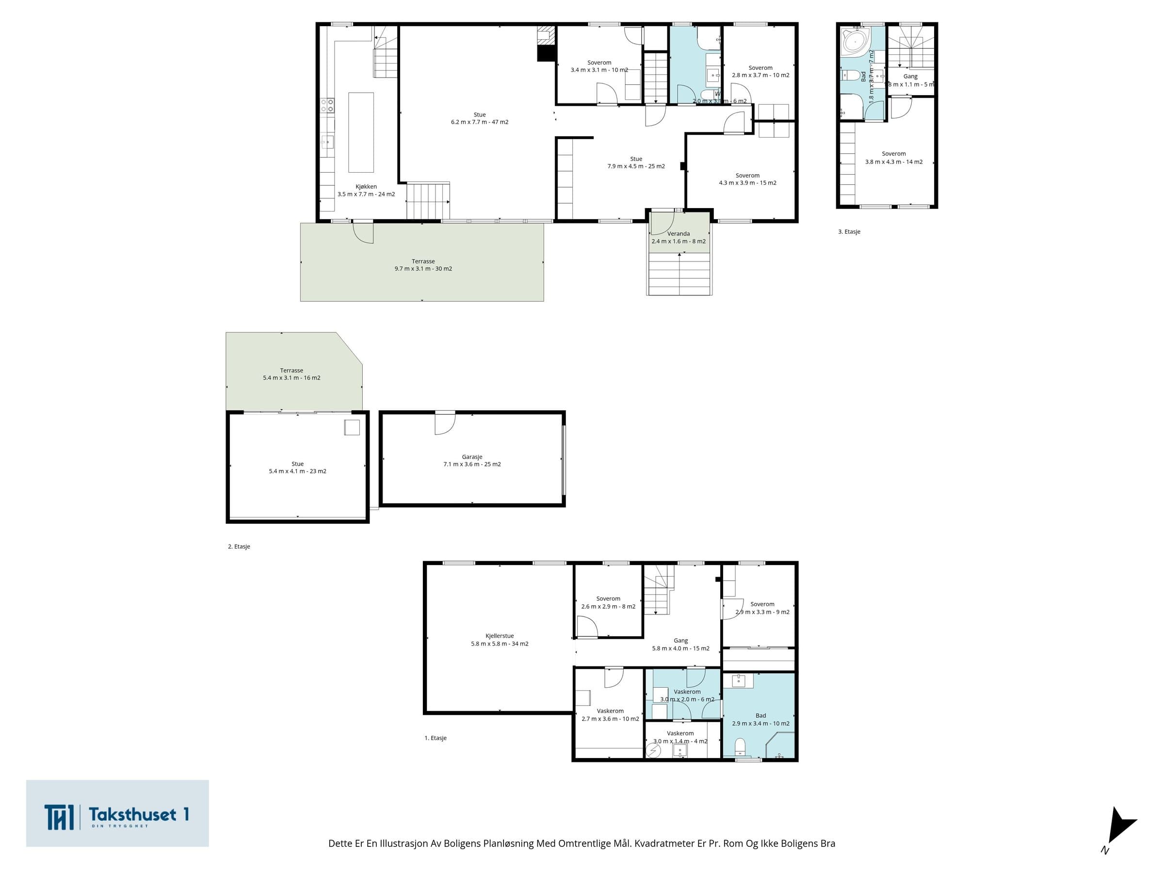 1. etasje (145 kvm): Stue og spisestue, Kjøkken med spiseplass, Trapperom, Bad/wc, Soverom I, Soverom II, Soverom III, Hall og Entré. 2. etasje(28 kvm): Soverom (master), Bad/wc og trapperom. Underetasje (94 kvm): Kjellerstue, Soverom, Kontor, Gang, Bad/wc, Bod og Teknikerrom. Utvendig terrassen er målt til 29 kvm. Kommentar: Takhøyde 1. etasje: 2,37m. Takhøyde 2. etasje: 2,25m. Takhøyde kjeller: 2,43m. Arealer og høyder er målt etter beste evne med håndholdt lasermåler av takstmannen.