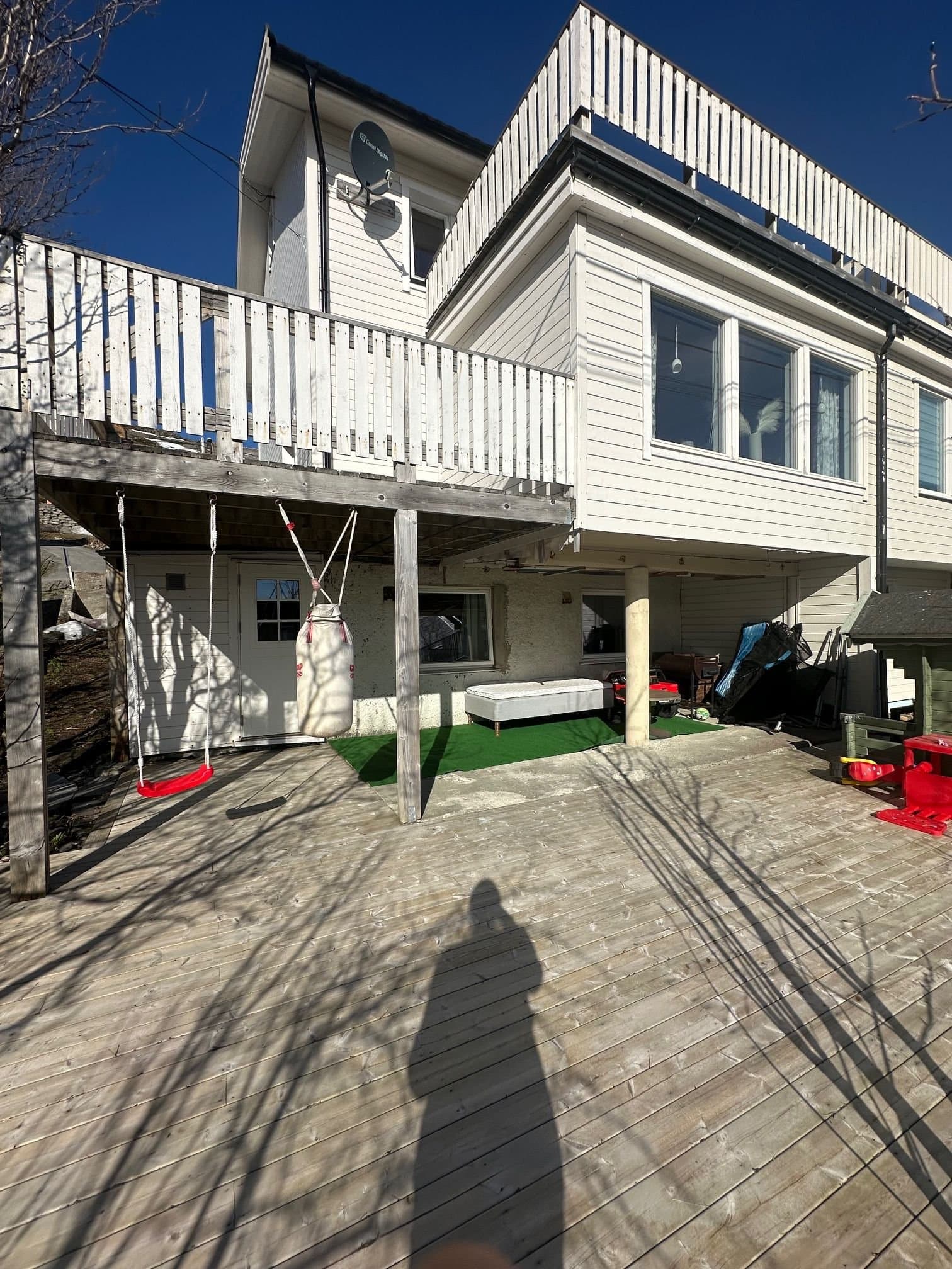 Skrå tomt med adkomst fra oversiden. Terrasse bygget på flere nivå.