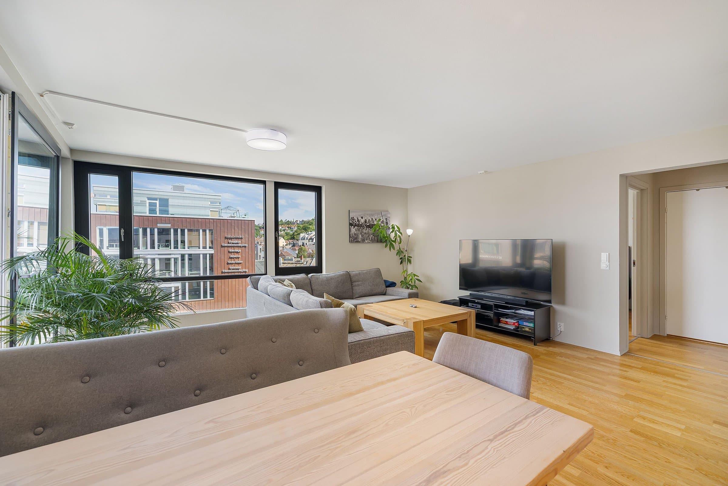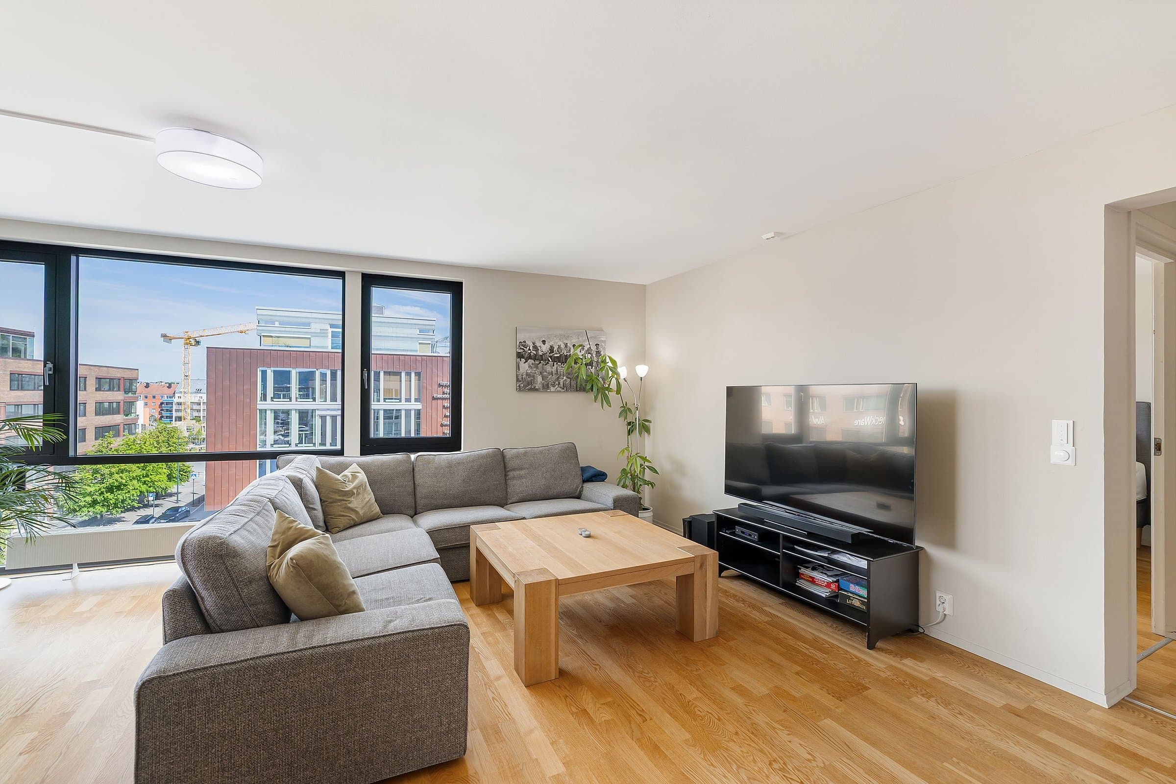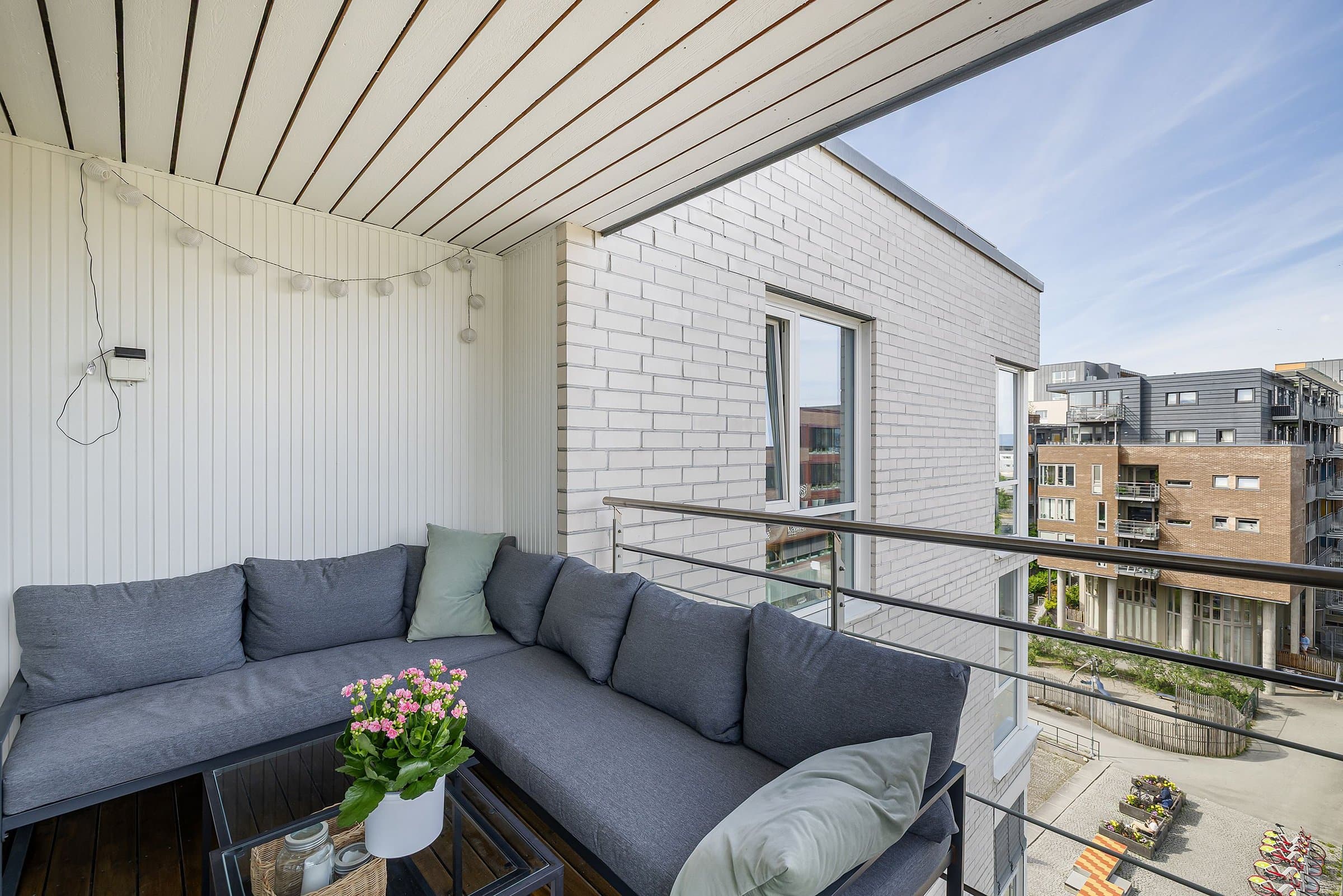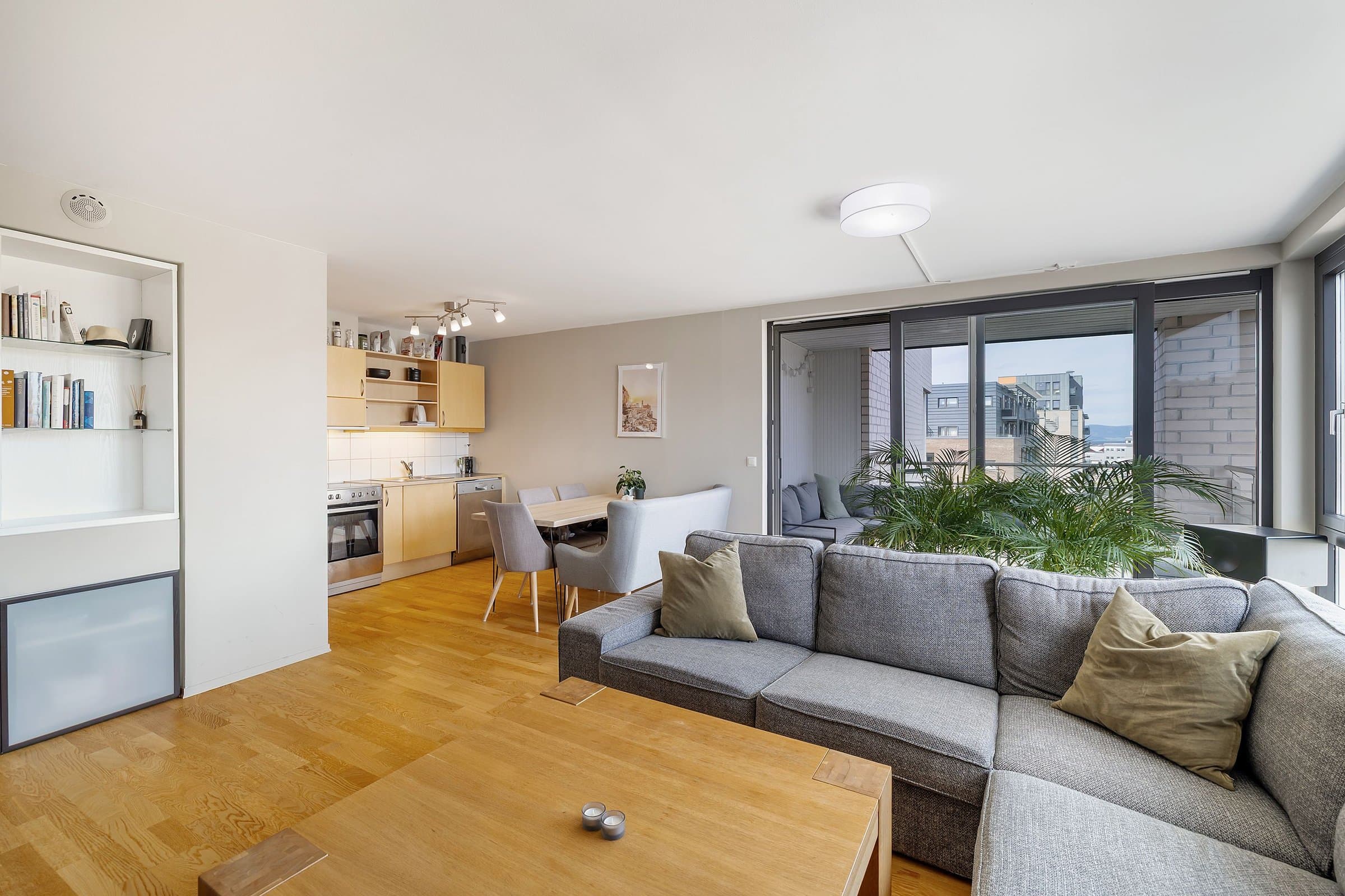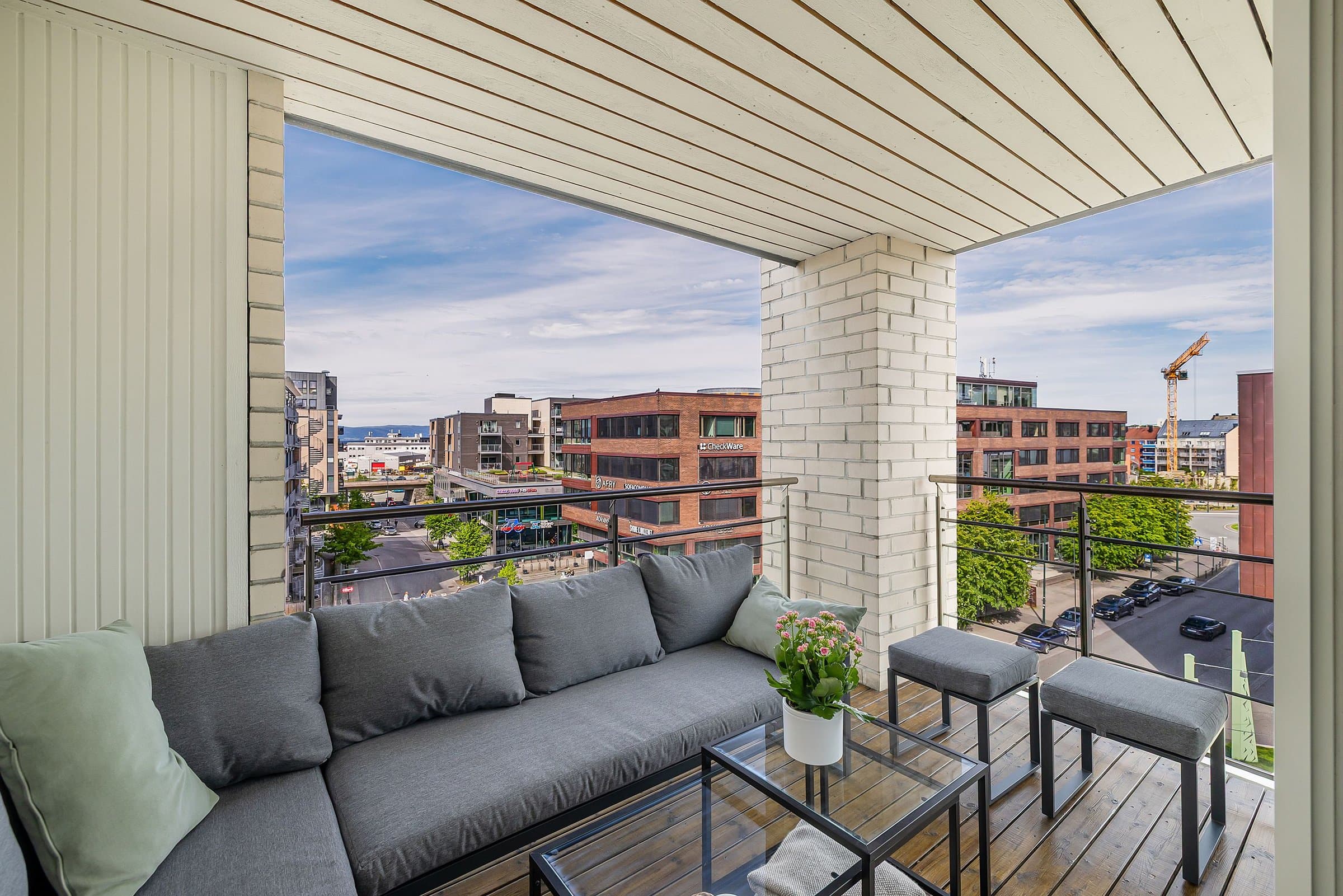 Fin og moderne leilighet sentralt på Solsiden – med kort vei til både tog, buss, restauranter og butikker. Leiligheten ligger i byggets 6. etasje og har en attraktiv hjørnebeliggenhet med lite innsyn og god utsikt. Her får du en smart planløsning med god størrelse på alle rom, samt en flott balkong med gode muligheter for ulik innredning og bruk. I byggets 4. etasje finner du en stor, parkmessig takhage eksklusivt for beboerne – med plenarealer, benker og stier som innbyr til både avslapning og sosiale sammenkomster. Det er heis i bygget, egen bod i kjelleren, og mulighet for parkeringsplass i Solsiden P-hus.