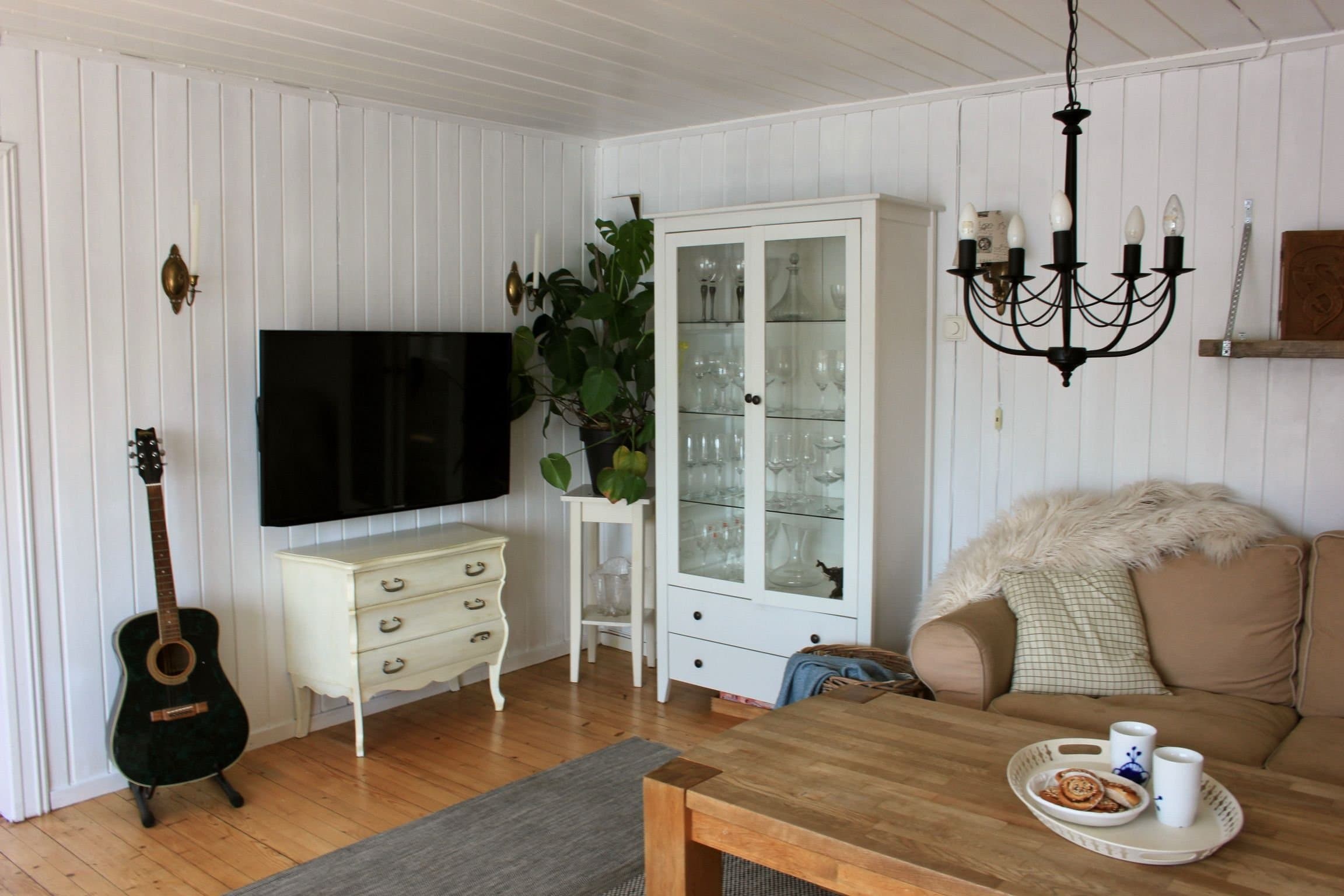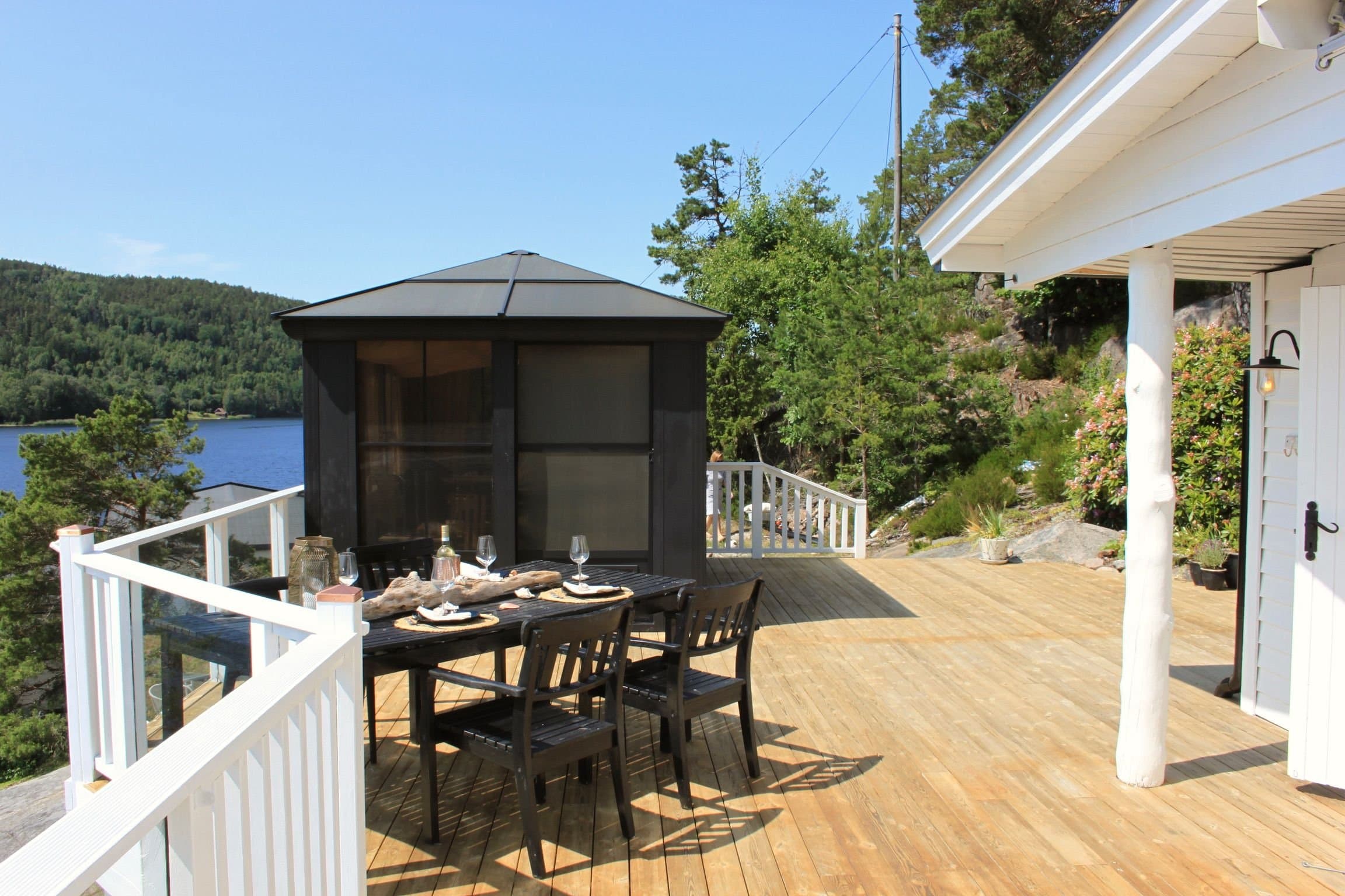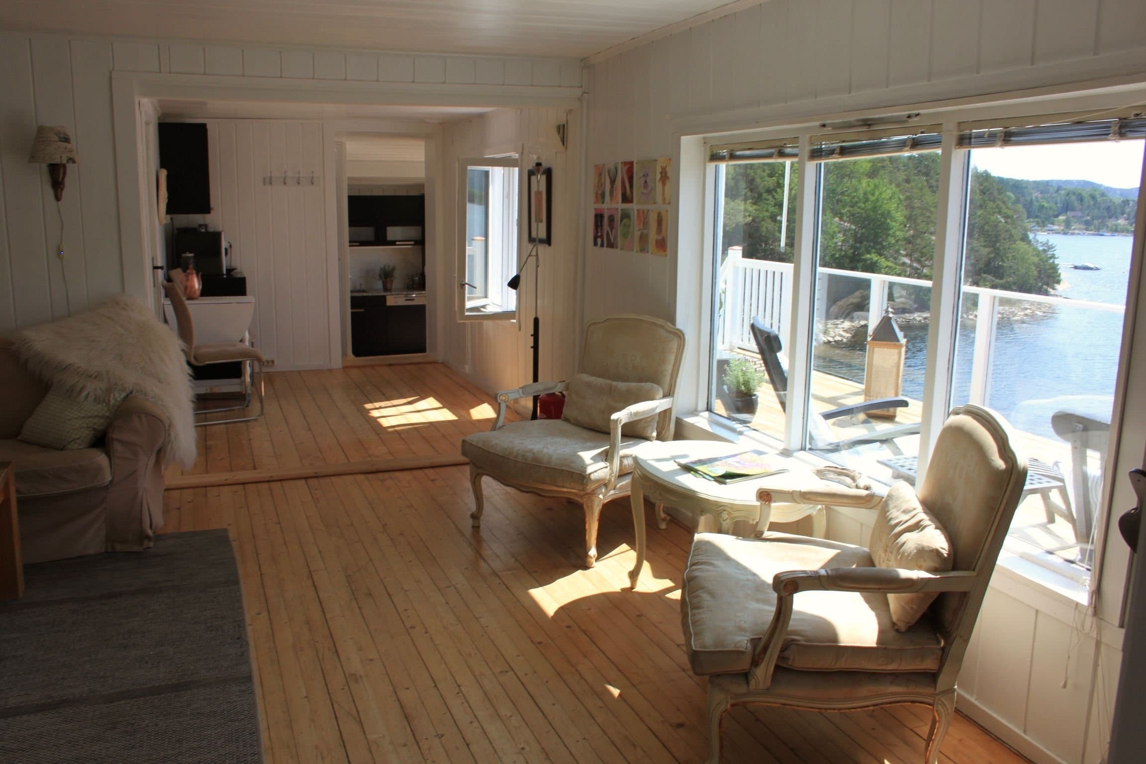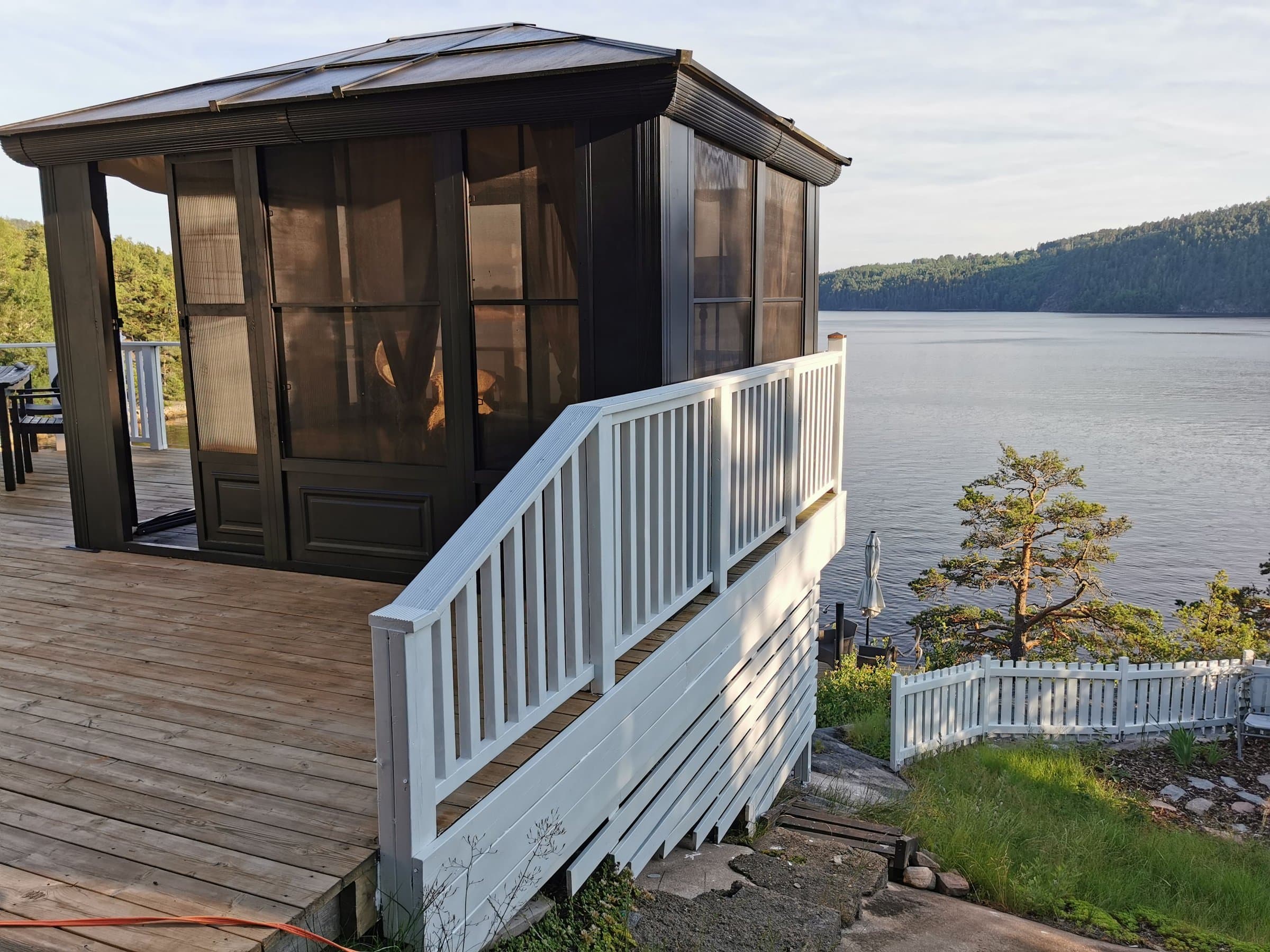 Innholdsrik og solrik hytte, ved strand og privat brygge. Idyllisk og skjermet beliggenhet ved fjorden og turterreng.