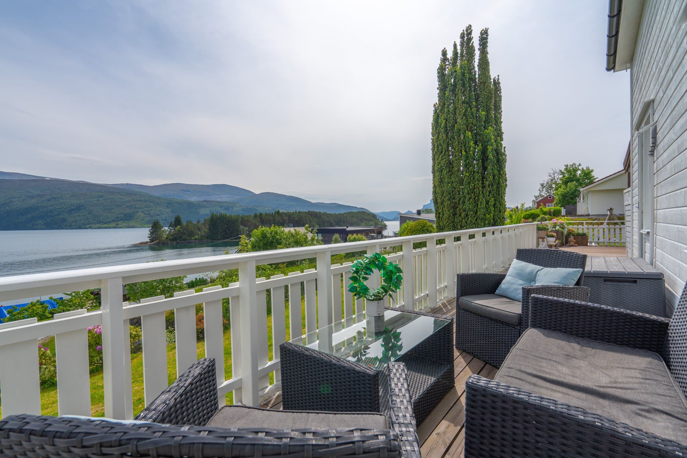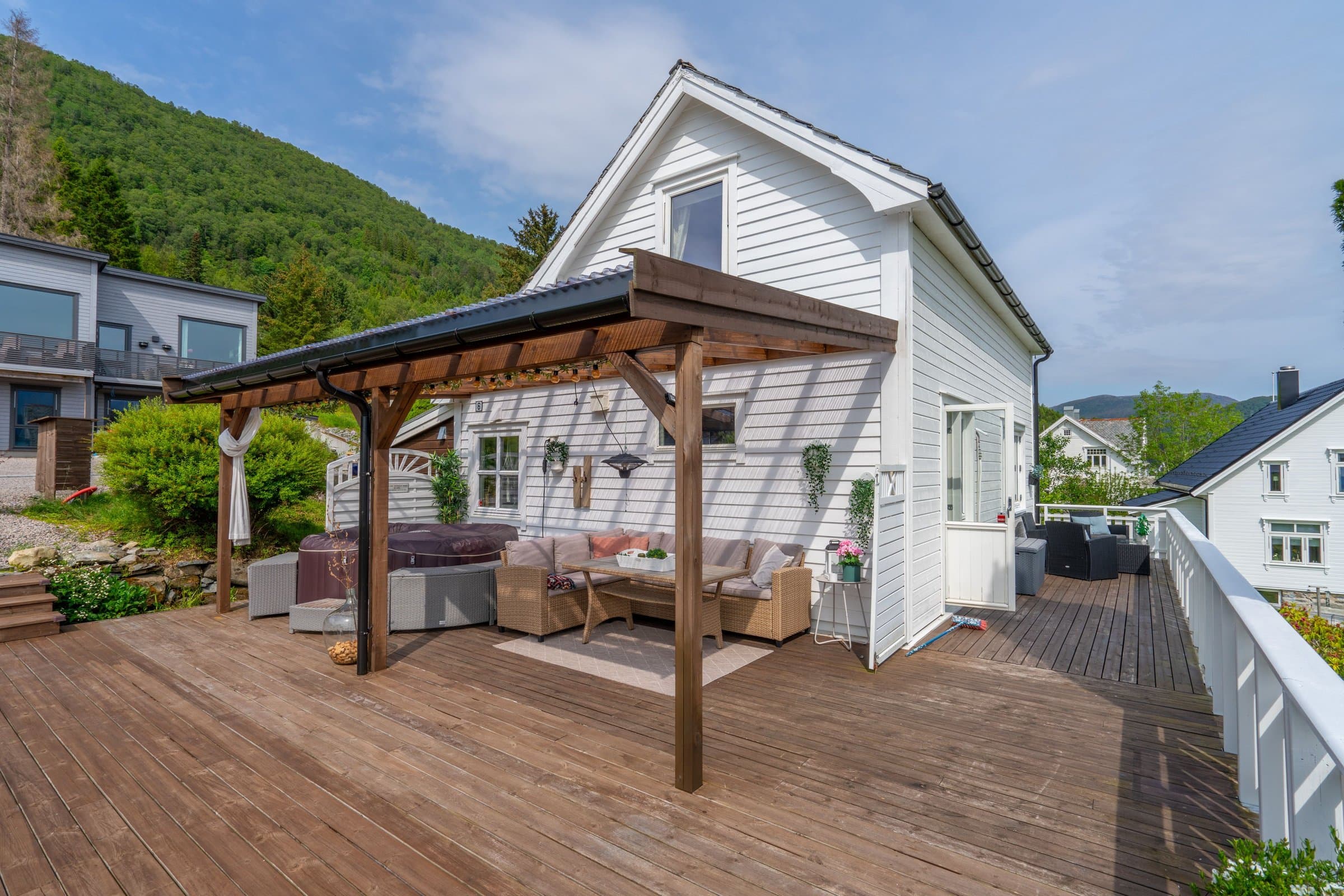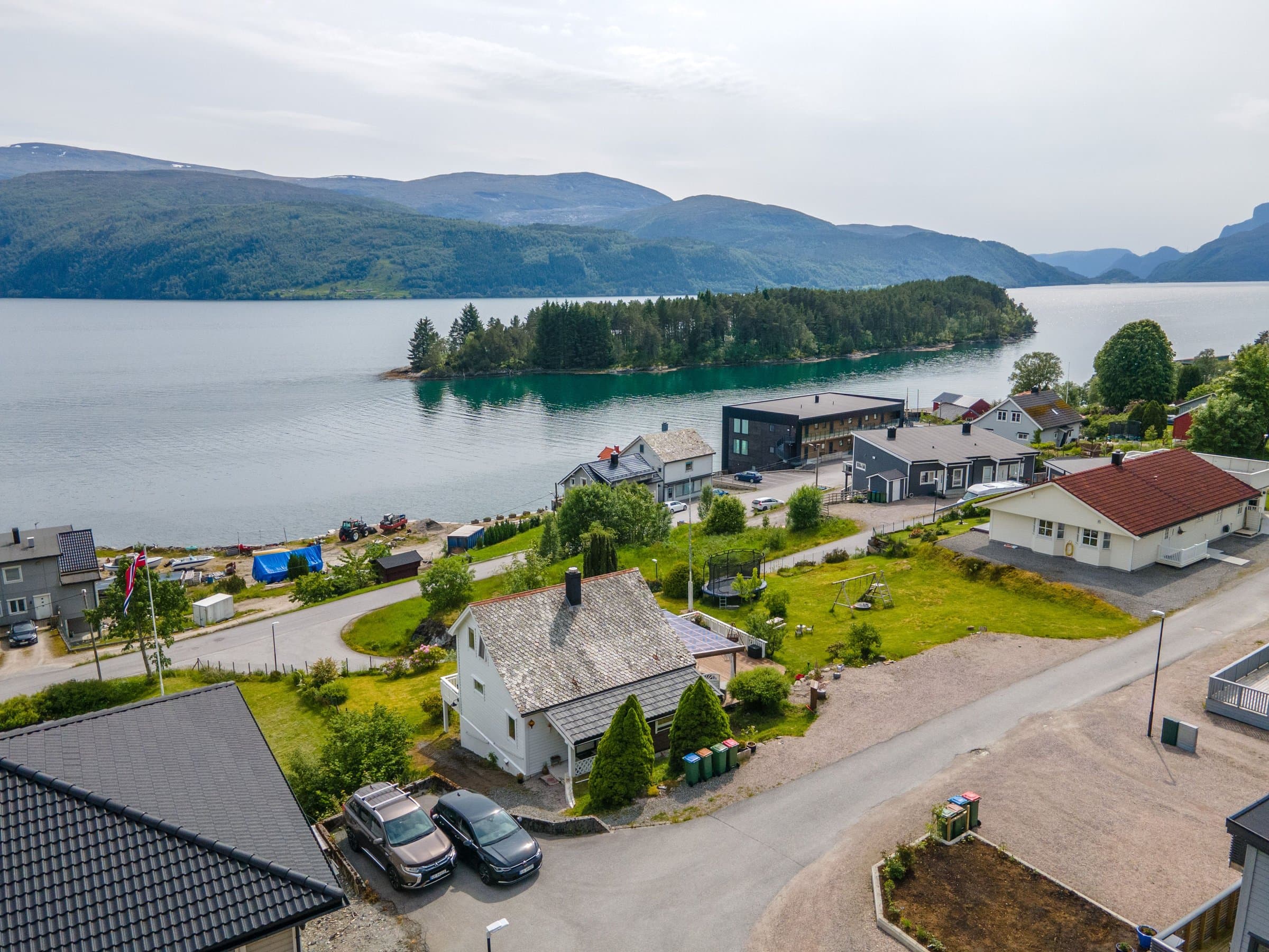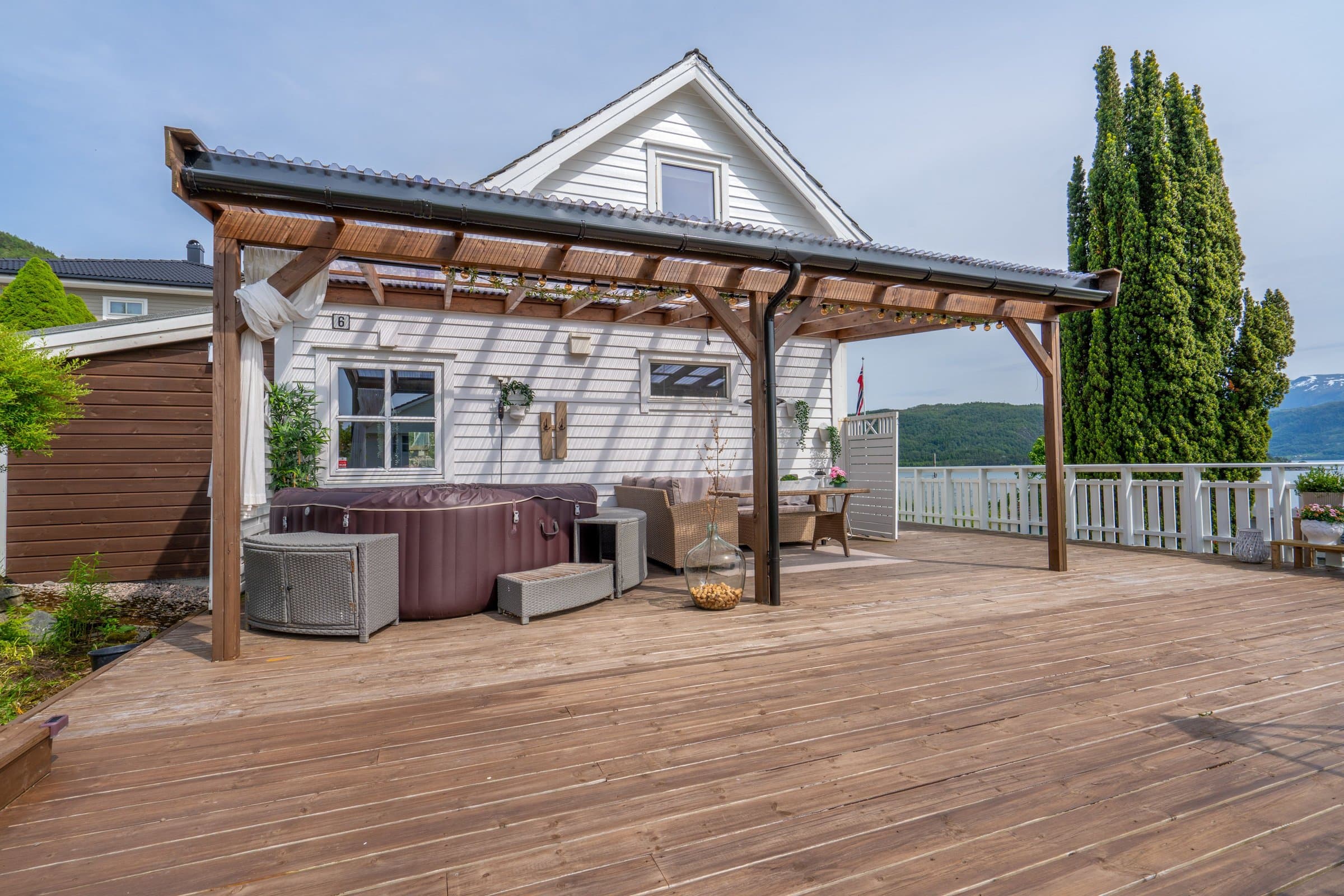 Tomten er på hele 1 mål. Her er det plass til hage, frukttrær, kanskje høner eller et drivhus? Mulighetene er mange for den som drømmer om et fredlig liv like utenfor sentrum. Den store tomten gir god plass for både lek, sosiale sammenkomster og videre utbygging. Terrassen er delvis overbygd og gir deg muligheten til å nyte lange sommerkvelder og samtidig sitte tørt når regnet melder seg. Utsikten over fjorden og Hornelen gir en helt spesiell ramme rundt tilværelsen.