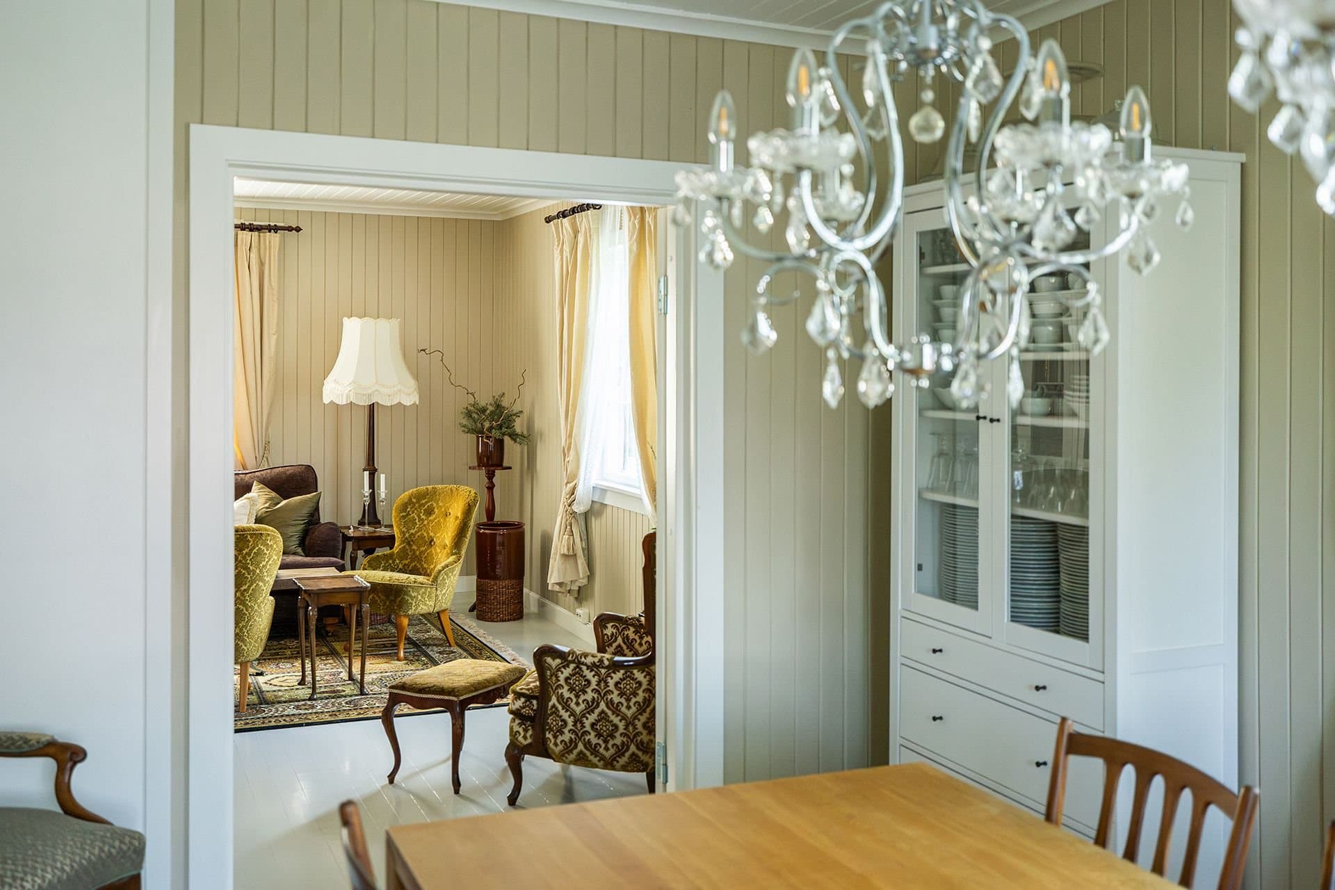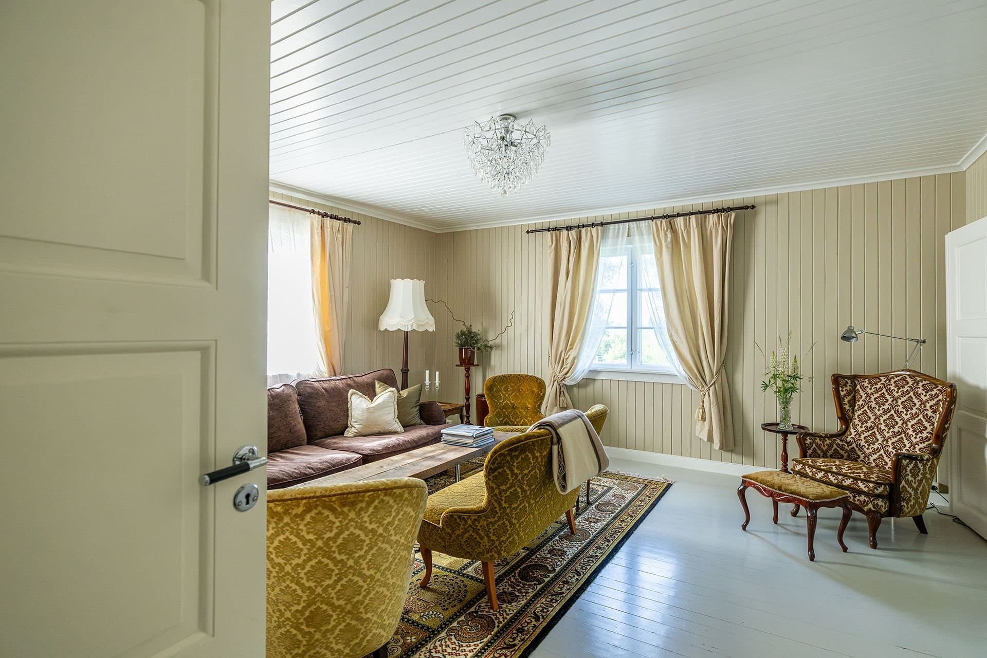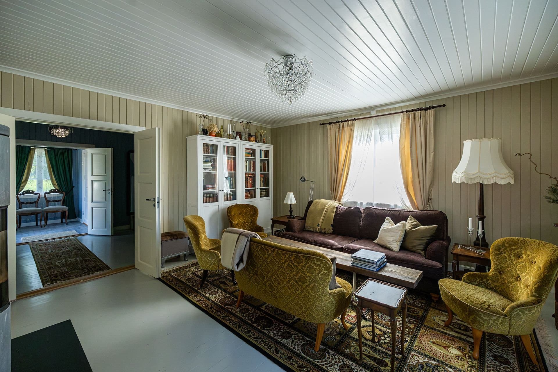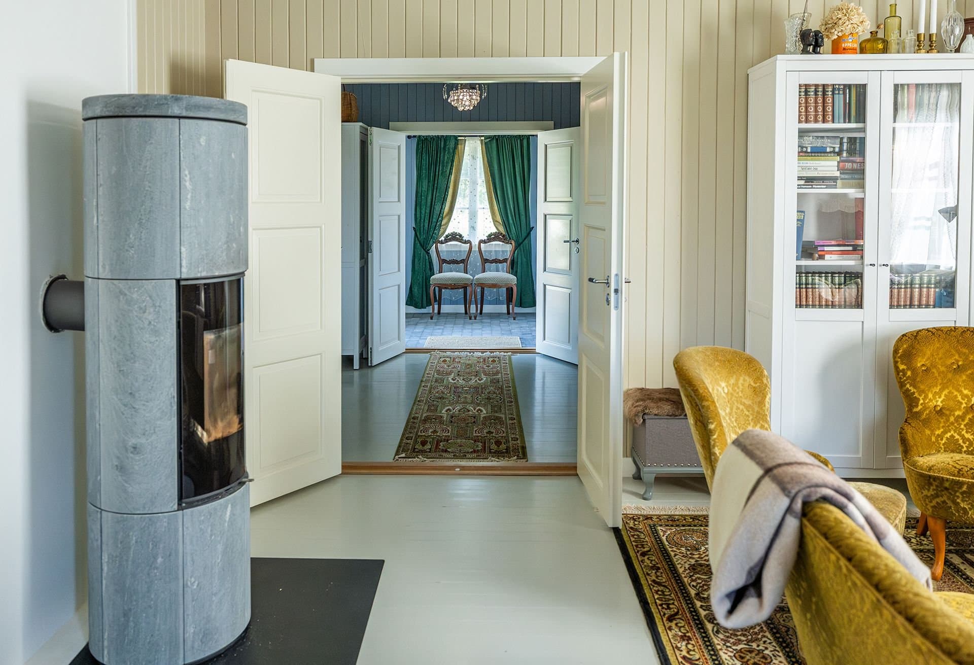 Entré og bad: Både bad og entré har flislagte gulv med varmekabler. Panel er produsert opp igjen i gammel stil hos Furnes almenning. Entreen har praktisk garderobe med skap og skuffer. Badet er flislagt og har panel i taket. Servant er montert på en klassisk gøteborgkommode med stenplate - denne kan enkelt byttes om man ønsker et mer familievennlig baderomsmøbel. Badet har dusjhjørne og gulvmontert toalett, samt to skap til toalettsaker. Hall: Hallen leder til kjeller, kjøkken, stue og har trapp til 2. etasje. Hallen har restaurert panel fra byggeåret, restaurert trapp og skyvedørsskap. Kjøkken: Kjøkkenet er i landlig stil med innredning fra Sivesind - lang benk, kjøkkenøy med frokostplass og to overskap i glass. Fronter er heltre eik lakkert av Løten maleverksted. Benkeplatene er i 40 mm heltre eik. Oppvaskkum i stål og ettgrepsarmatur. Stekeovn, induksjonstopp (90 cm), ovnsvifte (90 cm) og oppvaskmaskin i sort utførelse følger salget. Kjøkkenovn fra HamJern ble fagmessig restaurert i 2014 og har vært i daglig bruk vinterstid til både oppvarming og matlaging. To lamper i kobber av typen Orient designet av Jo Hammerborg i 1963 for danske Fritz Hansen. Veggpanel er opprinnelig og restaurert. Det gamle tregulvet er hentet frem igjen og malt med antikkgrå gulvmaling. Stuer: Veggpanel er opprinnelig og restaurert. Det gamle tregulvet er hentet frem igjen og malt med antikkgrå gulvmaling. Spisestuen har to lysekroner og stuen har en. Stuen har rentbrennende klebersteins peisovn i dansk design fra Rais - vakkert å se på og varmer godt! Stuene har nye dører i eksakt kopi av de opprinnelige, samt nye tofløysdører. Alle nye dører er spesiallaget av snekkerverksted. (To store vinduer fra en herskaplig 1920-tallsvilla i Hamar sentrum er kjøpt inn med tanke på mulighet for panorama i stuen. Disse kan følge salget.)