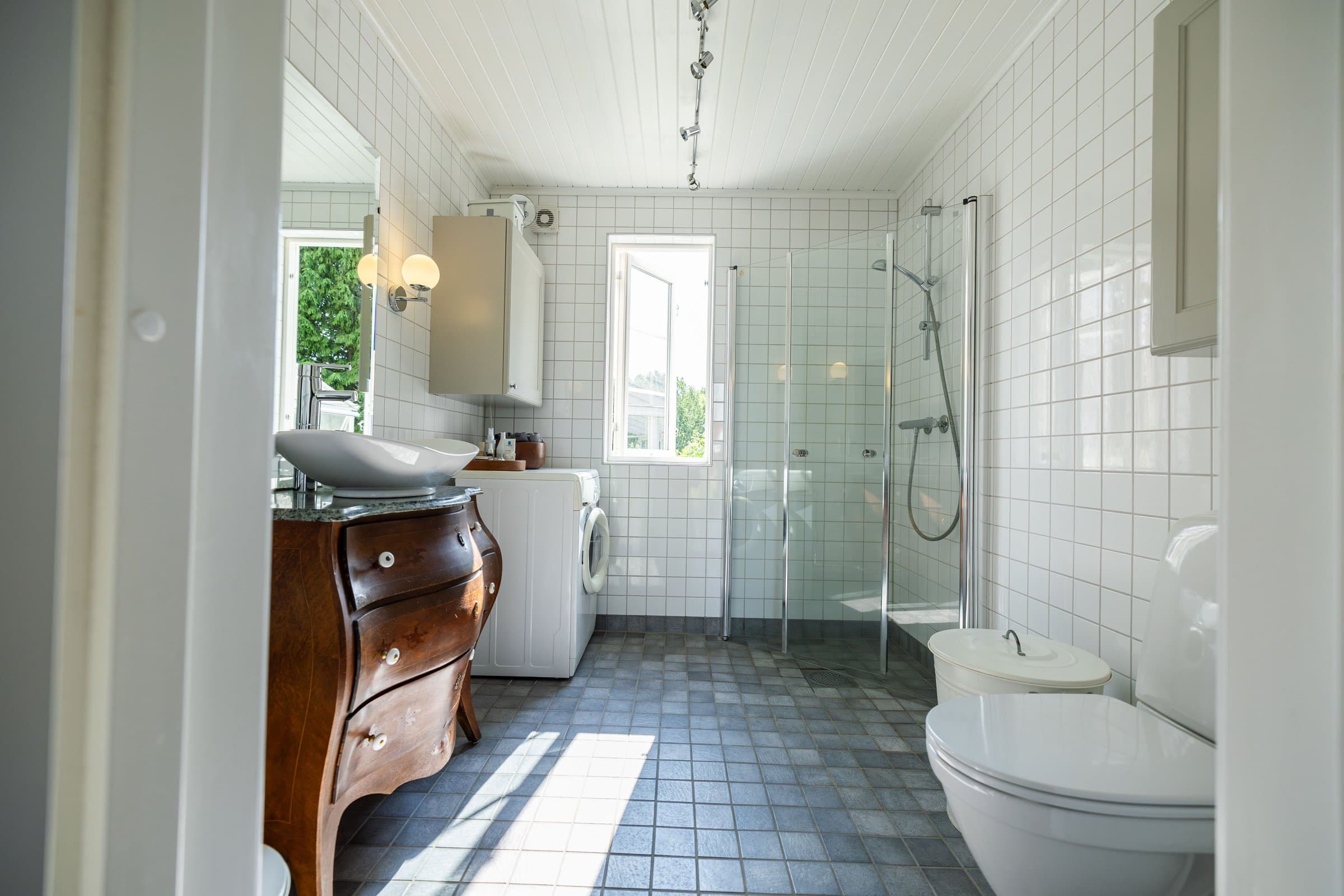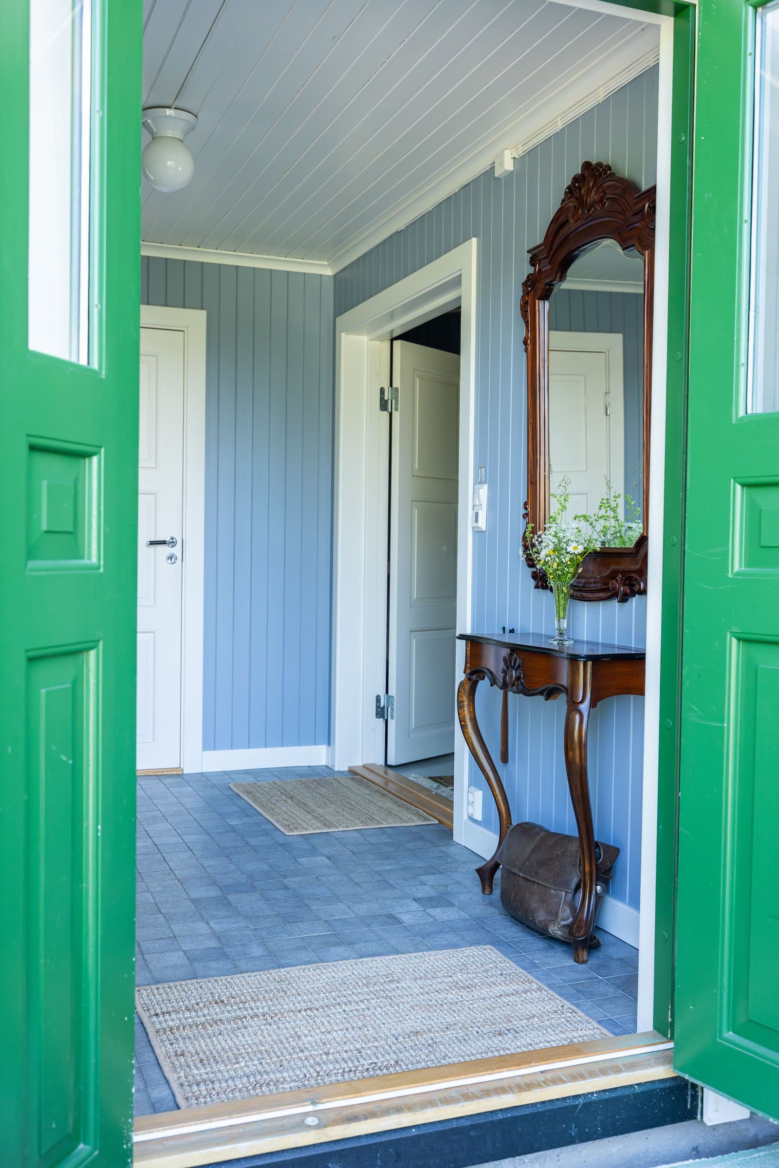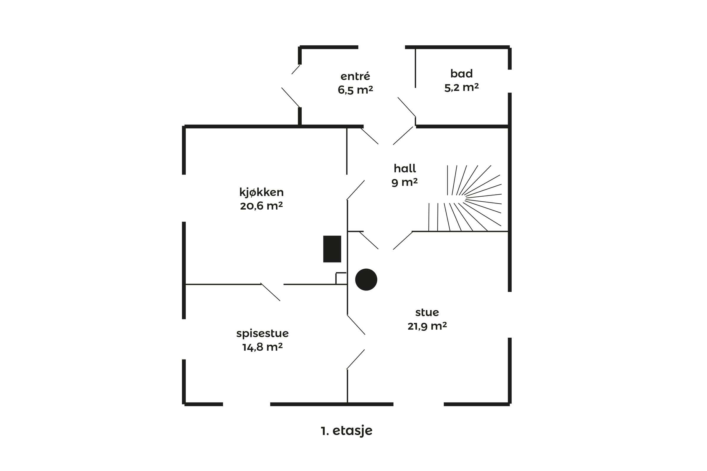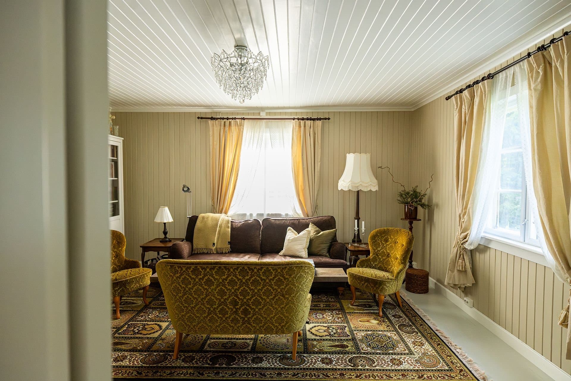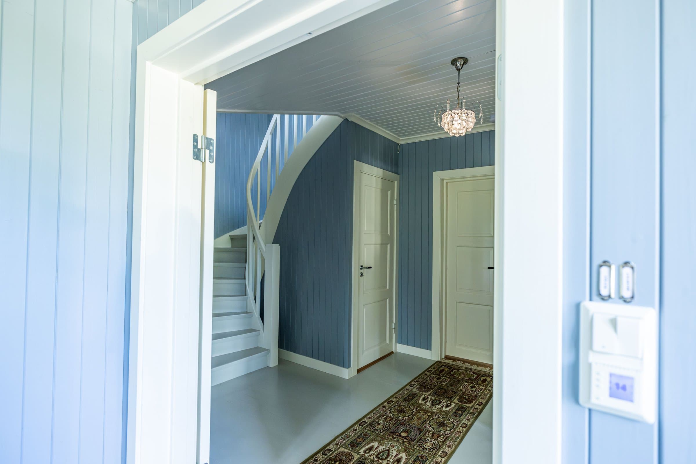 Entré og bad: Både bad og entré har flislagte gulv med varmekabler. Panel er produsert opp igjen i gammel stil hos Furnes almenning. Entreen har praktisk garderobe med skap og skuffer. Badet er flislagt og har panel i taket. Servant er montert på en klassisk gøteborgkommode med stenplate - denne kan enkelt byttes om man ønsker et mer familievennlig baderomsmøbel. Badet har dusjhjørne og gulvmontert toalett, samt to skap til toalettsaker. Hall: Hallen leder til kjeller, kjøkken, stue og har trapp til 2. etasje. Hallen har restaurert panel fra byggeåret, restaurert trapp og skyvedørsskap. Kjøkken: Kjøkkenet er i landlig stil med innredning fra Sivesind - lang benk, kjøkkenøy med frokostplass og to overskap i glass. Fronter er heltre eik lakkert av Løten maleverksted. Benkeplatene er i 40 mm heltre eik. Oppvaskkum i stål og ettgrepsarmatur. Stekeovn, induksjonstopp (90 cm), ovnsvifte (90 cm) og oppvaskmaskin i sort utførelse følger salget. Kjøkkenovn fra HamJern ble fagmessig restaurert i 2014 og har vært i daglig bruk vinterstid til både oppvarming og matlaging. To lamper i kobber av typen Orient designet av Jo Hammerborg i 1963 for danske Fritz Hansen. Veggpanel er opprinnelig og restaurert. Det gamle tregulvet er hentet frem igjen og malt med antikkgrå gulvmaling. Stuer: Veggpanel er opprinnelig og restaurert. Det gamle tregulvet er hentet frem igjen og malt med antikkgrå gulvmaling. Spisestuen har to lysekroner og stuen har en. Stuen har rentbrennende klebersteins peisovn i dansk design fra Rais - vakkert å se på og varmer godt! Stuene har nye dører i eksakt kopi av de opprinnelige, samt nye tofløysdører. Alle nye dører er spesiallaget av snekkerverksted. (To store vinduer fra en herskaplig 1920-tallsvilla i Hamar sentrum er kjøpt inn med tanke på mulighet for panorama i stuen. Disse kan følge salget.)