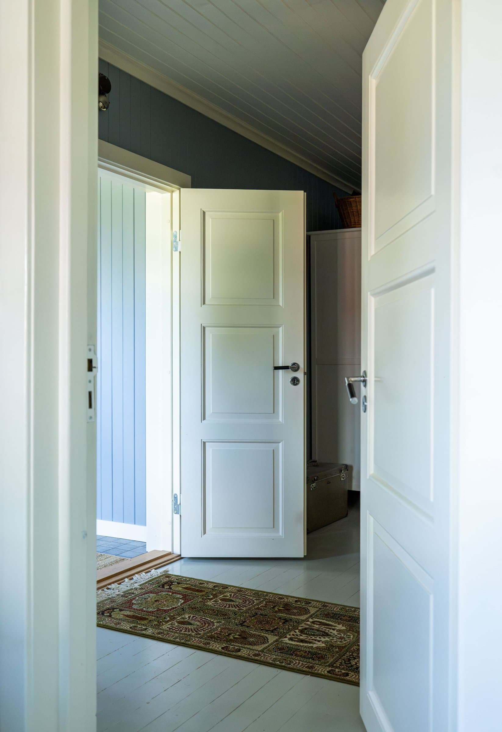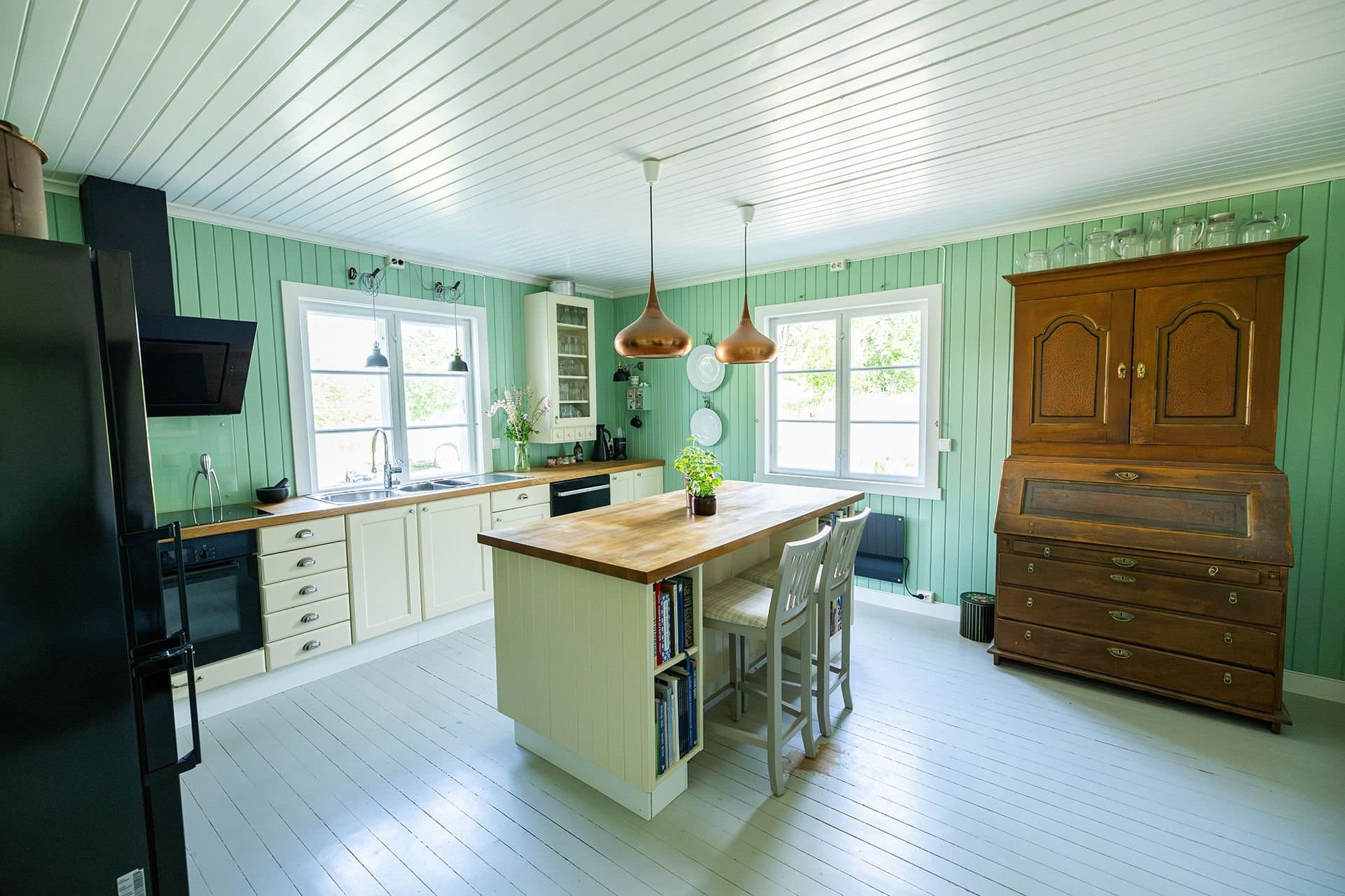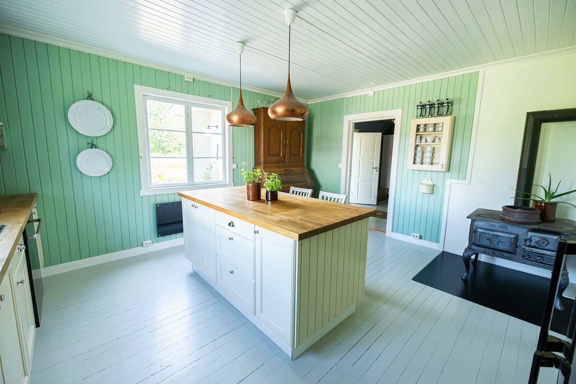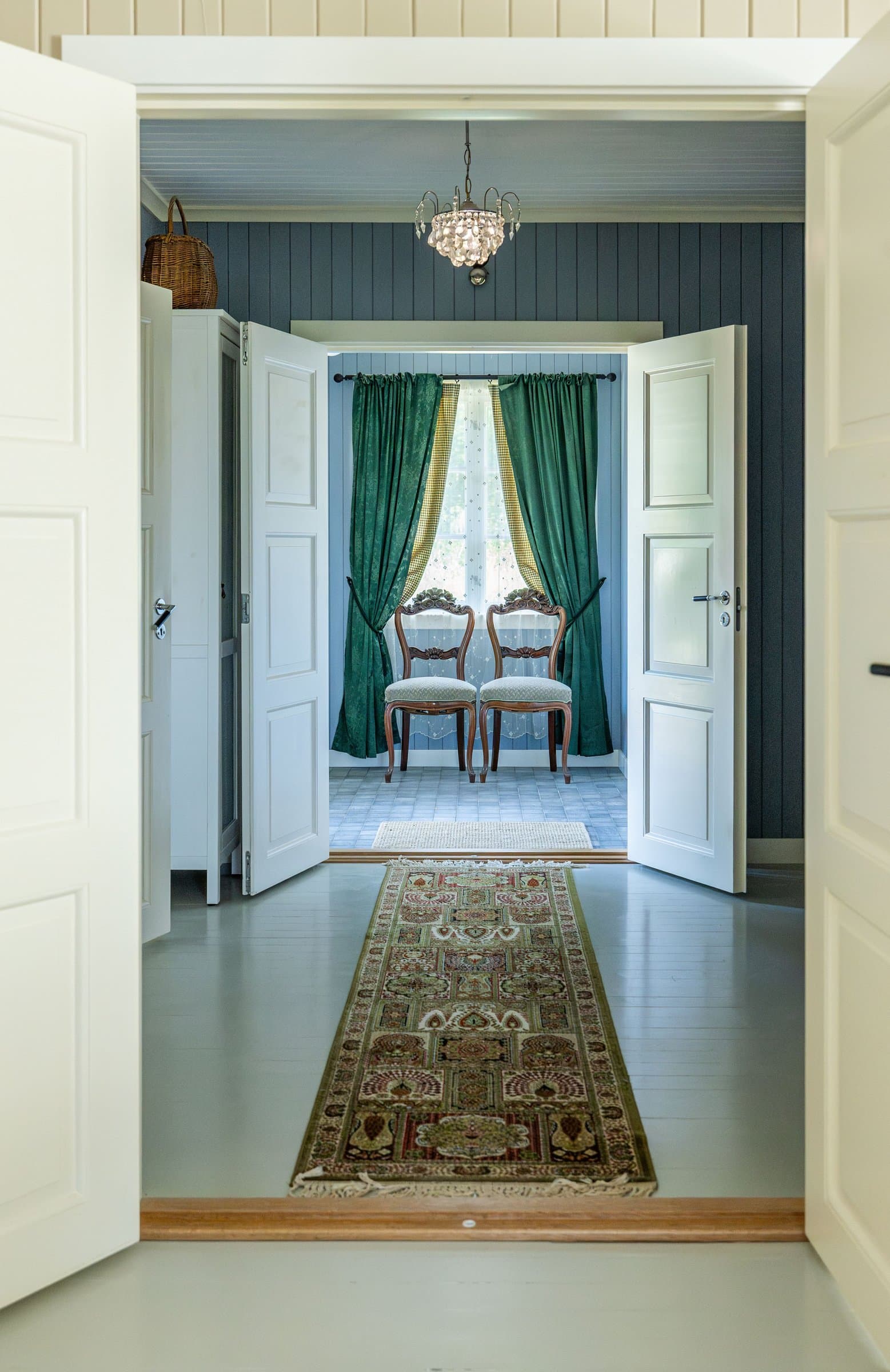 Entré og bad: Både bad og entré har flislagte gulv med varmekabler. Panel er produsert opp igjen i gammel stil hos Furnes almenning. Entreen har praktisk garderobe med skap og skuffer. Badet er flislagt og har panel i taket. Servant er montert på en klassisk gøteborgkommode med stenplate - denne kan enkelt byttes om man ønsker et mer familievennlig baderomsmøbel. Badet har dusjhjørne og gulvmontert toalett, samt to skap til toalettsaker. Hall: Hallen leder til kjeller, kjøkken, stue og har trapp til 2. etasje. Hallen har restaurert panel fra byggeåret, restaurert trapp og skyvedørsskap. Kjøkken: Kjøkkenet er i landlig stil med innredning fra Sivesind - lang benk, kjøkkenøy med frokostplass og to overskap i glass. Fronter er heltre eik lakkert av Løten maleverksted. Benkeplatene er i 40 mm heltre eik. Oppvaskkum i stål og ettgrepsarmatur. Stekeovn, induksjonstopp (90 cm), ovnsvifte (90 cm) og oppvaskmaskin i sort utførelse følger salget. Kjøkkenovn fra HamJern ble fagmessig restaurert i 2014 og har vært i daglig bruk vinterstid til både oppvarming og matlaging. To lamper i kobber av typen Orient designet av Jo Hammerborg i 1963 for danske Fritz Hansen. Veggpanel er opprinnelig og restaurert. Det gamle tregulvet er hentet frem igjen og malt med antikkgrå gulvmaling. Stuer: Veggpanel er opprinnelig og restaurert. Det gamle tregulvet er hentet frem igjen og malt med antikkgrå gulvmaling. Spisestuen har to lysekroner og stuen har en. Stuen har rentbrennende klebersteins peisovn i dansk design fra Rais - vakkert å se på og varmer godt! Stuene har nye dører i eksakt kopi av de opprinnelige, samt nye tofløysdører. Alle nye dører er spesiallaget av snekkerverksted. (To store vinduer fra en herskaplig 1920-tallsvilla i Hamar sentrum er kjøpt inn med tanke på mulighet for panorama i stuen. Disse kan følge salget.)