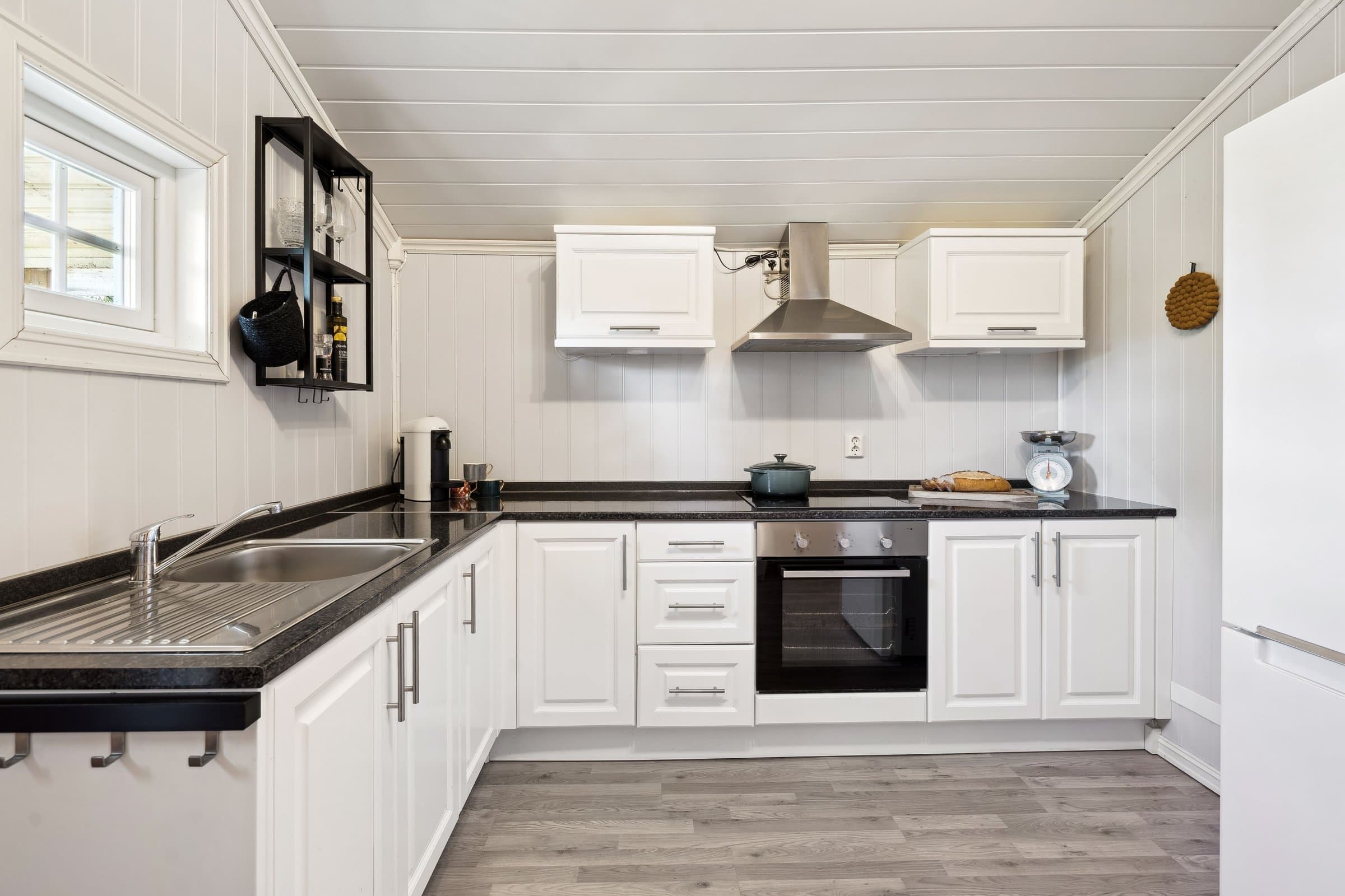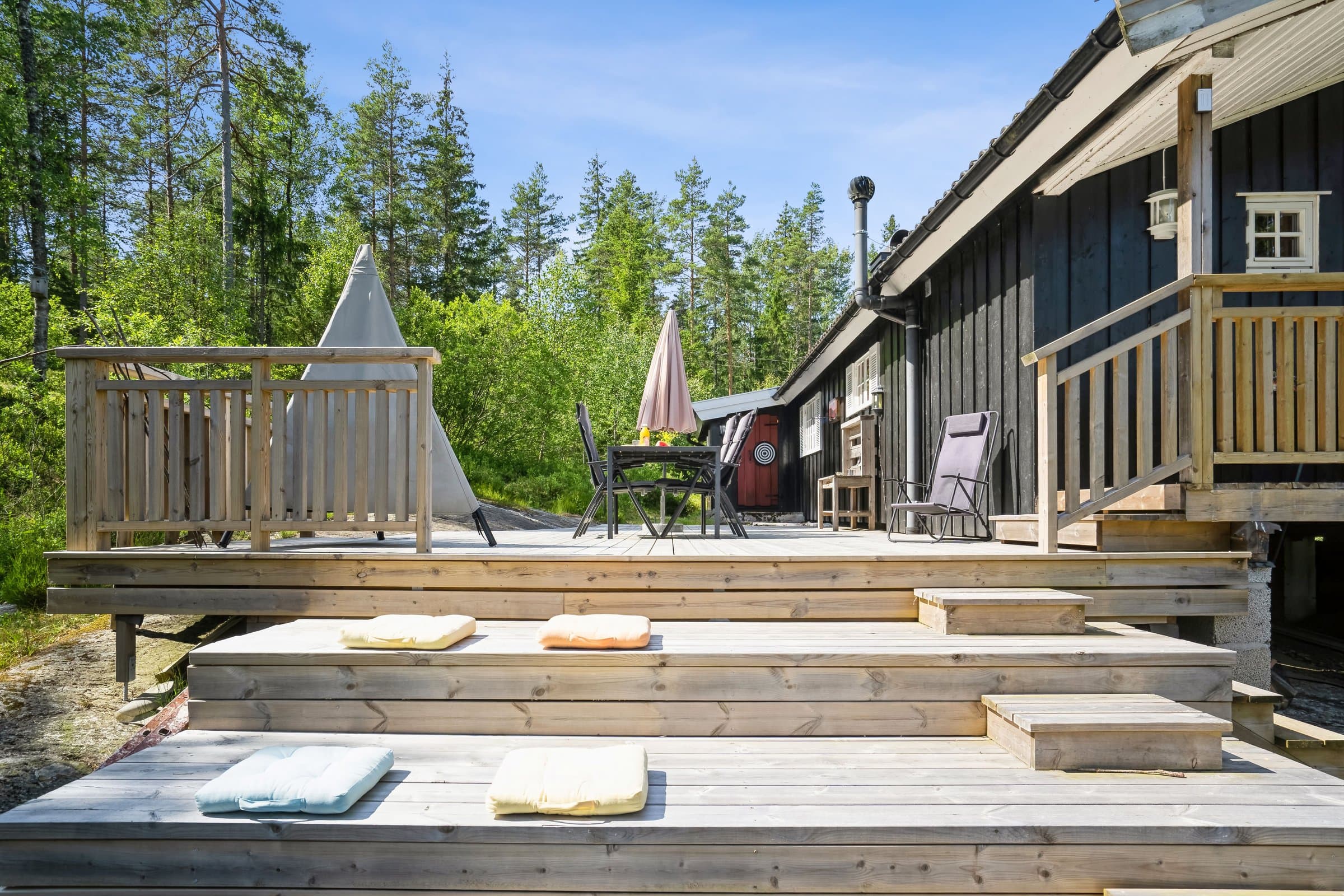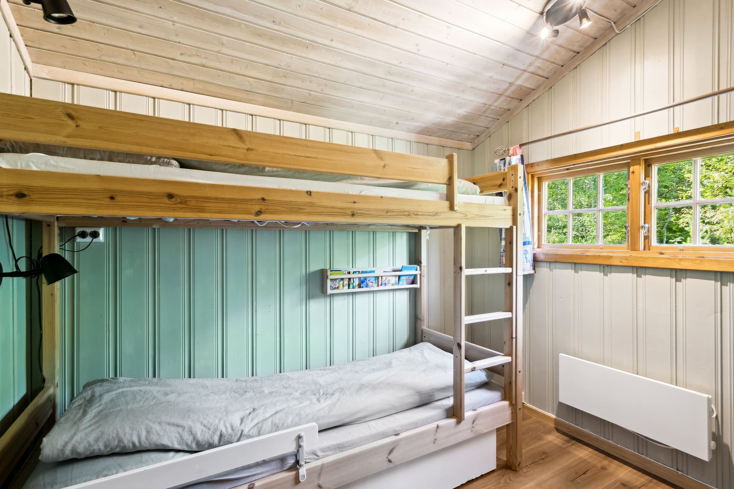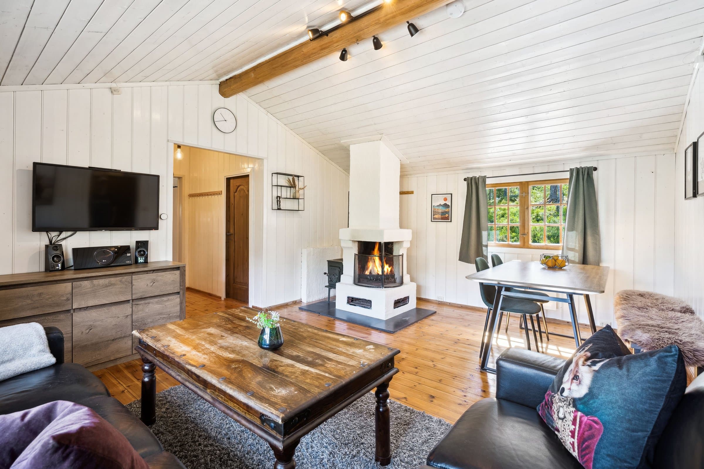 Stor hytte med 8-9 sengeplasser i veletablert hyttefelt. Hytta er bygget i 1969, med et påbygg fra 80-tallet og et nyere påbygg fra 2015. Den gamle delen har originalt tregulv og trepanel, mens den nyeste delen har laminat og veggplater. Den gamle delen består av stue, gang og fire soverom. I den nye delen finner vi et velutstyrt kjøkken og et romslig bad med toalett, dusjkabinett og vaskemaskin. Hytta selges møblert, og møblene innendørs som ses på bildene medfølger. Utvendig finner vi to store terrasser plassert på hver sin side av hytta. Fra hovedterrassen går det en stor og luftig trapp ned til hagen med en stor gressplen på rundt 100m2. Resten av tomta består av naturtomt hvor man kan høste både blåbær og tyttebær. Tomten har også en del åpent fjell. Hytta fungerer godt som både sommer- og vinterhytte, med både vedfyring, panelovner og varmepumpe.