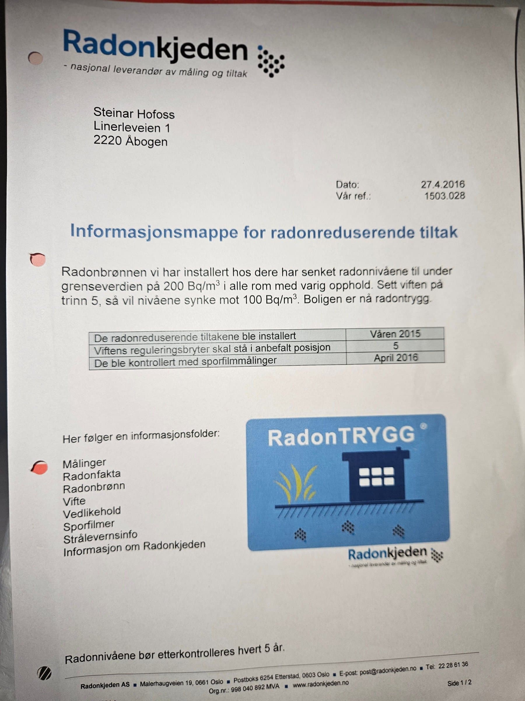 Boligen ble radonmålt vinteren 2014/2015 med forhøyede verdier. Det ble i 2015 installert radonbrønn med avtrekksvifte av fagfirma. Etter ny måling med innregulering vinteren 2015/2016 ble det opplyst at boligen da tilfredsstiller gjeldende anbefalte radonnivåer ved normal drift og boligen fikk beviset RADONTRYGG BOLIG. Radonviften står i dag på anbefalt nivå. Det er ikke gjennomført ny måling senere, i tråd med generelle anbefalinger om måleintervall. Det er ikke noe krav om nye radonmålinger!