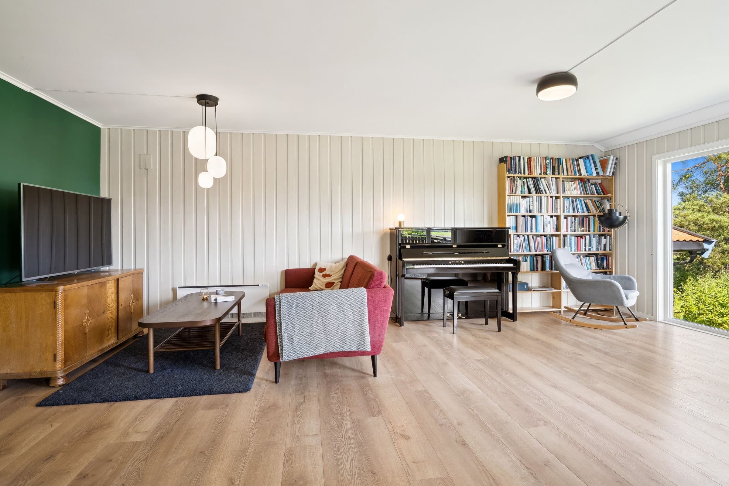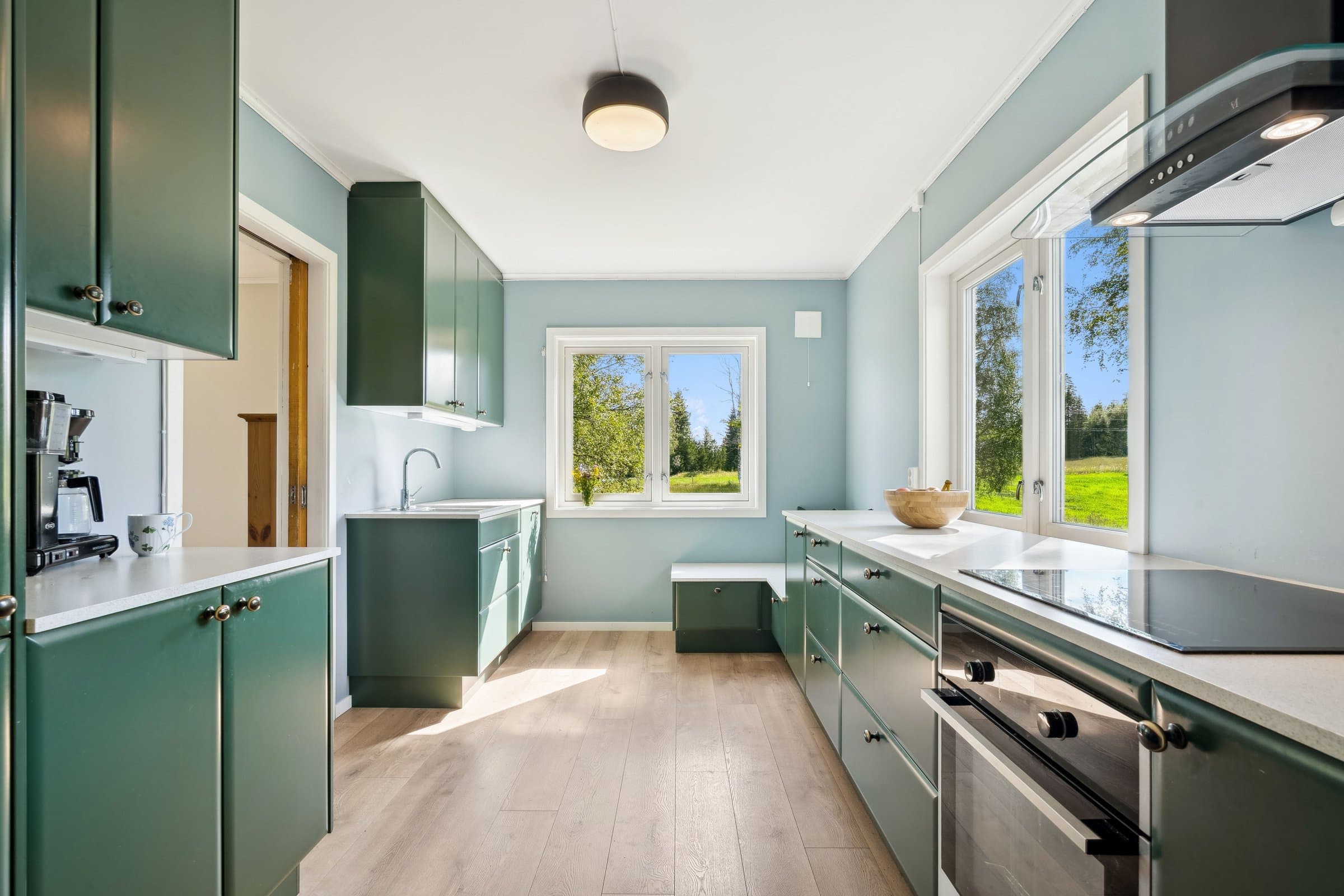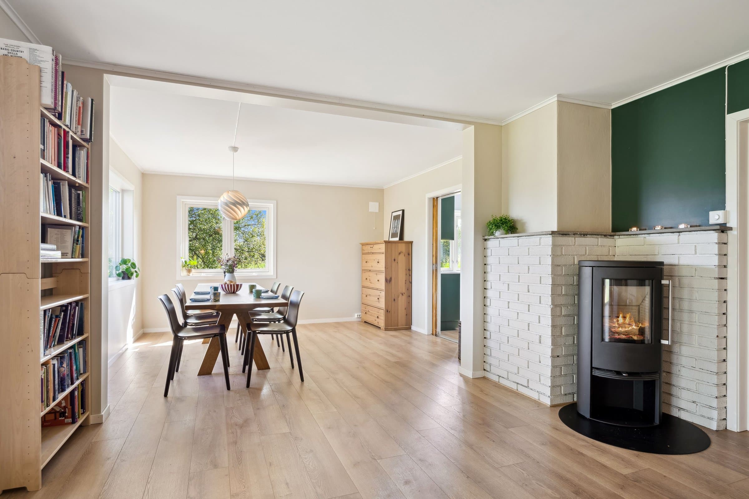 Huset er en klassisk 50-talls enebolig som er bygd ut i to omganger og totalrenovert i 2021-25. Nytt er blant annet tak, pipe, elektrisk anlegg, vinduer, dører, bad og kjøkken, samt overflater. Stuen er lys og romslig, med mange muligheter for møblering. Utgang til terrasse og hage. Ny vedovn og pipe gir trygg og effektiv fyring, sammen med panelovner. Strømforbruket er lavt. Store vinduer med 180 graders utsikt til jorder, trær og dyreliv. Kjøkkenet er nytt av 2021, med gode arbeidsforhold og sittekrok i hjørnet. Innredningen er fra Huseby, og hvitevarene fra AEG og Gorenje. Tre store soverom i harmoniske farger, med gulv i samme solide eikelaminat som nede. To av soverommene har integrerte klesskap, og ett har utgang til egen veranda. Badet nede er lyst og delikat, med fliser på vegger og gulv, innredning i eik fra Linn bad, dusjhjørne, vegghengt toalett og plass til stort badekar. Gulvet er nylig lagt på nytt slik at avviket i tilstandsrapporten er rettet opp. Badet oppe er eldre, men med nytt toalett. Kjelleren gir lagringsplass i tre rom, hvorav ett med spiskammers. Det er satt inn nye vinduer, og ventiler som gir god lufting.