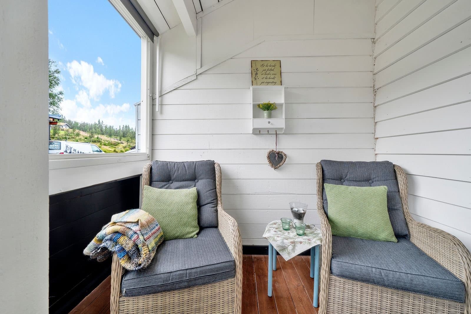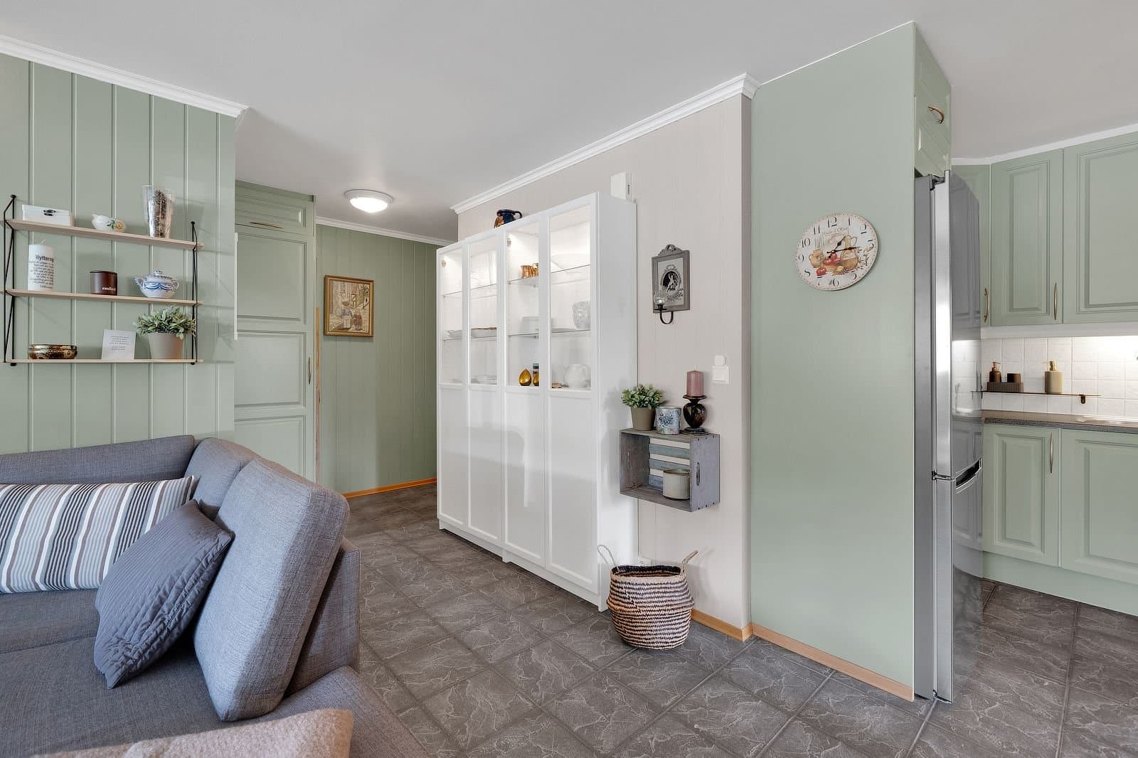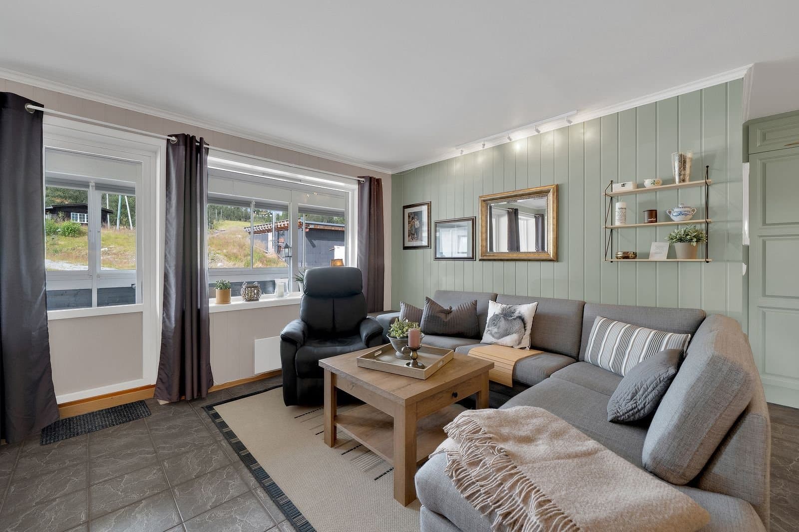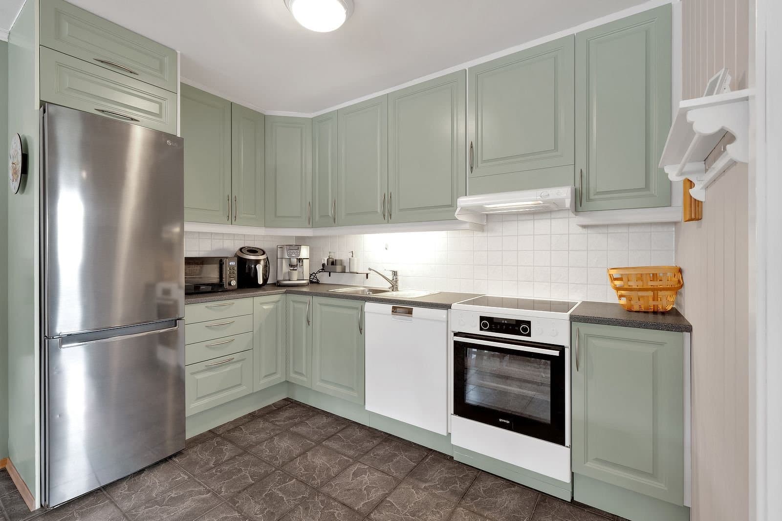 Din nye fritidsbolig - rom for rom: Romslig entre/Hall. Leiligheten har et hyggelig inngangsparti som gir et godt første inntrykk. Entreen er malt i en dempet, gyllen grønntone og har pene mørke fliser på gulv. Her har du god plass til å henge fra deg yttertøyet og sko i skyvedørs-garderoben. Stue: Stuen er boligens sosiale samlingspunkt. Stuen ligger i delvis åpen løsning mot kjøkkenet som gir en god romfølelse og er også malt i en dempet, gyllen grønntone. Du kan enkelt dele inn stuen i flere soner etter eget ønske. Det er god plass til sofa og spisebord, slik at hele familien kan samles til hyggelige sammenkomster. Vindusflatene gir godt med lysinnslipp. Fra stuen er det direkte utgang til innglasset terasse på ca. 24 kvm og en overbygget terasse på ca 21 kvm. Kjøkken: Kjøkkenet er lyst og pent med naturlig spiseplass mot stuen. Innredningen består laminerte plater malt i en dempet, gyllen grønntone med skufferekke og over- og underskap. Benkeplate i laminat med nedfelt oppvaskkum. Vegg over kjøkkenbenk er flisbelagt. Hvitevarene som medfølger med salg består av stekeovn med platetopp/induksjon, oppvaskmaskin samt kjøl/frys skap. Baderom: Leiligheten har to baderom, som er flisebelagt i lyse farger. Begge bad har klosett, dusjhjørne med høyskap og over og underskap med tilhørende speiler. På begge bad er det også nedfelte downlights som gir et moderne uttrykk. Soverom: Det er totalt tre gode soverom med vindu i leiligheten. 2 av soverommene har familiekøyer, mens et soverom har mulighet til å sette inn king size seng. Soverommene med familiekøyer er skapene utstyrt med hyller og delvis trådkurver. På soverom med king size seng er det skyvedørs-garderobe med 24 trådkurver som går fra gulv til tak. Innvendige overflater: Gulv: Oppholdsrom, entre og bad har fliser. Vegger: Malte panelplater og badene har fliser. Himling: Malt overflate. Hva ellers gjelder det tekniske om boligen og eiendommen generelt, henvises til tilstandsrapport og egenerklæringsskjema som er vedlagt. Det forutsettes at kjøper gjør seg kjent med disse før budgivning/kjøp. Innhold: Planløsning: Første etasje: Entre, stue/kjøkken, to bad, 3 soverom og en innglasset terasse. Leiligheten disponerer egen bod i felles trappeoppgang, se plantegning og seksjonspapirer. Oppvarming: Varmekabler i badene og forøvrig app.styrte termostatstyrte panelovner. Energikarakter: C Energifarge: Rød