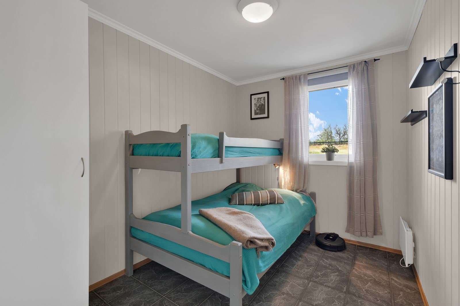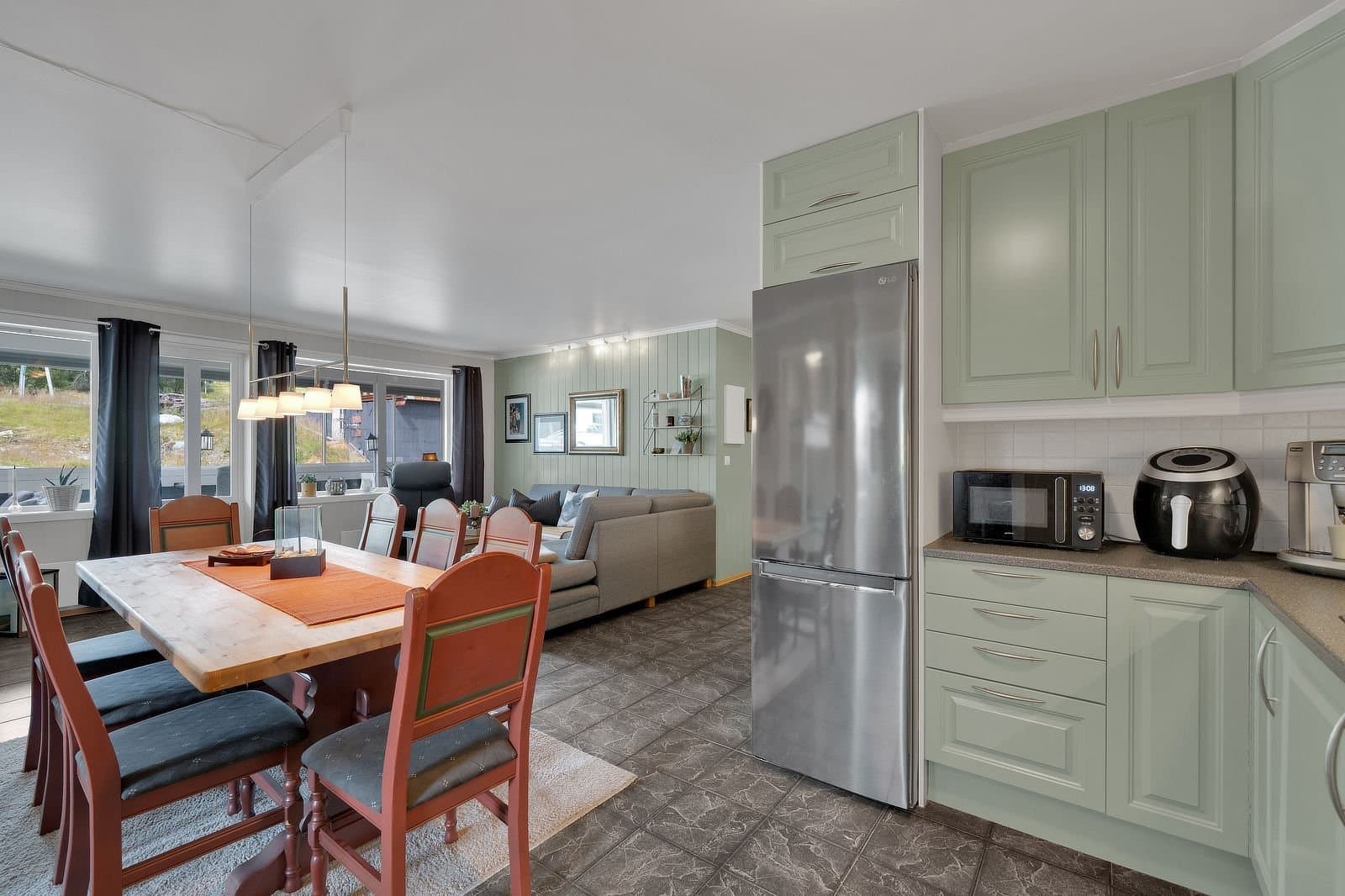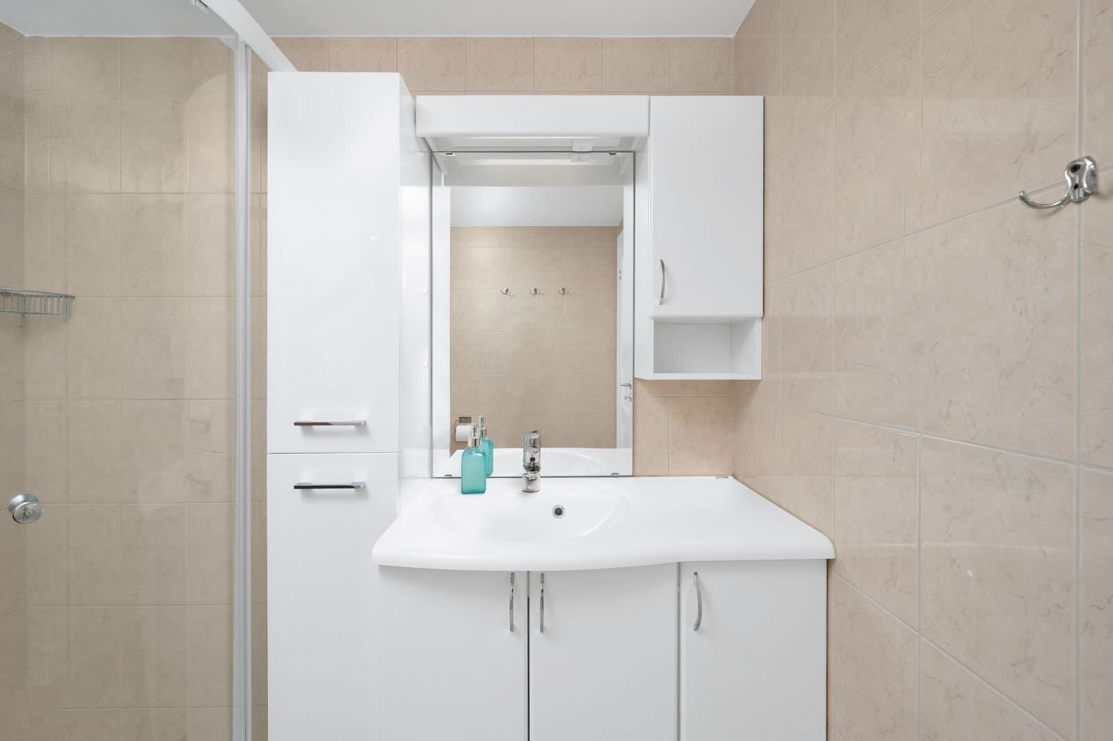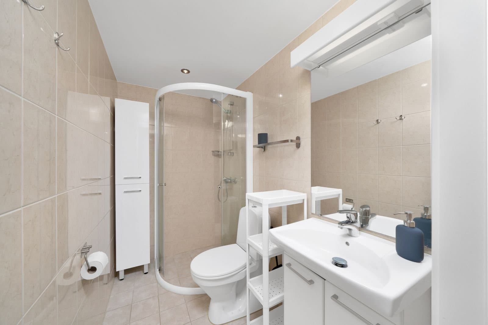 Din nye fritidsbolig - rom for rom: Romslig entre/Hall. Leiligheten har et hyggelig inngangsparti som gir et godt første inntrykk. Entreen er malt i en dempet, gyllen grønntone og har pene mørke fliser på gulv. Her har du god plass til å henge fra deg yttertøyet og sko i skyvedørs-garderoben. Stue: Stuen er boligens sosiale samlingspunkt. Stuen ligger i delvis åpen løsning mot kjøkkenet som gir en god romfølelse og er også malt i en dempet, gyllen grønntone. Du kan enkelt dele inn stuen i flere soner etter eget ønske. Det er god plass til sofa og spisebord, slik at hele familien kan samles til hyggelige sammenkomster. Vindusflatene gir godt med lysinnslipp. Fra stuen er det direkte utgang til innglasset terasse på ca. 24 kvm og en overbygget terasse på ca 21 kvm. Kjøkken: Kjøkkenet er lyst og pent med naturlig spiseplass mot stuen. Innredningen består laminerte plater malt i en dempet, gyllen grønntone med skufferekke og over- og underskap. Benkeplate i laminat med nedfelt oppvaskkum. Vegg over kjøkkenbenk er flisbelagt. Hvitevarene som medfølger med salg består av stekeovn med platetopp/induksjon, oppvaskmaskin samt kjøl/frys skap. Baderom: Leiligheten har to baderom, som er flisebelagt i lyse farger. Begge bad har klosett, dusjhjørne med høyskap og over og underskap med tilhørende speiler. På begge bad er det også nedfelte downlights som gir et moderne uttrykk. Soverom: Det er totalt tre gode soverom med vindu i leiligheten. 2 av soverommene har familiekøyer, mens et soverom har mulighet til å sette inn king size seng. Soverommene med familiekøyer er skapene utstyrt med hyller og delvis trådkurver. På soverom med king size seng er det skyvedørs-garderobe med 24 trådkurver som går fra gulv til tak. Innvendige overflater: Gulv: Oppholdsrom, entre og bad har fliser. Vegger: Malte panelplater og badene har fliser. Himling: Malt overflate. Hva ellers gjelder det tekniske om boligen og eiendommen generelt, henvises til tilstandsrapport og egenerklæringsskjema som er vedlagt. Det forutsettes at kjøper gjør seg kjent med disse før budgivning/kjøp. Innhold: Planløsning: Første etasje: Entre, stue/kjøkken, to bad, 3 soverom og en innglasset terasse. Leiligheten disponerer egen bod i felles trappeoppgang, se plantegning og seksjonspapirer. Oppvarming: Varmekabler i badene og forøvrig app.styrte termostatstyrte panelovner. Energikarakter: C Energifarge: Rød