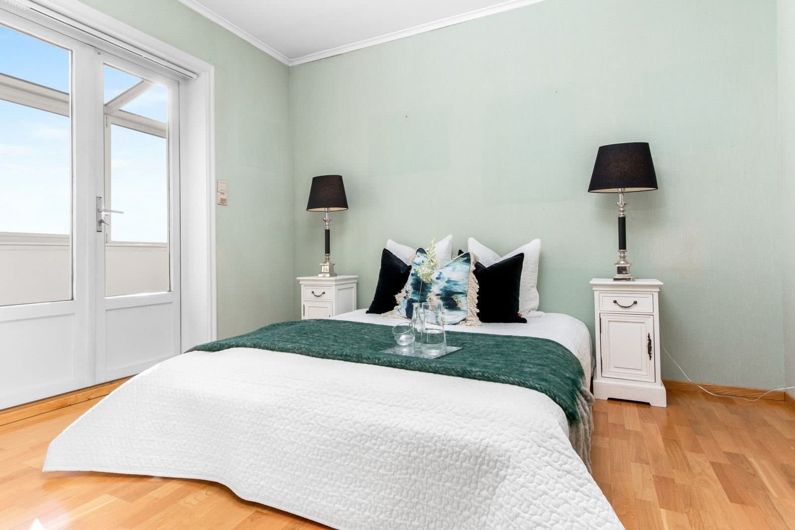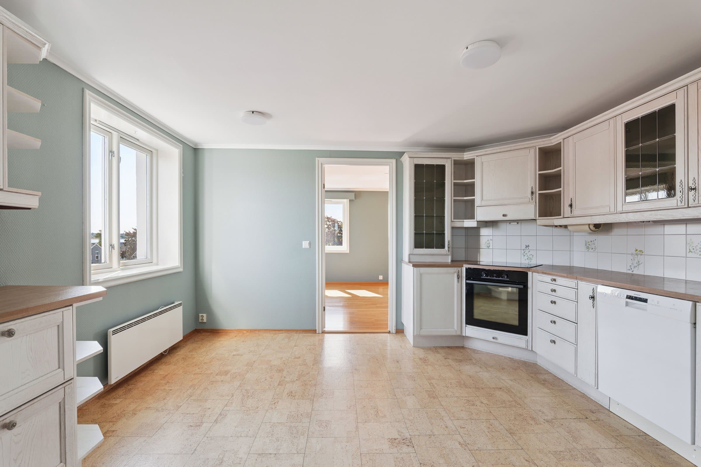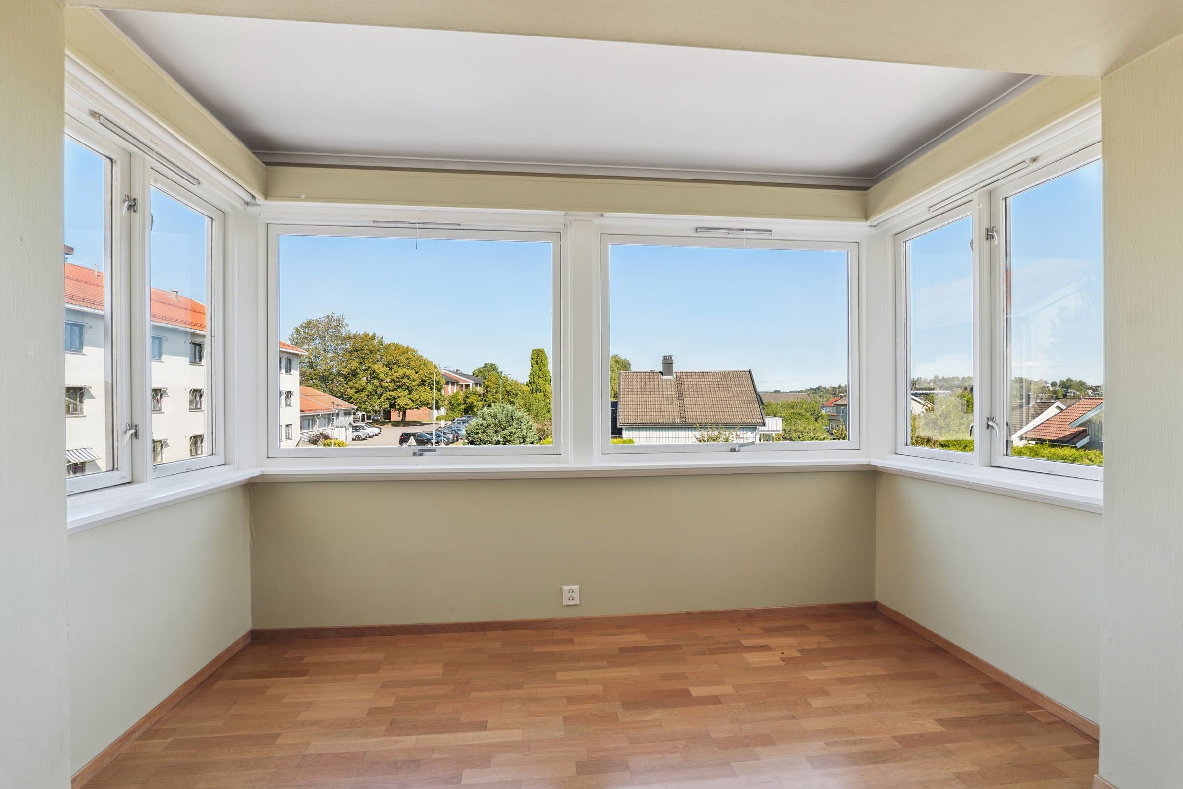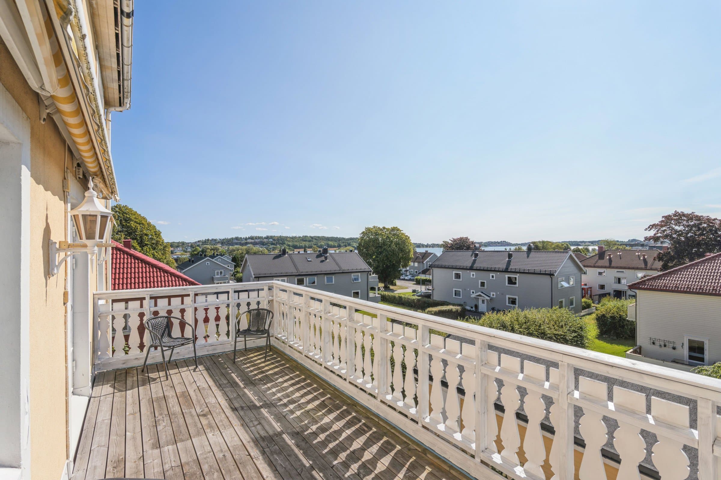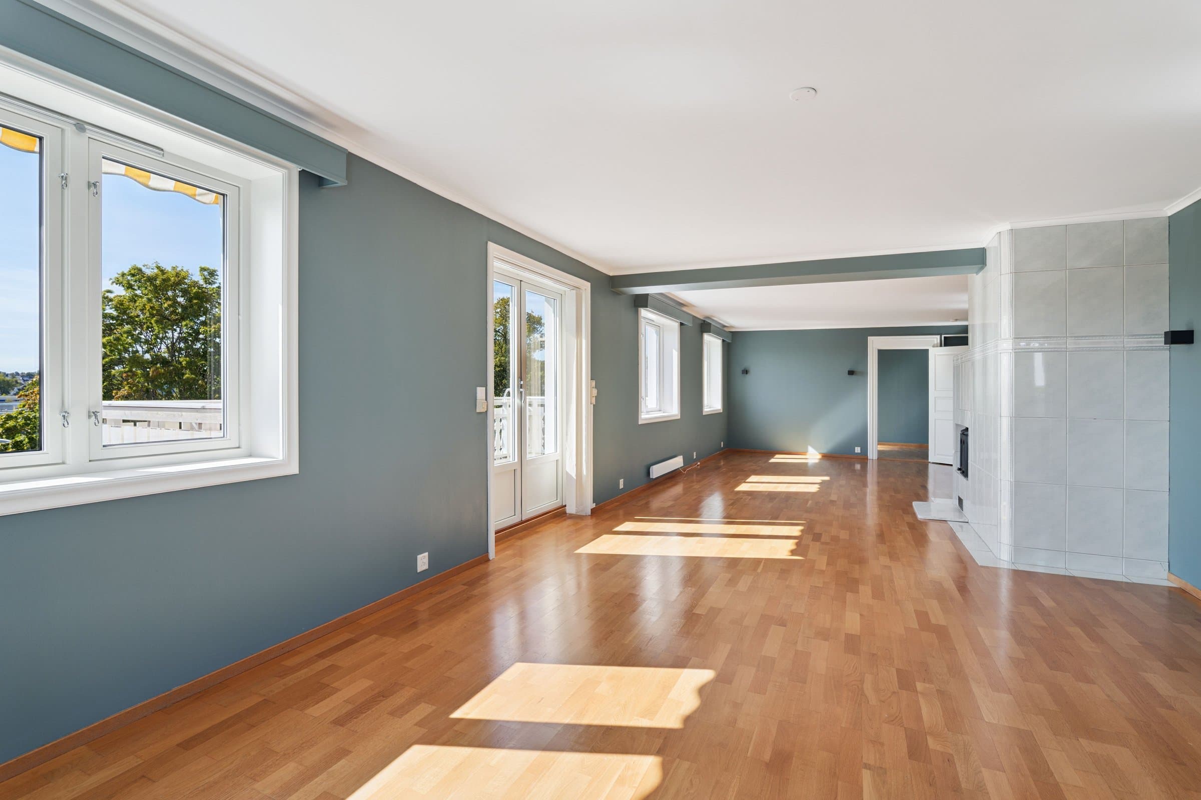Stor og lys leilighet på Træleborg – 144 kvm med sjøutsikt, to garasjeplasser i egen garasje og med gode utviklingsmuligheter. Velkommen til en romslig og gjennomgående leilighet på hele 144 kvm, som ligger i 2. etasje i et veletablert og rolig villastrøk på attraktive Træleborg. Her bor du fredelig og tilbaketrukket, samtidig som du har gangavstand til Tønsberg sentrum og alt Norges eldste by har å by på. Leiligheten har en sjeldent stor, åpen og luftig planløsning med mange vindusflater som gir rikelig med dagslys og sol fra morgen til kveld. Det er ikke ofte man kommer over en bolig på denne størrelsen på ett plan, sentralt i Tønsberg. Stuen er svært romslig og med mange muligheter for møblering. Balkongen på 16 kvm er solrik fra tidlig morgen til ettermiddagen, med god plass for møbler og planter. Det er to garasjeplasser i egen frittstående garasje, og i tillegg mulighet for å parkere på fellesområde for bygningen. Både vaskerom og romslig kjølerom gjør hverdagen enklere. Leiligheten inneholder: • Tre romslige soverom • To bad • Eget vaskerom og kjølerom • Kjøkken med plass til spiseplass • Stor stue med plass til spisestue og stuemøblement • Stor peis • Gjennomgående lys og god romfølelse • Stor sørvendt balkong på 16kvm med sjøutsikt • To innglassede balkonger • To garasjeplasser i egen dobbelgarasje- 32m2 • Boder i kjeller – 20kvm • Eget lagringsloft i leiligheten