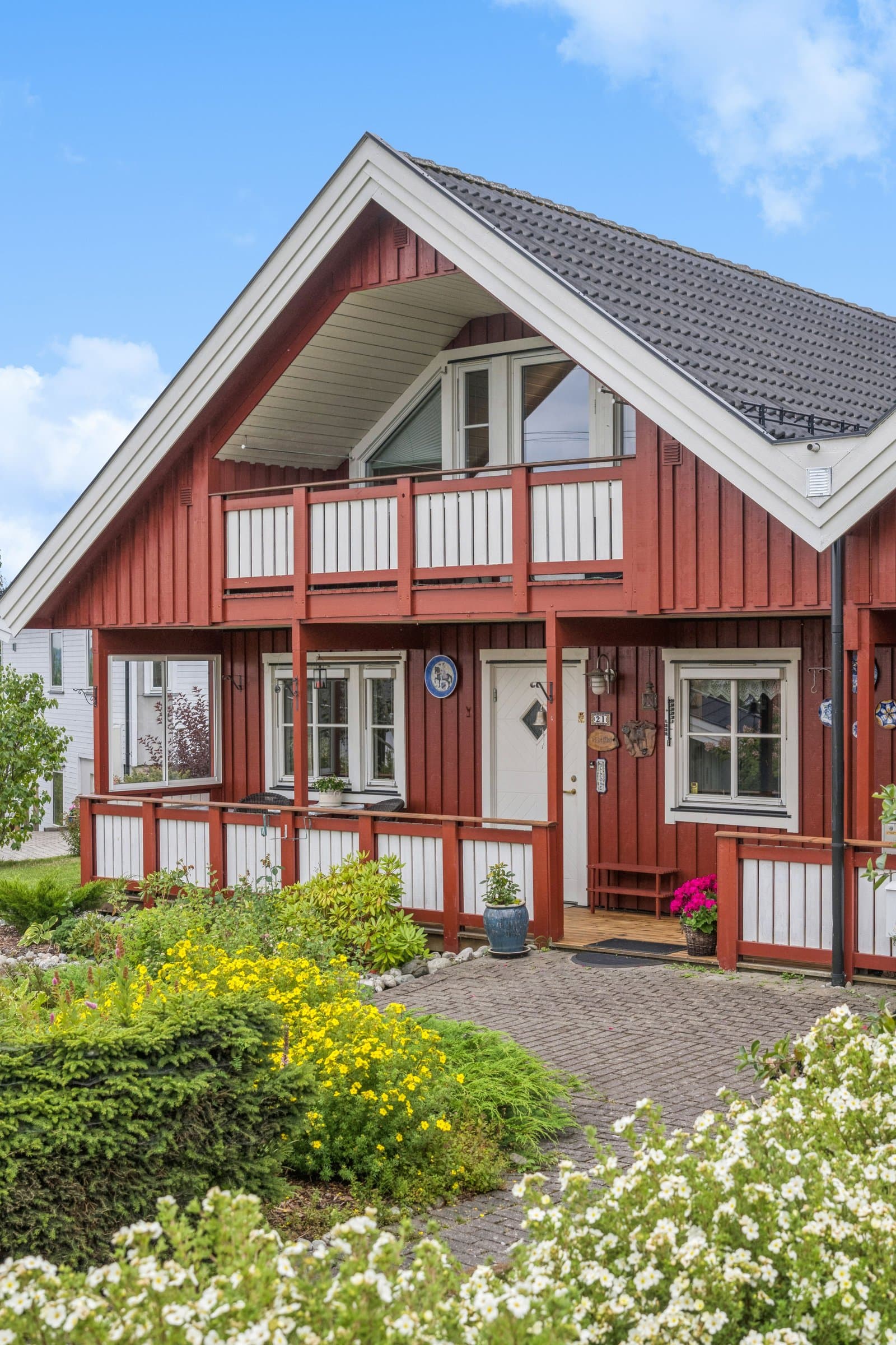 Velkommen til Kavegen 21. Her disponerer du en halvpart av tomannsbolig som går over to plan og som inneholder blant annet en romslig stue i delvis åpen løsning mot kjøkken, to bad med dusj, tre soverom, loftstue, balkong og solrik skjermet terrasse/uteplass. Godt med lagringsplass. Du går inn via et hyggelig overbygget inngangsparti med plass til en liten sittegruppe hvor man kan nyte morgensolen sammen med dagens avis og en kopp kaffe. Videre inn i entréen med flislagt gulv. Her er det etablert en praktisk skyvedørsgarderobe. Videre tar man seg inn til stuen hvor det er godt med plass til både sofagruppe og en sittegruppe om man ønsker det. En flott gasspeis varmer godt. Opplegg for TV. Stuen er i delvis åpen løsning med kjøkkenet. På kjøkkenet er det god plass til et stort spisebord. Lys profilert og delikat kjøkkeninnredning fra Sigdal med god skap- og benkeplass. Det er laminert benkeplate og fliser på bakveggen. Koketopp med gassbluss. Integrerte hvitevarer som komfyr, kjøleskap og oppvaskmaskin fra Electrolux. Avtrekksvifte fra Røroshetta. Fra stuen er det utgang til en romslig terrasse med hele tre sitteområder slik at solen kan nytes hele dagen. Det er et flislagt bad i 1. etasje med vannbåren gulvvarme. Baderomsinnredning med dobbel servant og under- og overskap, vegghengt toalett med hygienedusj og dusjkabinett. Den ene veggen er praktisk innredet med både høyskap, underskap og overskap, uttrekkbart strykebrett og utslagsvask. Opplegg for vaskemaskin og tørketrommel i vaskesøyle. Det er to soverom i 1. etasje. Hovedsoverommet har skyvedørsgarderobe. Badet i 2. etasje har vannbåren gulvvarme og er innredet med servant med underskap, toalett og dusjnisje. I gangen er det etablert skyvedører som rommer oppbevaringsmuligheter. Her finnes også ventilasjonsaggregatet og sentralstøvsuger. I 2. etasje er det en lys stue med god plass til sofagruppe og eller seng. Opplegg for TV. I denne etasjen finner du også et soverom med utgang til balkong.