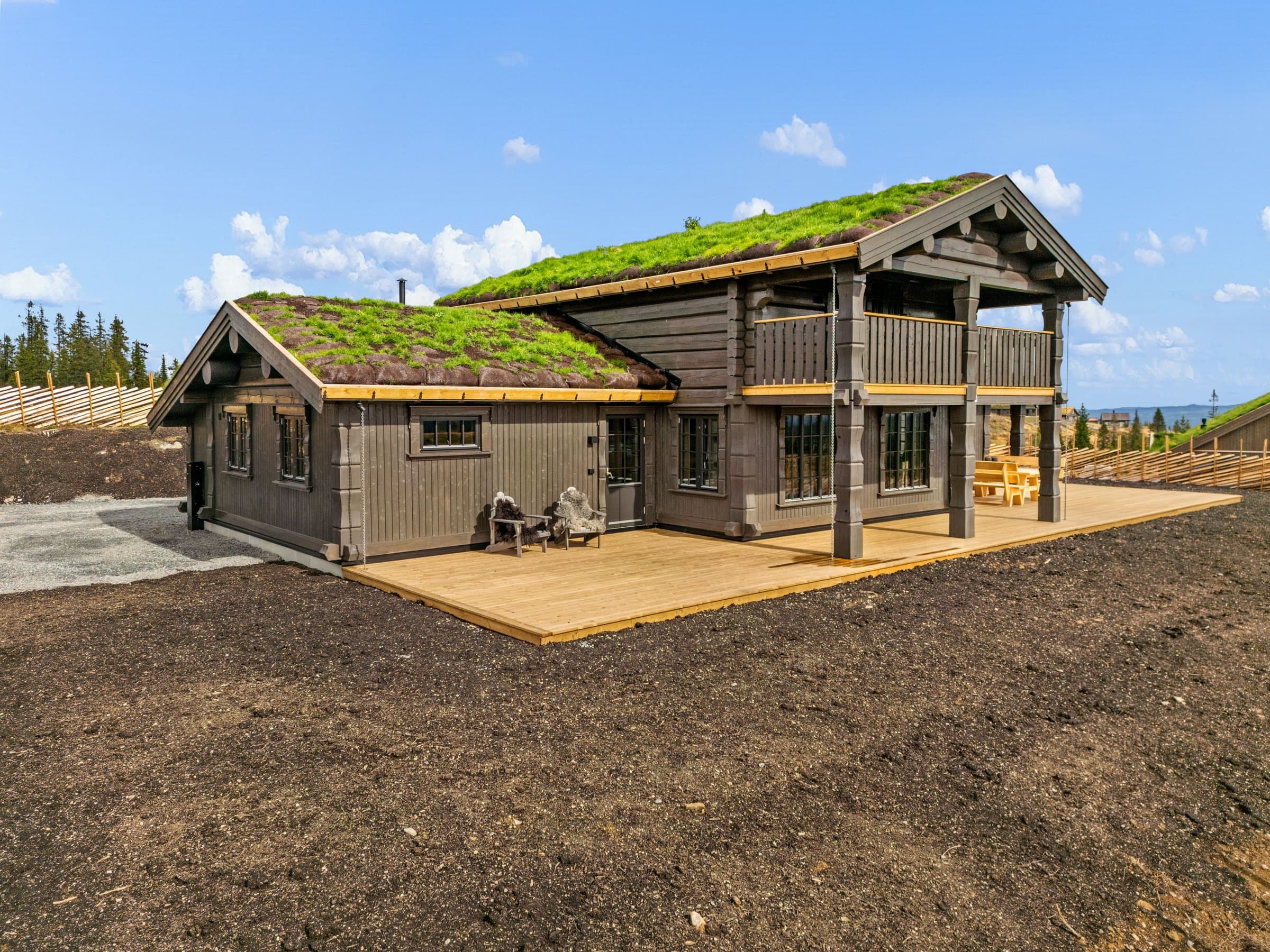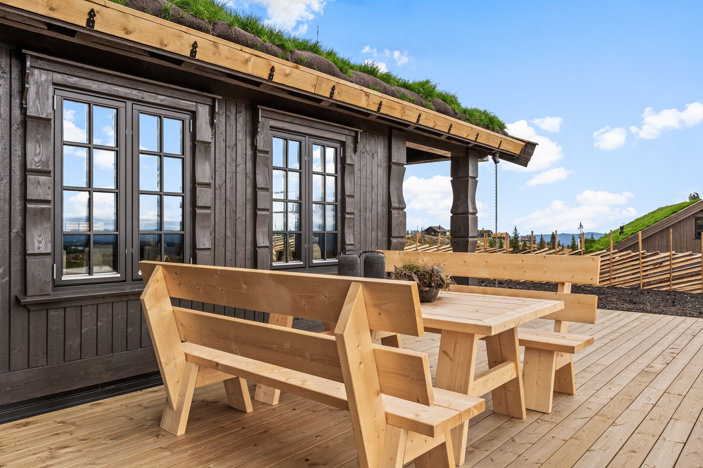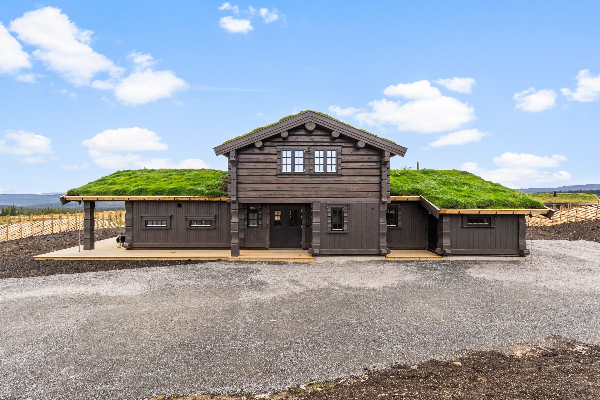 Hytten er en stavlafthytte med 8’’ laftetømmer i 2 etg, 1 etg er i stavlaft med 20 cm isolasjon i yttervegger. Plate på mark med ringmurselementer og 35 cm isolasjon og radonmembran i gulv. Etasjeskiller isolert med 20 cm isolasjon. Det er store glassflater som gir mye lys og kontakt med naturen og nydelig utsikt. Torvtak, Skjulte takrenner med kjetting som nedløp. Ferdig beiset utvendig, 3-lags vinduer, dobbel inngangsdør, dobbel balkongdør fra kjøkkenavdeling, enkel balkongdør fra soveromsgang. Energibrønn med 180 meter borehull, vannbåren varme i alle gulv 1 etasje, inkludert utvendig bod og utvendig teknisk rom, og i bad 2 etasje. Parkering: På egen tomt, det er montert EL-bil lader. Innhold Innholdsrik, lekker og romslig hytte med en gjennomtenkt planløsning. Her kombineres komfort, funksjonalitet og estetikk, og gir et ideelt sted for både avslapning og sosialt samvær. 1. etasje inneholder på stue, kjøkken/spisestue, romslig hall med garderobe, 2 soverom med en suite bad, et kombinert gjestetoalett/vaskerom WC, gang til soverom med utgang til terrasse. 2. etasje inneholder stue, bod, 3 soverom og 1 bad. Store terrasse på 125 m2, hvor deler av den er overbygget. Det er klargjort med rør fra elektriker for å trekke kabel til jaccuzi. Alle innvendige dører: 1-speils massive dører med i farge dempet sort, med dempelister. Alle utvendige dører og vinduer i farge dempet sort, vinduer med 3-lags glass. Våtsoner alle bad er bygget opp med Litex, og smøremembran på gulv. Smøremembran på gulv i wc/vaskerom og utvendig teknisk rom. Sprekkpanel 120 mm er fabrikkbeiset i farge Saltdalsgrå. Utvendig behandlet med Tyrilin i farge 597 Moskus.