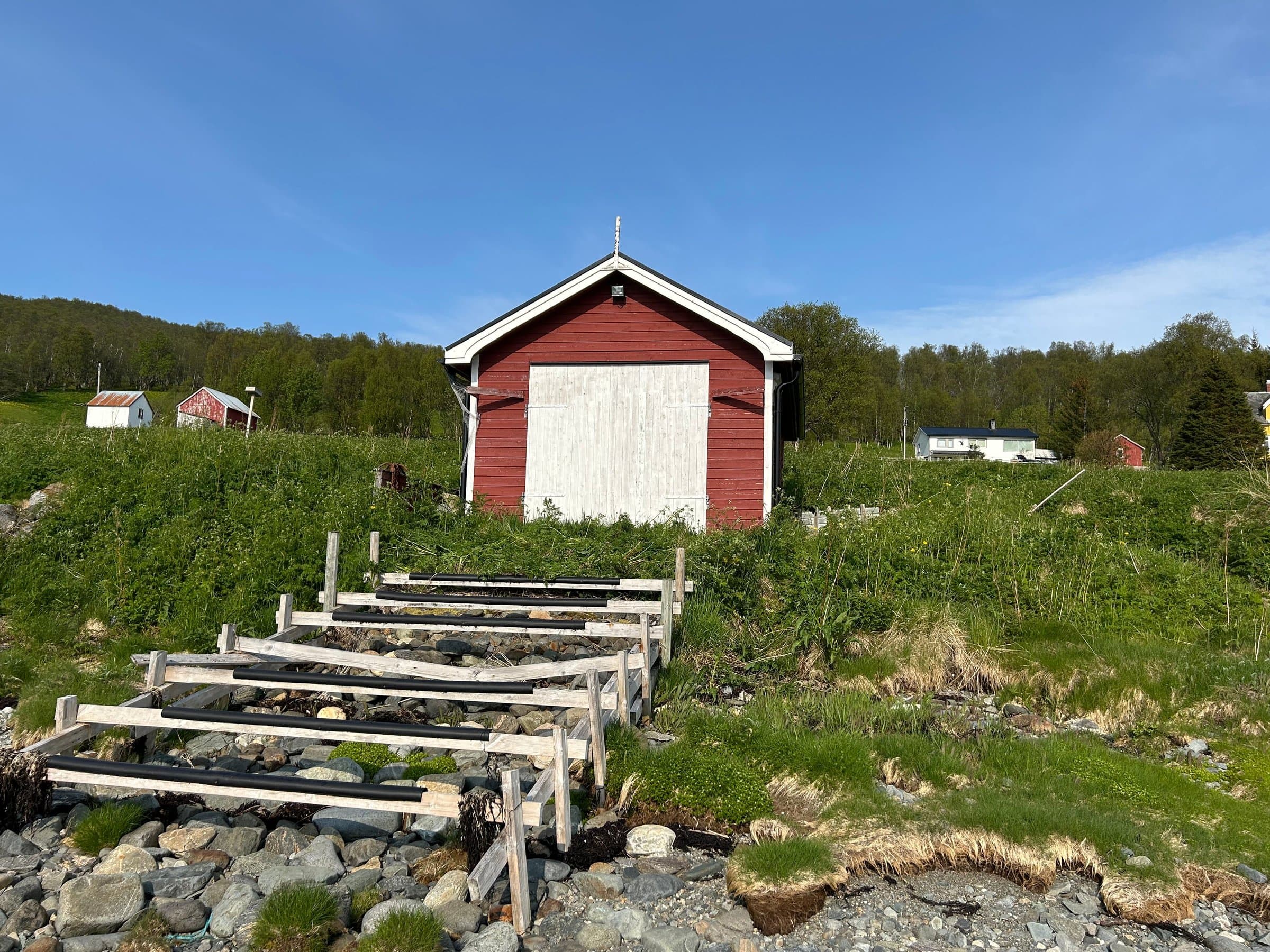 Enebolig/fritidseiendom med garasje og naust med liten strandlinje i vakre Lyngen nær Lyngsalpene