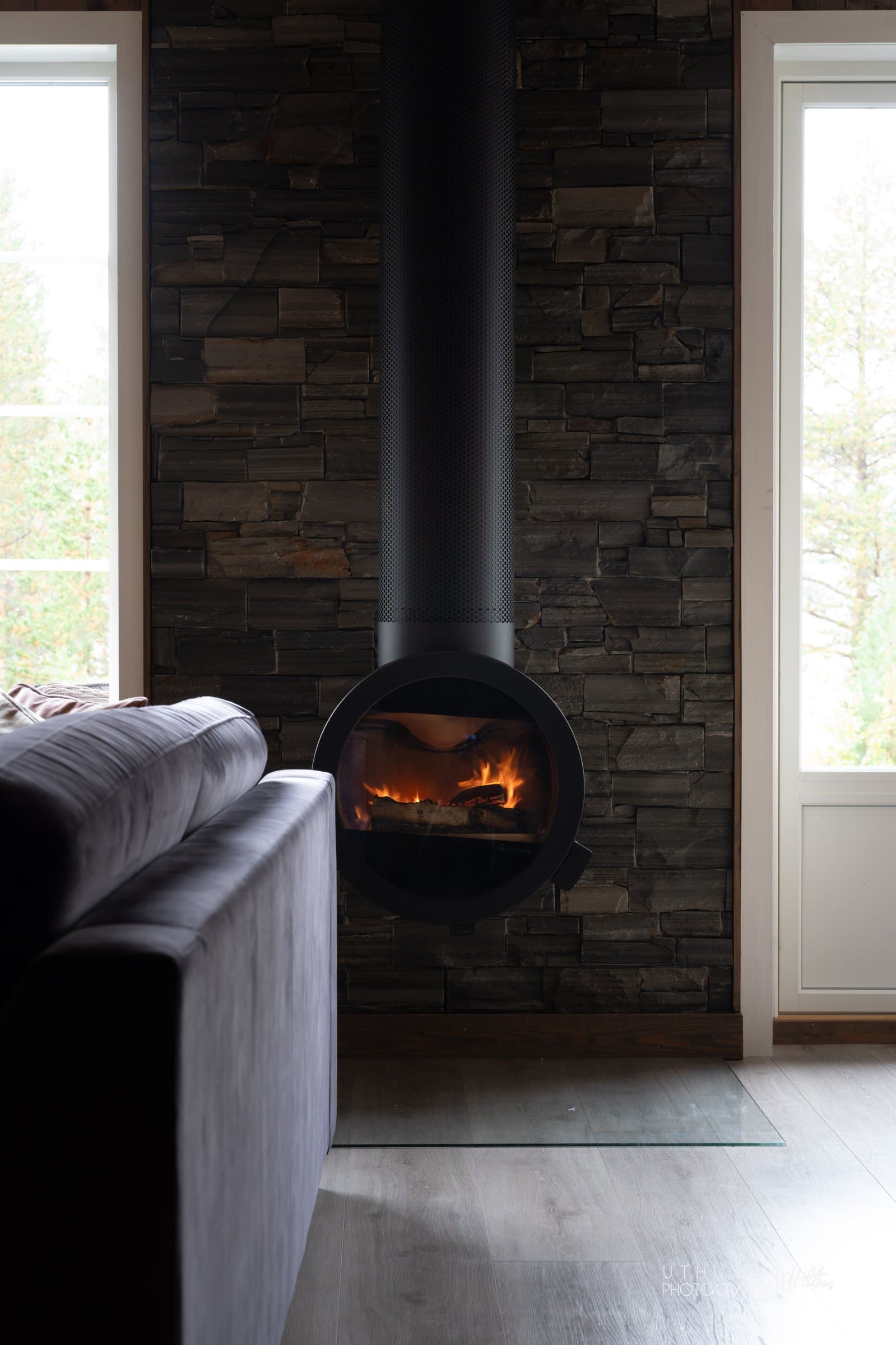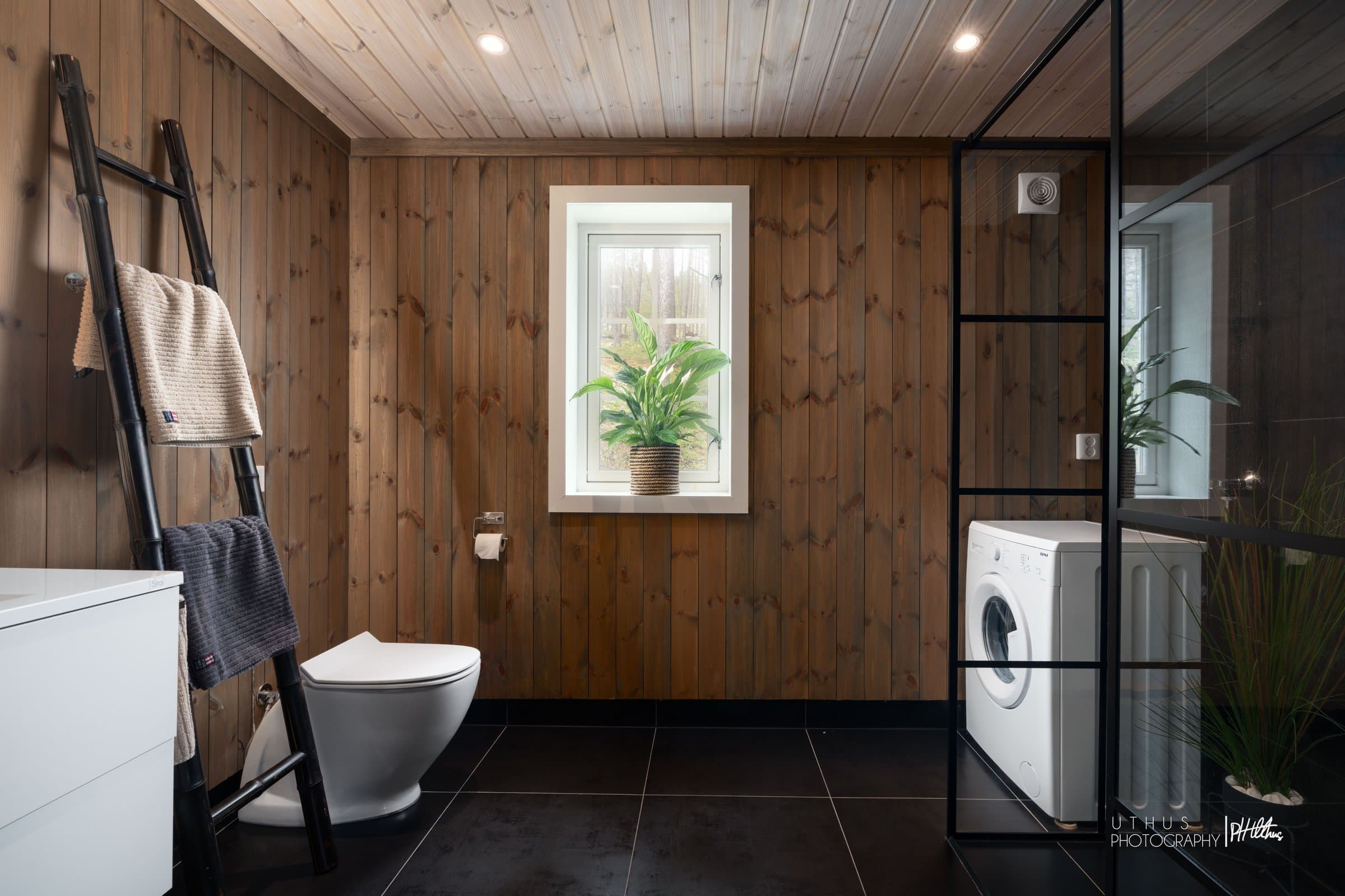 Gulv er tekket med korkvinyl med gode lyd- og varmeegenskaper, samt store fliser med gulvvarme i entré og bad. Vegger og tak er tekket med behandlet trepanel. Bygget består av støpt betong til grunn, isolert. Mellom etasjene er det bygget bjelkelag, isolert. Bygget er utført med radonsperre, og det er montert radonbrønn i vegg i sportsbod. Boligen har isolert stålpipe. I stuen er det montert en rentbrennende Nordpeis Me Ceiling peisovn. Glassplate er plassert på gulvet foran ovnen. I bygget er det montert tretrapp som er behandlet, det er montert rekkverk. Det er standard innvendige behandlede profilerte dører. BAD: Flislagt bad med gulvvarme. Vegger i dusjnisje er tekket med fliser. Utenfor dusj er vegger tekket med panel. Tak har trepanel. Synlig membran i sluk. Det er montert Strai baderomsinnredning med servanttopp. Det er montert en vannbesparende jets toalett, og dusjvegger. Det er montert el vifte i vegg, fuktstyrt. Det ble foretatt hulltaking i vegg mellom baderom og soverom. Det ble ikke indikert fukt eller symptomer/tegn til fukt i vegg bak dusj/våtsone. Det er klargjort med rør og strøm for et ekstra toalett og en servant i innvendig bod/teknisk rom. KJØKKEN: Kjøkkeninnredning fra Strai Rosendal med profilerte, malte fronter, stein benkeplate med nedfelt oppvaskkum, RørosHetta ventilator med utluft og innfelte hvitevarer som stekeovn, mikrobølgeovn, platetopp, oppvaskmaskin samt kjøl/frys. Hvitevarer er fra AEGs toppserie. Komfyrvakt: Ja Automatisk lekkasjestopper: Ja SPORTSBOD: Stor innvendig sportsbod med plass til ski, sykler og annet utstyr. Egen utgangsdør fra sportsbod. .