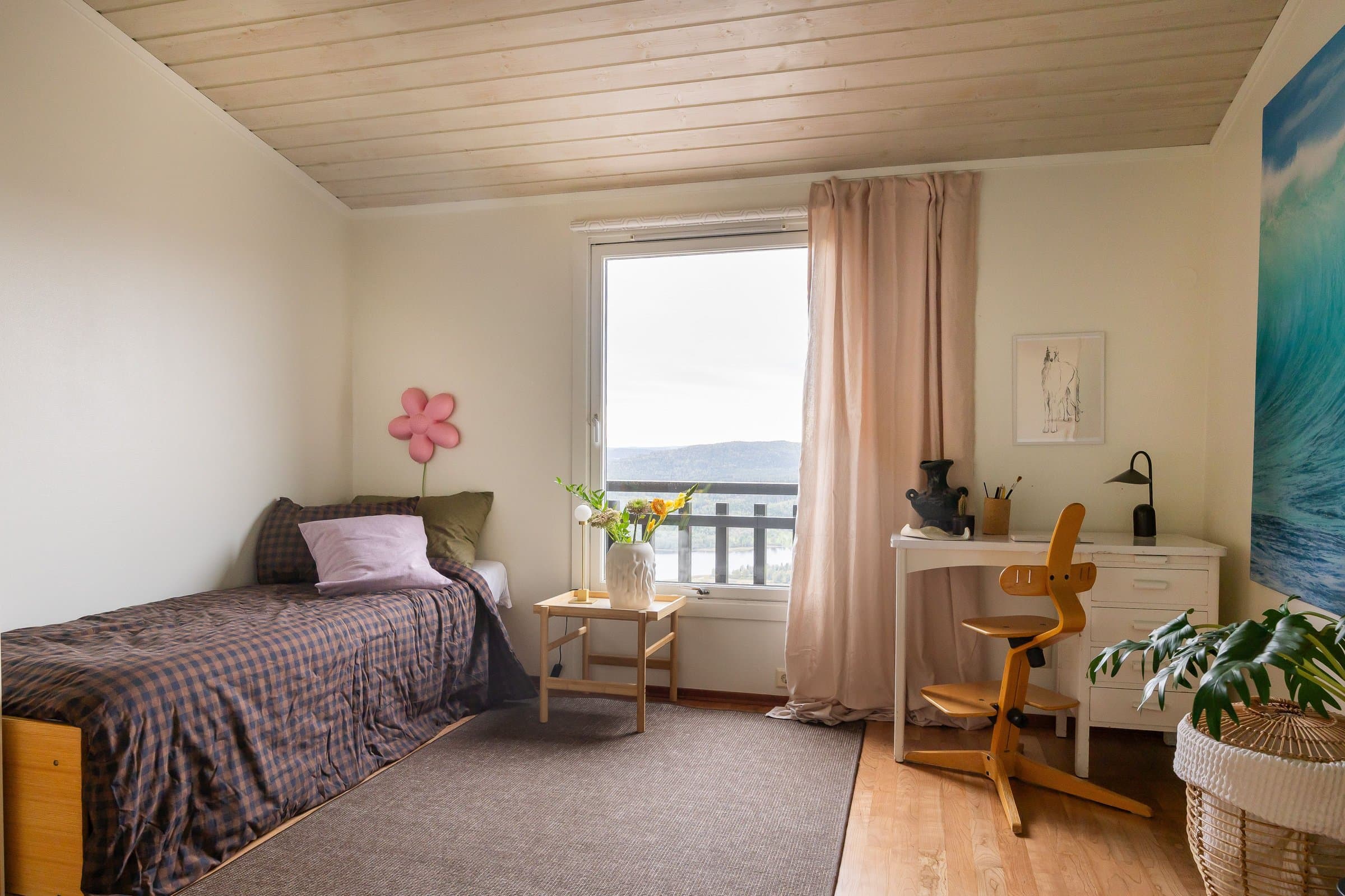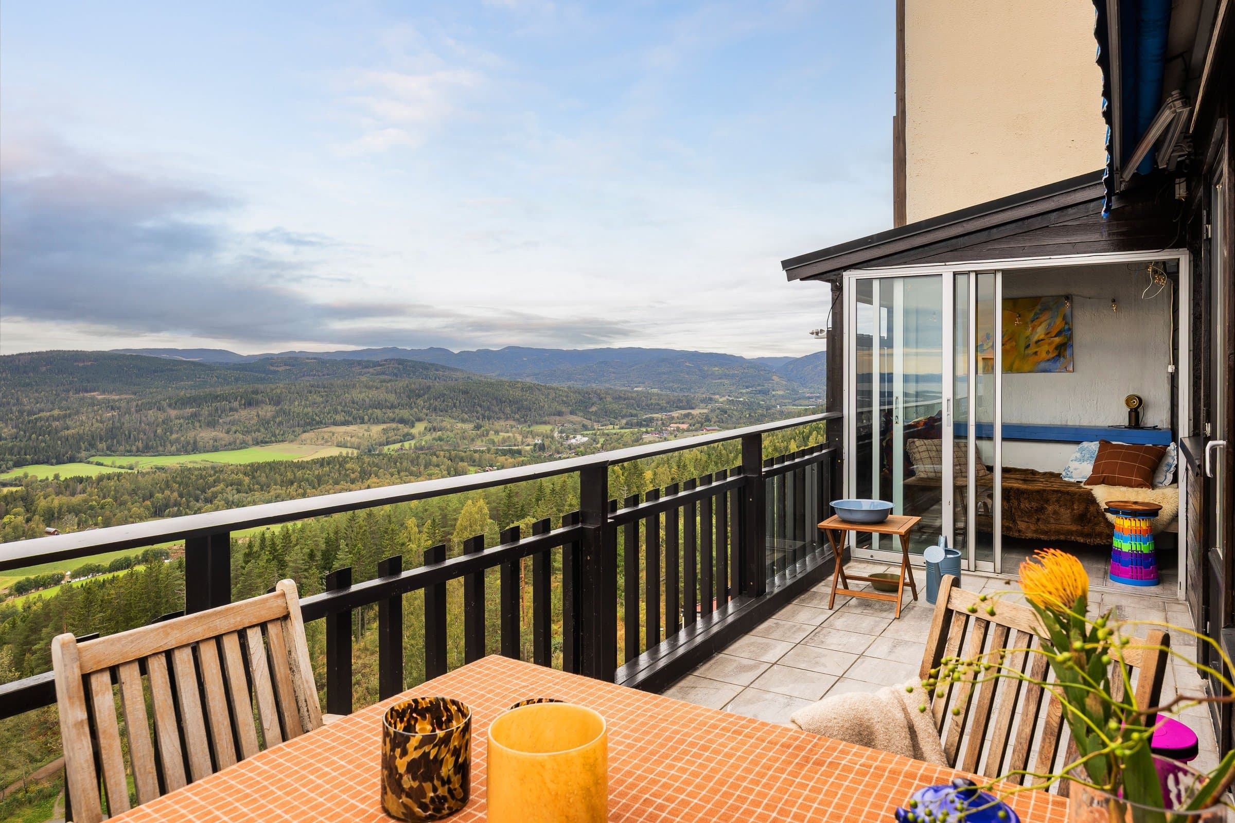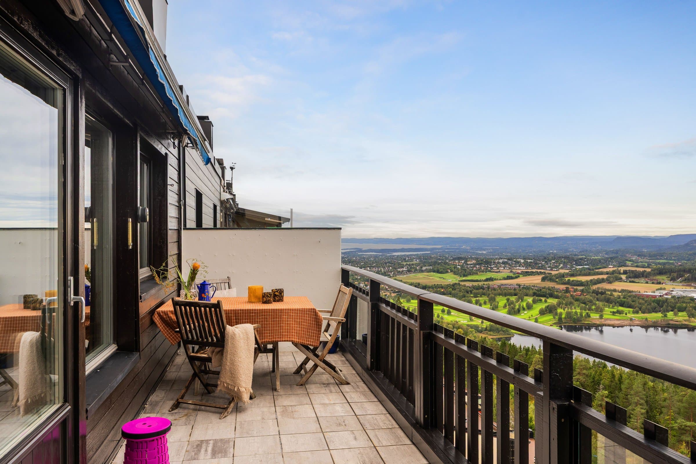 Av alle de 202 leilighetene på Skogen boligsameie, er kanskje dette den som har "alt" - den er på toppen av sameiet og har høyden som gir den eventyrlige utsikten - og ikke noe heishus som forstyrrer utsikten, heishuset gir derimot veldig god ly mot vær fra sør og nord, vestvendt usjenert balkong med god utsikt sydover, vestover og nordover, god takhøyde (3.76m) med hems, vinterhage, mye bodplass (5 boder), endeleilighet, rolige naboer, veldrevet sameie, trivelige fellesområder, nyoppusset inngangsparti, heishus (pågående) og heiser (nye i desember 2024), oppvarmet heisrom på enden (dvs. ikke kald yttervegg). Denne leiligheten har det meste du kan ønske deg.