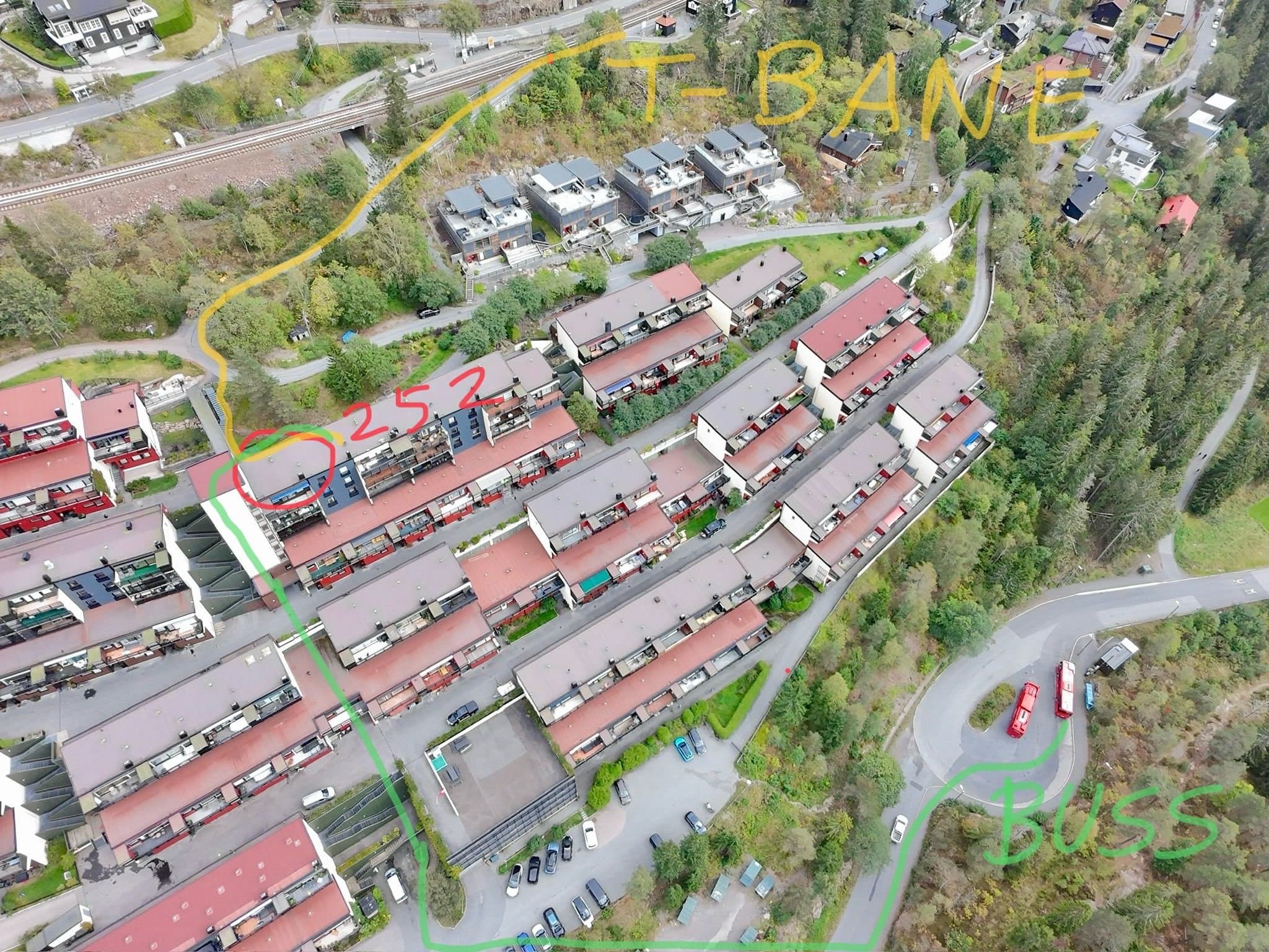 På Skogen er vi så heldige at vi har to kollektivstoppesteder like ved sameiet. T-bane linje 1: Rett ovenfor sameiet ligger Skogen stasjon (378 m.o.h., 122 m i luftlinje) med kvartersruter til/fra Ellingsrudåsen/Helsfyr via Majorstuen og Oslo sentrum. Denne banen kan du også ta opp til Frognerseteren. Gangtid fra leiligheten til stasjonen er 2-3 minutter i slak oppoverbakke. Busslinje 42, 45 og 42N: Bussholdeplass Voksen Skog ligger rett nedenfor sameiet, se flyfoto. Gangtid fra leiligheten til bussholdeplass er 5-7 minutter. For detaljerte rutetider, se Ruter.no Veiadkomst: Hovedadkomst til Skogen sameie og leiligheten er via Bogstad -> Olaf Bulls vei -> Arnulf Øverlands vei, for parkering i garasjen og vanlig transport til og fra leiligehten via heisene. Skal du kjøre møbler eller andre store/tunge ting inn i leiligheten, er det en alternativ rute via Besserud inn Setra vei, så opp til Lillevansveien til Skogen stasjon og ned under T-banen der, så kommer du til Arnulf Øverlands vei 252 på "baksiden" og med bil kommer du helt frem til inngangspartiet.