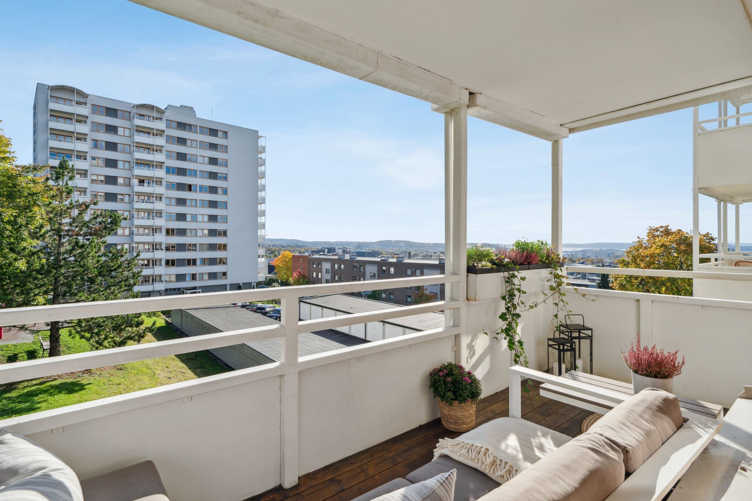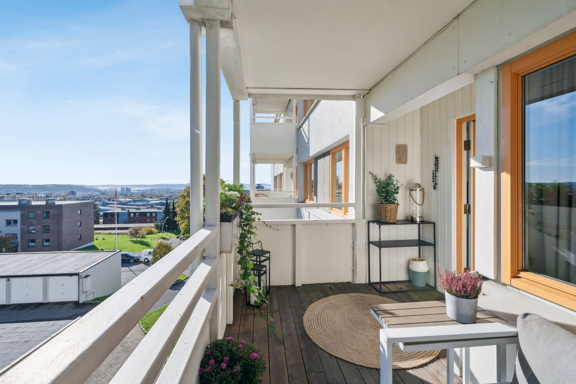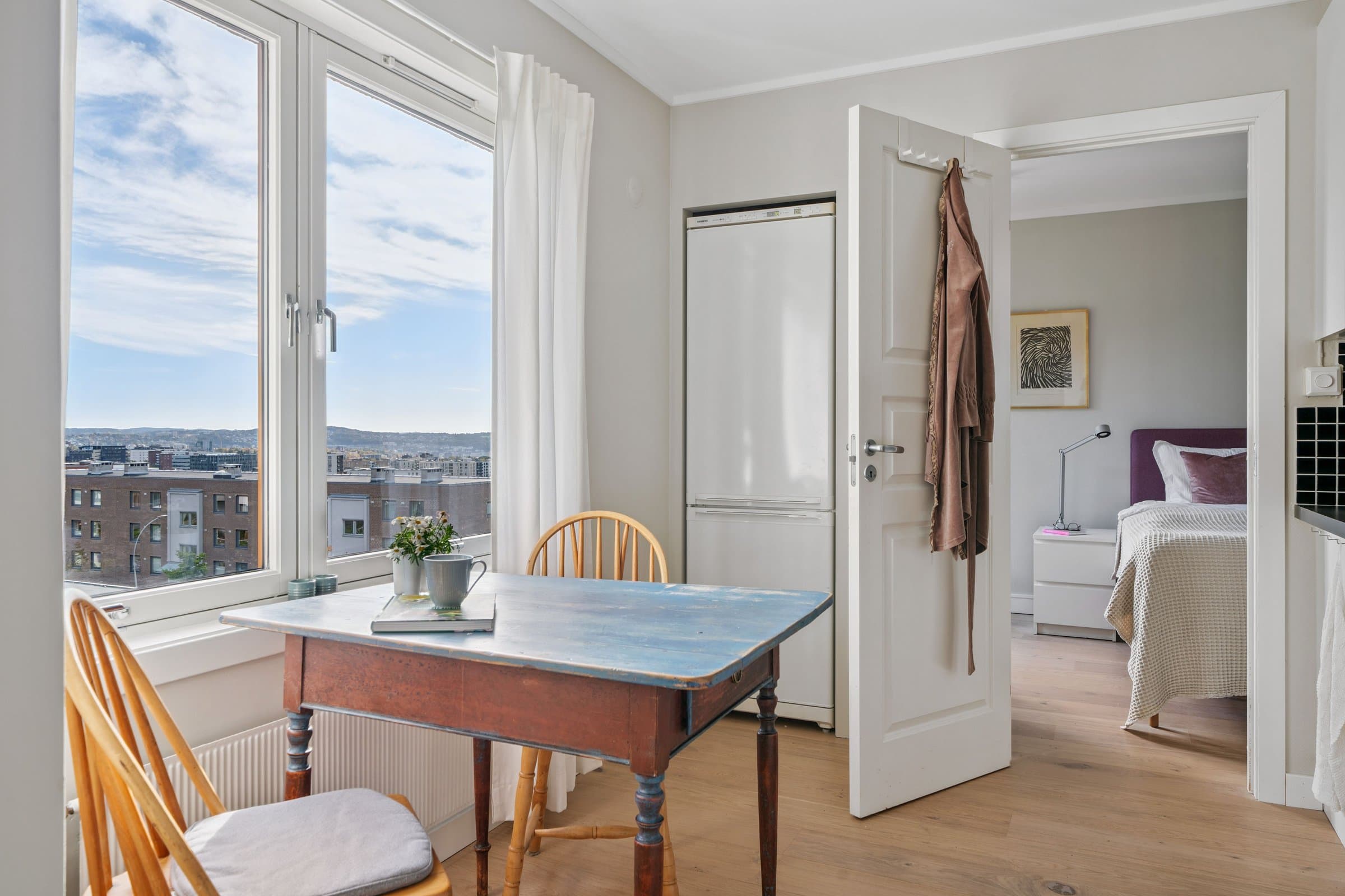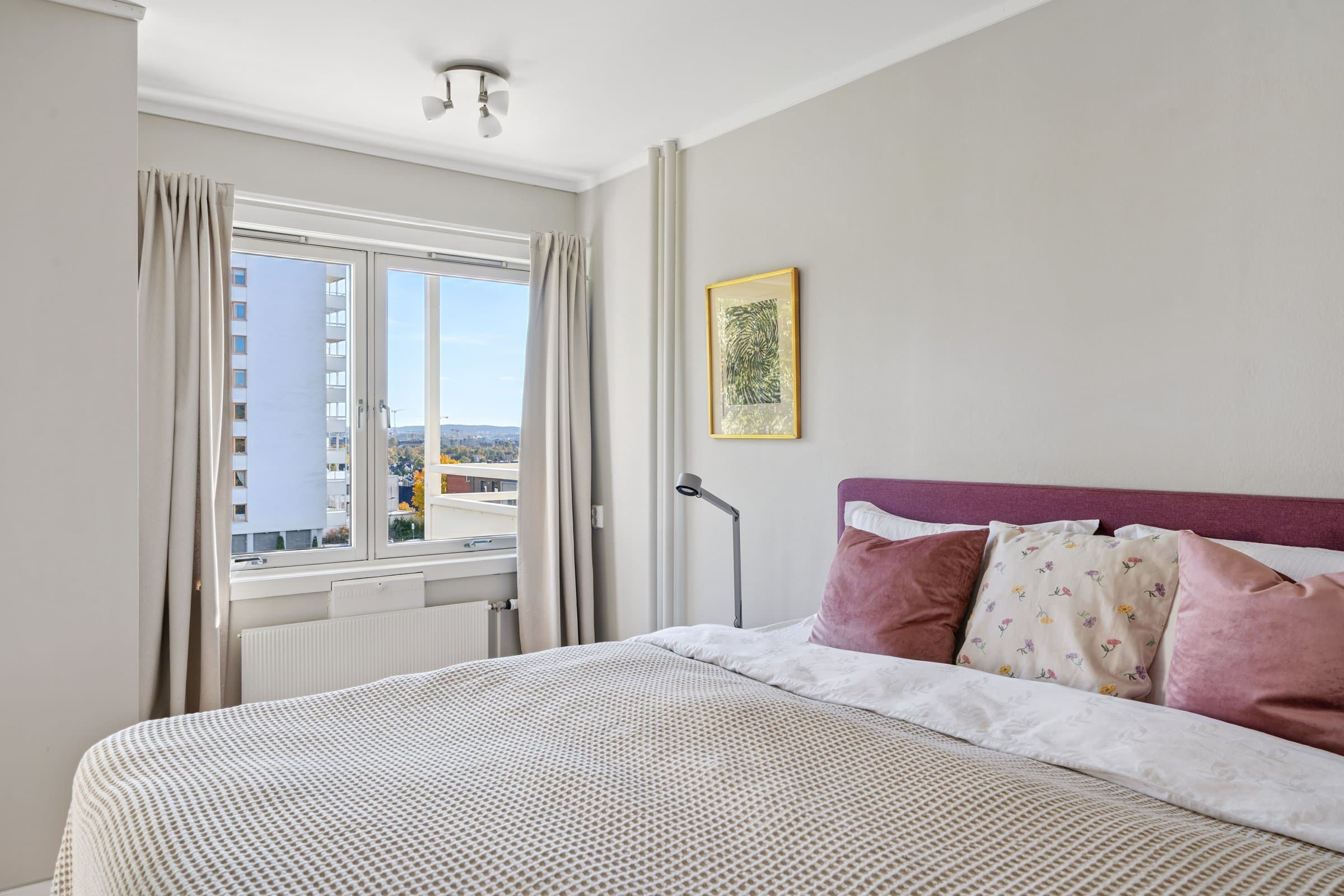 ENTRE: Denne er godt utnyttet og har god plass til klær: To garderobeskap og en knaggrekke. Entremøbler som kommode og en stol. Entreen har lyse, slette vegger og parkettgulv. Speildører i garderobeskap. STUE: Stuen framstår som lys og innbydende med utsikt mot grøntareal og mot byen. Den er nyoppusset (2024) i lyse, tidløse farger ( Sense, og med enstavs eikeparkett. Plass til både hjørnesofa og spisestuemøblement. Og en vegg for TV. Fra stuen er det utgang til en romslig balkong (8 kvm), som er tett beliggende på grøntareal, rolig, og med flott utsikt over byen. KJØKKEN: Den største kvaliteten ved kjøkkenet er egentlig utsikten fra kjøkkenbordet! Og at kjøkkenet er dels skjermet fra stuen, slik at man slipper å se rotet på kjøkkenbenken fra sofaen. Kjøkkeninnredningen er endel år gammel, (2012) men fungerer utmerket og rommer mye. Komfyr, ventilator (ny), kjøl/frys og mikrobølgeovn følger med. Kjøleskapet er bygget inn i en nisje tatt fra soverommet, slik at spiseplassen ved kjøkkenet blir romsligere (gjort i 2024). BAD: Badet er ikke stort, men det har alt du trenger: Dusjhjørne, servant, speil, oppbevaringsplass, elektrisk håndkletørker og vaskemaskin. Men siden borettslaget har et velfungerende moderne fellesvaskeri i 1. etg, bruker jeg nesten aldri egen vaskemaskin. Badet ble pusset opp i regi av borettslaget i 2011. Og gulvvarmen her inngår i fellesutgiftene. SOVEROM 1: Her får du plass til 180-seng med nattbord og adkomst fra begge sider. Og i tilknytning til soverommet er det en romslig walk-in med mye oppbevaringsplass - også på toppen. Soverommet er rolig beliggende uten plagsom trafikkstøy. SOVEROM 2: Egnet til både gjesterom, hjemmekontor og barnerom. Rolig beliggende uten trafikkstøy. Du får fint plass til en dobbeltseng på 150 cm bredde om du vil. BALKONG: Her er det plass til sofa eller spisemøblement, og til grill, om du vil. Herlig, skjermet nærhet til det grønne, og med flott utsikt. Balkongen er sørøst-vendt, og har sol fram til ca 14-14.30. En fordel på hete sommerdager!