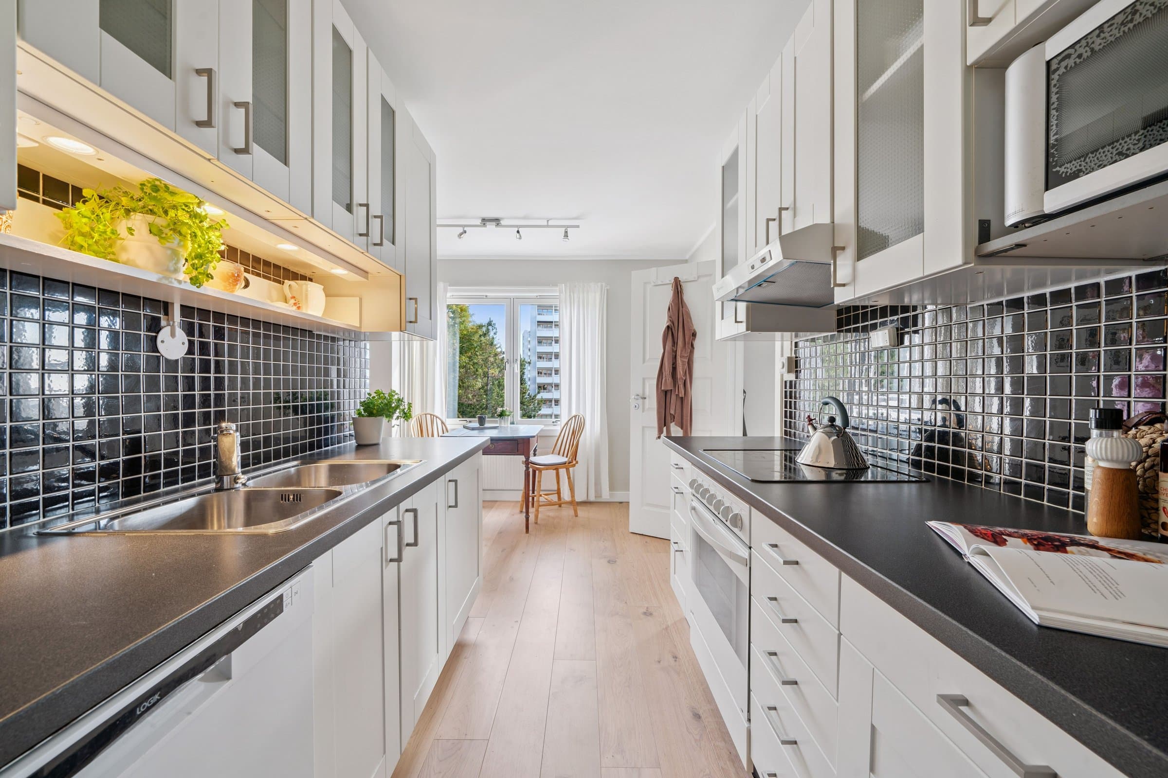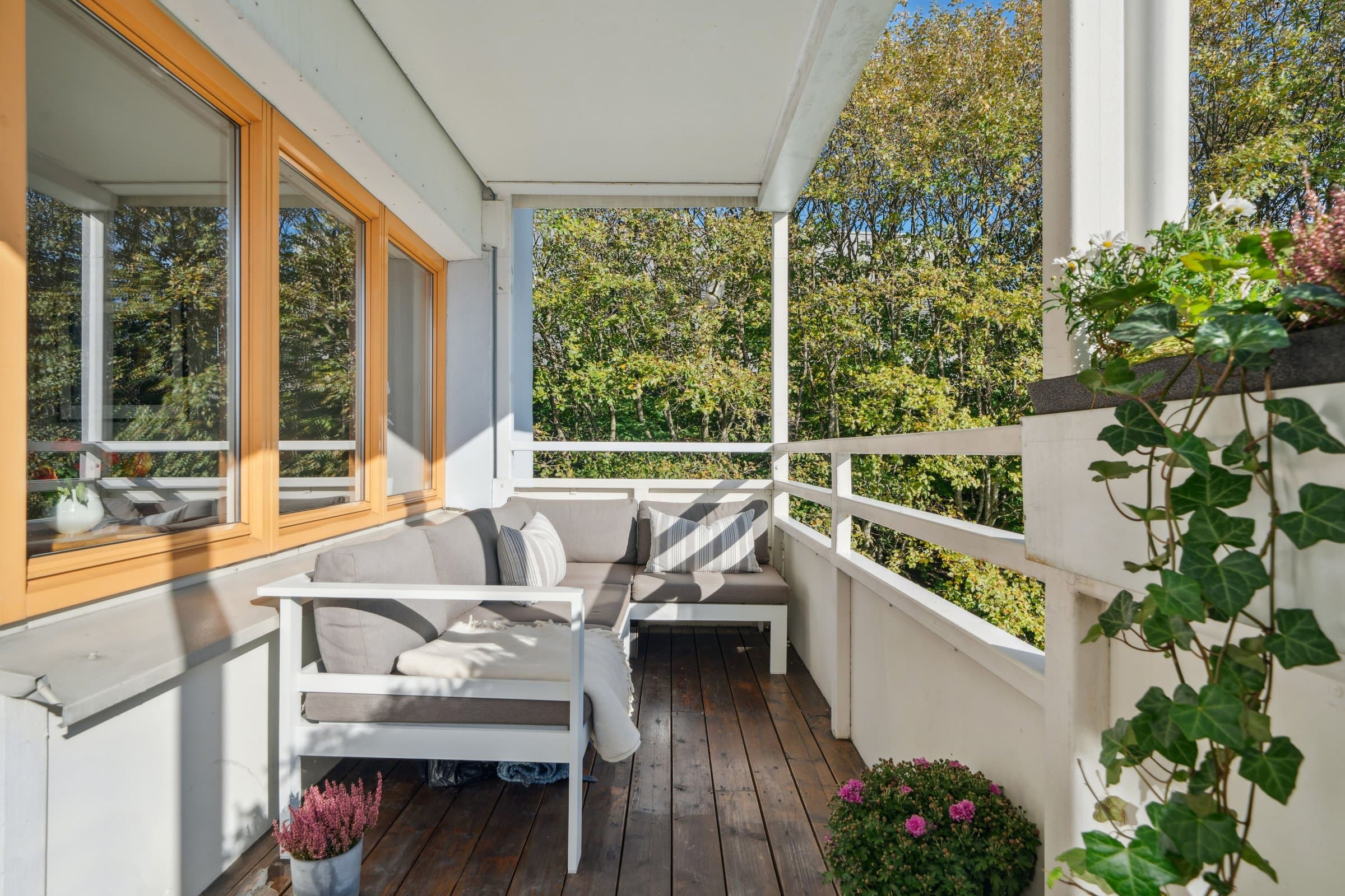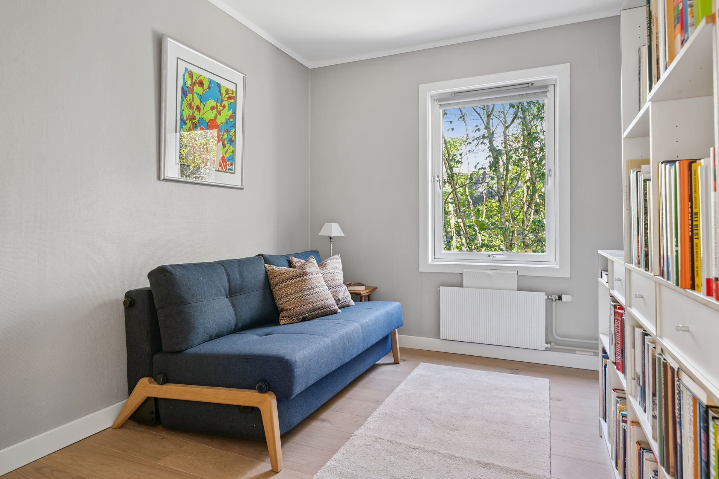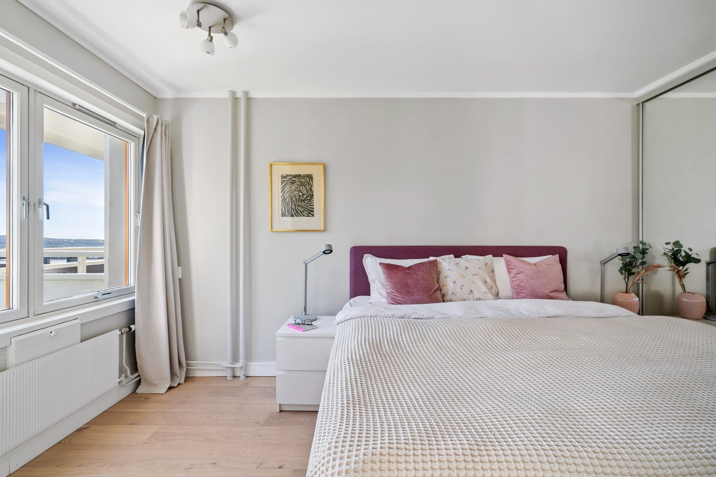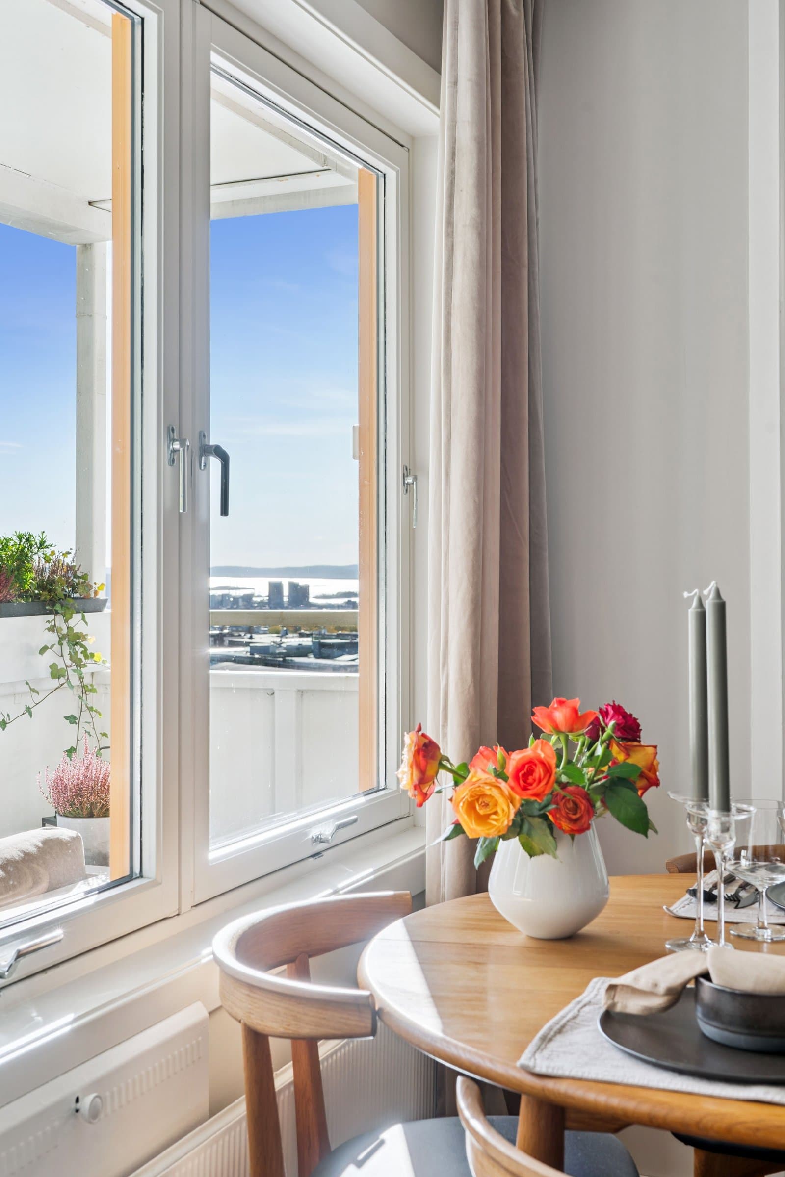 ENTRE: Denne er godt utnyttet og har god plass til klær: To garderobeskap og en knaggrekke. Entremøbler som kommode og en stol. Entreen har lyse, slette vegger og parkettgulv. Speildører i garderobeskap. STUE: Stuen framstår som lys og innbydende med utsikt mot grøntareal og mot byen. Den er nyoppusset (2024) i lyse, tidløse farger ( Sense, og med enstavs eikeparkett. Plass til både hjørnesofa og spisestuemøblement. Og en vegg for TV. Fra stuen er det utgang til en romslig balkong (8 kvm), som er tett beliggende på grøntareal, rolig, og med flott utsikt over byen. KJØKKEN: Den største kvaliteten ved kjøkkenet er egentlig utsikten fra kjøkkenbordet! Og at kjøkkenet er dels skjermet fra stuen, slik at man slipper å se rotet på kjøkkenbenken fra sofaen. Kjøkkeninnredningen er endel år gammel, (2012) men fungerer utmerket og rommer mye. Komfyr, ventilator (ny), kjøl/frys og mikrobølgeovn følger med. Kjøleskapet er bygget inn i en nisje tatt fra soverommet, slik at spiseplassen ved kjøkkenet blir romsligere (gjort i 2024). BAD: Badet er ikke stort, men det har alt du trenger: Dusjhjørne, servant, speil, oppbevaringsplass, elektrisk håndkletørker og vaskemaskin. Men siden borettslaget har et velfungerende moderne fellesvaskeri i 1. etg, bruker jeg nesten aldri egen vaskemaskin. Badet ble pusset opp i regi av borettslaget i 2011. Og gulvvarmen her inngår i fellesutgiftene. SOVEROM 1: Her får du plass til 180-seng med nattbord og adkomst fra begge sider. Og i tilknytning til soverommet er det en romslig walk-in med mye oppbevaringsplass - også på toppen. Soverommet er rolig beliggende uten plagsom trafikkstøy. SOVEROM 2: Egnet til både gjesterom, hjemmekontor og barnerom. Rolig beliggende uten trafikkstøy. Du får fint plass til en dobbeltseng på 150 cm bredde om du vil. BALKONG: Her er det plass til sofa eller spisemøblement, og til grill, om du vil. Herlig, skjermet nærhet til det grønne, og med flott utsikt. Balkongen er sørøst-vendt, og har sol fram til ca 14-14.30. En fordel på hete sommerdager!