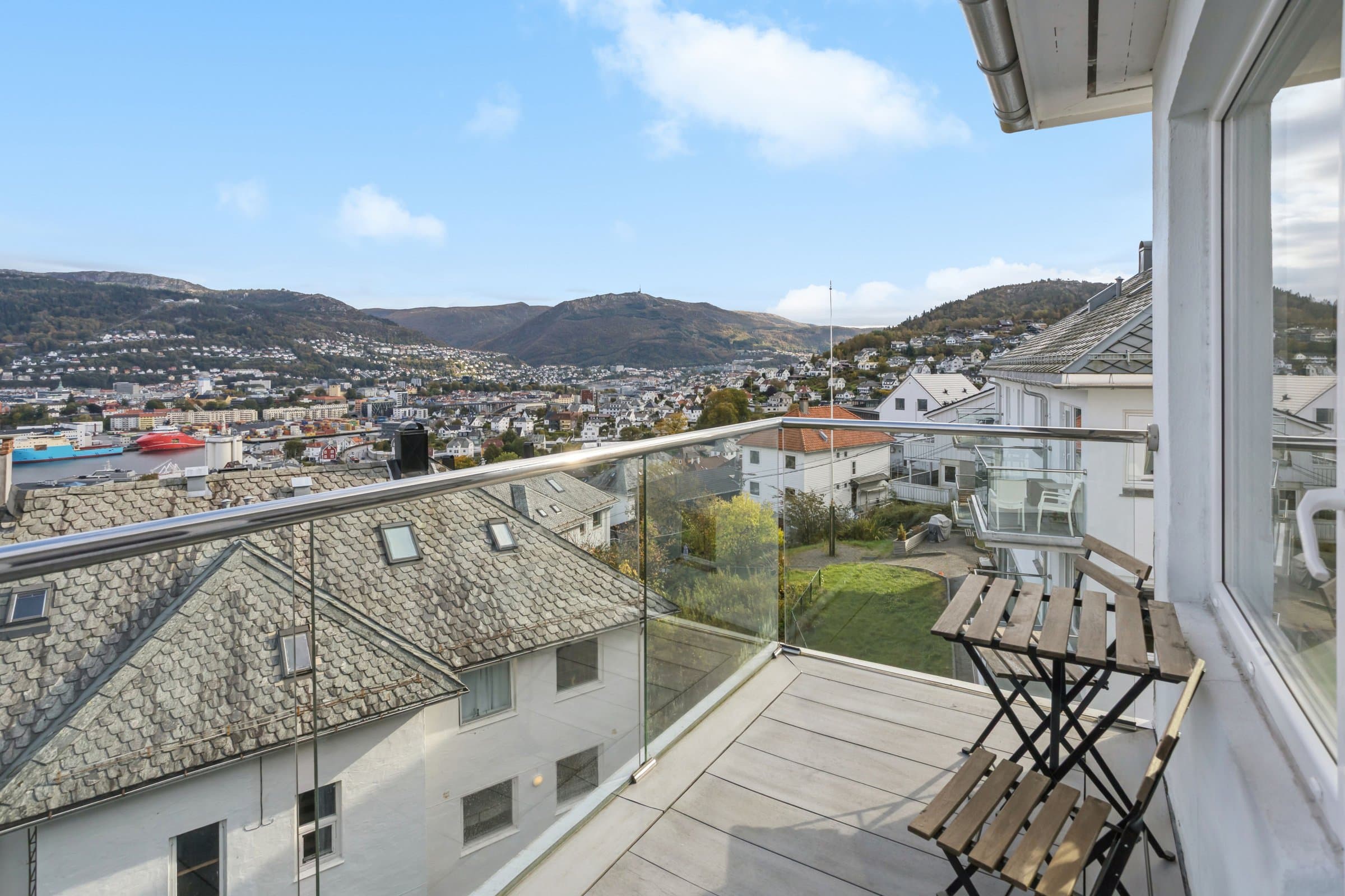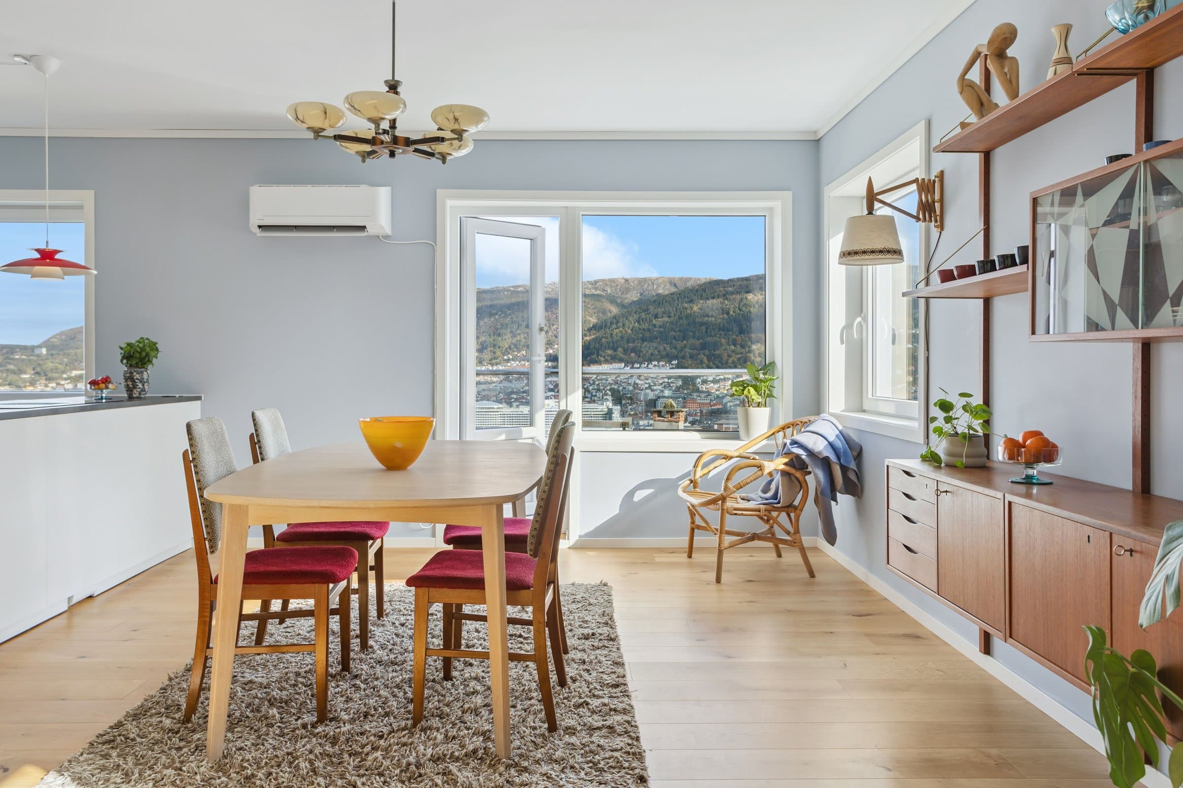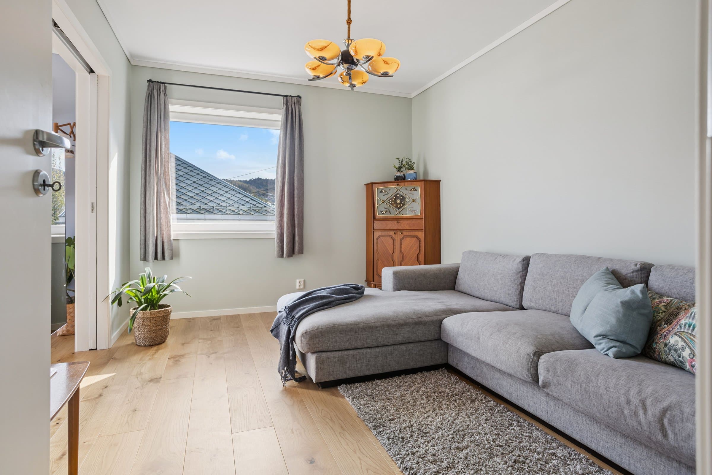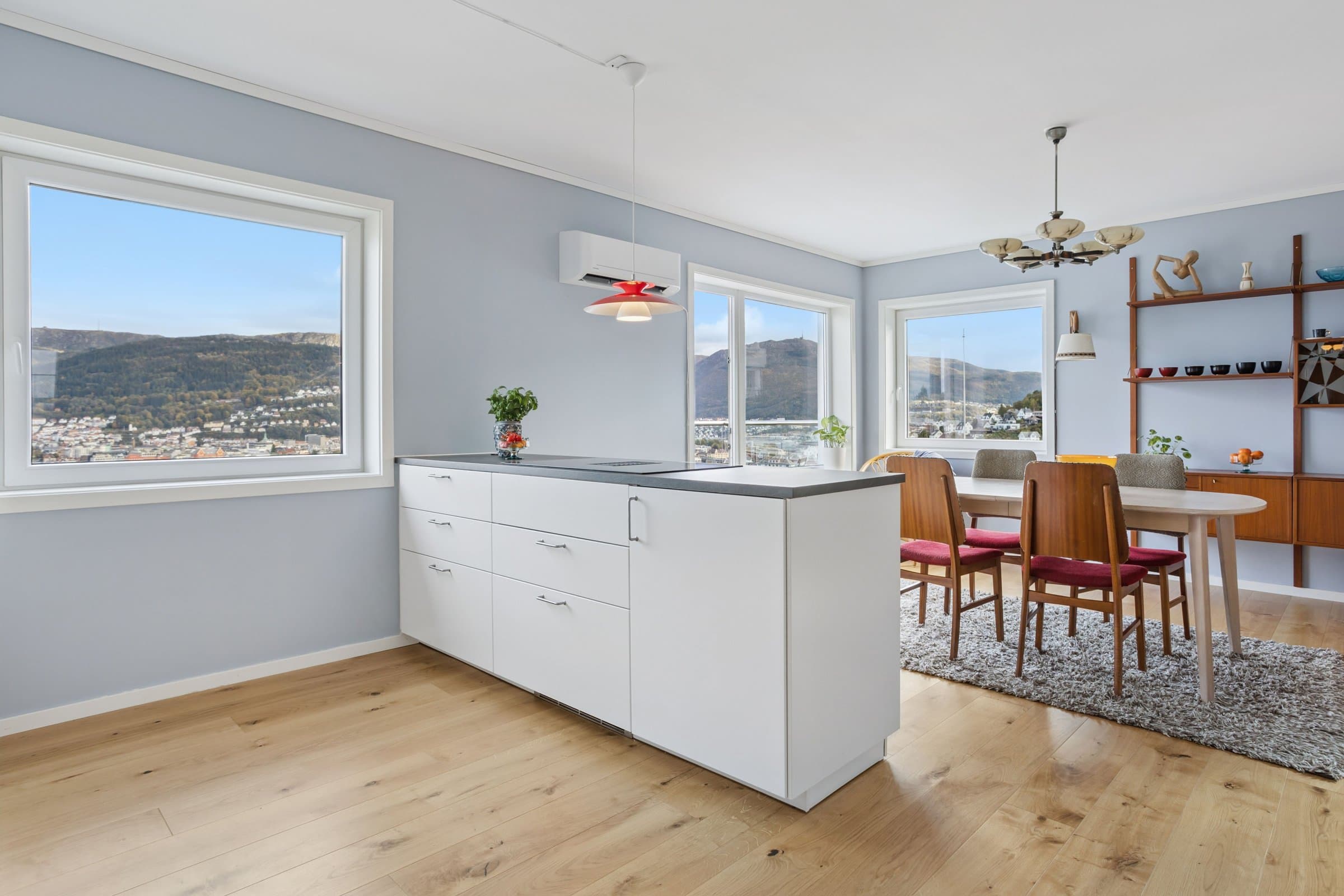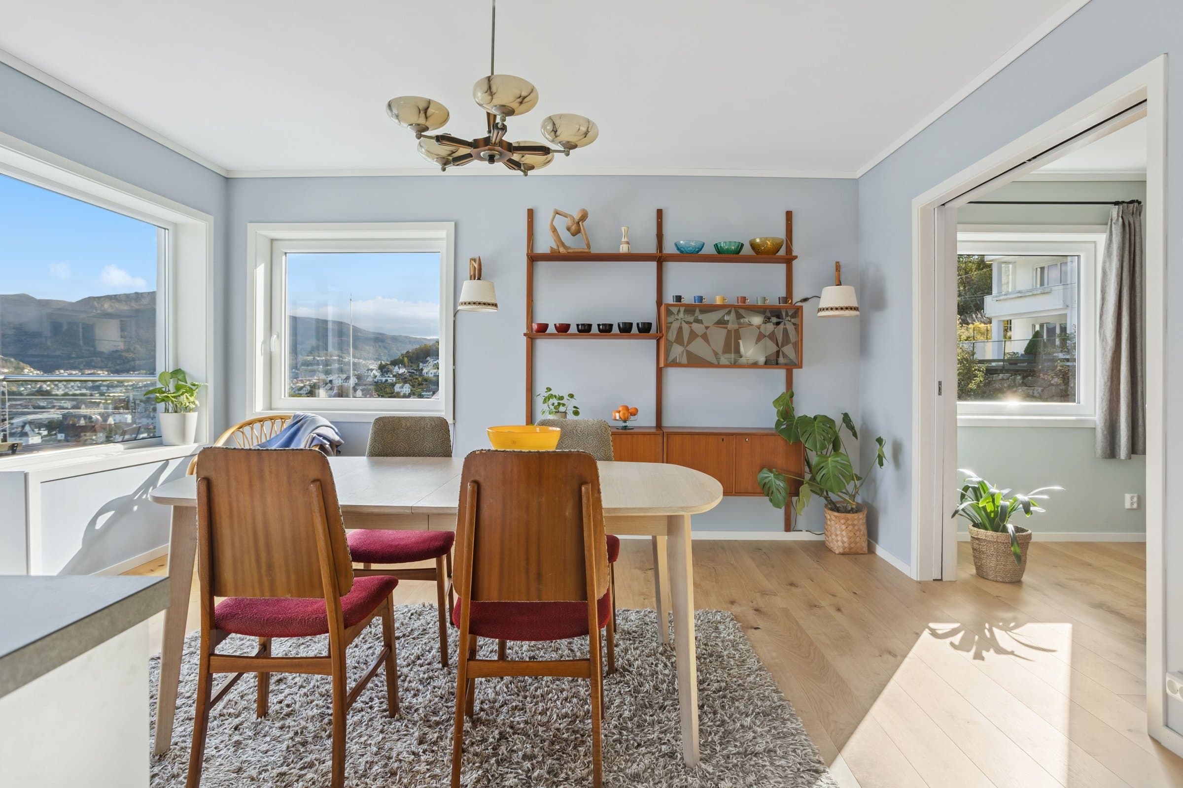 Leiligheten ligger attraktivt til i Øvre Stadionveien på Laksevåg – rolig og høytliggende med flott utsikt og fjellet rett bak. Samtidig er det kort vei til sentrum, enten til fots, med sykkel eller kollektivt. Bussforbindelser, dagligvarebutikk, skole og barnehage finnes i nærområdet, og turstier og grøntområder starter like utenfor døren.