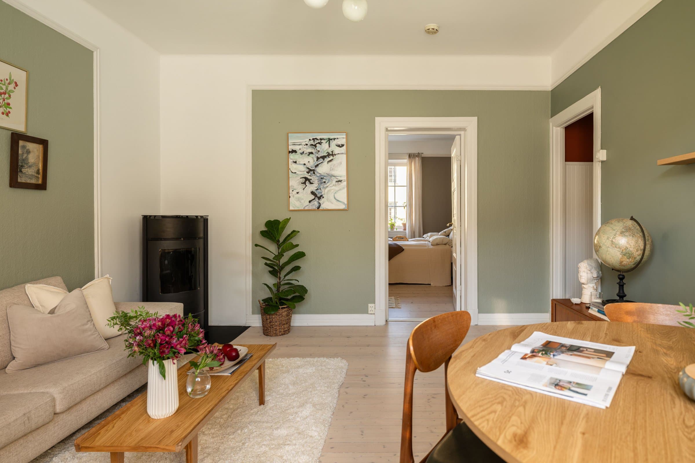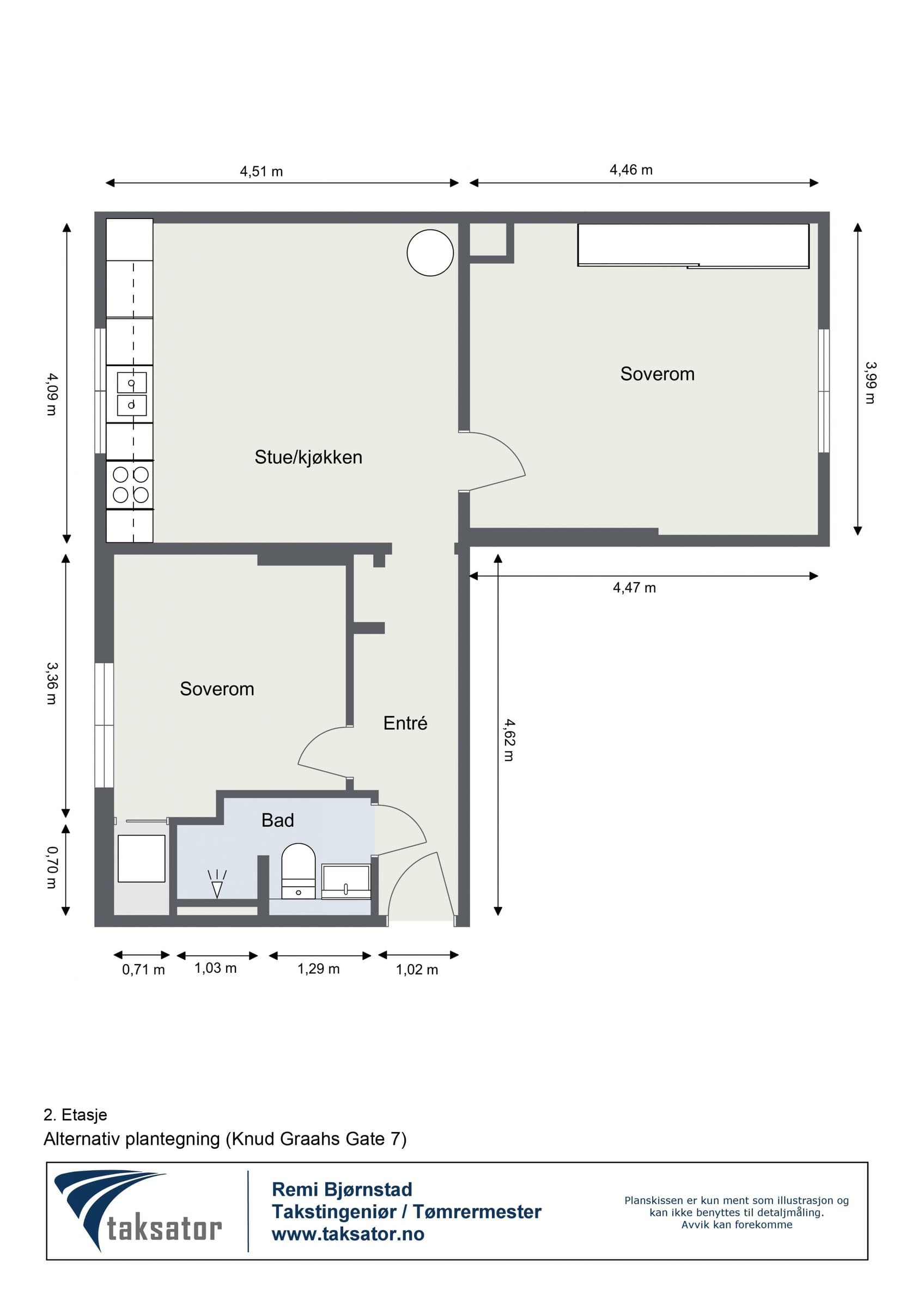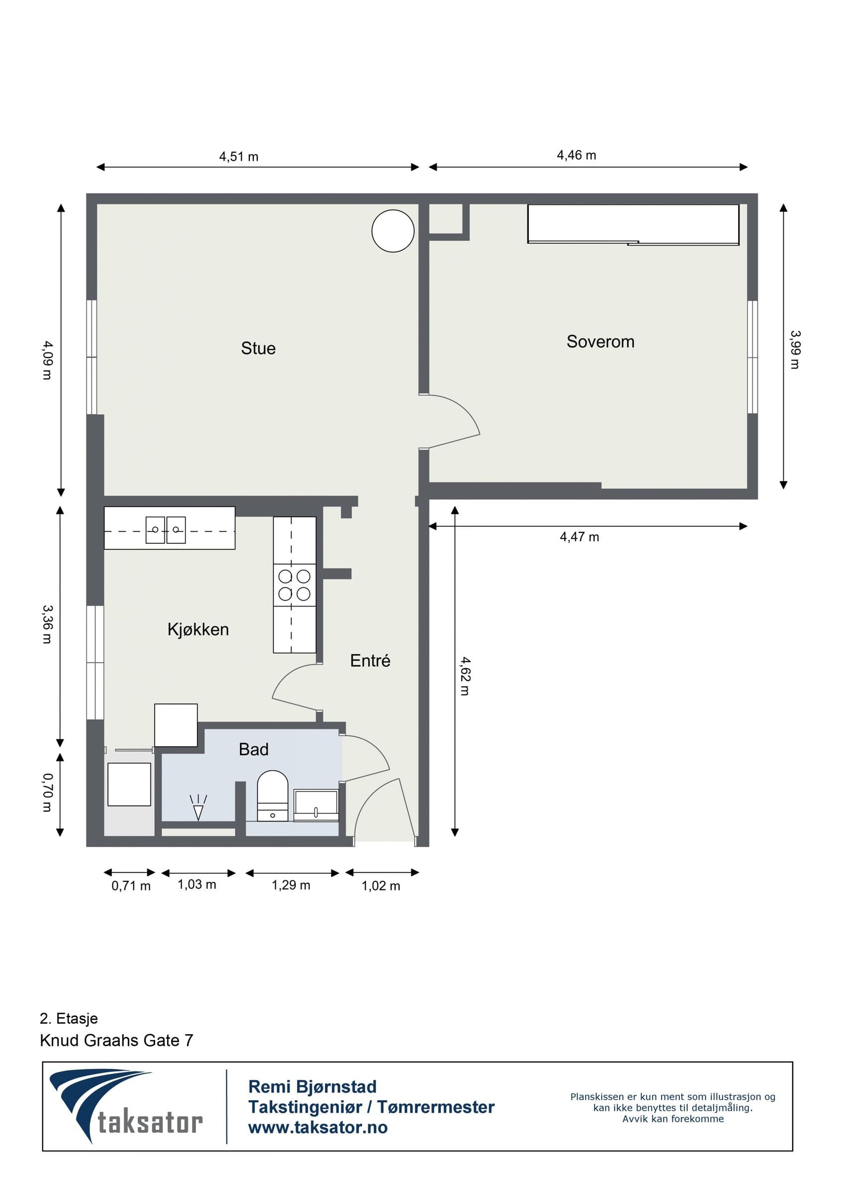 Eierform: Borettslag. Objektstype: Leilighet. Arealer: BRA - i: 59 BRA - e: 12 BRA - totalt: 71 Bruksareal fordelt på etasje: 2. etasje: BRA-i: 59 m² Gang, Soverom, Bad, Kjøkken, Stue Kjeller: To boder: Kjellerbod 1 ble målt til ca. 6,7 m² Kjellerbod 2 ble målt til ca. 4,7 m² - klimakontrollert Standard: Entré Glatte, malte flater, downlights. Overflater har normal og forventet bruksslitasje. Kjøkken Lyst kjøkken med nye fronter (Superfront), benkeplater, håndtak, kum og blandebatteri fra 2025. Overflater malt i 2024. Kjøkkenet har opplegg for integrert oppvaskmaskin og frittstående vaskemaskin, ettgreps kran, platetopp, stekeovn og frittstående kjøl/fryseskap. Stue Lys stue med takhøyde på 2,8 m, glatte malte flater, tregulv slipt i 2025, samt tak sparklet og malt i 2025. Frittstående peisovn med glassdør. Soverom Vendt mot rolig gate, 2,8 m takhøyde. Skyvedørsgarderobe og plassbygd bokhylle. Originale tregulv slipt i 2024. Bad Flislagt gulv og vegger med termostatstyrt gulvvarme, downlights med dimmer. Heldekkende servant og skap bak speil. Veggmontert toalett. Naturlig ventilasjon, Plastsluk med synlig klemring. Tak malt i 2025. Vannledninger Vannførende rør i plast (rør i rør opplegg), fleksirør og kobber. Avløpsrør Interne og synlige avløpsrør i støpejern (nyere og eldre) og plast, ført til felles rørføringer. Ventilasjon Boligen er bygget med naturlig ventilasjon som var vanlig på byggetiden. Oppvarming Elektrisk oppvarming med panelovn(er), termostatstyrt gulvvarme på badet. Elektrisk anlegg EL-anlegg hovedsakelig fra byggeårene, senere utvidet/endret. Automatsikringer med jordfeilbrytere. Hovedbryter og 6 fordelingskurser. El‑tilsyn ble gjort i 2022 og påviste avvik ble rettet opp av Elektro Fiber AS. Det er ikke fremlagt samsvarserklæringer/dokumentasjon fra da anlegget ble installert eller på tilleggsarbeider om dette har blitt utført.