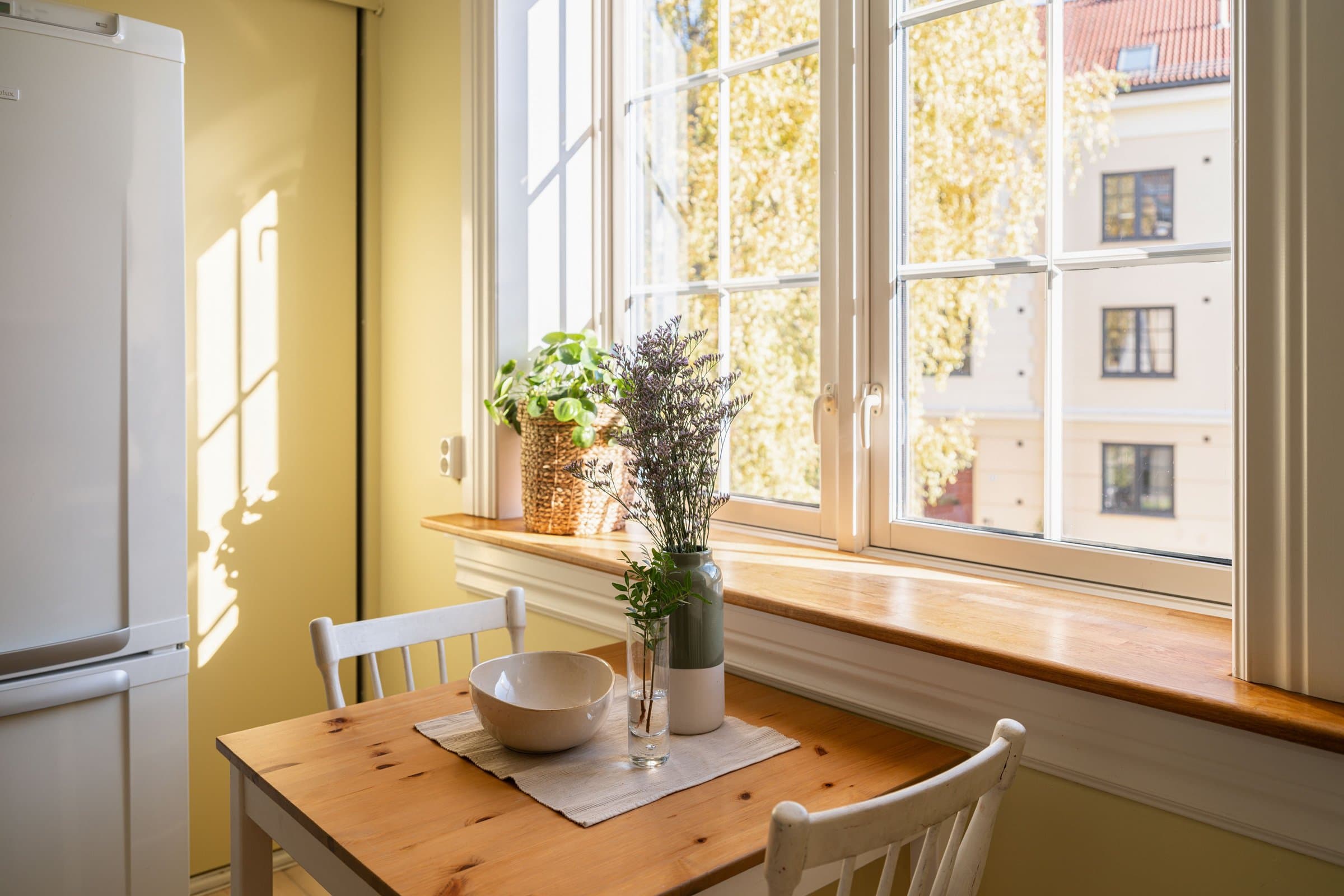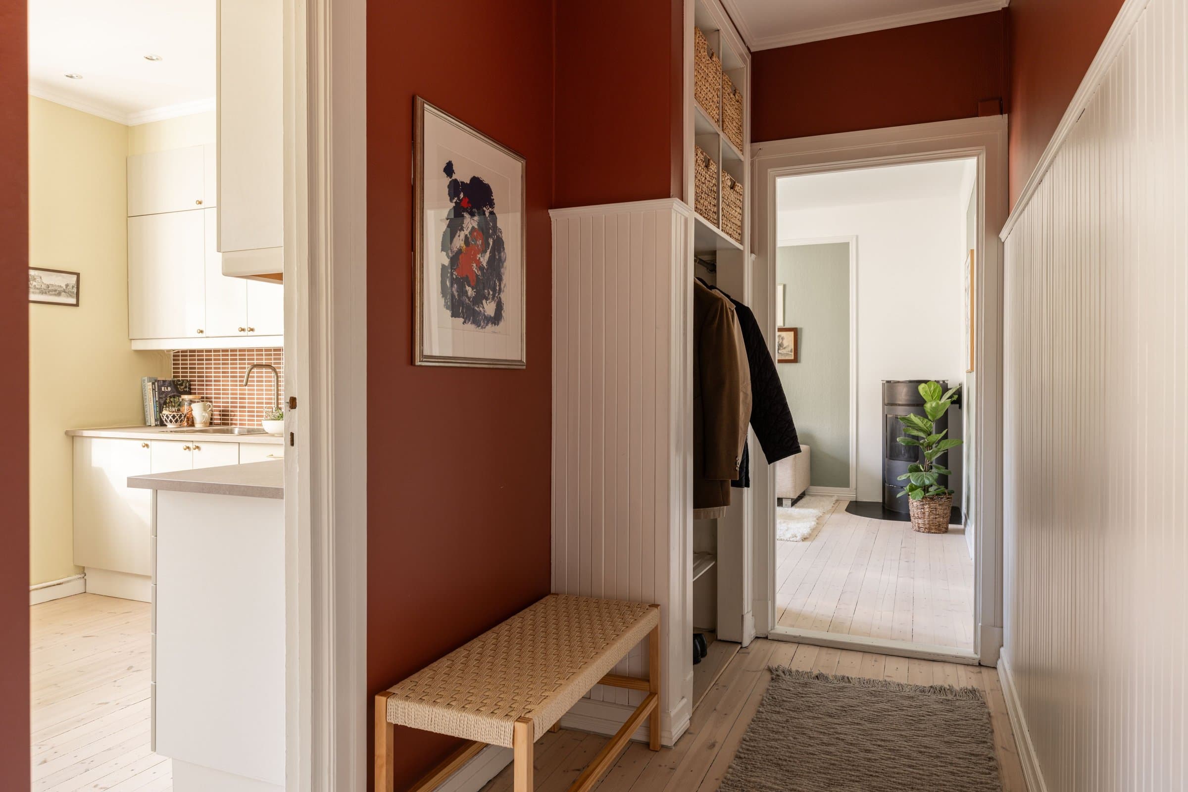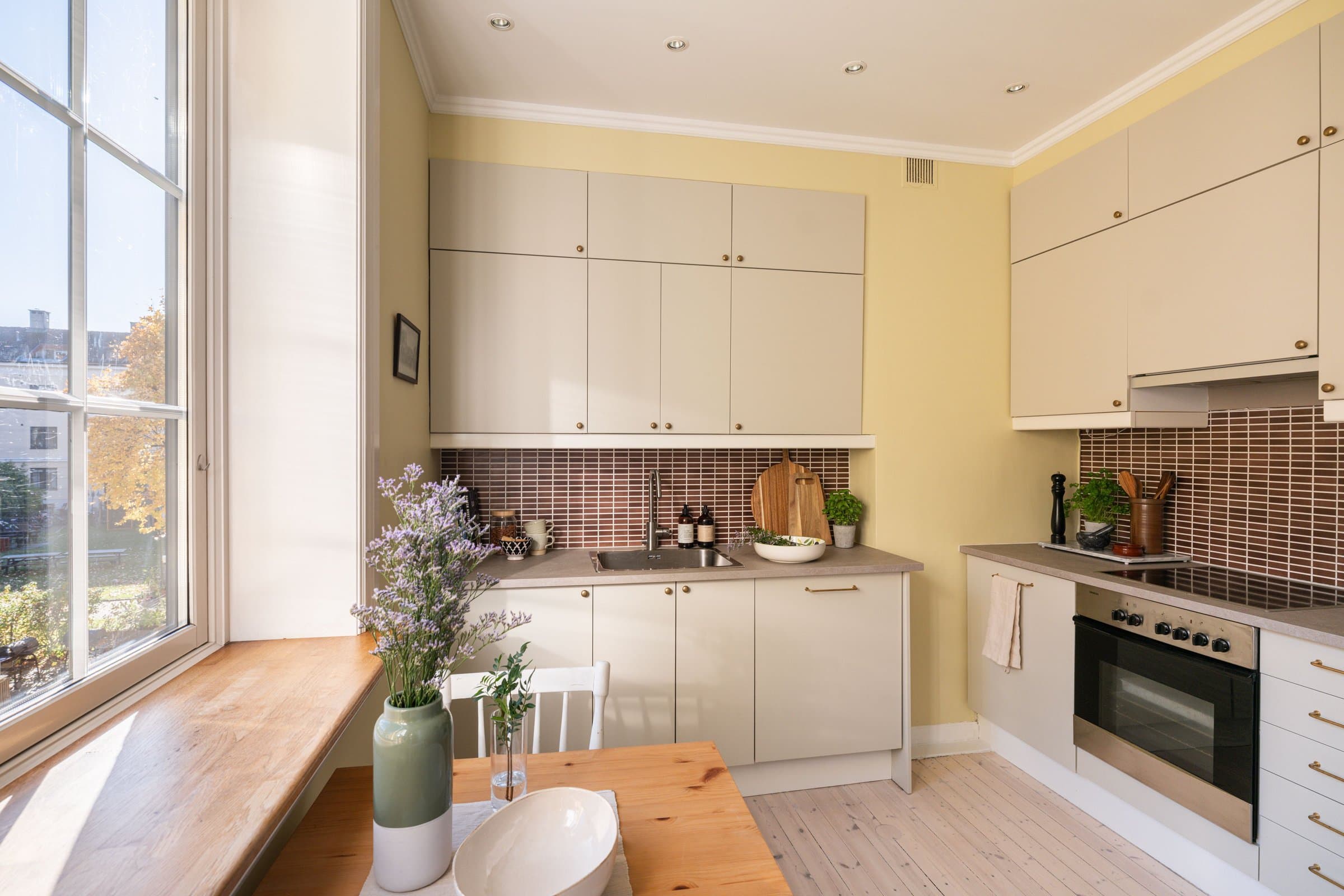 Eierform: Borettslag. Objektstype: Leilighet. Arealer: BRA - i: 59 BRA - e: 12 BRA - totalt: 71 Bruksareal fordelt på etasje: 2. etasje: BRA-i: 59 m² Gang, Soverom, Bad, Kjøkken, Stue Kjeller: To boder: Kjellerbod 1 ble målt til ca. 6,7 m² Kjellerbod 2 ble målt til ca. 4,7 m² - klimakontrollert Standard: Entré Glatte, malte flater, downlights. Overflater har normal og forventet bruksslitasje. Kjøkken Lyst kjøkken med nye fronter (Superfront), benkeplater, håndtak, kum og blandebatteri fra 2025. Overflater malt i 2024. Kjøkkenet har opplegg for integrert oppvaskmaskin og frittstående vaskemaskin, ettgreps kran, platetopp, stekeovn og frittstående kjøl/fryseskap. Stue Lys stue med takhøyde på 2,8 m, glatte malte flater, tregulv slipt i 2025, samt tak sparklet og malt i 2025. Frittstående peisovn med glassdør. Soverom Vendt mot rolig gate, 2,8 m takhøyde. Skyvedørsgarderobe og plassbygd bokhylle. Originale tregulv slipt i 2024. Bad Flislagt gulv og vegger med termostatstyrt gulvvarme, downlights med dimmer. Heldekkende servant og skap bak speil. Veggmontert toalett. Naturlig ventilasjon, Plastsluk med synlig klemring. Tak malt i 2025. Vannledninger Vannførende rør i plast (rør i rør opplegg), fleksirør og kobber. Avløpsrør Interne og synlige avløpsrør i støpejern (nyere og eldre) og plast, ført til felles rørføringer. Ventilasjon Boligen er bygget med naturlig ventilasjon som var vanlig på byggetiden. Oppvarming Elektrisk oppvarming med panelovn(er), termostatstyrt gulvvarme på badet. Elektrisk anlegg EL-anlegg hovedsakelig fra byggeårene, senere utvidet/endret. Automatsikringer med jordfeilbrytere. Hovedbryter og 6 fordelingskurser. El‑tilsyn ble gjort i 2022 og påviste avvik ble rettet opp av Elektro Fiber AS. Det er ikke fremlagt samsvarserklæringer/dokumentasjon fra da anlegget ble installert eller på tilleggsarbeider om dette har blitt utført.
