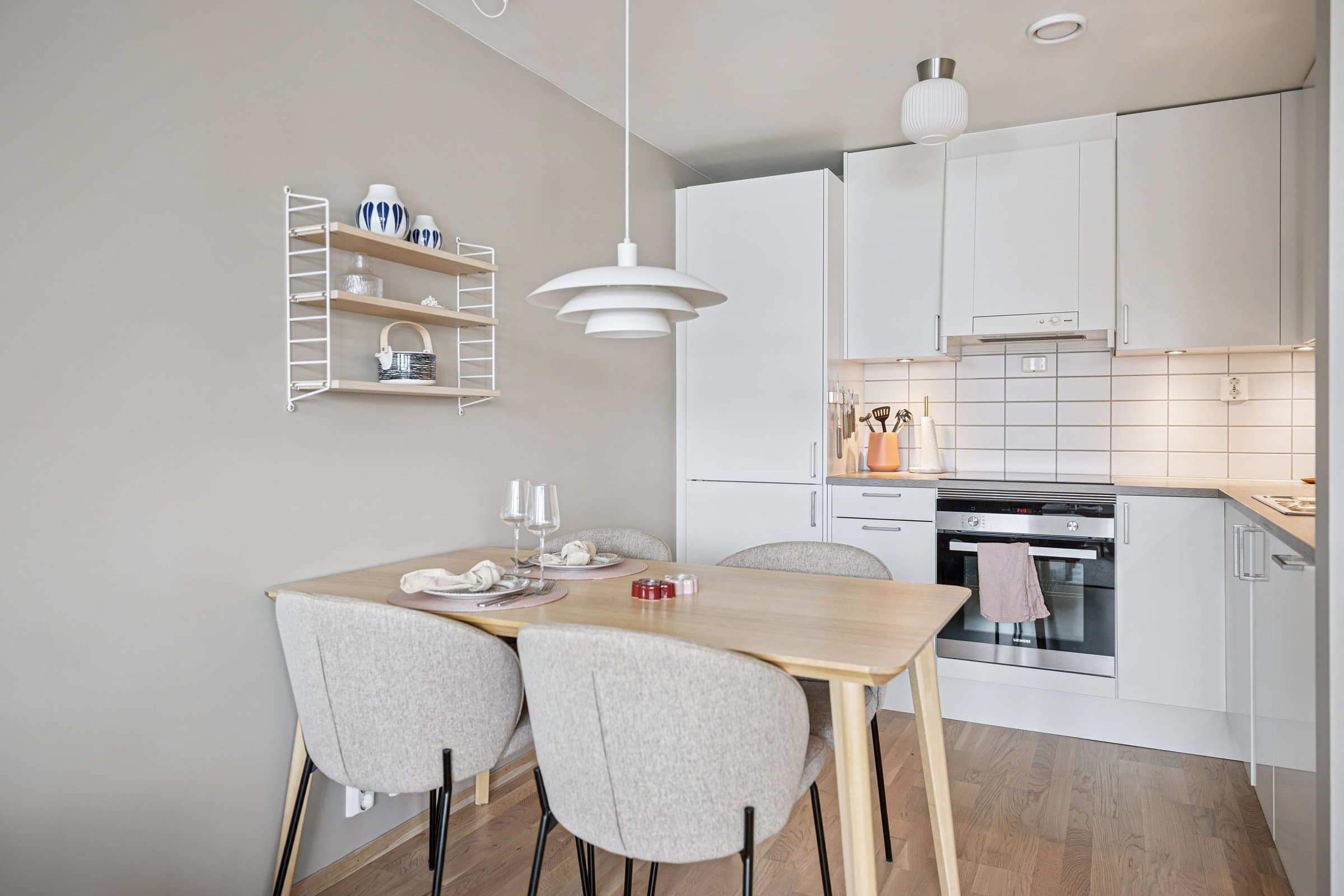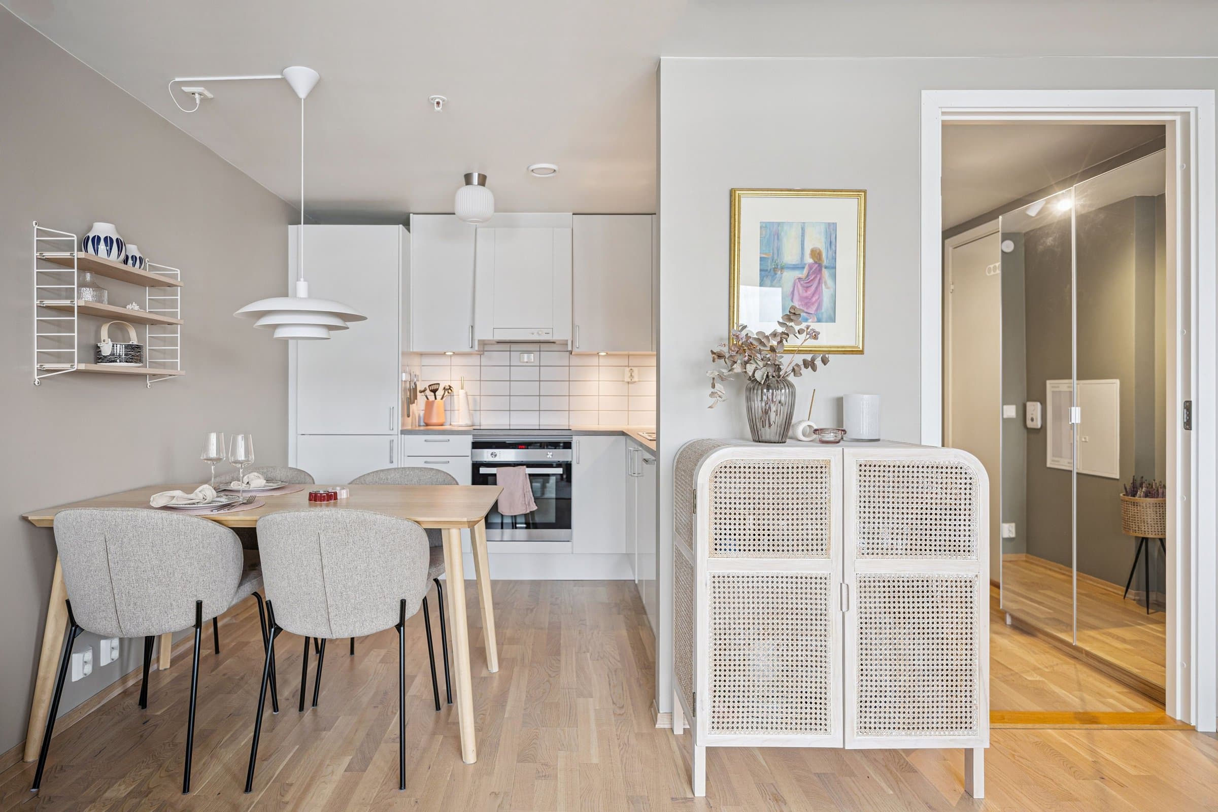 Følger med - Hvitevarer på kjøkken samt kjøkkeninnredning - Baderomsinnredning - Skap på soverom og gang - Radiator på stue - Fastmonterte lyskilder (disse byttes ut med lamper som leiligheten kom med) - Røykvarslere og brannslukningsapparat - Persienner på stue og soverom - Avtrekksvifte Følger ikke med: - Hylle på kjøkken - Vaskemaskin - TV - Taklamper som henger i krok