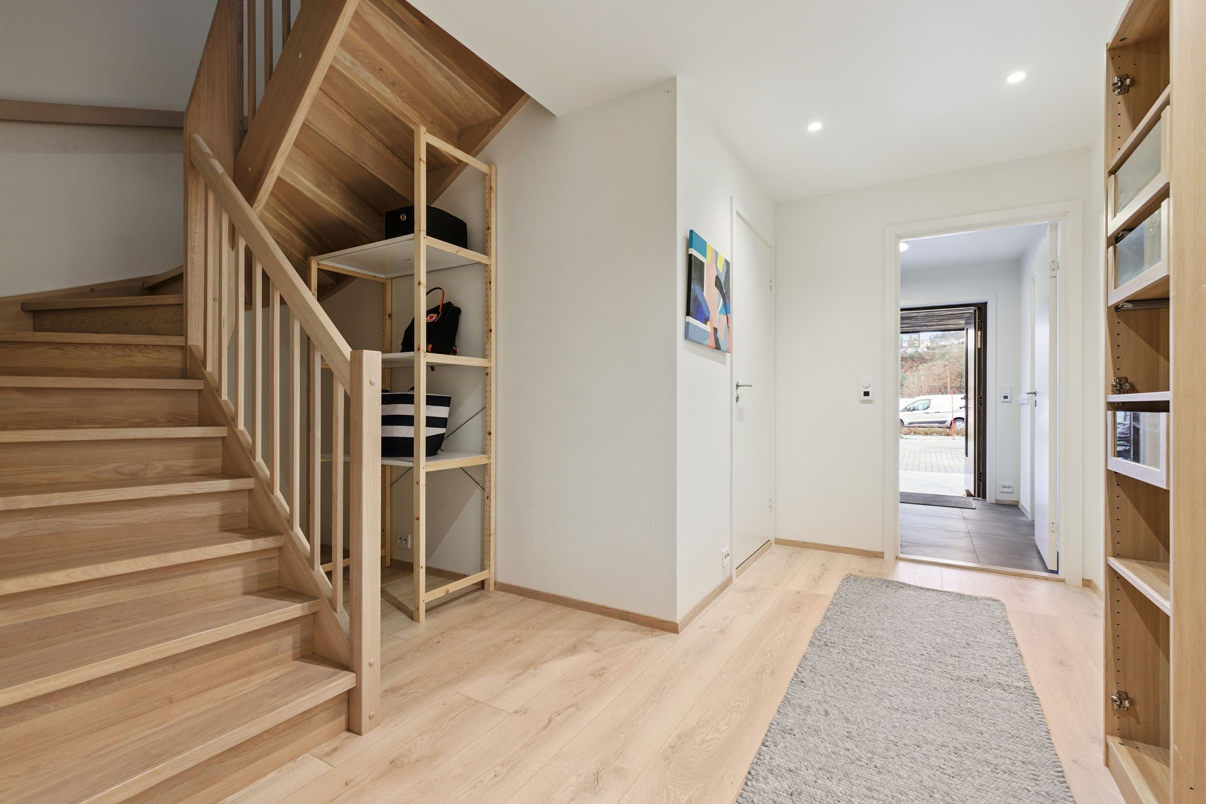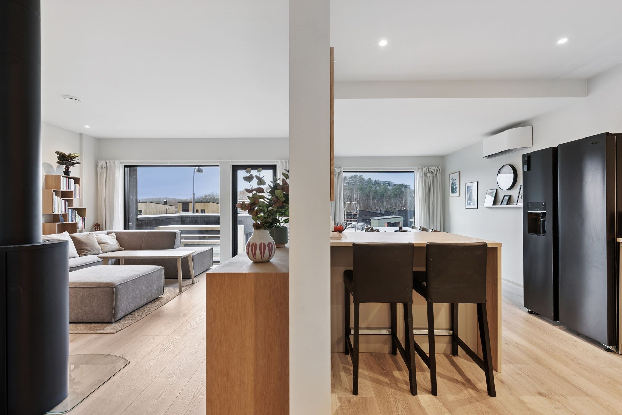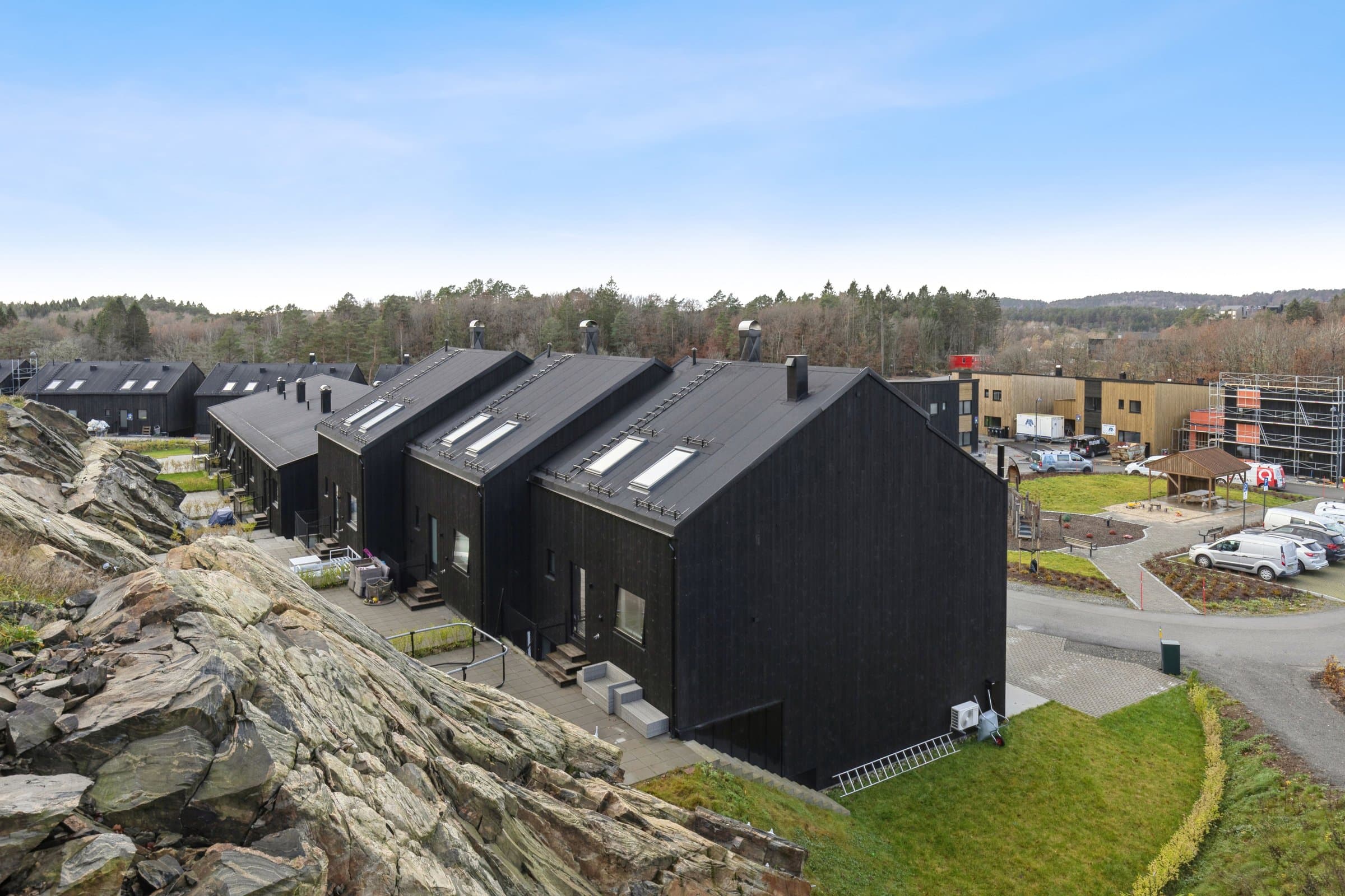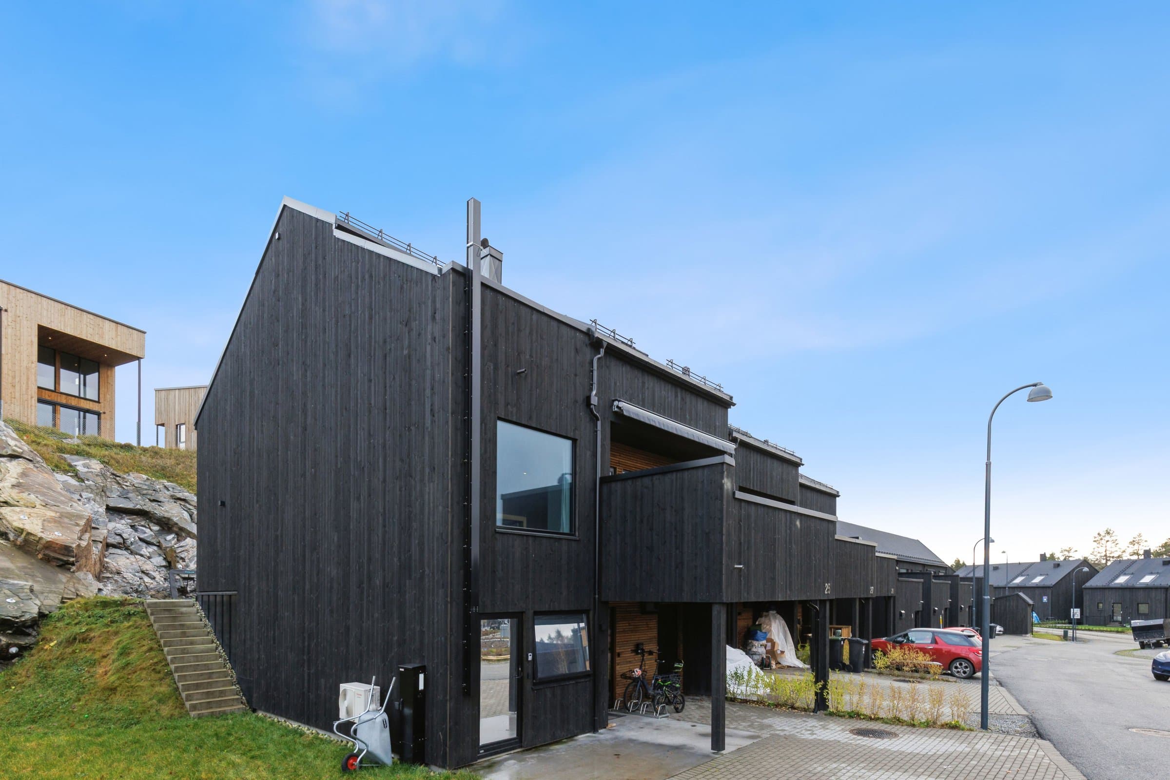 Moderne enderekkehus på 200 m² over tre etasjer, ferdigstilt i august 2024 av Roger Aamodt AS. Boligen har fire soverom i hoveddelen, med mulighet for et femte, to balkonger og en praktisk hybel på 27 m² med eget kjøkken, bad og alkove. Lys og åpen planløsning med peis (Contura 810) og diskre varmepumpe i midtetasjen. Boligen har eikelaminat på gulvene, fliser i bad og entré, og varmekabler i underetasjen og hybelen. Trappen mellom etasjene er laget i eik med tette trinn – ideell for småbarnslivet. Huset er kledd i sort, royalimpregnert kledning, med sort papptak og matchende takrenner. Carport for to biler med elbillader, i tillegg til gjesteparkeringsplass rett utenfor hybelen. Uteområdet består av to nivåer: plen på bakkenivå, perfekt for lek og aktivitet, og en bakhage på nivå med midtetasjen med belegningsstein.