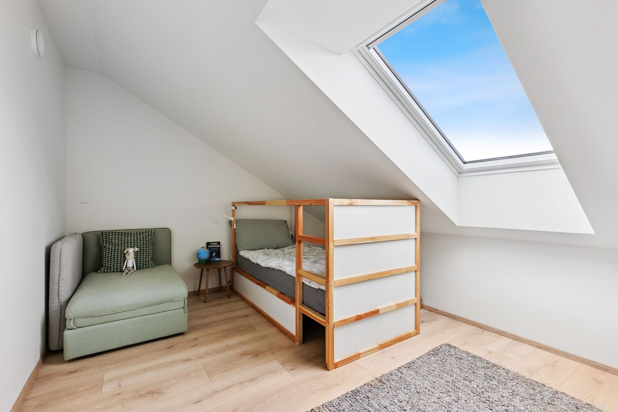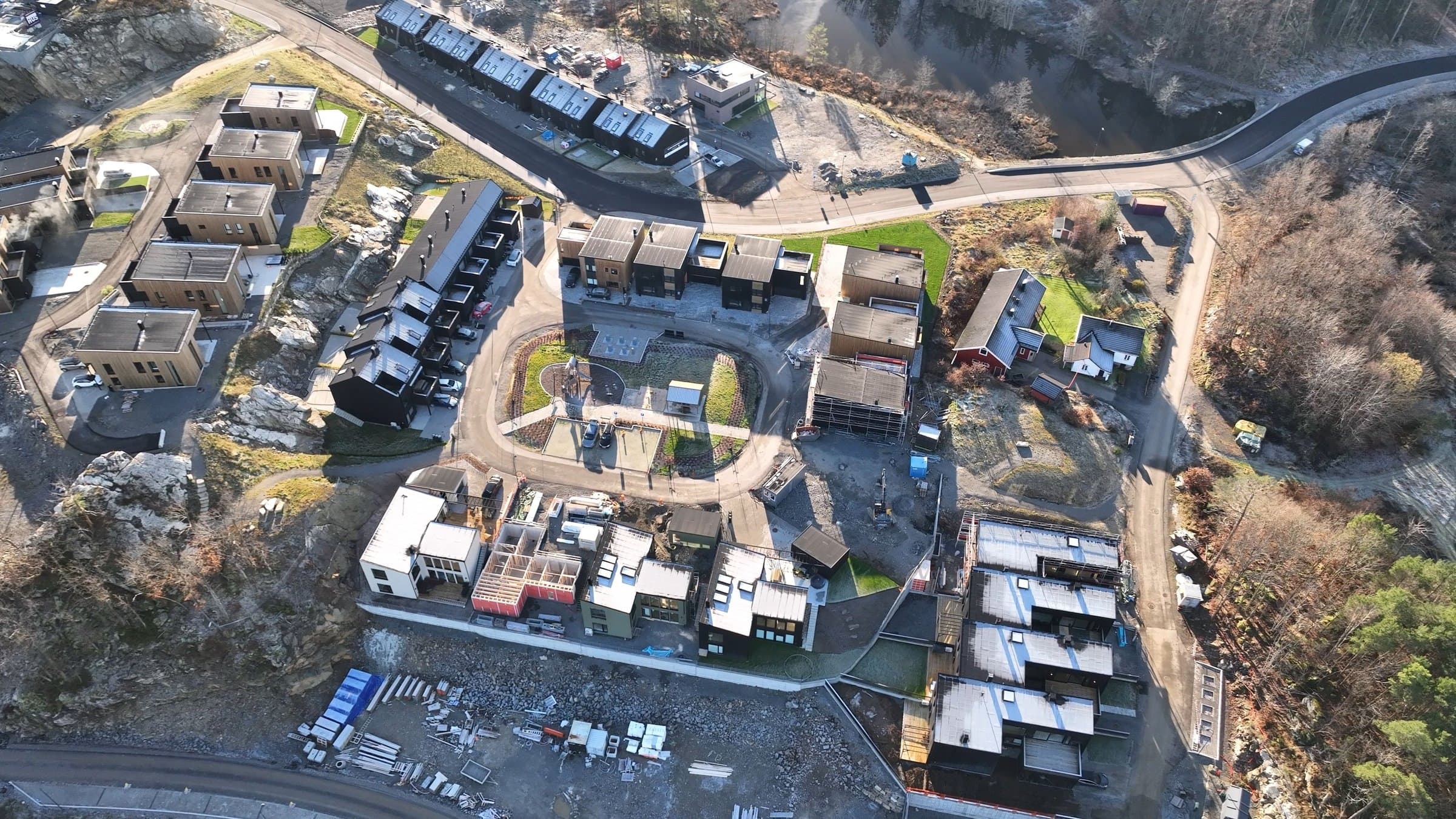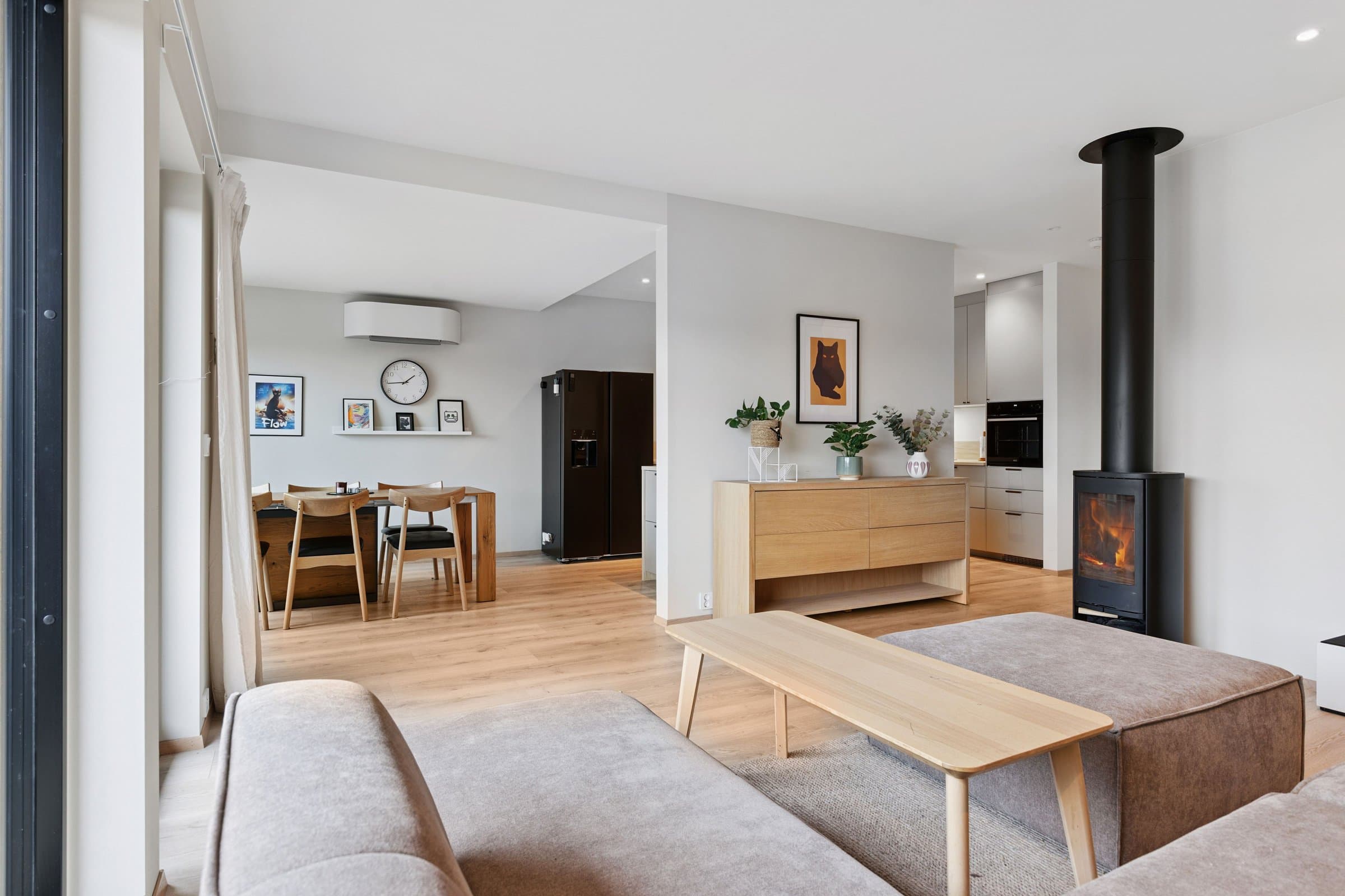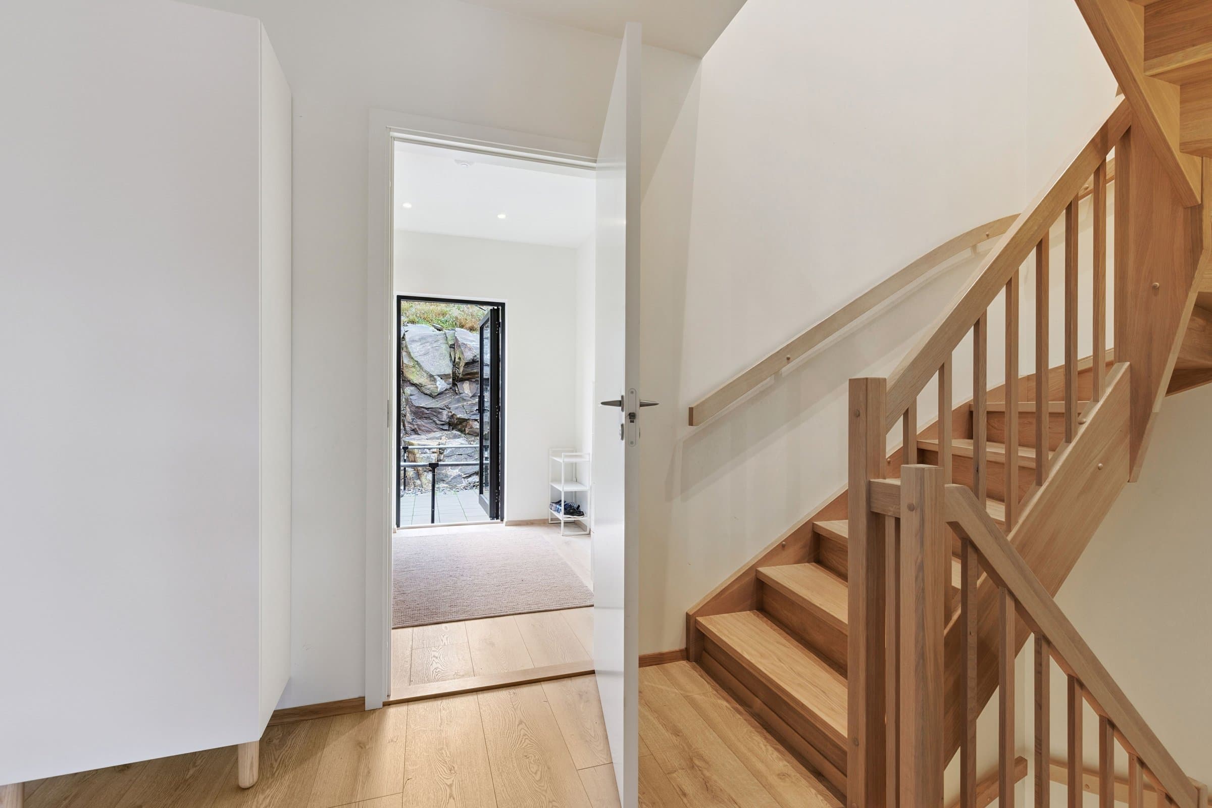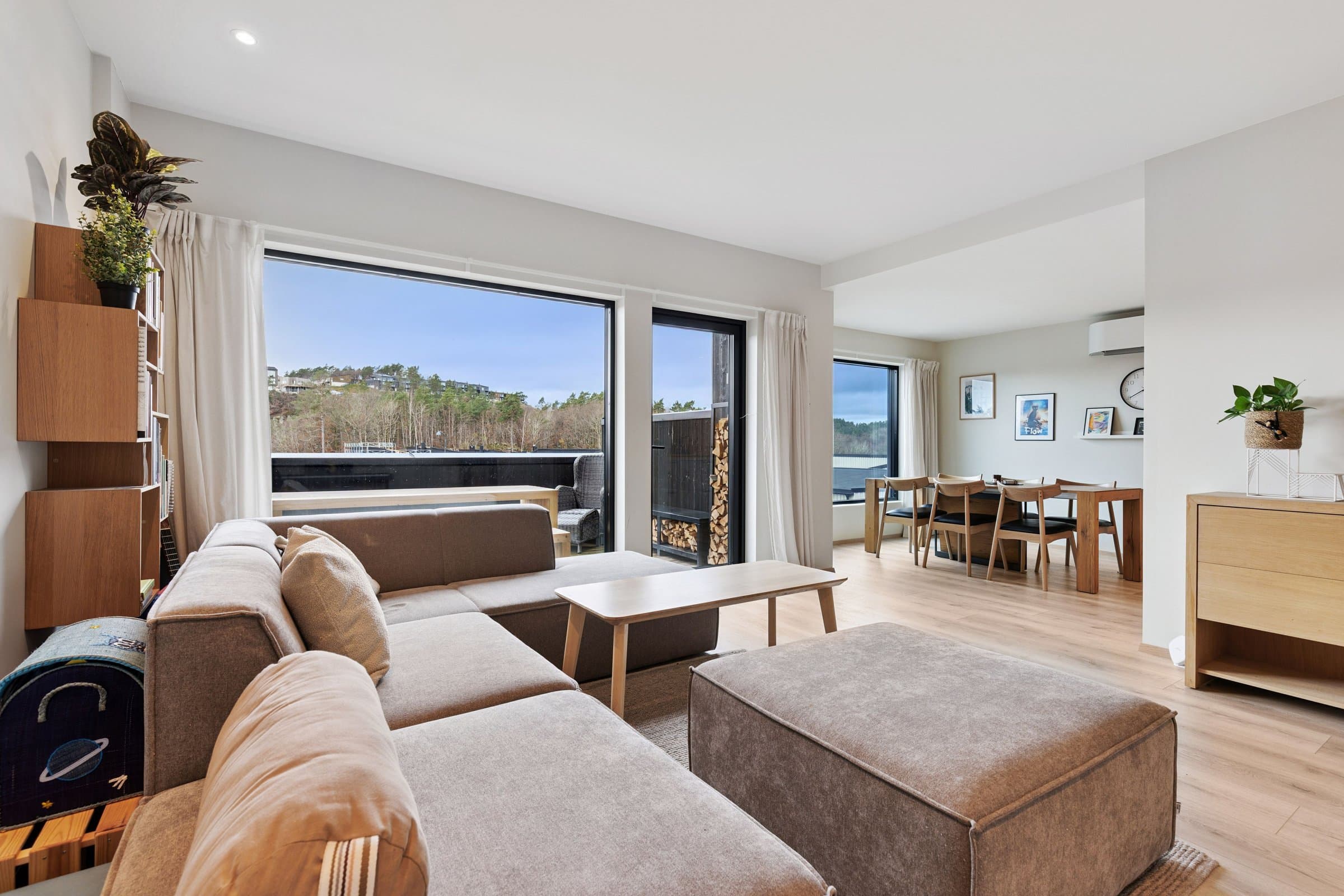 Moderne enderekkehus på 200 m² over tre etasjer, ferdigstilt i august 2024 av Roger Aamodt AS. Boligen har fire soverom i hoveddelen, med mulighet for et femte, to balkonger og en praktisk hybel på 27 m² med eget kjøkken, bad og alkove. Lys og åpen planløsning med peis (Contura 810) og diskre varmepumpe i midtetasjen. Boligen har eikelaminat på gulvene, fliser i bad og entré, og varmekabler i underetasjen og hybelen. Trappen mellom etasjene er laget i eik med tette trinn – ideell for småbarnslivet. Huset er kledd i sort, royalimpregnert kledning, med sort papptak og matchende takrenner. Carport for to biler med elbillader, i tillegg til gjesteparkeringsplass rett utenfor hybelen. Uteområdet består av to nivåer: plen på bakkenivå, perfekt for lek og aktivitet, og en bakhage på nivå med midtetasjen med belegningsstein.
