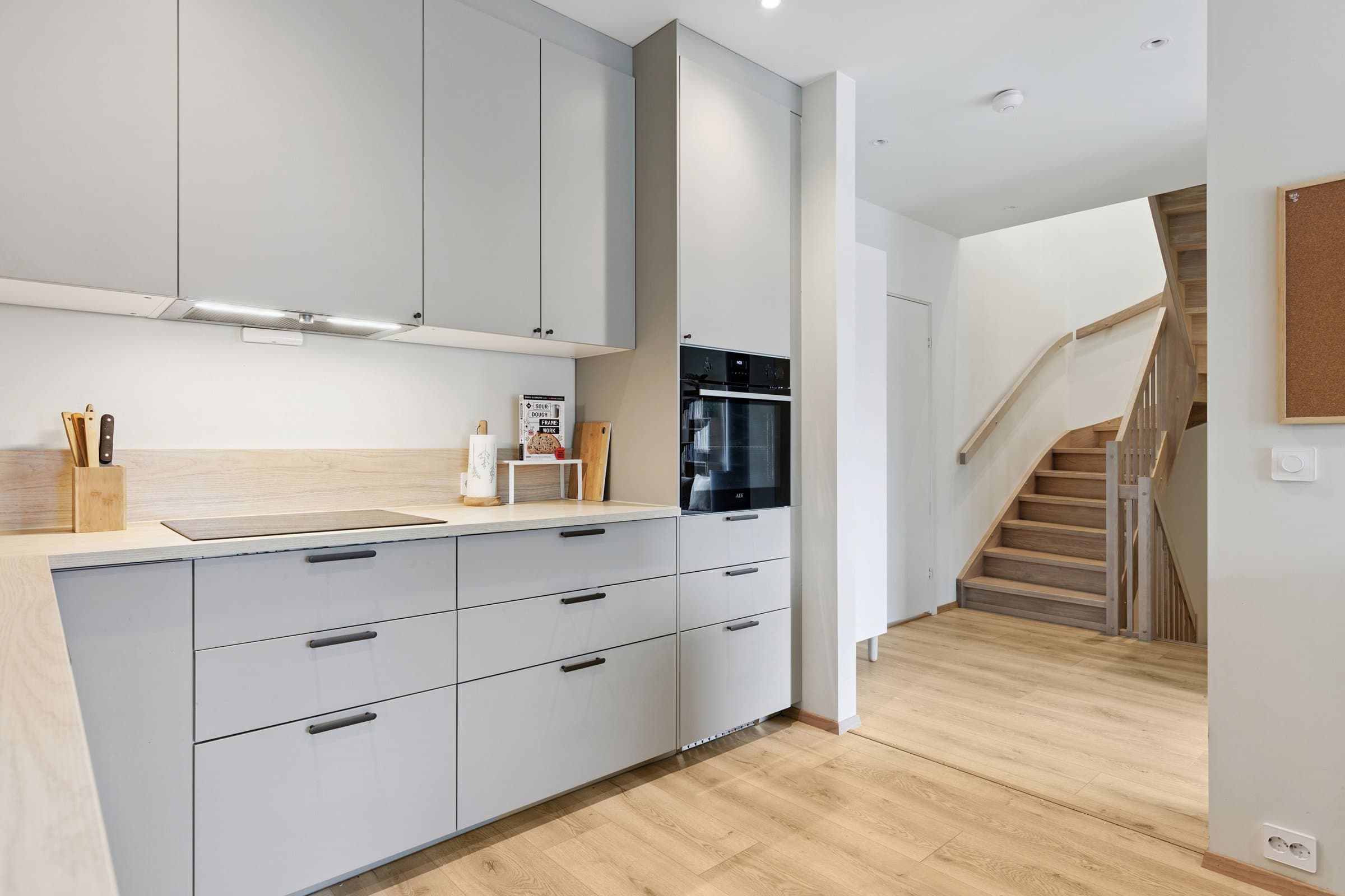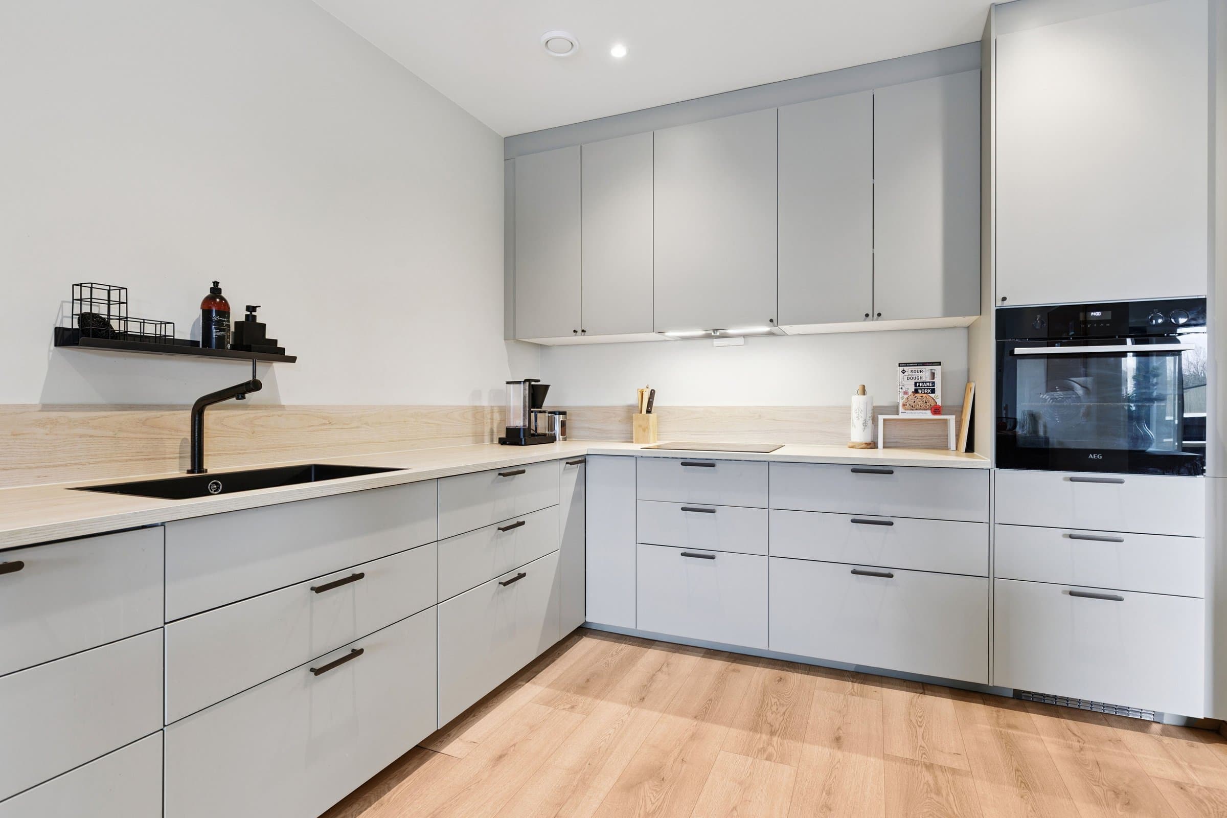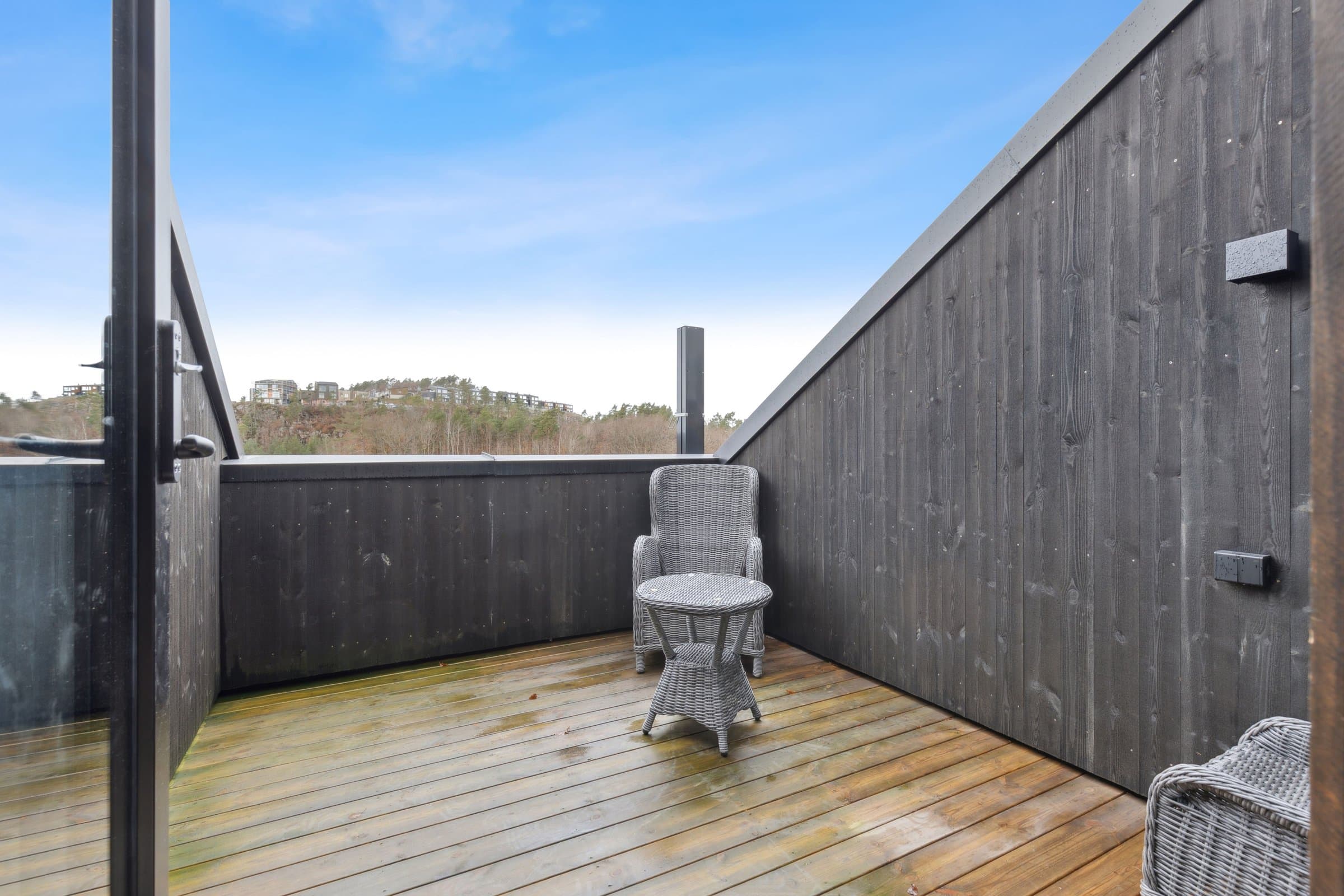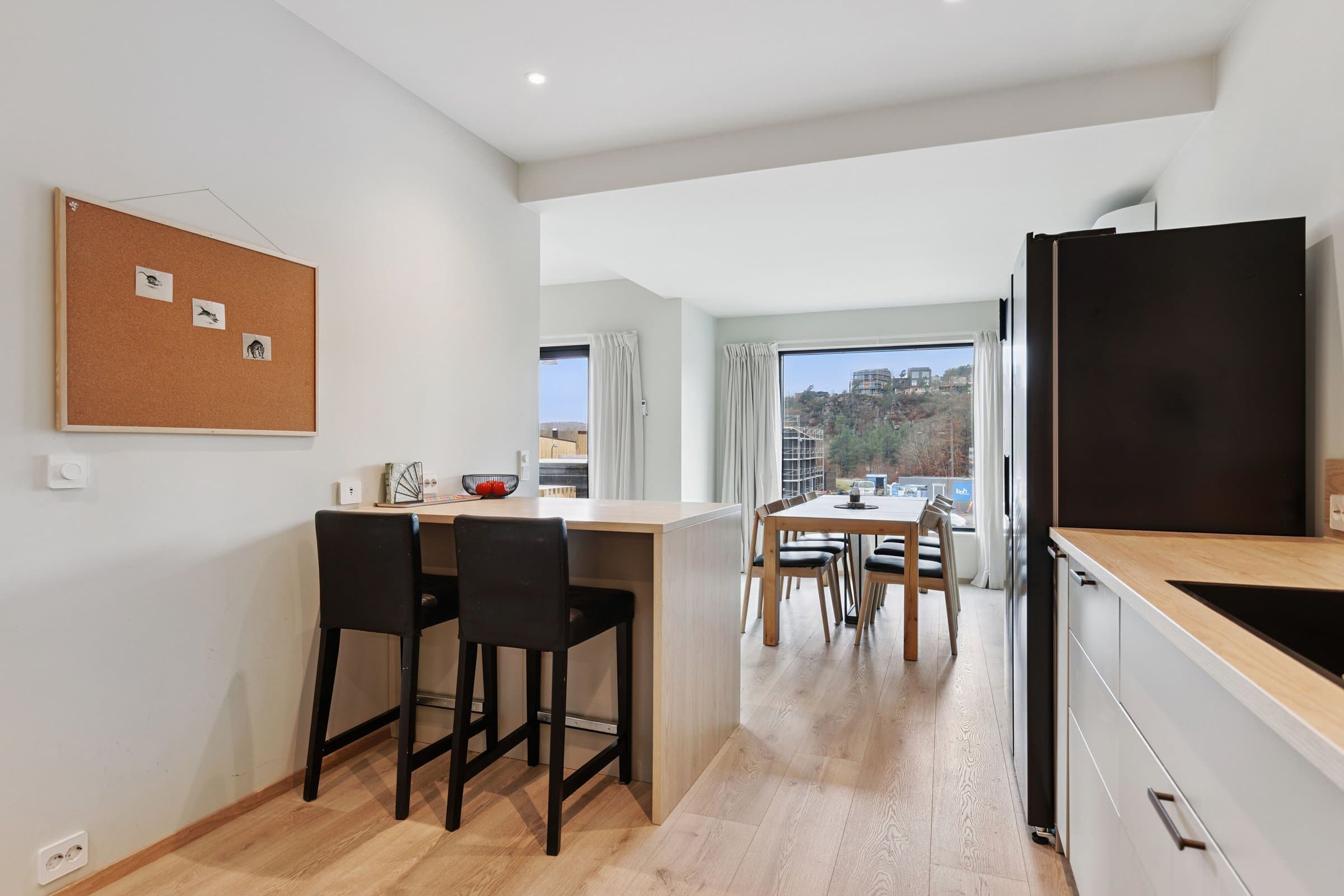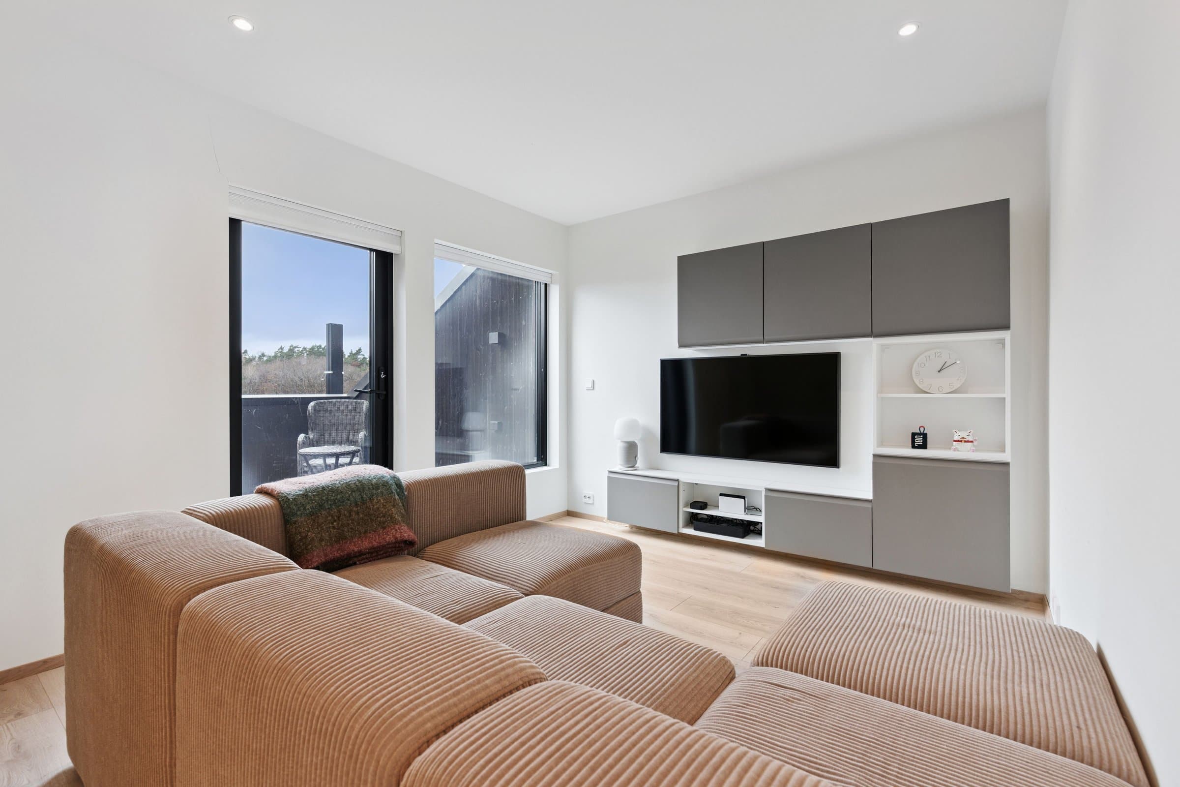 Moderne enderekkehus på 200 m² over tre etasjer, ferdigstilt i august 2024 av Roger Aamodt AS. Boligen har fire soverom i hoveddelen, med mulighet for et femte, to balkonger og en praktisk hybel på 27 m² med eget kjøkken, bad og alkove. Lys og åpen planløsning med peis (Contura 810) og diskre varmepumpe i midtetasjen. Boligen har eikelaminat på gulvene, fliser i bad og entré, og varmekabler i underetasjen og hybelen. Trappen mellom etasjene er laget i eik med tette trinn – ideell for småbarnslivet. Huset er kledd i sort, royalimpregnert kledning, med sort papptak og matchende takrenner. Carport for to biler med elbillader, i tillegg til gjesteparkeringsplass rett utenfor hybelen. Uteområdet består av to nivåer: plen på bakkenivå, perfekt for lek og aktivitet, og en bakhage på nivå med midtetasjen med belegningsstein.
