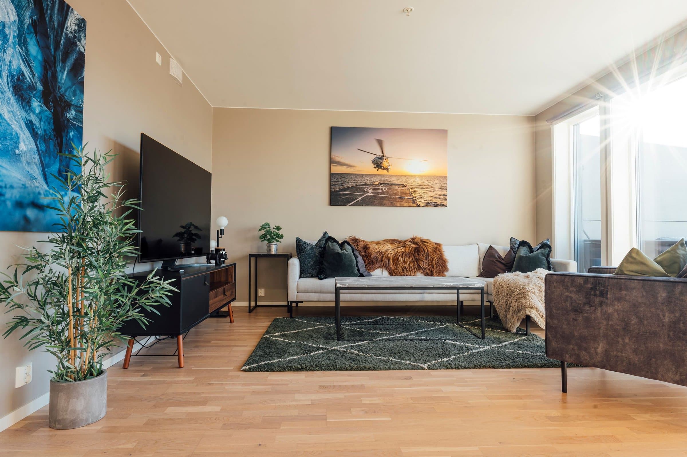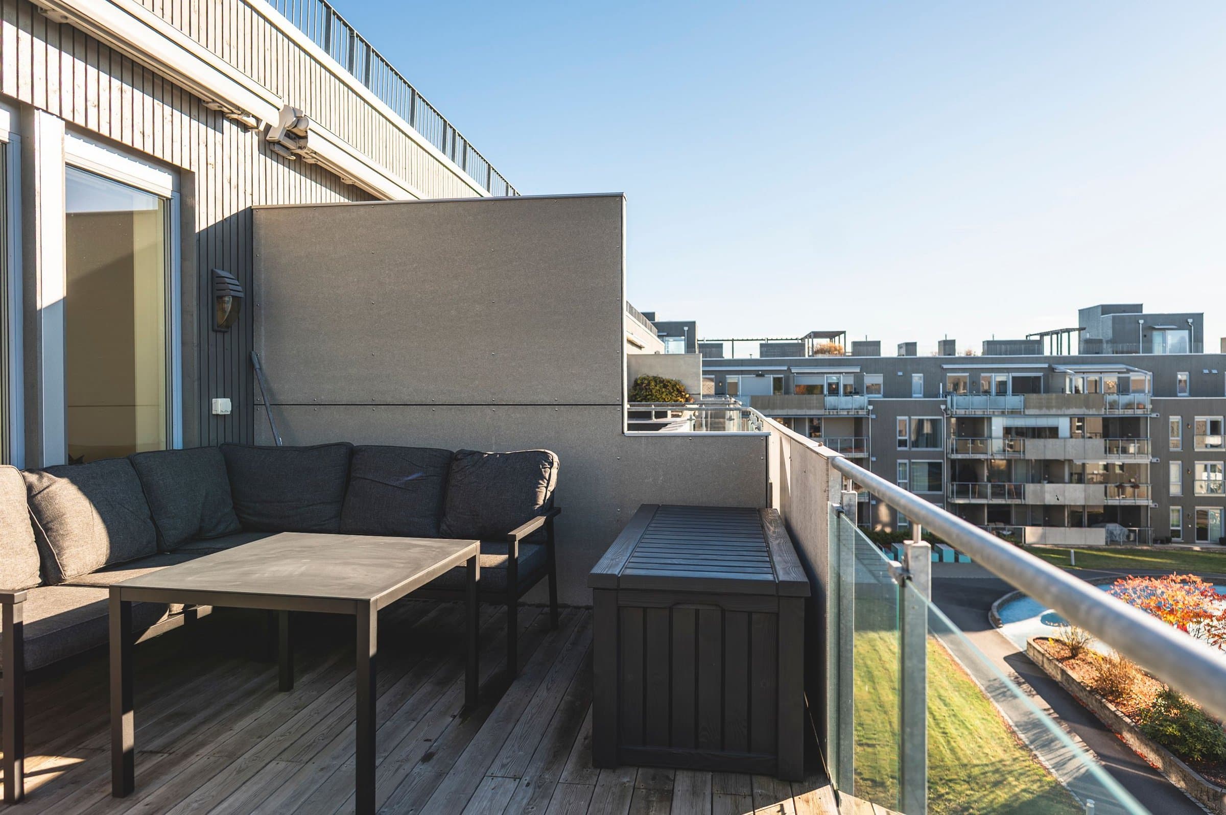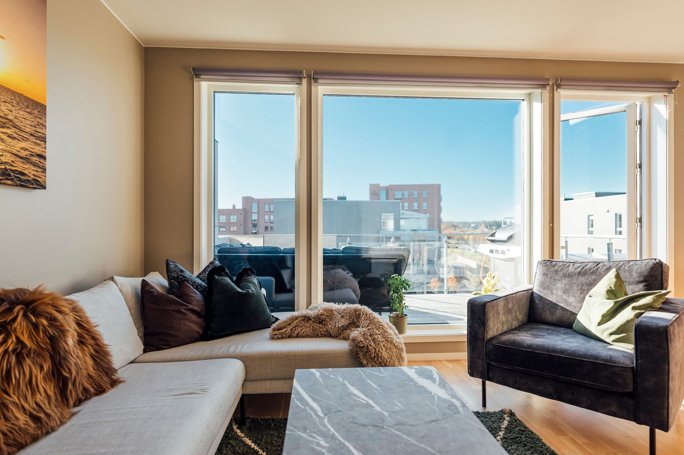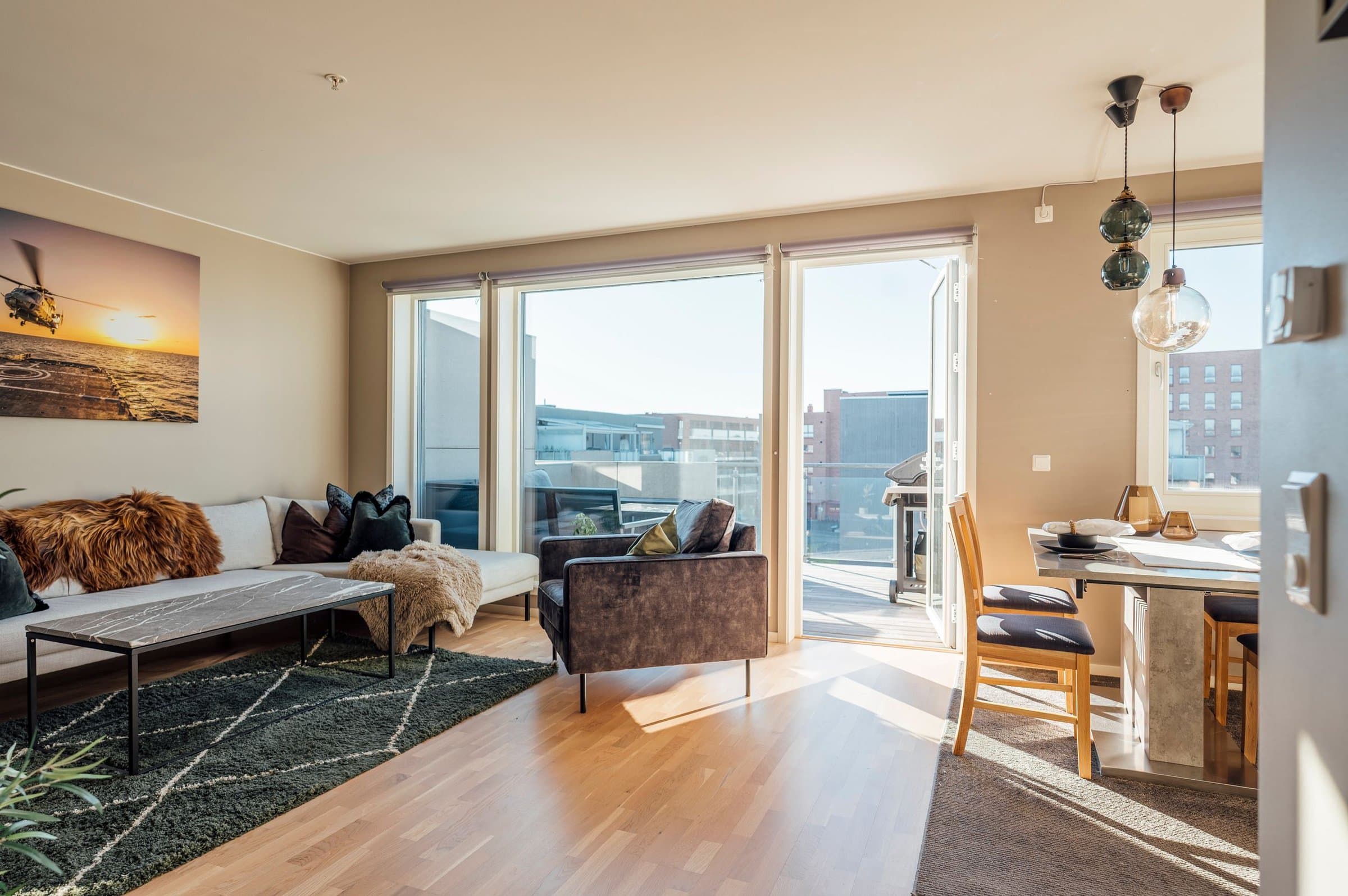 Pen 2-roms toppleilighet i 4. etasje fra 2018 med sørvendt balkong og ekstremt gode solforhold fra morgen til kveld! Store vinduer i kjøkken og stue som gir godt med naturlig lys. Leiligheten er utstyrt med solskjerming på alle vinduer i stue/kjøkken og markise på balkongen - styres med fjernkontroll. Kjøkkenet har god benkeplass og integrert kjøleskap, fryser og komfyr. Soverommet har god plass til dobbeltseng og klesskap. 2 boder leiligheten, derav 1 som i dag brukes som kontor. 1 ekstra bod i kjelleren.