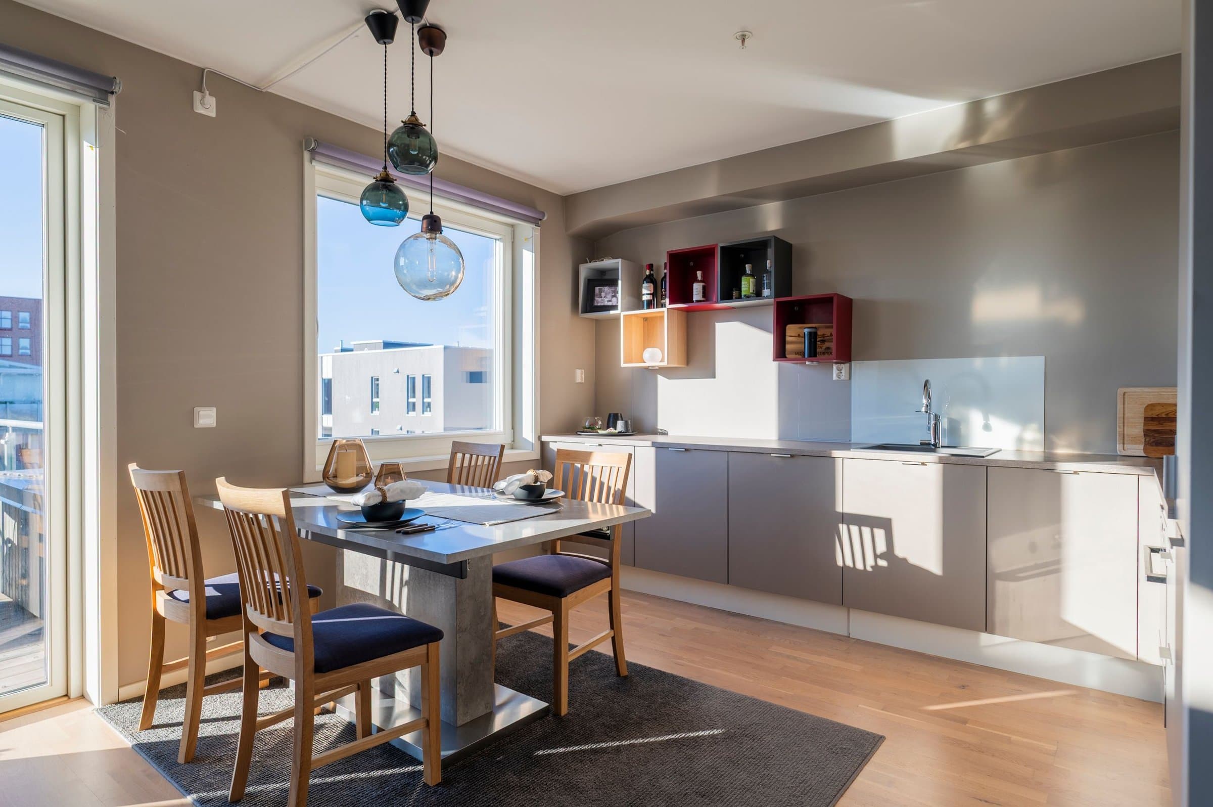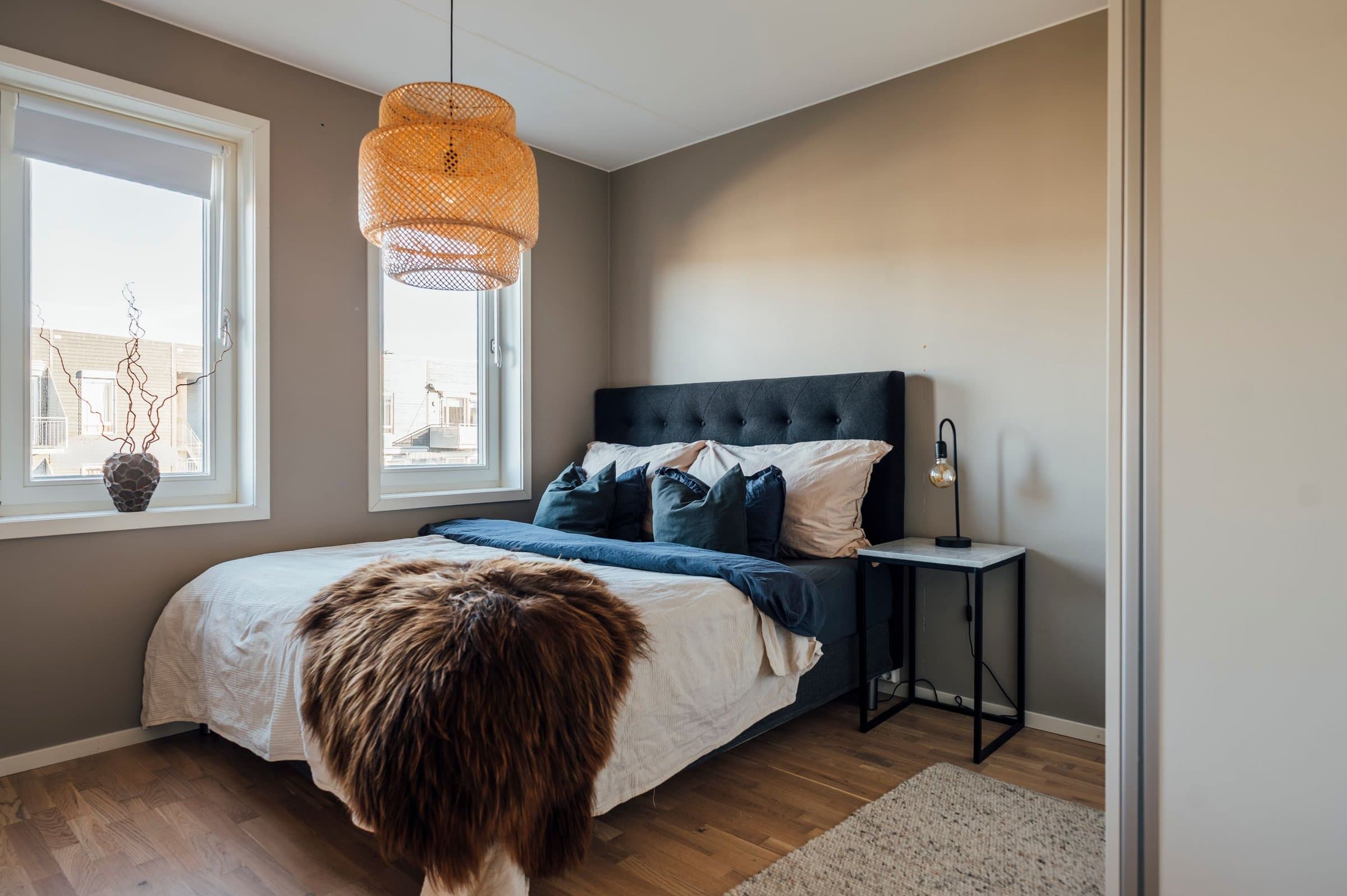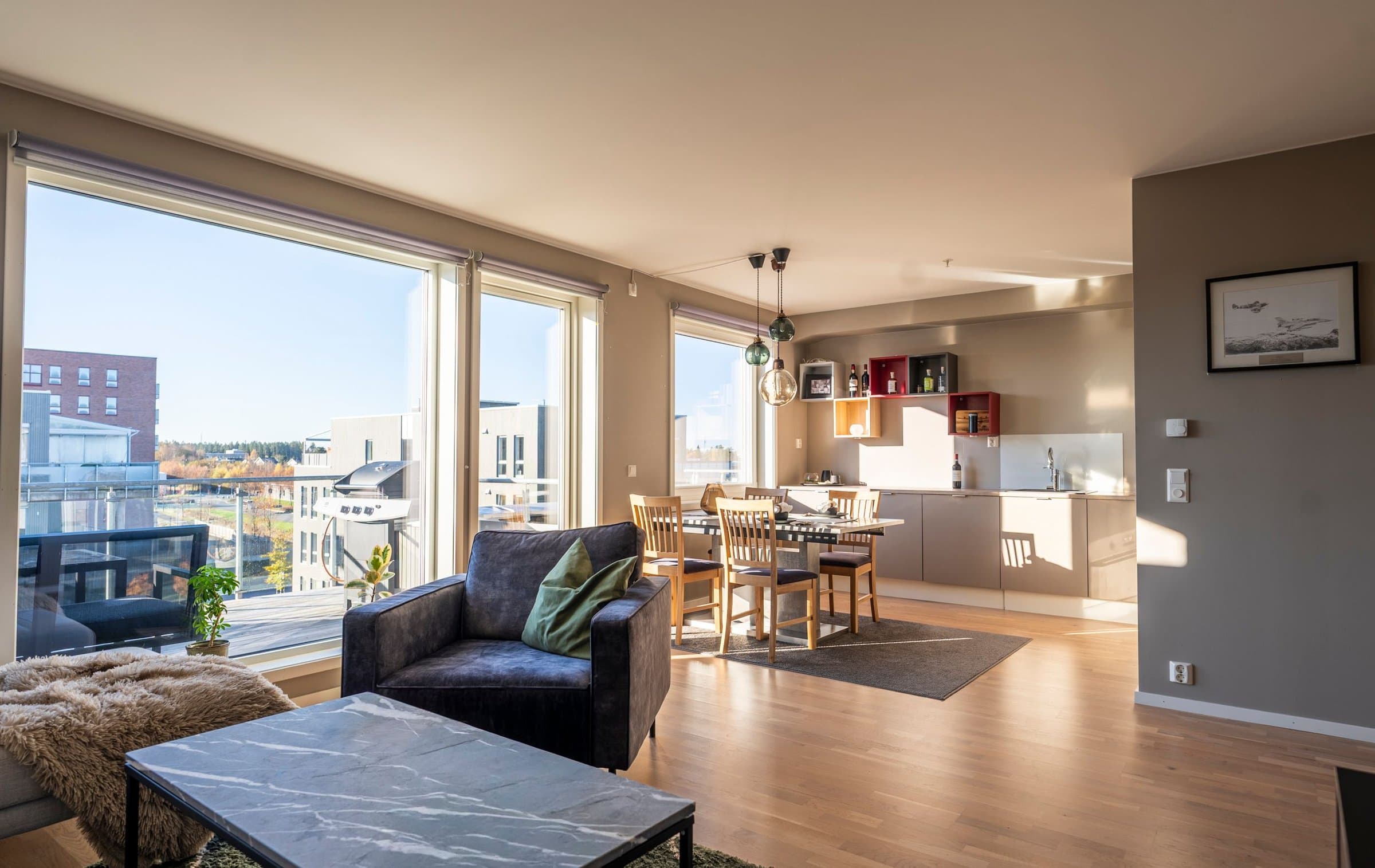 Pen 2-roms toppleilighet i 4. etasje fra 2018 med sørvendt balkong og ekstremt gode solforhold fra morgen til kveld! Store vinduer i kjøkken og stue som gir godt med naturlig lys. Leiligheten er utstyrt med solskjerming på alle vinduer i stue/kjøkken og markise på balkongen - styres med fjernkontroll. Kjøkkenet har god benkeplass og integrert kjøleskap, fryser og komfyr. Soverommet har god plass til dobbeltseng og klesskap. 2 boder leiligheten, derav 1 som i dag brukes som kontor. 1 ekstra bod i kjelleren.