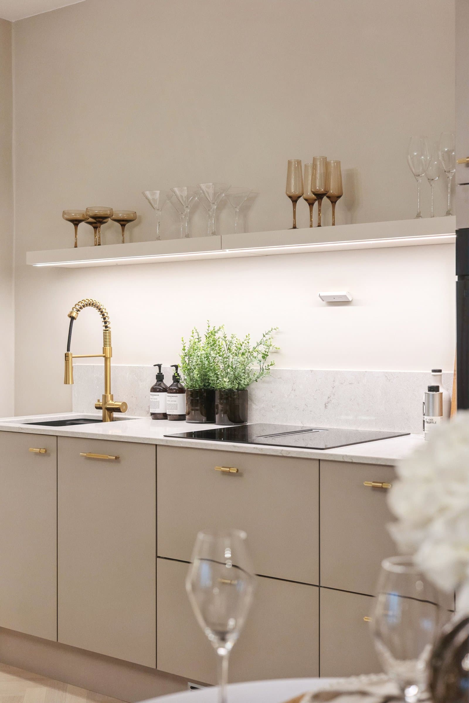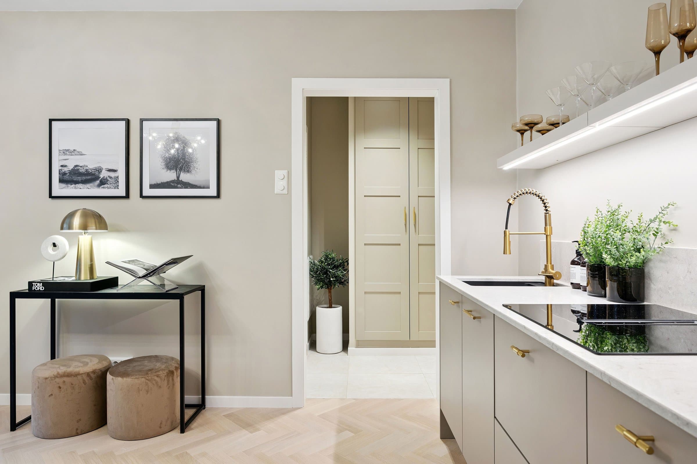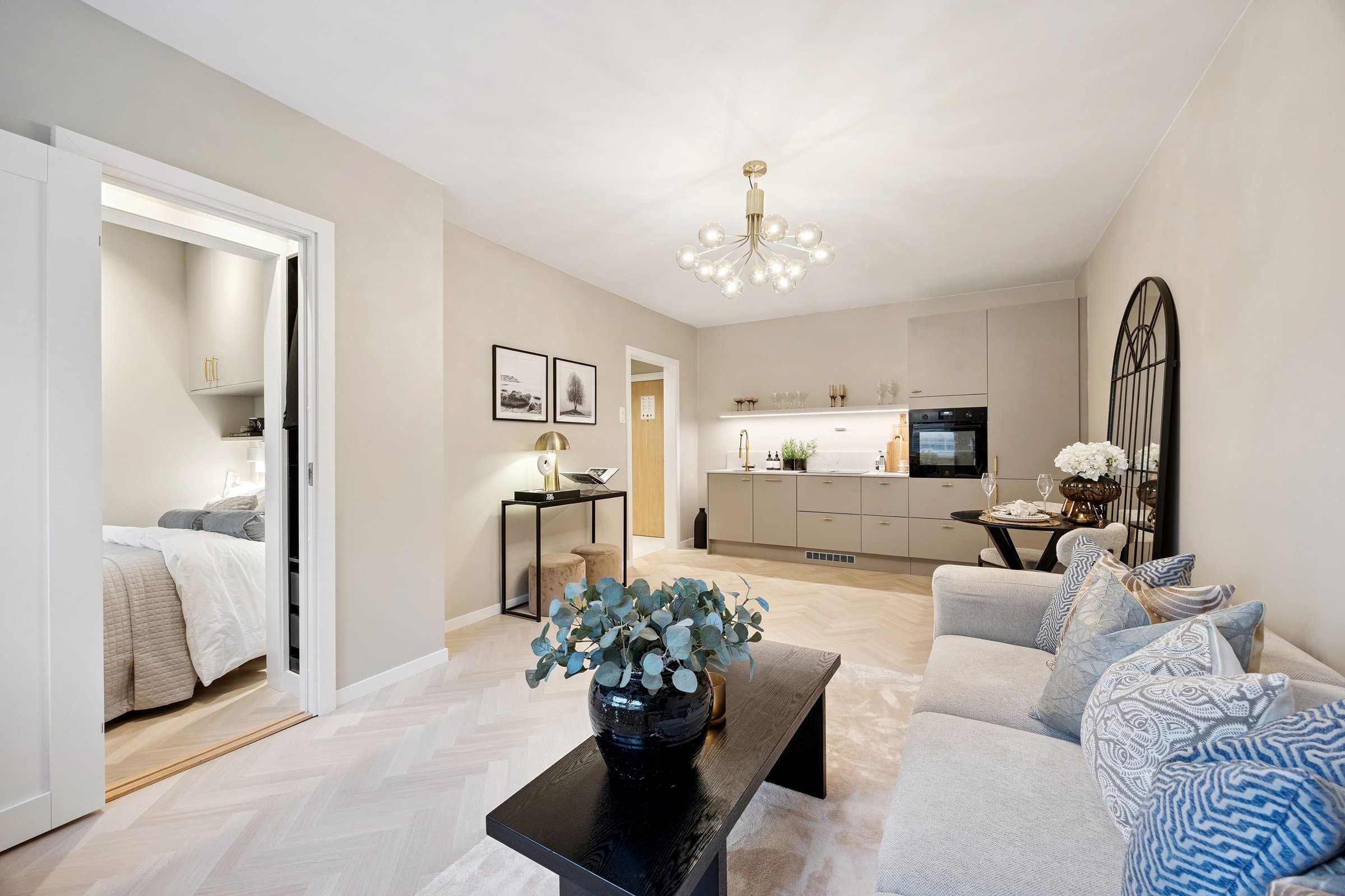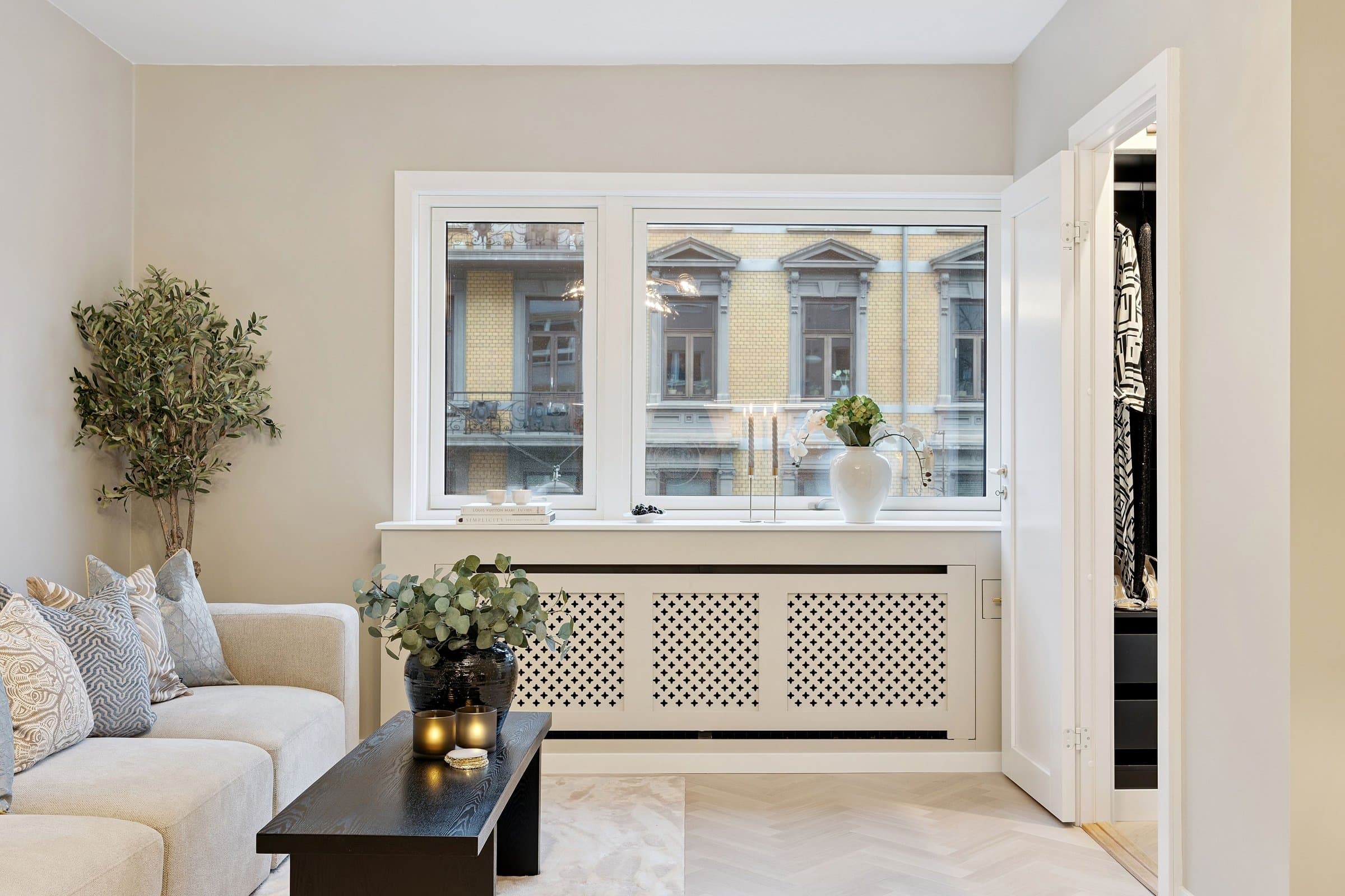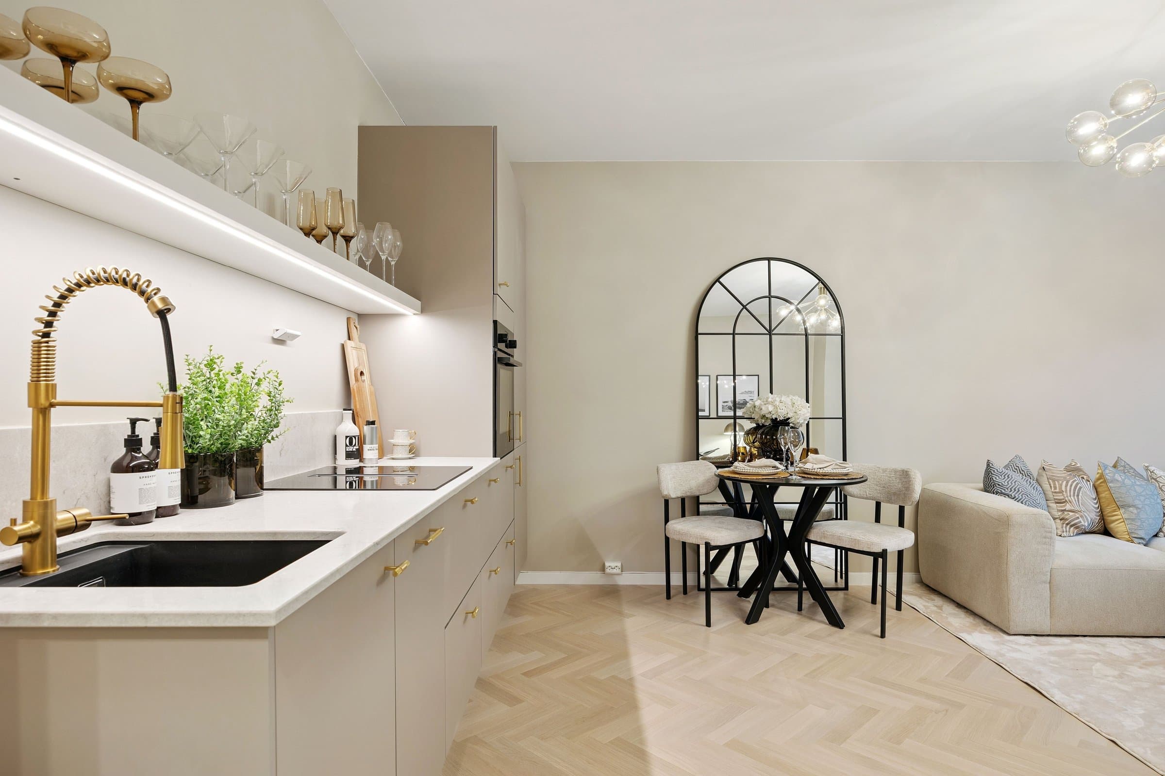 Sentral, påkostet og lekker 2-roms med heis, Vv og fyring ink. Fiskebensparkett, dansk design kjøkken og nye vinduer.
