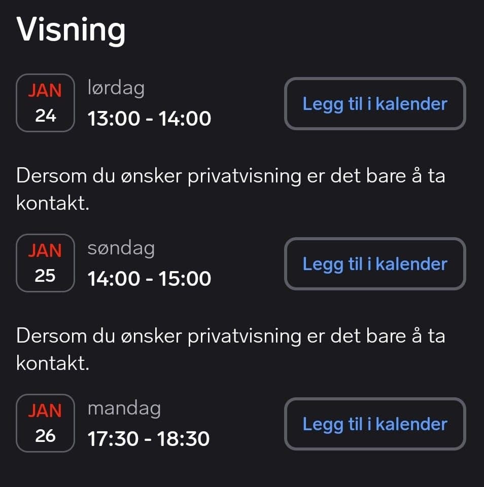 - Overtakelse: Rask overtakelse er mulig om ønskelig. - Inventar: Alle hvitevarer og hyller i bod medfølger. - Digital tilgang: Moderne portsystem via app (fysisk svarapparat kan kjøpes for 4.990,-). - Ingen forkjøpsrett: Ingen andre kan kuppe leiligheten etter budrunden. - Privat visning: Har satt opp felles visning lørdag, søndag og mandag, går fint å møte opp uten påmelding. Hvis ingen av de passer, ikke nøl med å ta kontakt på telefon eller epost for å avtale privat visning.