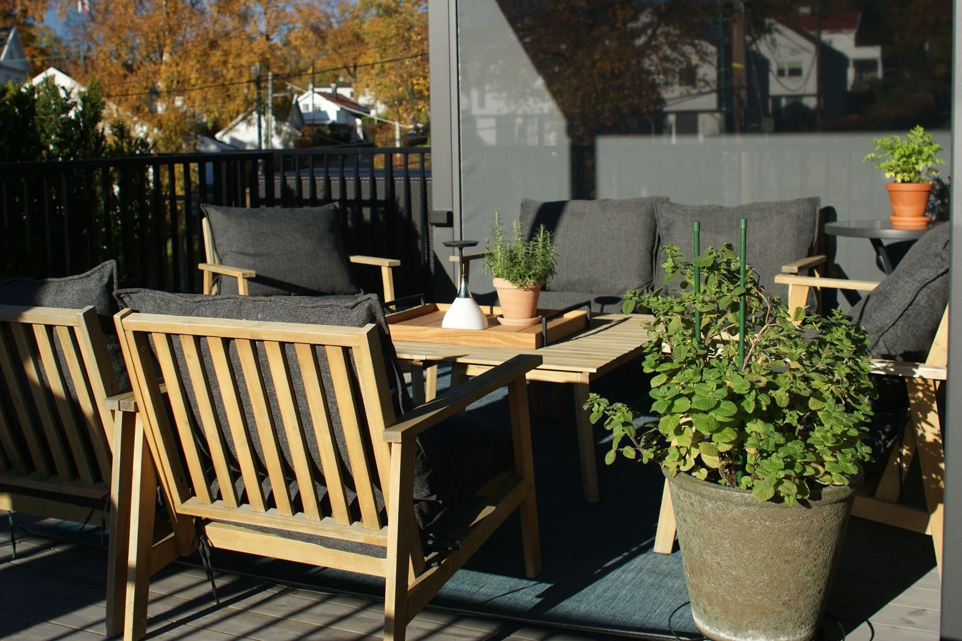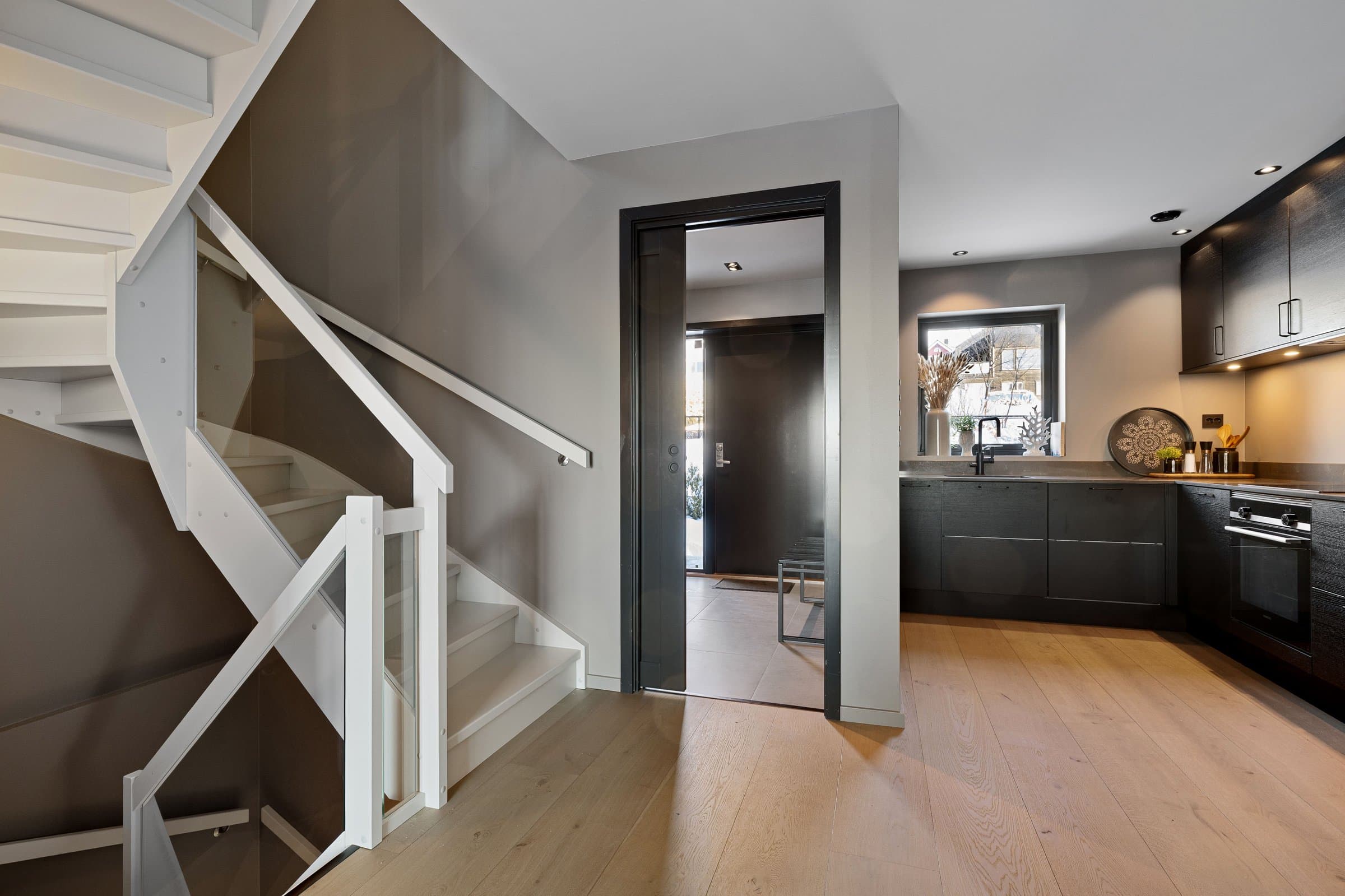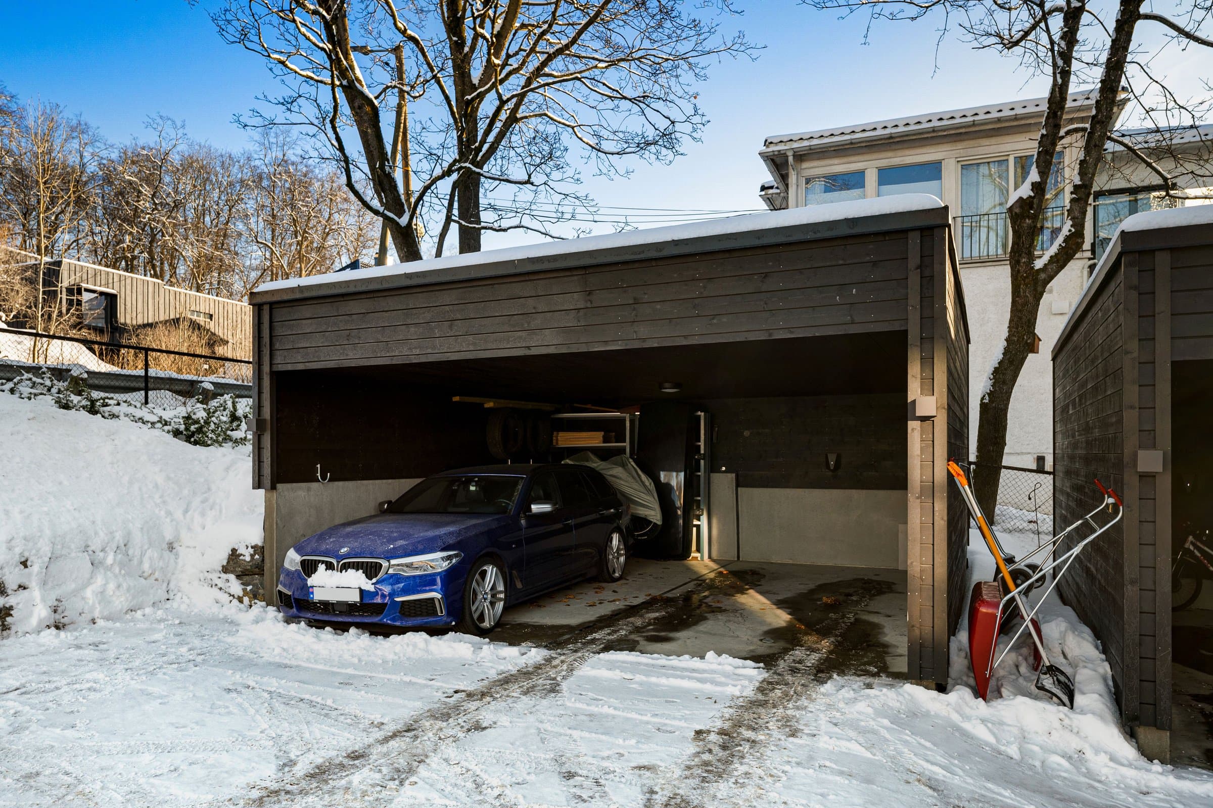Boligen har hybel med åpen kjøkken- og stueløsning med tilstøtende sovealkove og romslig bad. Hybelen har parkettgulv med vannbåren gulvvarme, malte vegger og downlights i himlingen. Det er egen inngang til kjelleren direkte via dør og utvendig trapp. Rommet er godkjent for varig opphold. Se pkt. ferdigattest for mer informasjon. Hybelen har et delikat og flislagt baderom med vannbåren gulvvarme. Dette badet er innredet med grå fliser og har samme farge på baderomsinnredning som bad i 2. etasje. Badet er innredet med et veggmontert toalett, dusjhjørne med glassvegger, samt baderomsinnredning med servant og vegghengt speil med belysning. Det er opplegg for vaskemaskin. Det er balansert ventilasjon. Vaskerommet har flislagt gulv med vannbåren varme og slettmalte vegger. Rommet er utstyrt med utslagsvask i stål, samt opplegg for vaskemaskin og tørketrommel. Det er balansert ventilasjon. Kjelleren er innredet med både en bod og et teknisk rom som gir gode lagringsmuligheter. UTEPLASSER Det er utgang fra gang i 2. etasje og trapp opp til en nydelig takterrasse på ca. 29 m² med mye boltreplass for liten og stor. På taket skinner solen uforhindret hele dagen og det er i tillegg flott utsikt over Oslo by og fjord. Det er installert en vedlikeholdsfri Pergola i aluminium på ca 12 kvm, med lameller og screens på to sider. I tillegg er det 2 stk. IR-varmelamper og integrert led-lysstripe. Fra hovedsoverommet i 2. etasje er det utgang til en overbygd balkong på ca 4 m² hvor både sola og utsikten kan nytes. Stuen har utgang til overbygd balkong på 5 m² med trapp ned til en treplatting på ca. 22 m² og videre adkomst til hagen. Her er det god plass til å møblere med både hagemøbler og grill. Uteområdene på taket og i hagen oppleves som en forlengelse av boligen på sommerhalvåret, et samlingsted for familie og gode venner. Innvendige overflater Gulv: herdet gulv og fliser. Vegger: malte slette veggoverflater. Himlinger: malte plater.