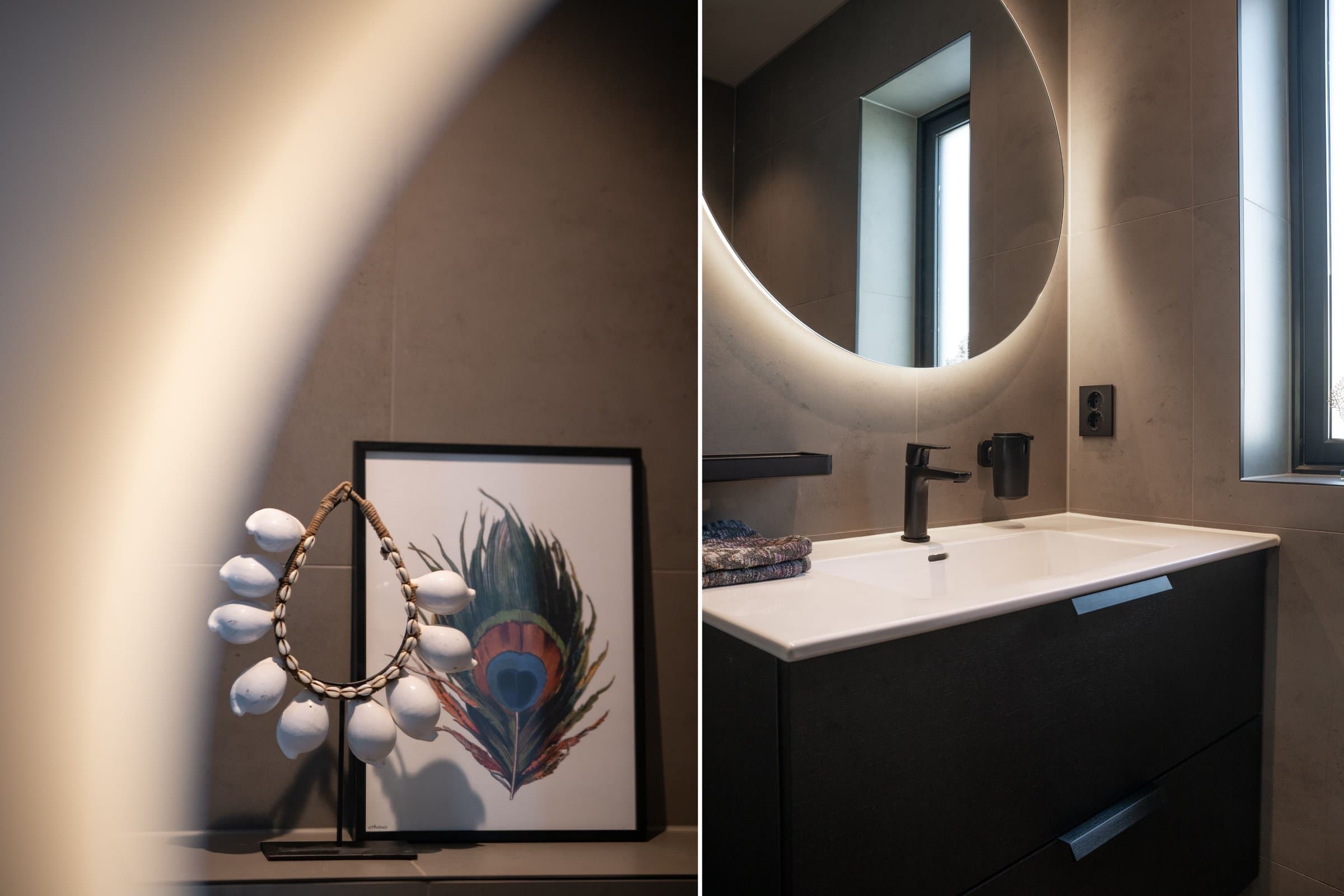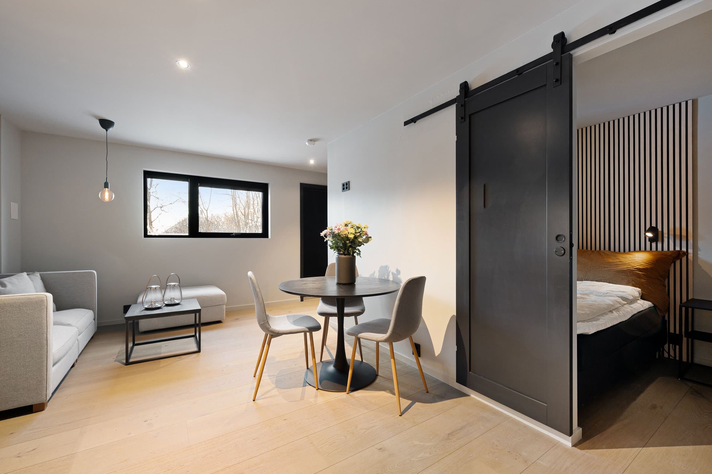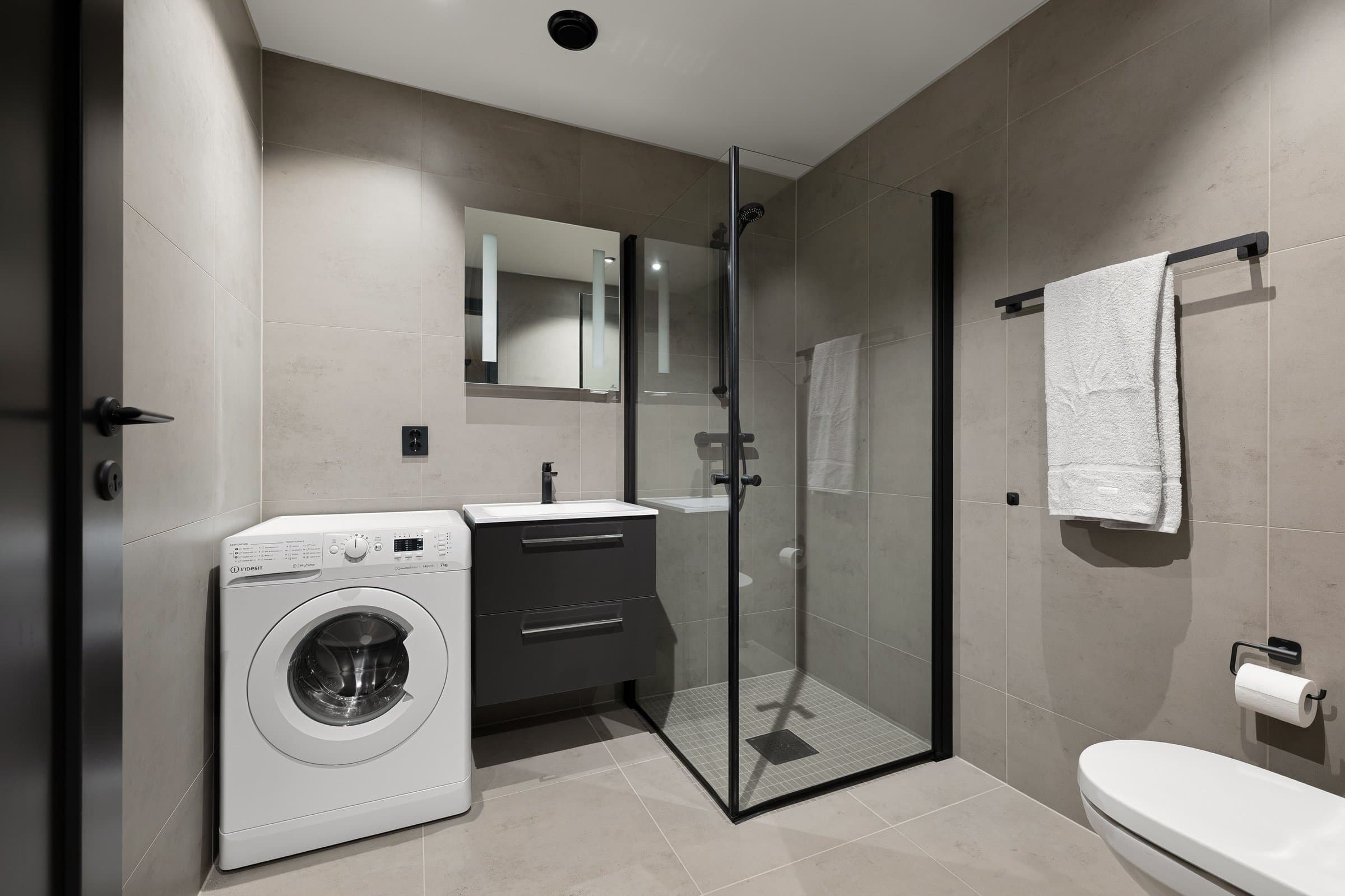 Boligen har hybel med åpen kjøkken- og stueløsning med tilstøtende sovealkove og romslig bad. Hybelen har parkettgulv med vannbåren gulvvarme, malte vegger og downlights i himlingen. Det er egen inngang til kjelleren direkte via dør og utvendig trapp. Rommet er godkjent for varig opphold. Se pkt. ferdigattest for mer informasjon. Hybelen har et delikat og flislagt baderom med vannbåren gulvvarme. Dette badet er innredet med grå fliser og har samme farge på baderomsinnredning som bad i 2. etasje. Badet er innredet med et veggmontert toalett, dusjhjørne med glassvegger, samt baderomsinnredning med servant og vegghengt speil med belysning. Det er opplegg for vaskemaskin. Det er balansert ventilasjon. Vaskerommet har flislagt gulv med vannbåren varme og slettmalte vegger. Rommet er utstyrt med utslagsvask i stål, samt opplegg for vaskemaskin og tørketrommel. Det er balansert ventilasjon. Kjelleren er innredet med både en bod og et teknisk rom som gir gode lagringsmuligheter. UTEPLASSER Det er utgang fra gang i 2. etasje og trapp opp til en nydelig takterrasse på ca. 29 m² med mye boltreplass for liten og stor. På taket skinner solen uforhindret hele dagen og det er i tillegg flott utsikt over Oslo by og fjord. Det er installert en vedlikeholdsfri Pergola i aluminium på ca 12 kvm, med lameller og screens på to sider. I tillegg er det 2 stk. IR-varmelamper og integrert led-lysstripe. Fra hovedsoverommet i 2. etasje er det utgang til en overbygd balkong på ca 4 m² hvor både sola og utsikten kan nytes. Stuen har utgang til overbygd balkong på 5 m² med trapp ned til en treplatting på ca. 22 m² og videre adkomst til hagen. Her er det god plass til å møblere med både hagemøbler og grill. Uteområdene på taket og i hagen oppleves som en forlengelse av boligen på sommerhalvåret, et samlingsted for familie og gode venner. Innvendige overflater Gulv: herdet gulv og fliser. Vegger: malte slette veggoverflater. Himlinger: malte plater.