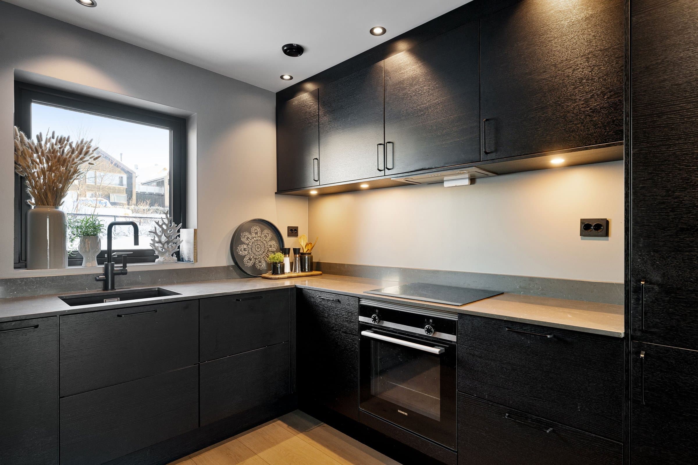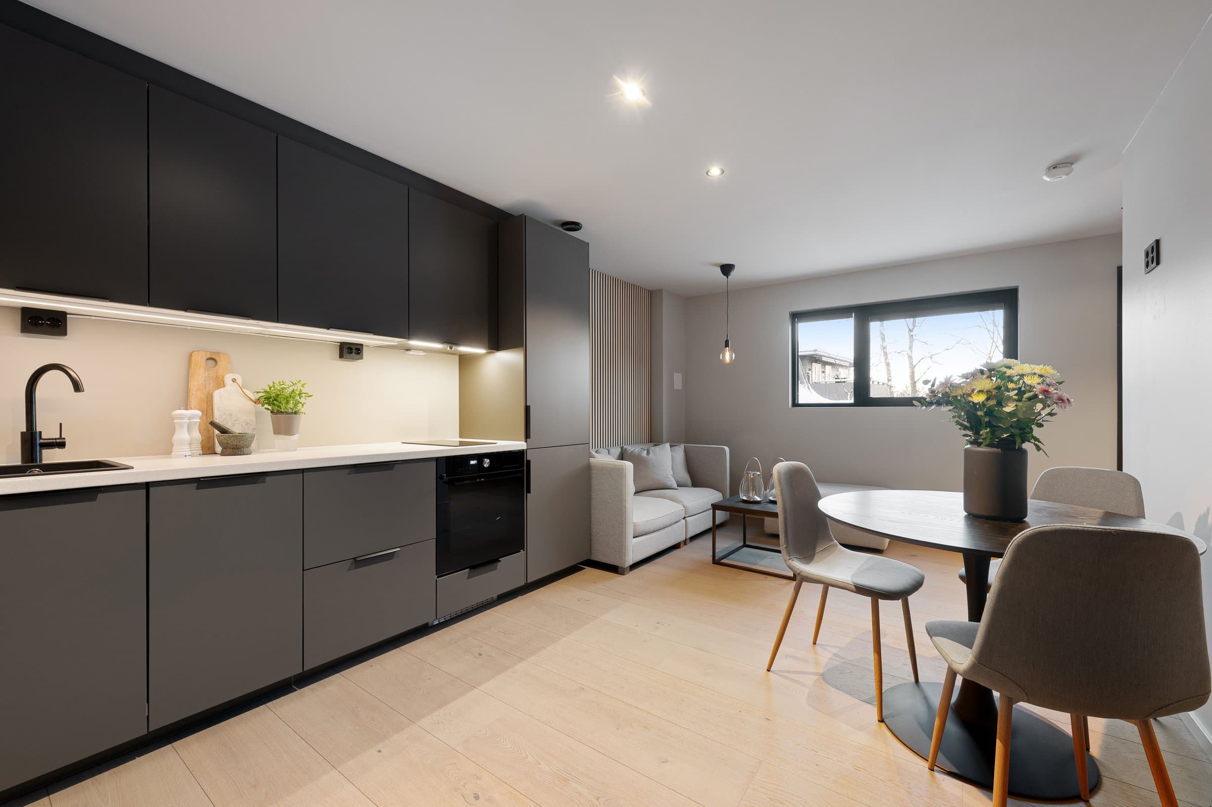 Rekkehus bygget i 2022 og det er standard fra byggeår. Pent opparbeidet tomt med gressplen, hekker og asfaltert innkjørsel og gårdsplass. Det er vannbåren varme i både U. etg og 1. etasje med digitale trådløse termostater som app-styres, samt elektriske varmekabler på badene i 2. etasje. Det medfølger en parkeringsplass i carport med el‑bil lader. Det er beboerparkering i området. Tomteforhold Det er ingen nøyaktig kjennskap til hvilken type byggegrunn det er på eiendommen. Antatt fundamentert på støpte såler på fast grunn eller faste, komprimerte masser. Drenering fra byggeår som er 2022. Det er grunnmur i mur konstruksjon. Det er støttemur i naturstein. Tomten er relativt flat, noe skrånende terreng på nedsiden av huset. Offentlig vann og avløp via private stikkledninger. Utvendig Taket er tekket med membran. Det er flatt tak med innvendige taknedløp. Det er betongkonstruksjon i kjeller, utvendig pusset og malt. Resten av huset er i trekonstruksjon med liggende panel. Det er flatt tak med fall mot midten av taket hvor det er taknedløp. Vinduer med 3‑lags glass produsert i 2022. Mattlakkede entredører i 1. etasje og i kjeller. Balkongdører med 3‑lags glass produsert i 2022. Takterrasse med oppforet tregulv på ca. 27 m2. Balkong i 2. etasje med oppforet tregulv på ca. 4 m2. Balkong i 1. etasje med oppforet tregulv på ca. 5 m2 med trapp ned til terreng. Platting i trekonstruksjon på ca. 22 m2. Utvendig trapper i stålkonstruksjon. Trapp i murkonstruksjon til kjeller. Innvendig Etasjeskille er antatt trebjelkelag. Det er ikke opplyst om det er utført radonmålinger. Tretrapp med lukkede opptrinn og glass i geims. Swedoor dempet sort glatte dører med dempelister. Skyvedør fra entre. Trefyllinngsdør til toalettrommet. Se vedlagte tilstandsrapport der byggemåte er nærmere beskrevet, og også gitte tilstandsgrader fremkommer. Tilstandsgradene tilsier hvilken tilstand et objekt har i forhold til et definert referansenivå. For nærmere forklaring av tilstandsgrader og hva de angir, se vedlagte tilstandsrapport.