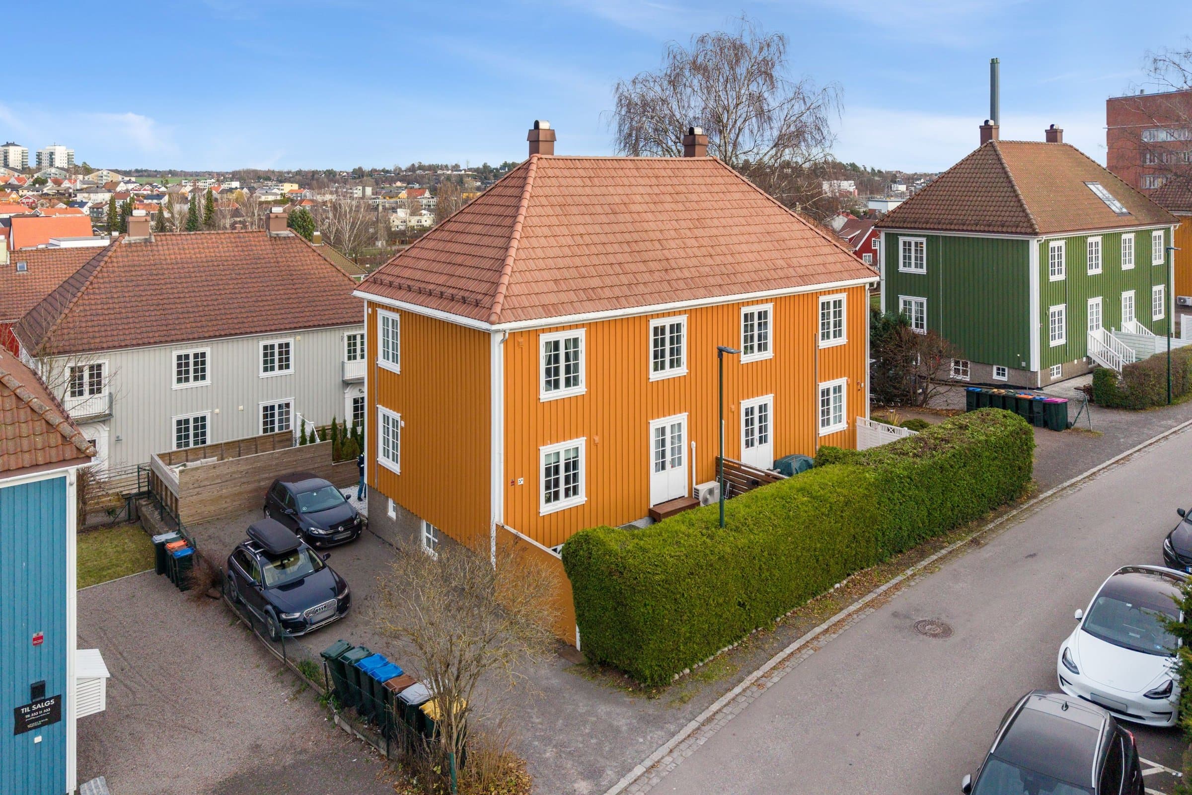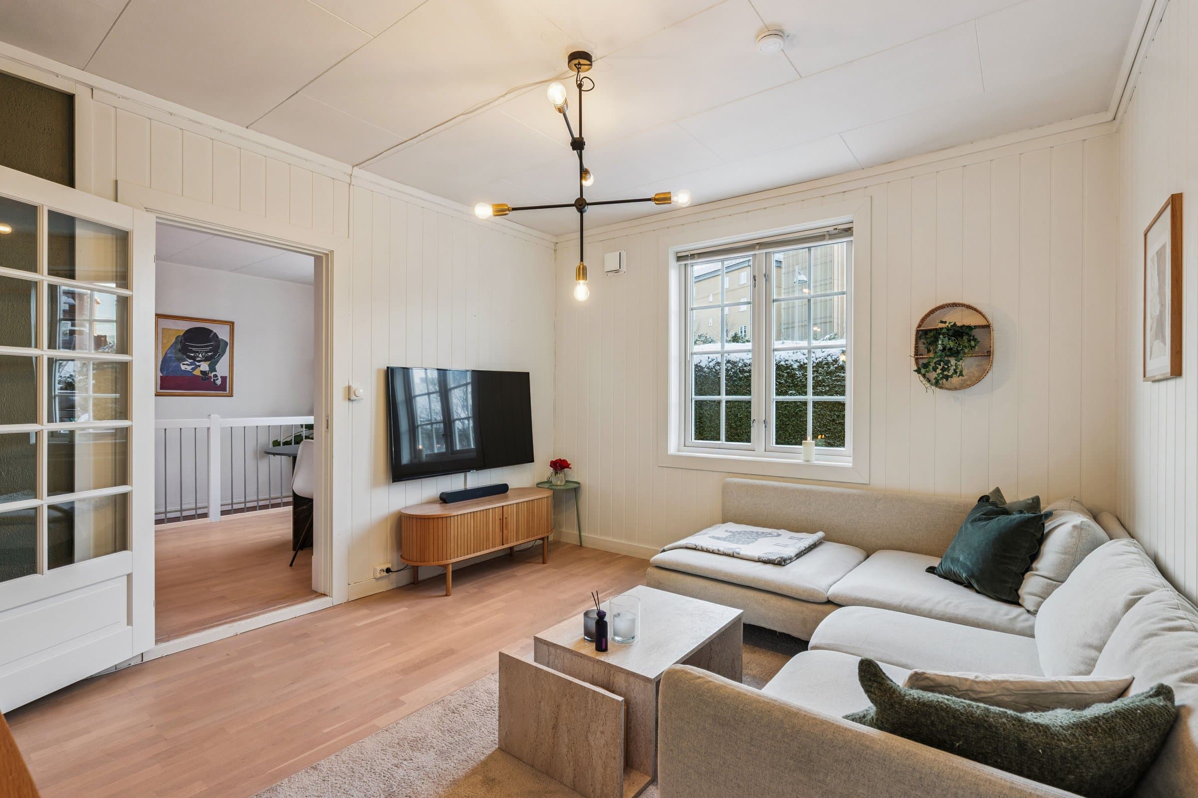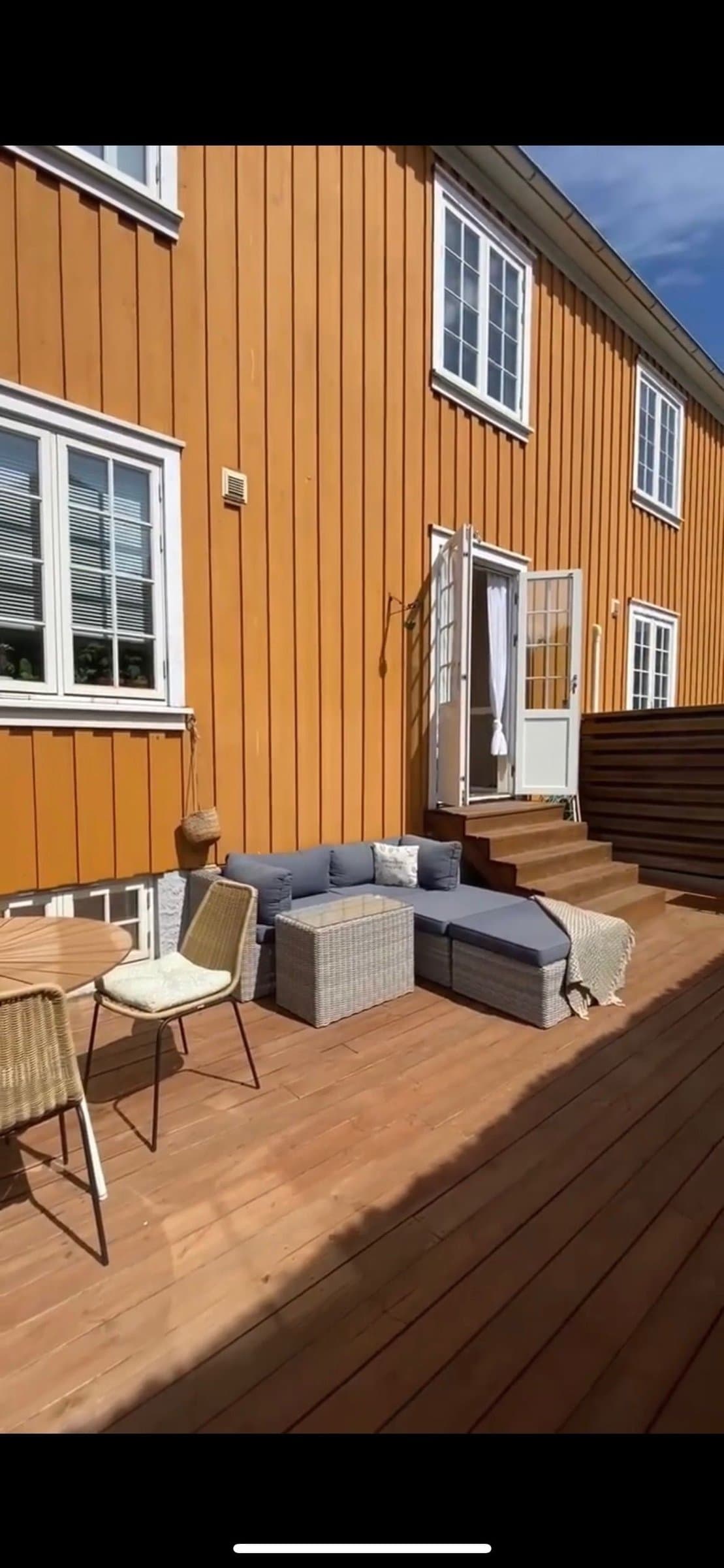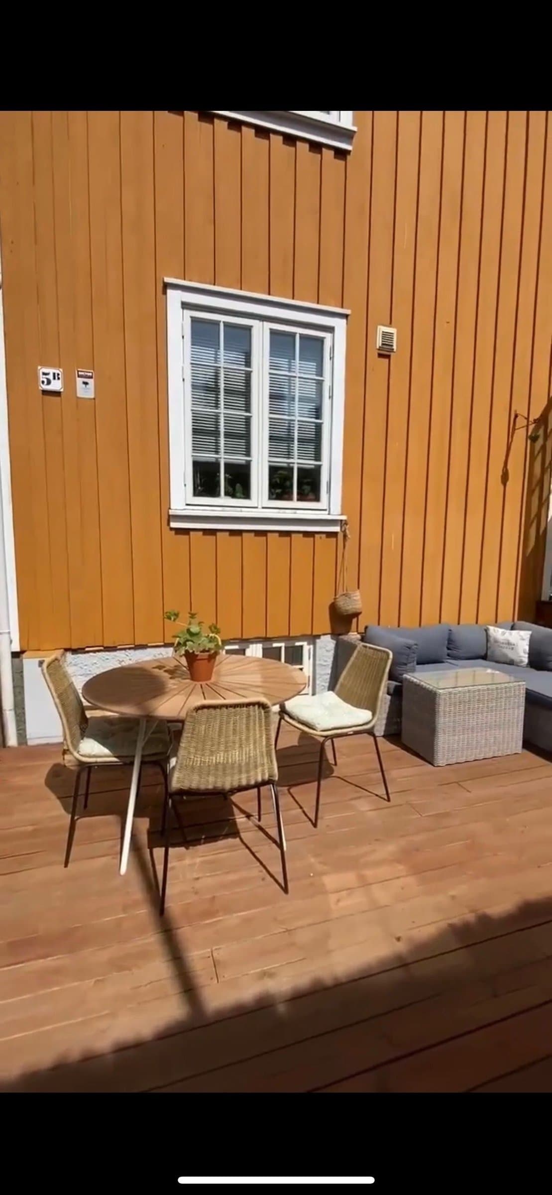 Lys og sjarmerende 2-etasjes leilighet med stor terrasse, peis og egen parkering.