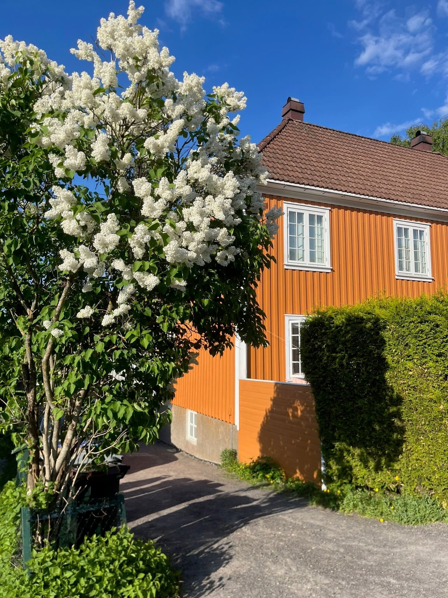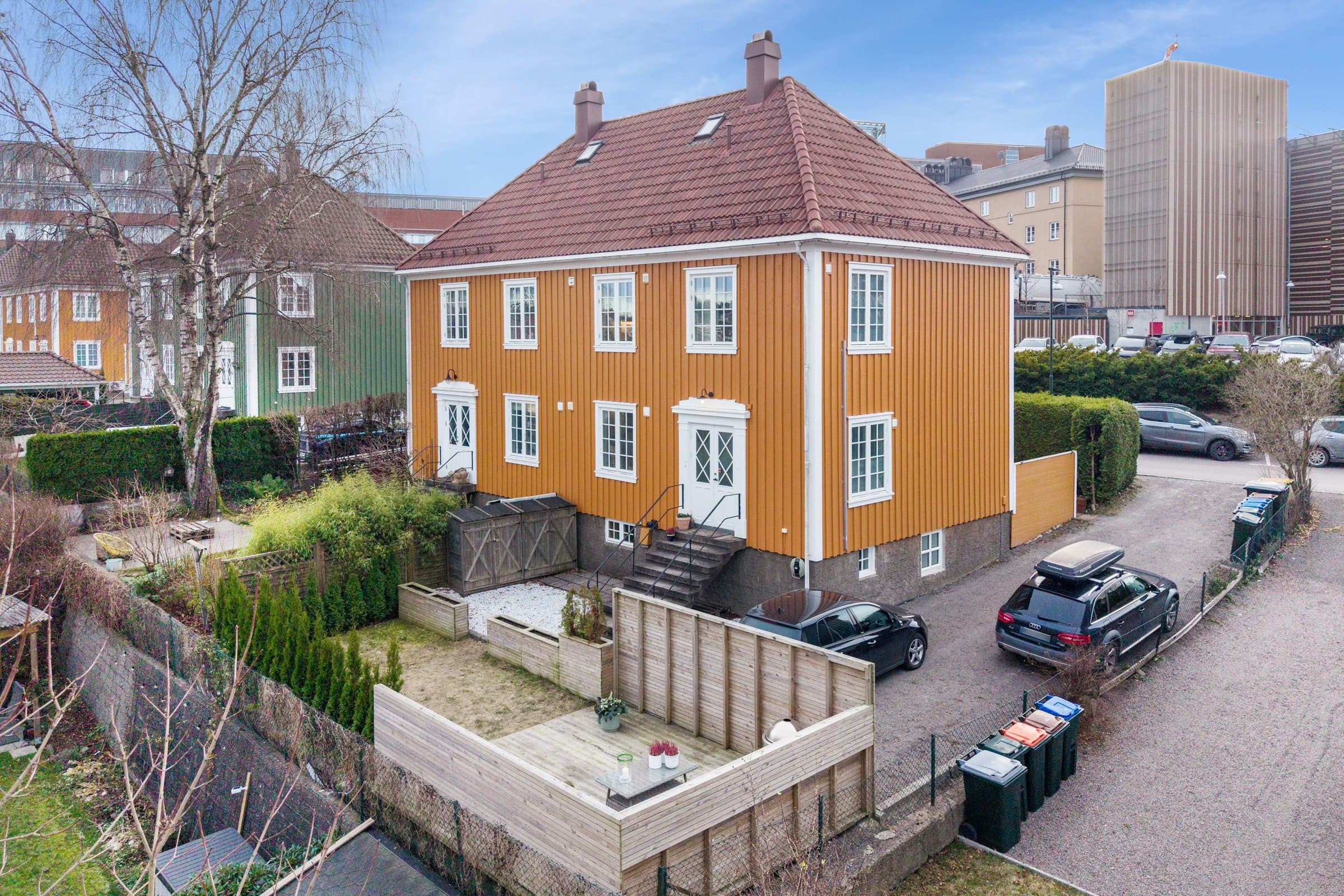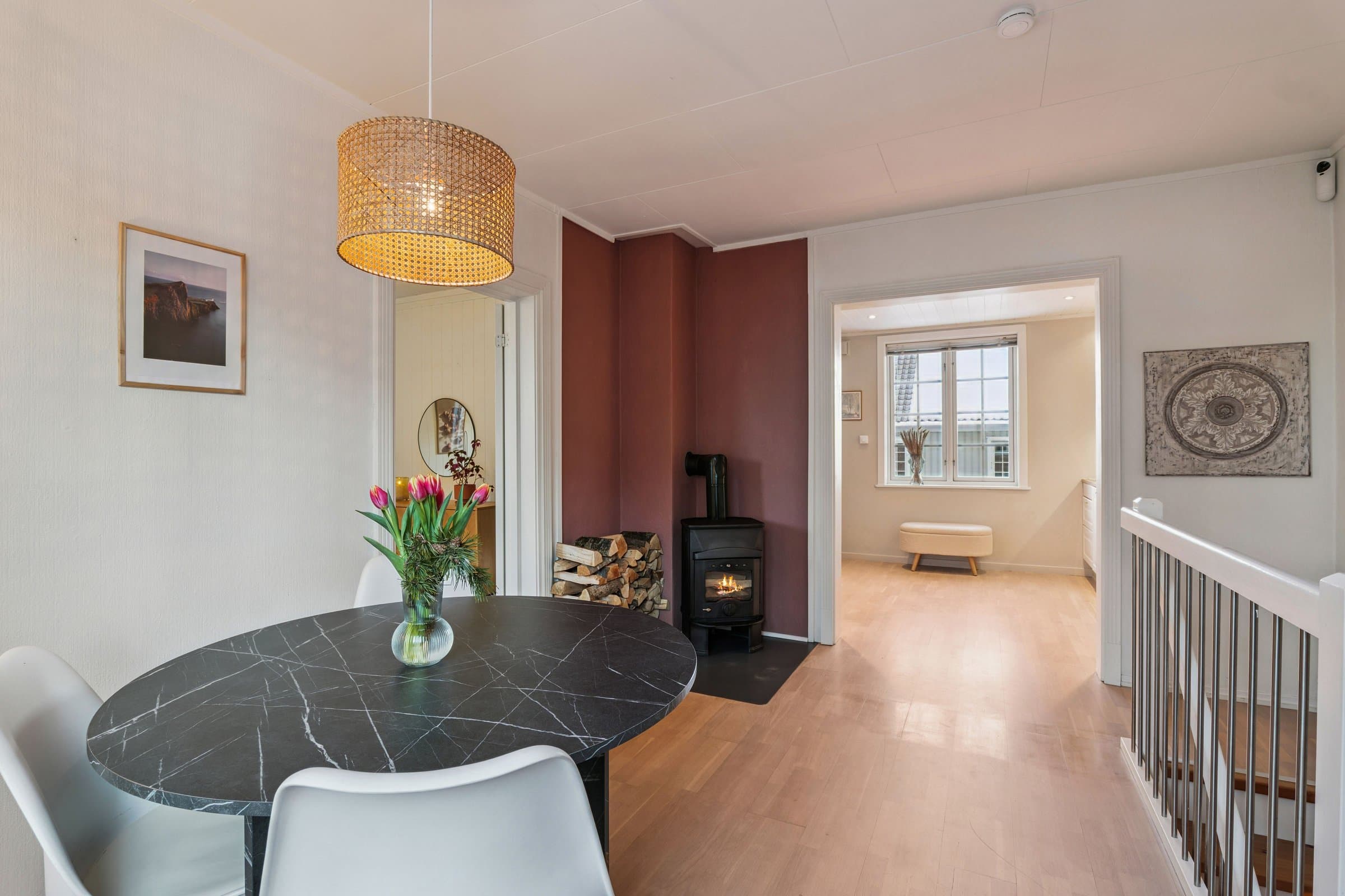 Lys og sjarmerende 2-etasjes leilighet med stor terrasse, peis og egen parkering.