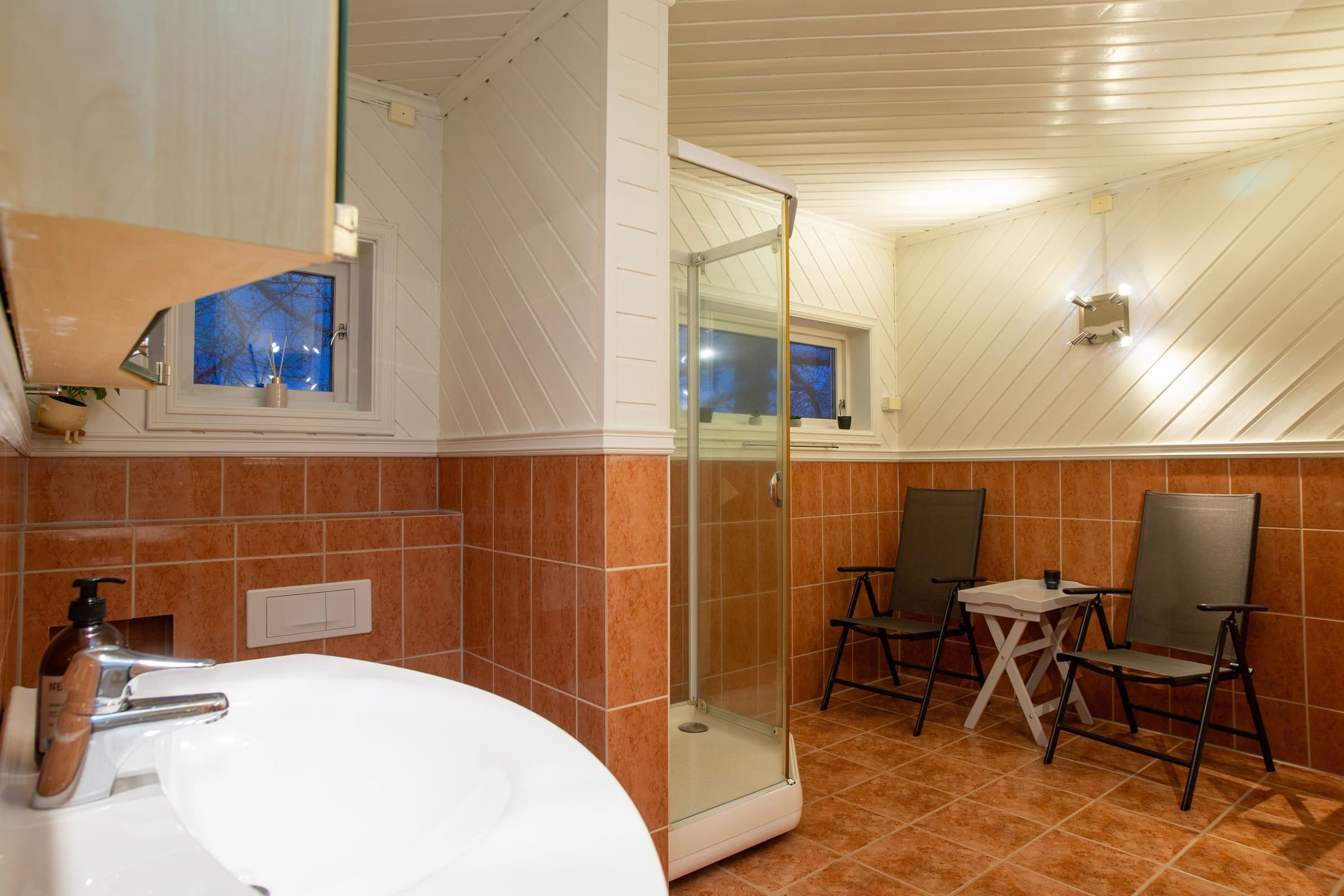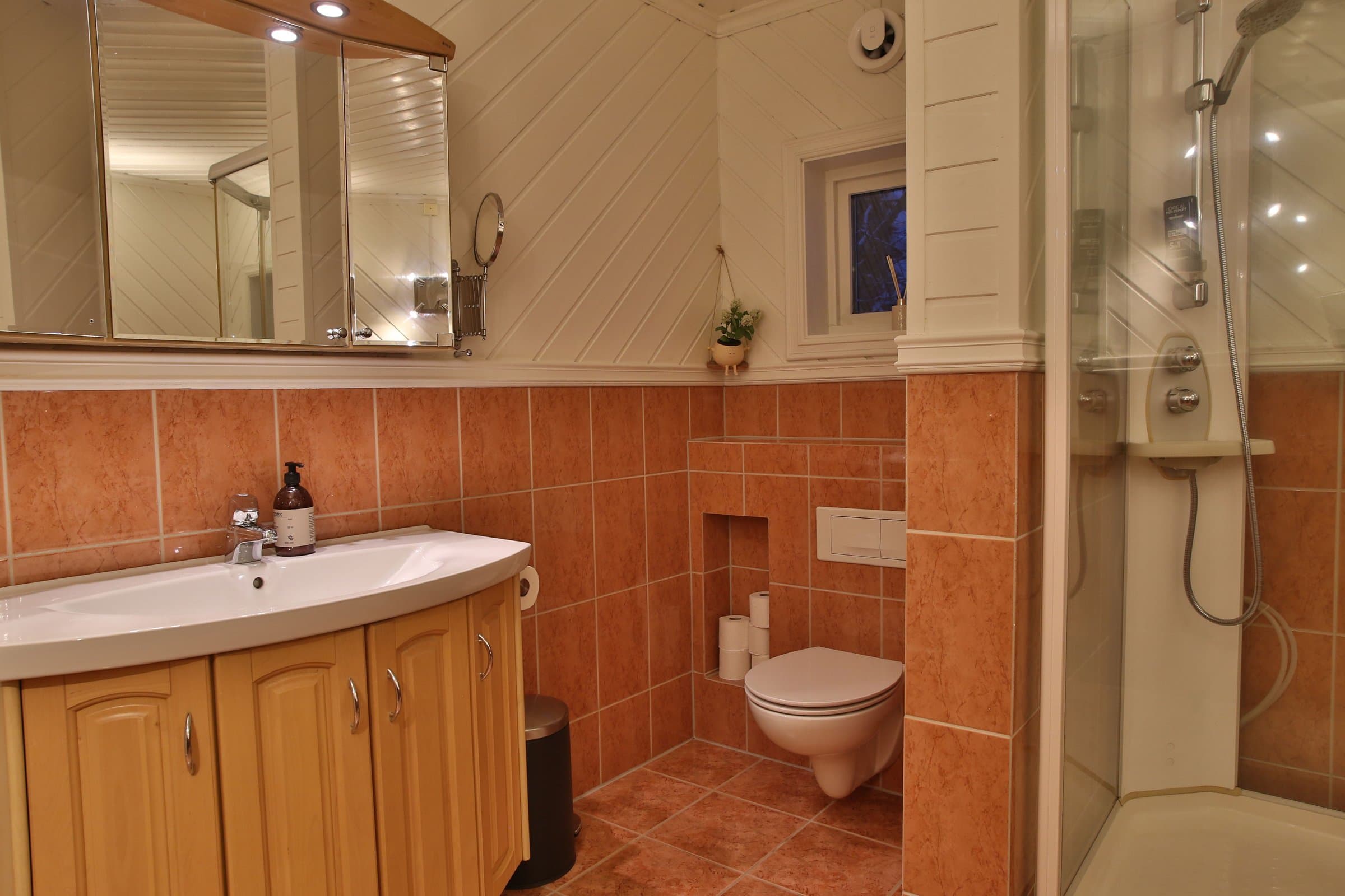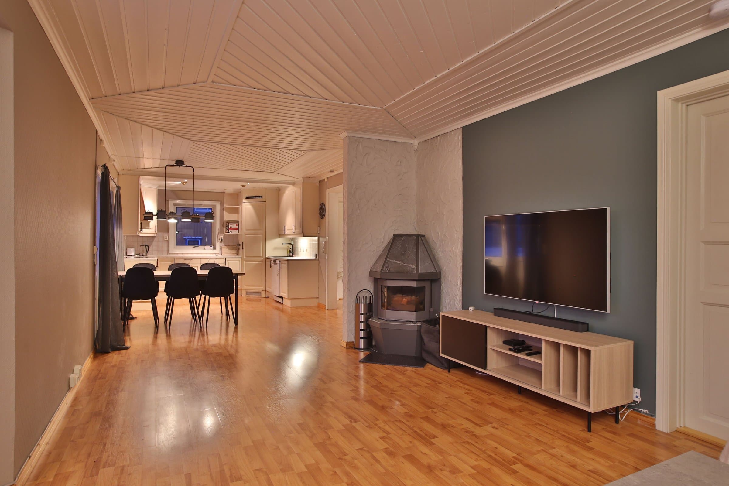 2 boenheter, med hovedleilighet i 2. Og 3. Etg og og sekundær leilighet i 1. Etasje, med bad og vaskerom i kjeller Hovedleilighet: 1. Etasje: stor yttergang, med flislagt gulv og skyvedørsgarderobe. 2. Etasje: åpen stue-kjøkkenløsning, hovedsoverom, stort bad med badstue og bod/vaskerom, stor veranda mot hagen. 3. Etasje: stor loftstue med utgang til balkong med utsikt mot sentrum, 2 soverom Sekundær leilighet 1. Etasje: yttergang med skyvedørsgarderobe, 2 soverom, toalettrom, kjøkken og stue. Kjeller: gang, bad og vaskerom. Kjeller: 4 boder, gangarealer, vaskerom, utvendig kjellerdør/trapp. Uisolert garasje på 34 m2 med elektrisk portåpner.