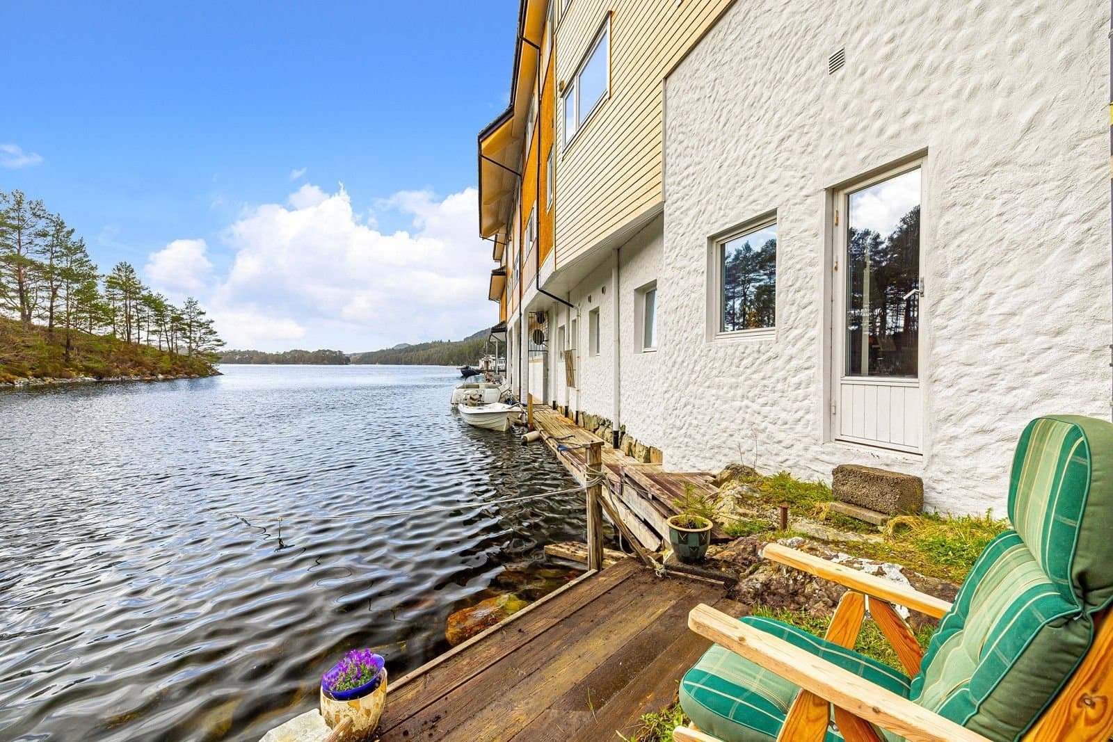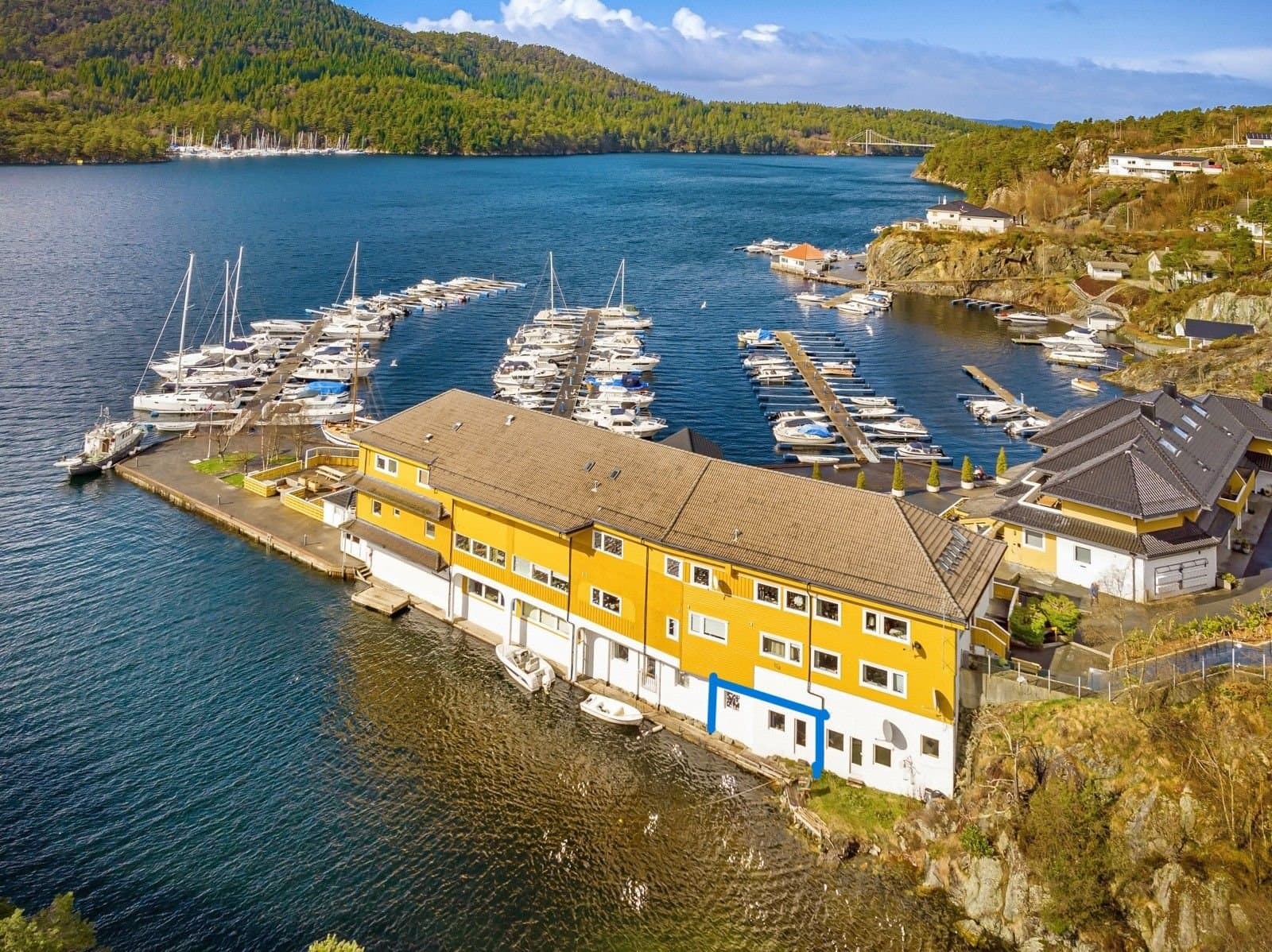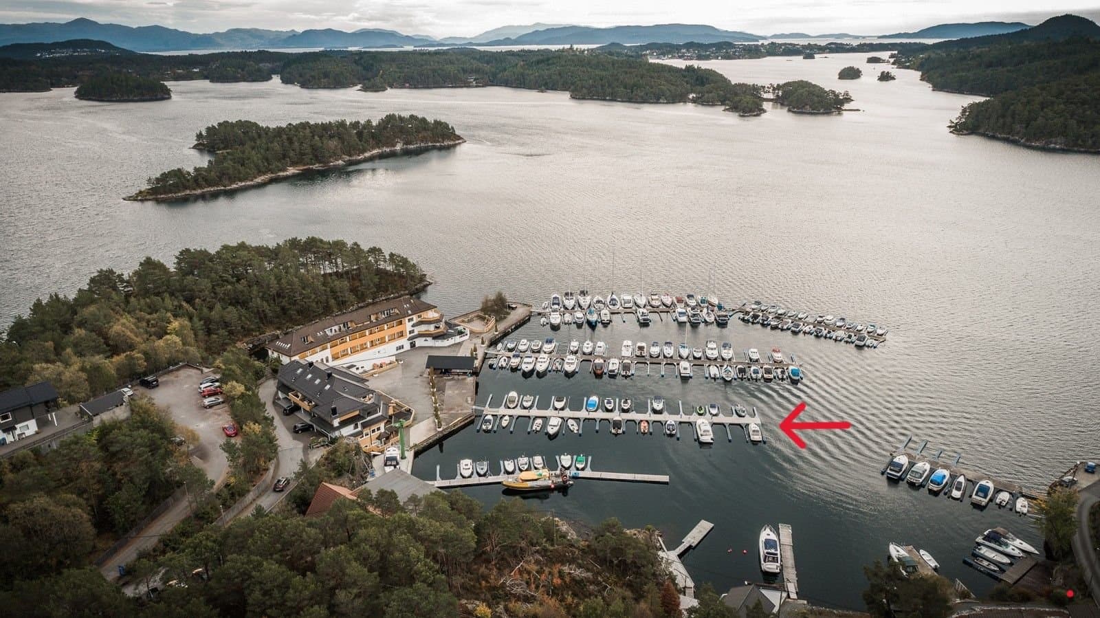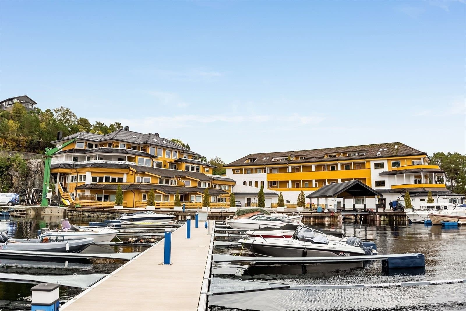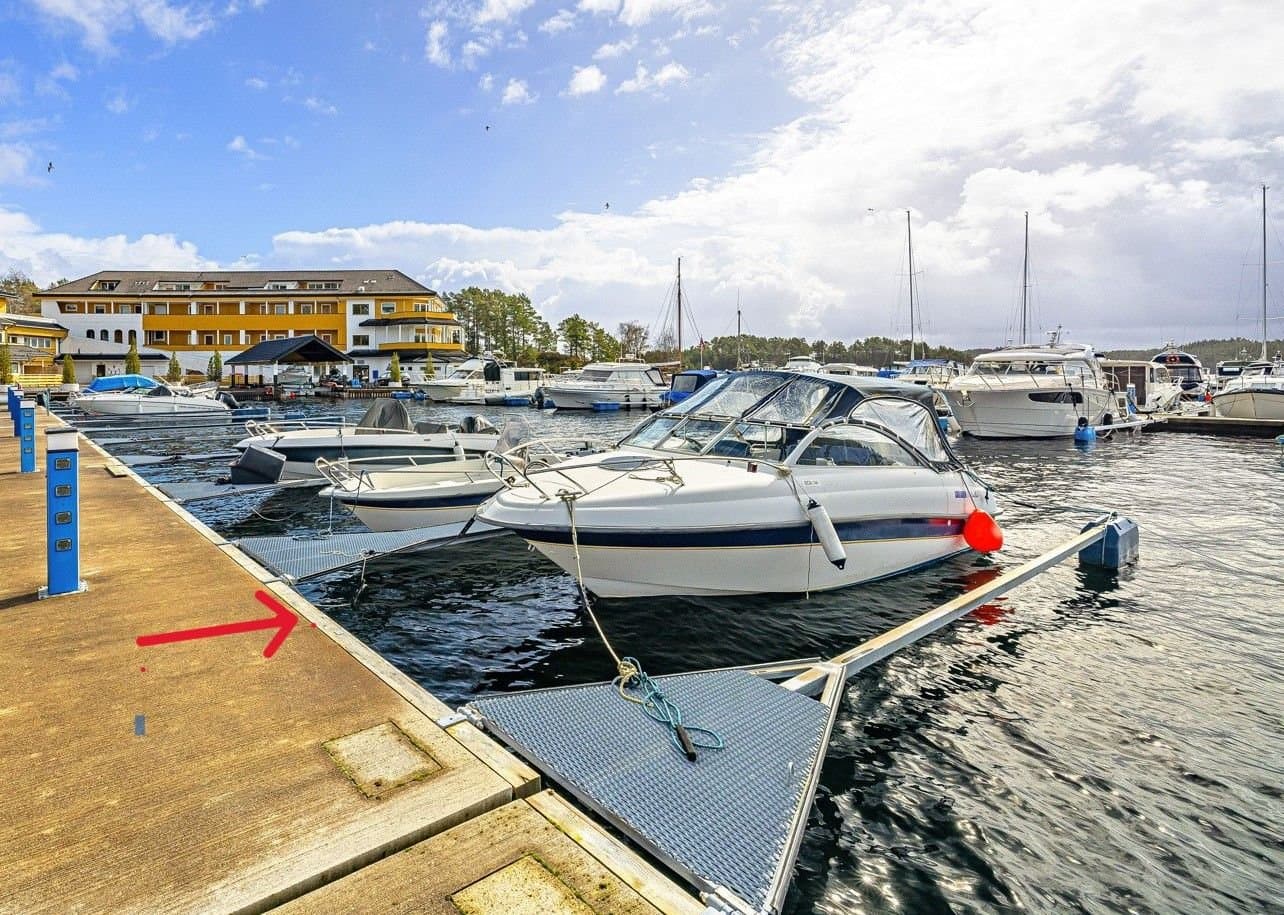 Det er to størrelser på båtplassene i flytebryggen, til 50B medfølger bryggeplass med størrelse ca 3 x8 m. Her kan det ligge båt med størrelse inntil 30 fot og 6 tonn. Bryggen er plassert i rolig farvann, slik at det er trygt å ha båten liggende på sjø også i vinterhalvåret. Det er uttak for strøm og vann langs hele bryggen. I viken på østsiden rett utenfor leiligheten er det fortøyningsplass for en mindre landstedsbåt. Båten som nå ligger der, en 14 fots Hobby, kan følge med i salget av leiligheten hvis kjøper har interesse av det.