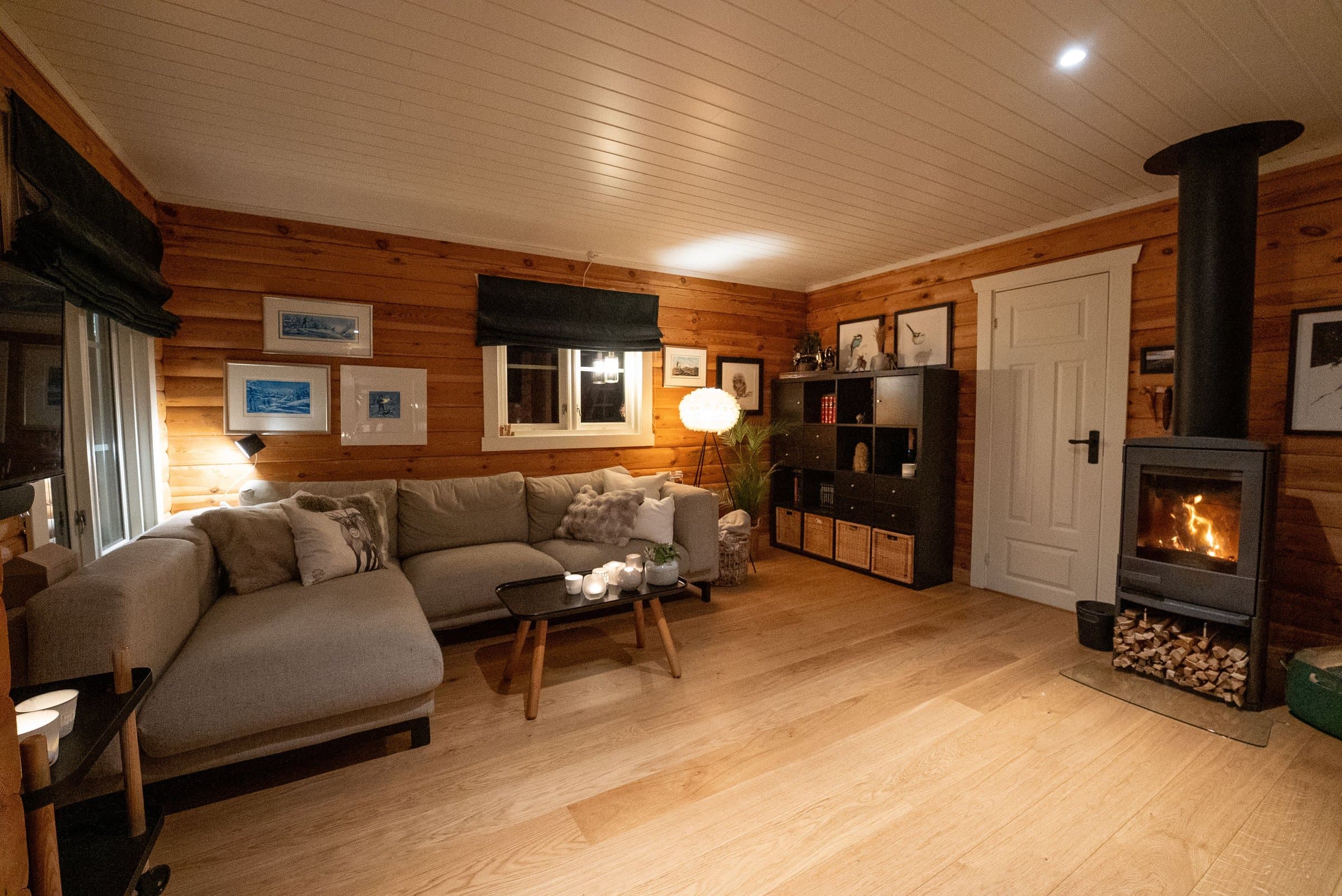 Entré, bad og badstue har flislagte gulv. Det er en-stavs parkett på soverom og i stue/kjøkken i første etasje, mens loftet har heltre gulv. Veggene i første etasje er laftet, og både taket her og vegger/tak på loftet er i hvitt panel, fabrikkmalt. Hytta er oppgradert på flere områder for å gi bedre komfort, funksjonalitet og brukskvalitet. Det er installert varmekabler i flere rom og styringssystemet "Ring- hytta- varm" for enkel temperaturkontroll året rundt. Peisen er oppgradert fra opprinnelig leveranse, og kjøkkenet har fått bedre hvitevarer enn standard. Det er også montert spotter i taket som gir et mer moderne uttrykk og bedre belysning. Loftet er innredet med to rom og et oppholdsrom, noe som gir ekstra bruksverdi og flere soveplasser enn i grunnmodellen. Ute er det etablert en romslig terrasse med solide utemøbler og en vedfyrt stamp, som gjør uteområdet til en naturlig forlengelse av hytta. Det er også satt opp en sportsbod som gir praktisk lagringsplass for utstyr.