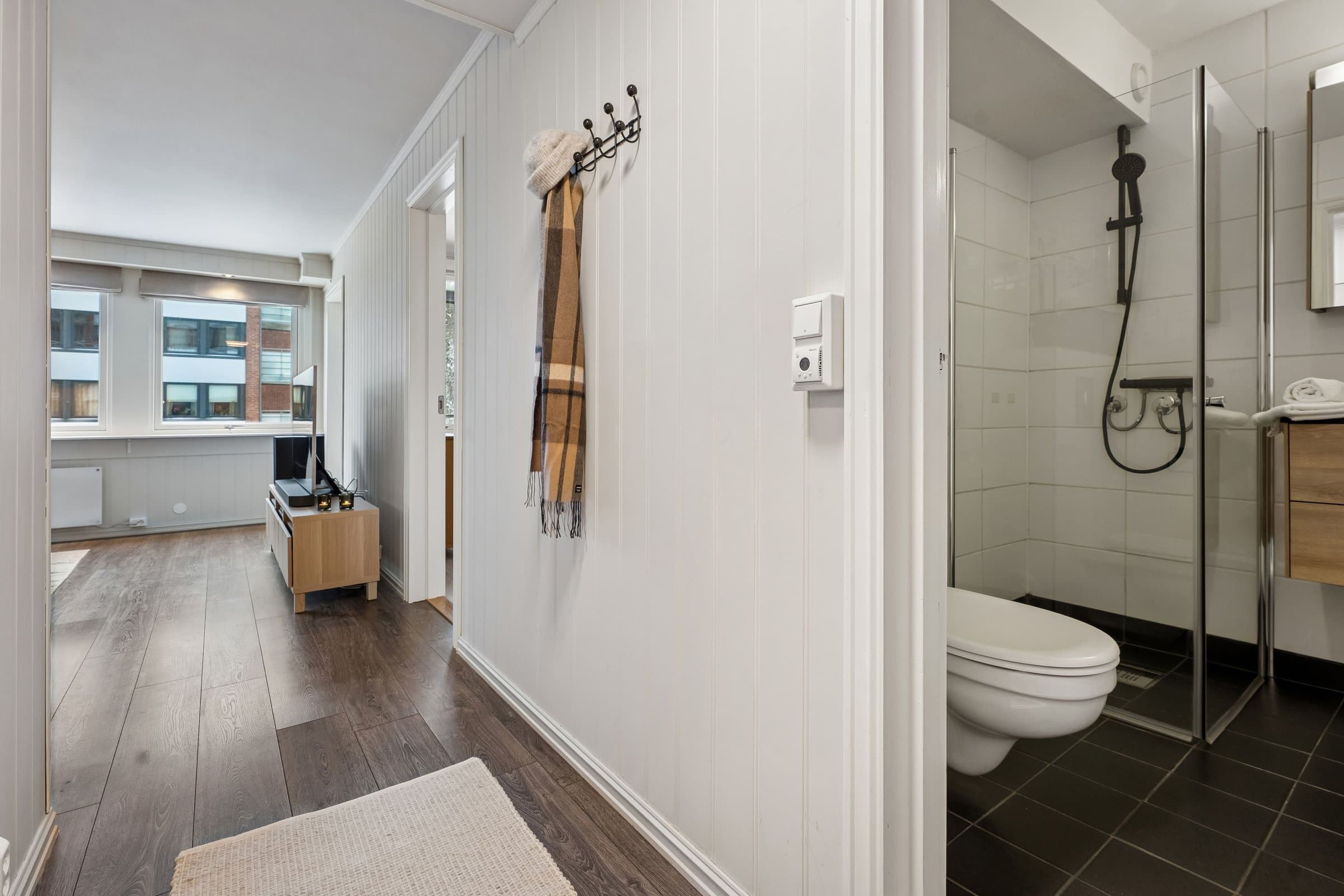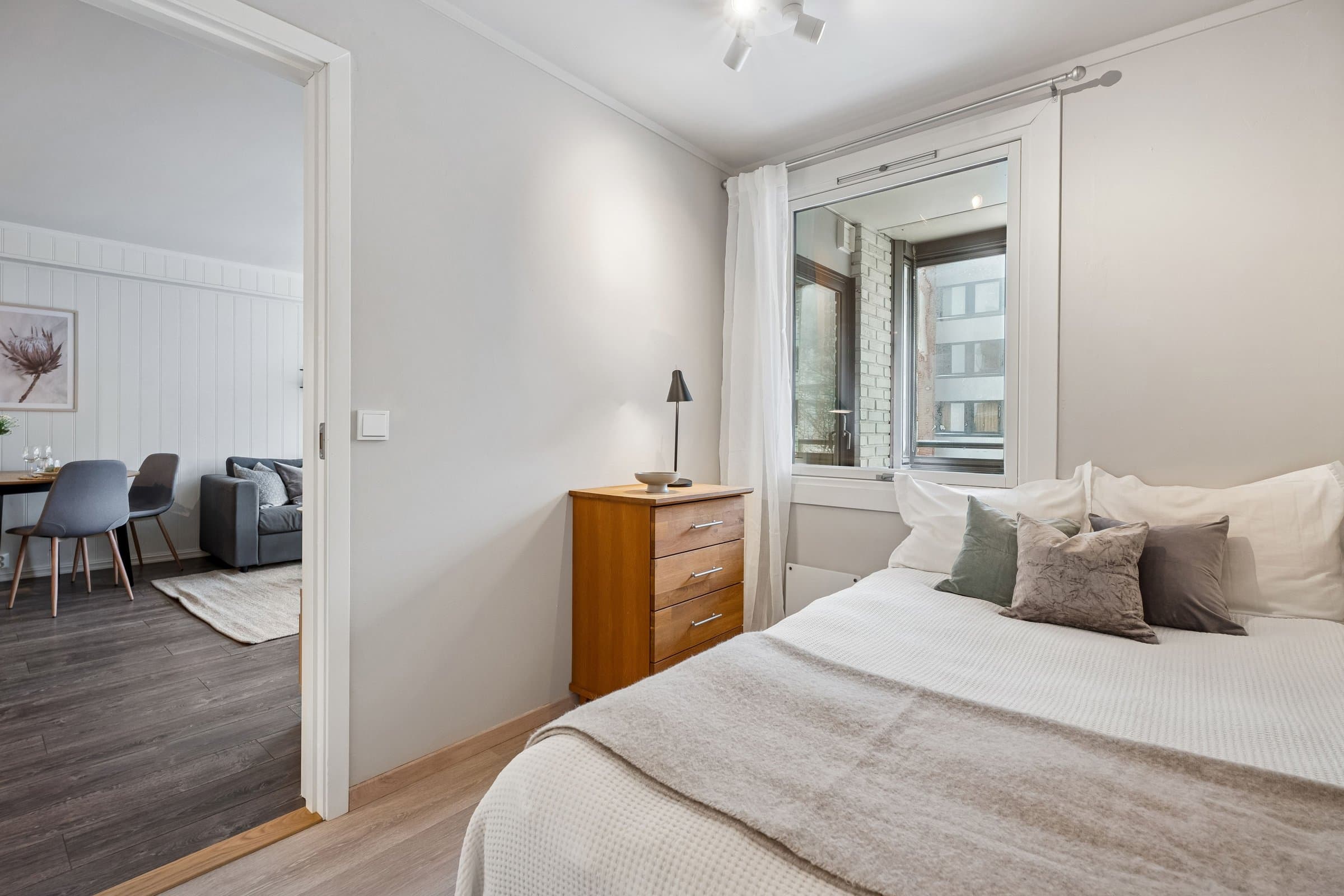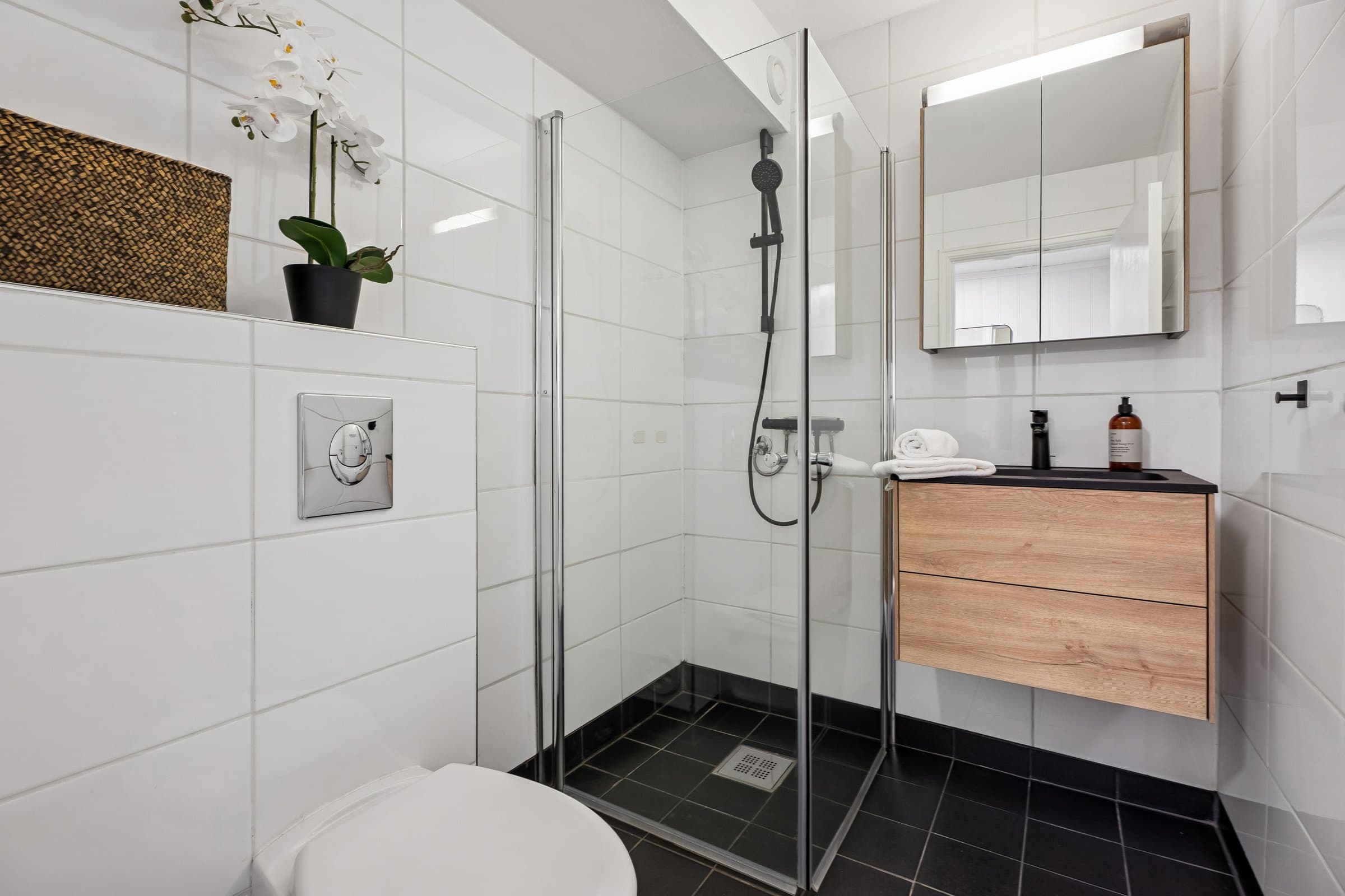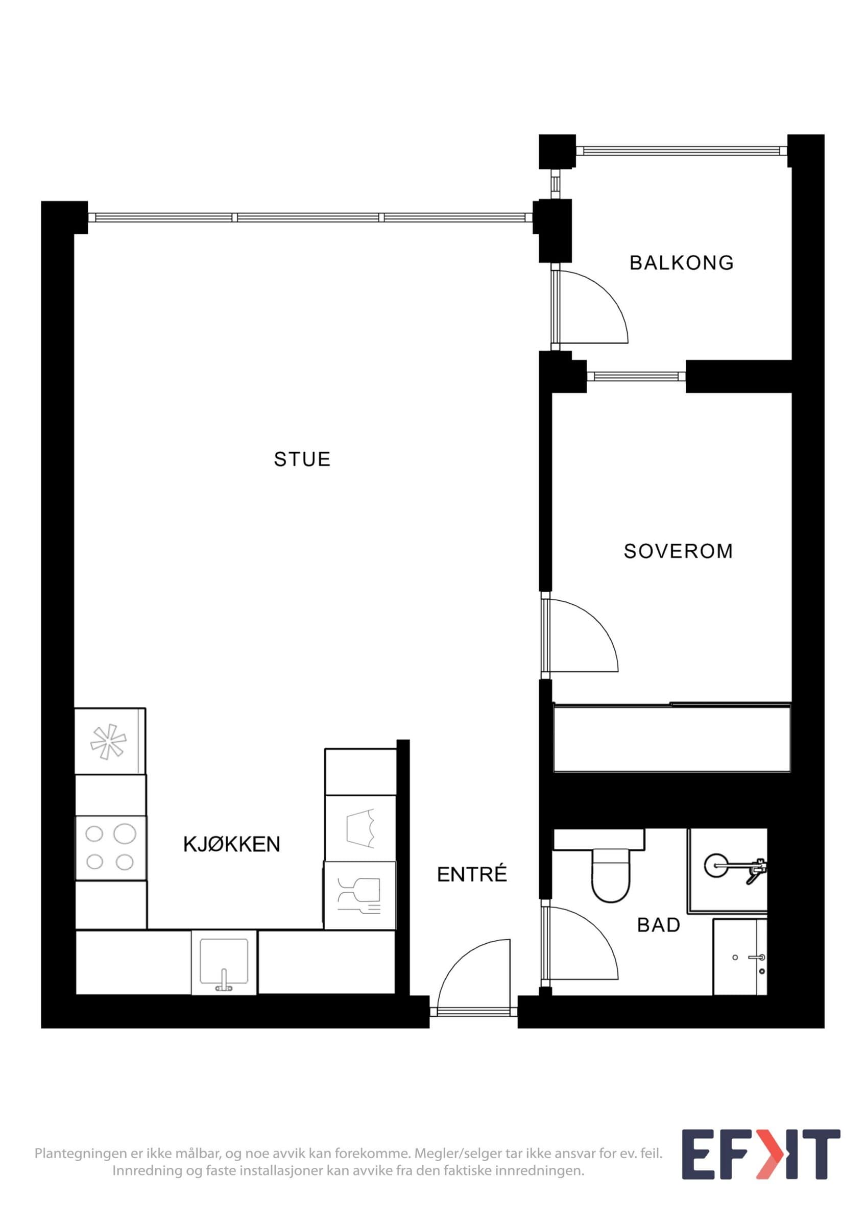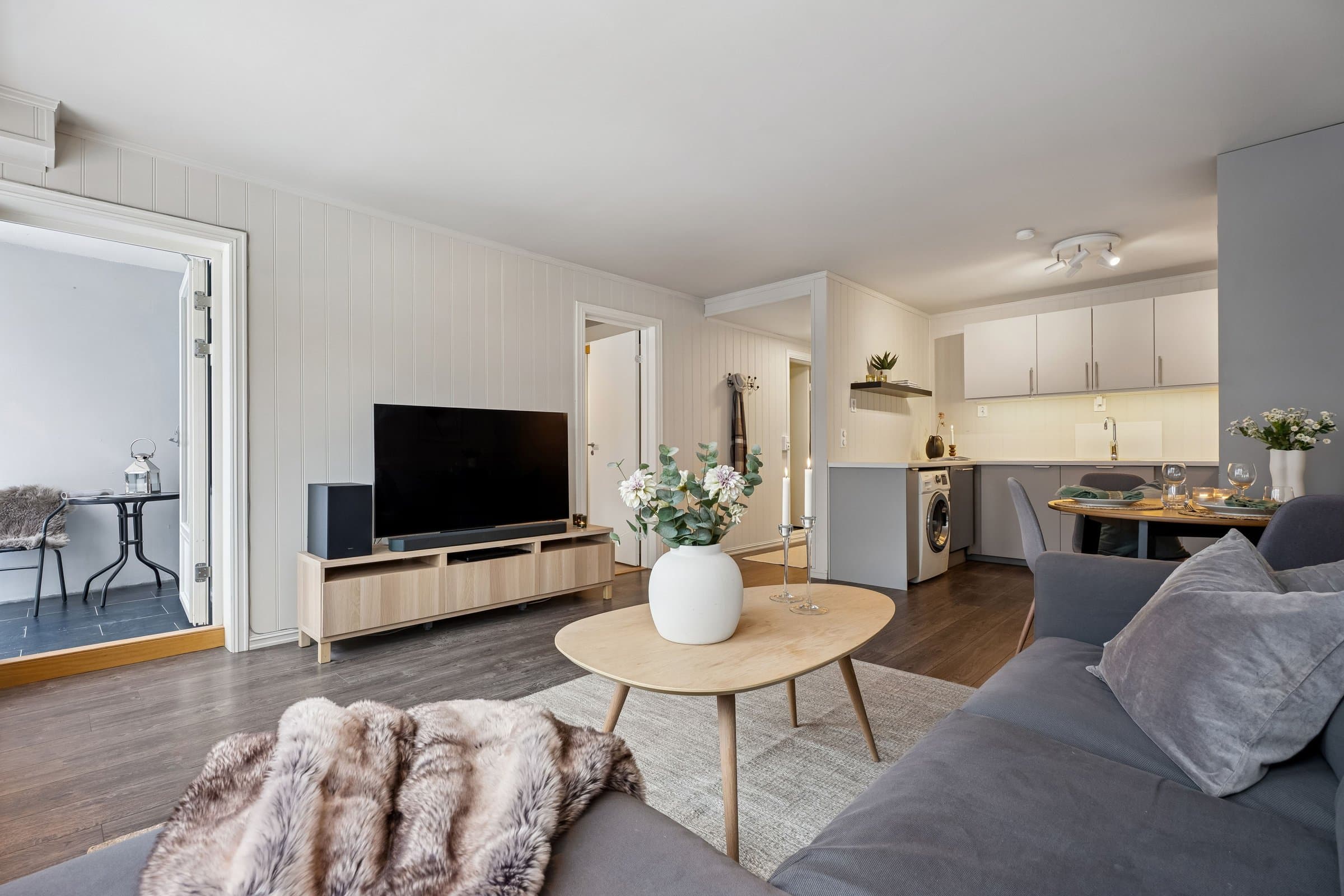 Dette er en lys og trivelig leilighet med smart planløsning. I denne leiligheten får du en praktisk og velfungerende bolig hvor kvadratmeterne er godt utnyttet. Boligen ligger i et bygg med heis, og holder en jevn og god standard på både overflater og innredning. Det følger med to boder – én i oppgangen rett overfor leiligheten, og én i kjelleren. Åpen stue- og kjøkkenløsning Stuen er et lyst og behagelig oppholdsrom med gode vindusflater som slipper inn rikelig med dagslys. Herfra har du også direkte tilgang til den vestvendte innglassede balkongen, som fungerer som et hyggelig ekstra rom store deler av året. Den åpne løsningen mot kjøkkenet gjør rommet luftig, og det er god plass til både spisebord og sofagruppe. Kjøkkeninnredningen ble fornyet i 2024, med moderne fronter, laminert benkeplate og god skapplass. Overskapene harmonerer fint med resten av innredningen og gir et helhetlig uttrykk. Integrert komfyr, koketopp og kjøleskap følger med, sammen med oppvaskmaskin og vaskemaskin som også har fått plass på kjøkkenet. Separat soverom Soverommet har god størrelse og er utstyrt med en romslig garderobe fra 2024 som gir gode oppbevaringsmuligheter. Badet er helfliset og fikk ny, moderne innredning i 2023. Her finner du dusjhjørne, vegghengt toalett, baderomsmøbel med servant og speilskap, varme i gulvet, mekanisk avtrekk og detaljer i sort som gir et tidsriktig uttrykk. Innglasset vestvendt balkong som gir en lun oppholdssone - perfekt for å nyte kveldssola, utsikten og forlenge sesongen både vår og høst. Felles tørke- og luftebalkong for beboere i hver etasje.
