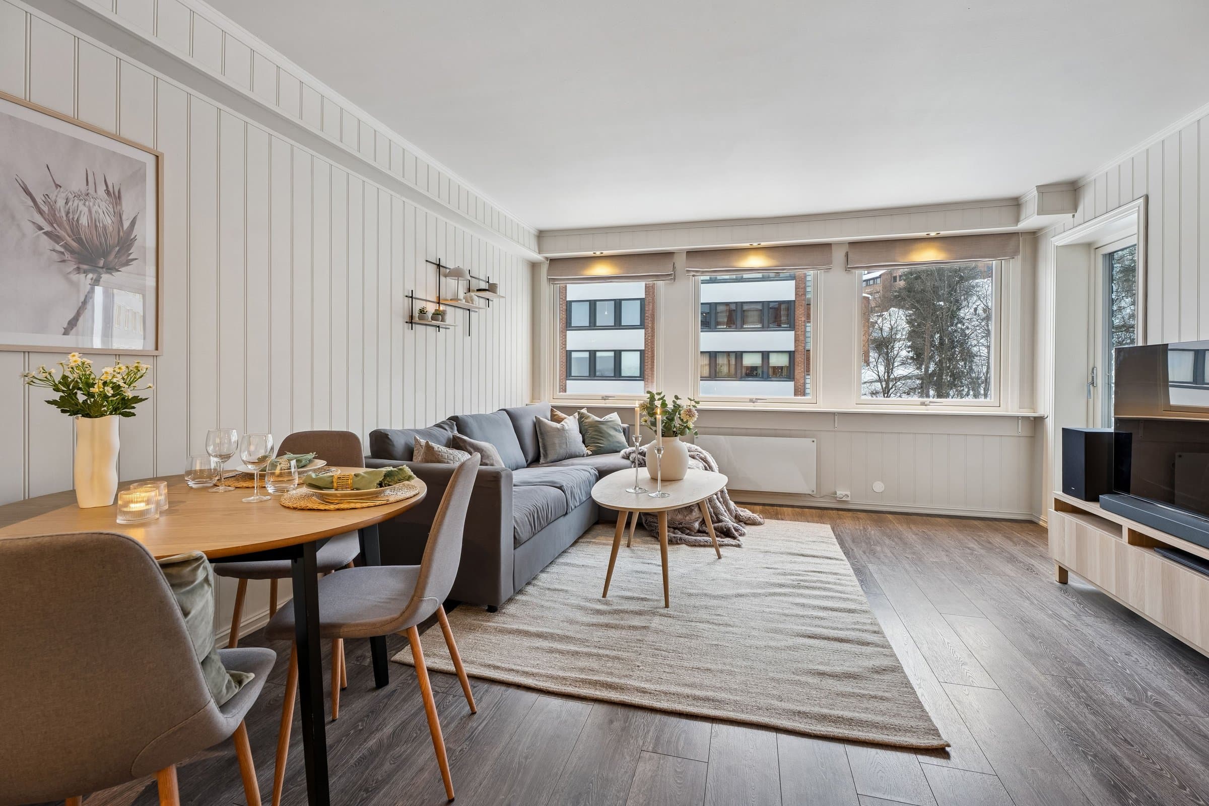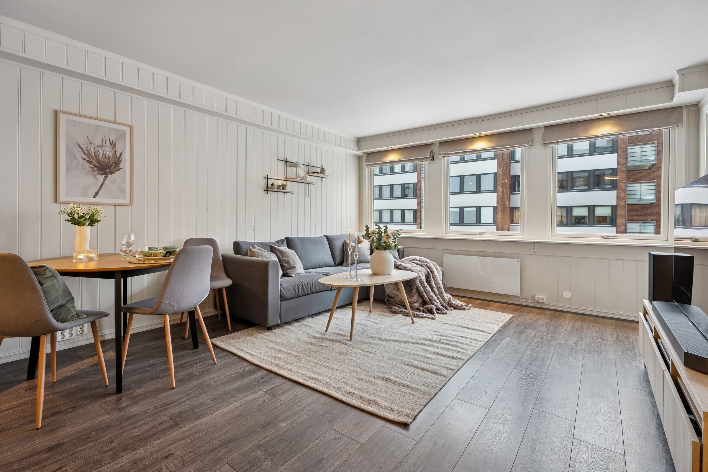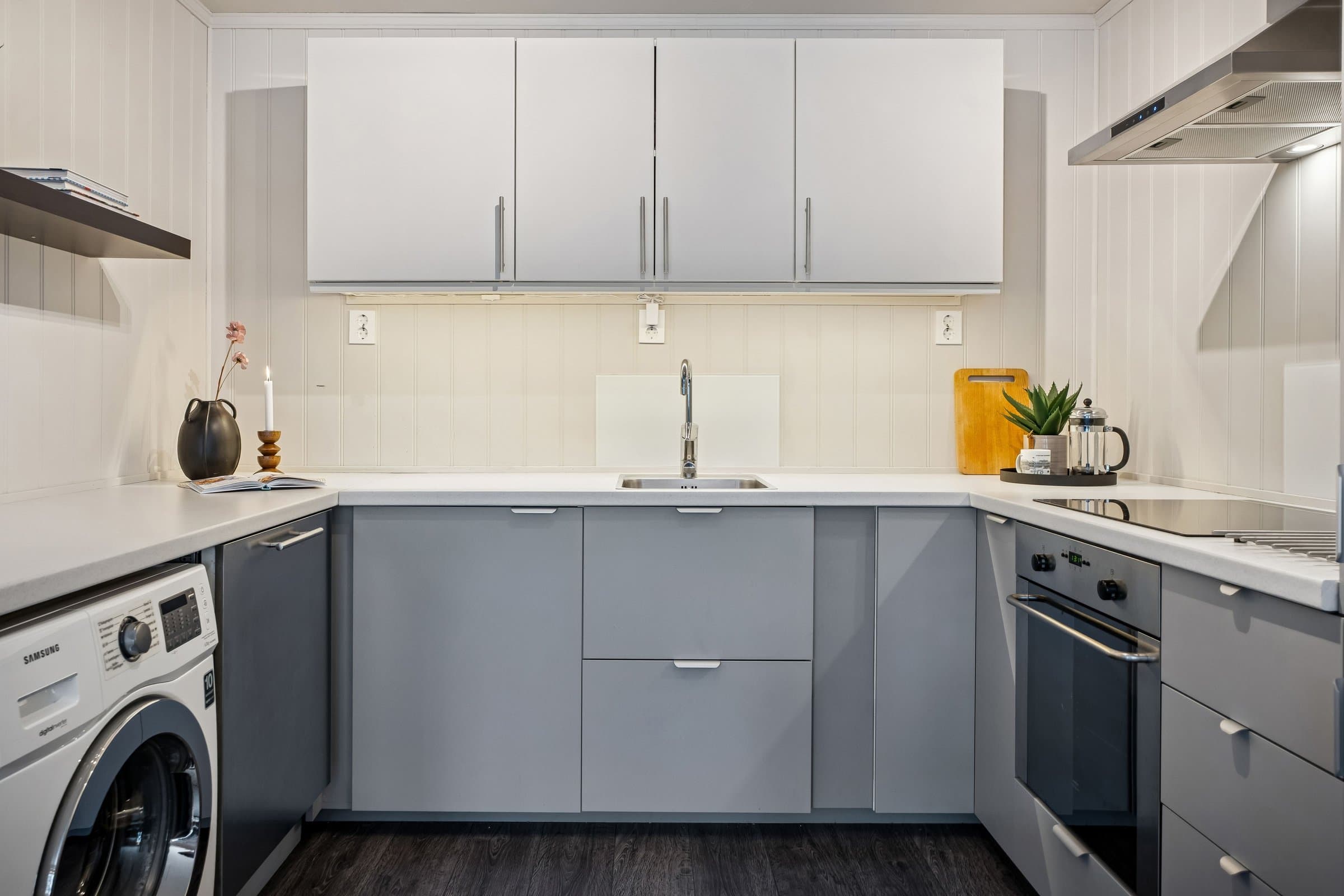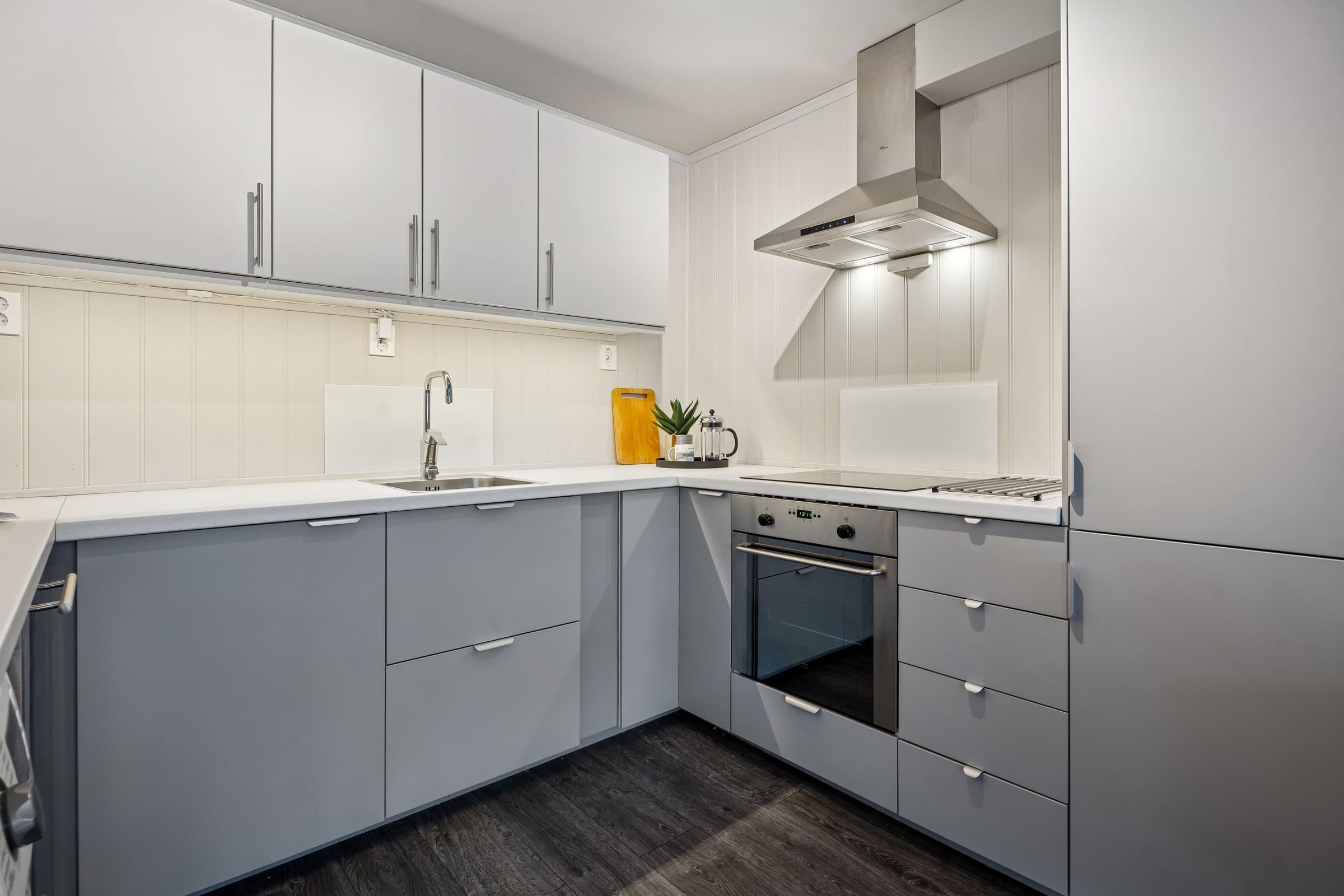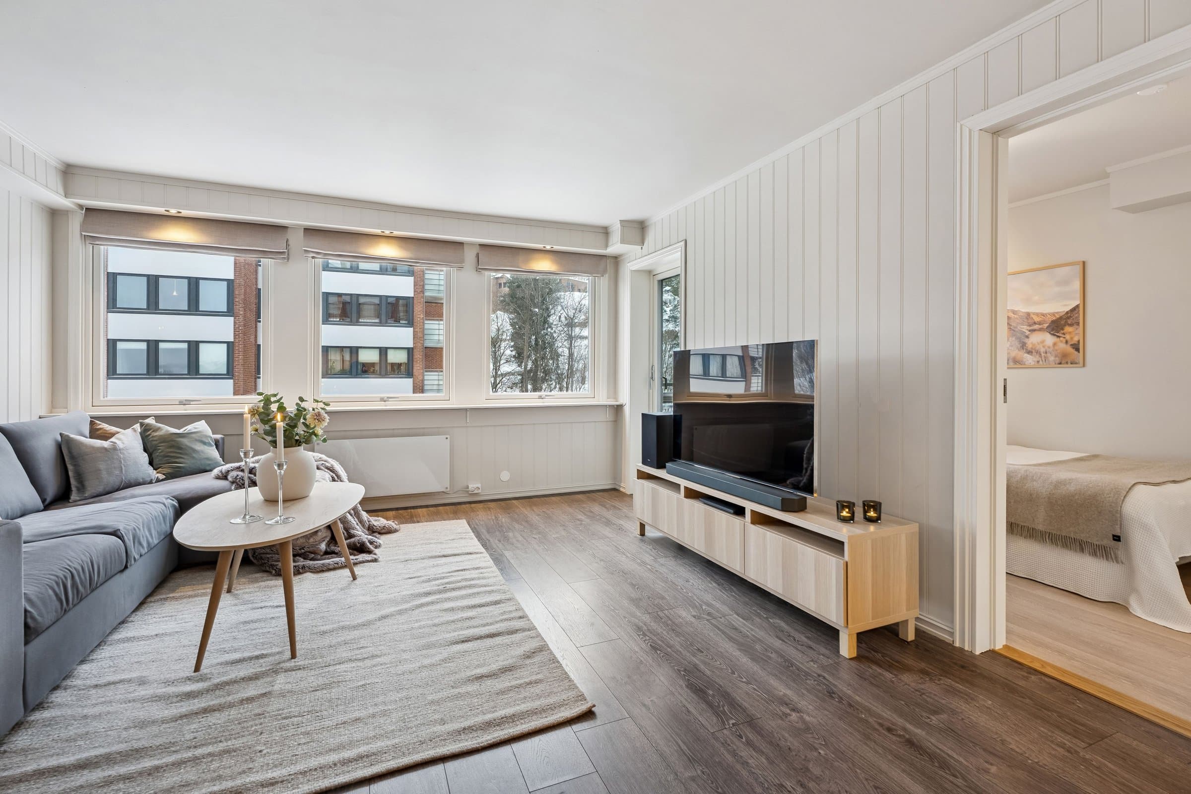 Dette er en lys og trivelig leilighet med smart planløsning. I denne leiligheten får du en praktisk og velfungerende bolig hvor kvadratmeterne er godt utnyttet. Boligen ligger i et bygg med heis, og holder en jevn og god standard på både overflater og innredning. Det følger med to boder – én i oppgangen rett overfor leiligheten, og én i kjelleren. Åpen stue- og kjøkkenløsning Stuen er et lyst og behagelig oppholdsrom med gode vindusflater som slipper inn rikelig med dagslys. Herfra har du også direkte tilgang til den vestvendte innglassede balkongen, som fungerer som et hyggelig ekstra rom store deler av året. Den åpne løsningen mot kjøkkenet gjør rommet luftig, og det er god plass til både spisebord og sofagruppe. Kjøkkeninnredningen ble fornyet i 2024, med moderne fronter, laminert benkeplate og god skapplass. Overskapene harmonerer fint med resten av innredningen og gir et helhetlig uttrykk. Integrert komfyr, koketopp og kjøleskap følger med, sammen med oppvaskmaskin og vaskemaskin som også har fått plass på kjøkkenet. Separat soverom Soverommet har god størrelse og er utstyrt med en romslig garderobe fra 2024 som gir gode oppbevaringsmuligheter. Badet er helfliset og fikk ny, moderne innredning i 2023. Her finner du dusjhjørne, vegghengt toalett, baderomsmøbel med servant og speilskap, varme i gulvet, mekanisk avtrekk og detaljer i sort som gir et tidsriktig uttrykk. Innglasset vestvendt balkong som gir en lun oppholdssone - perfekt for å nyte kveldssola, utsikten og forlenge sesongen både vår og høst. Felles tørke- og luftebalkong for beboere i hver etasje.
