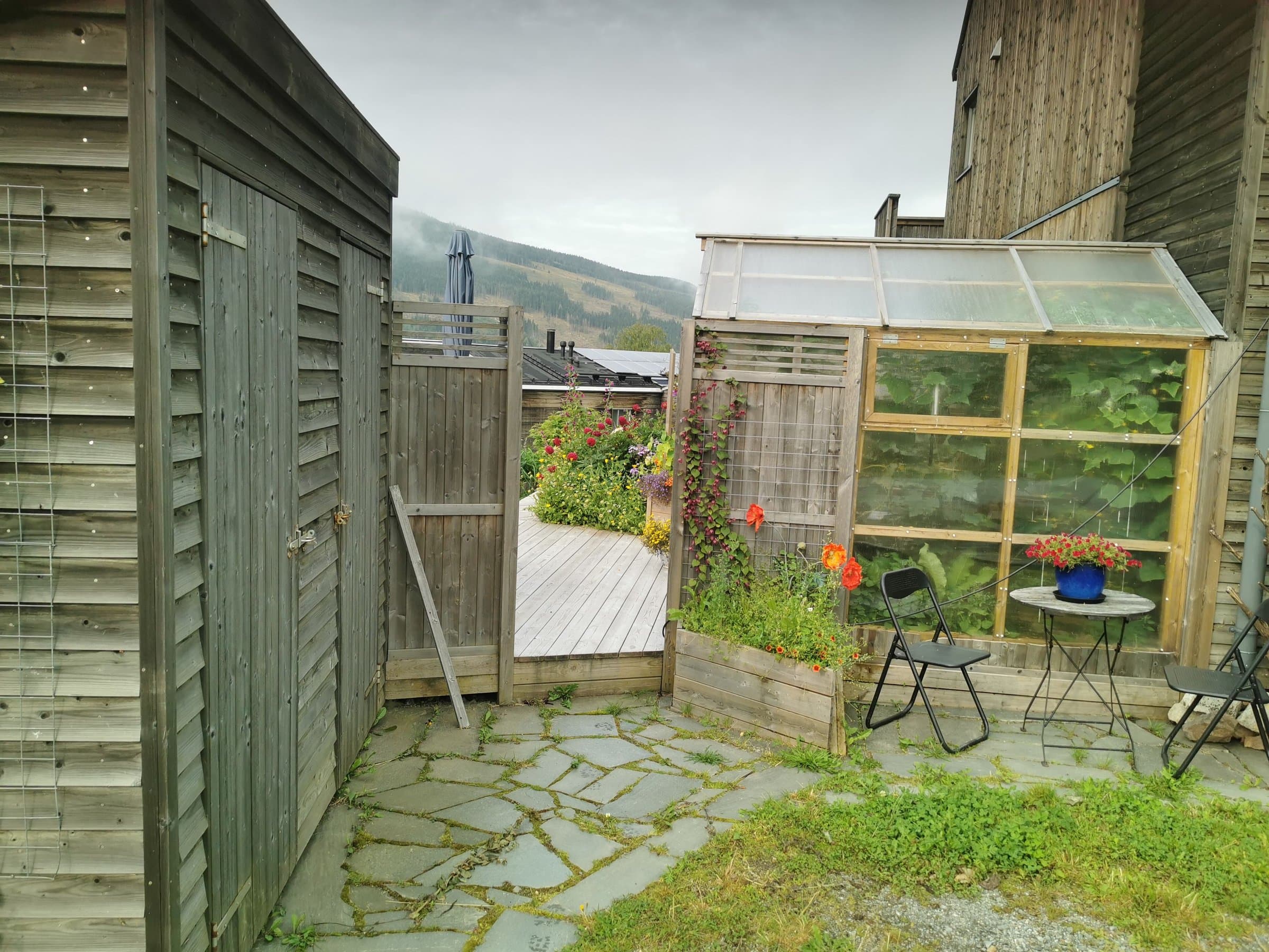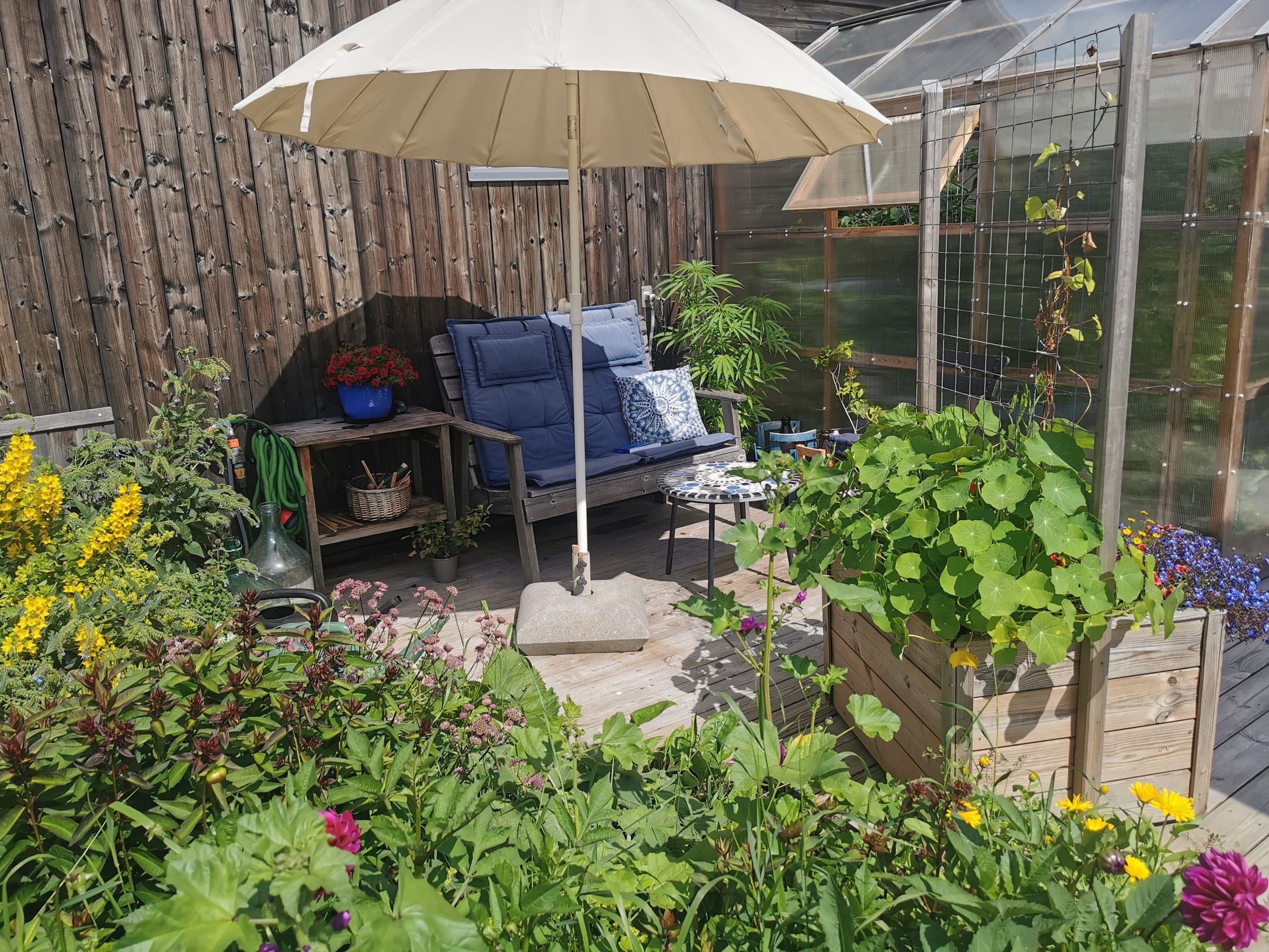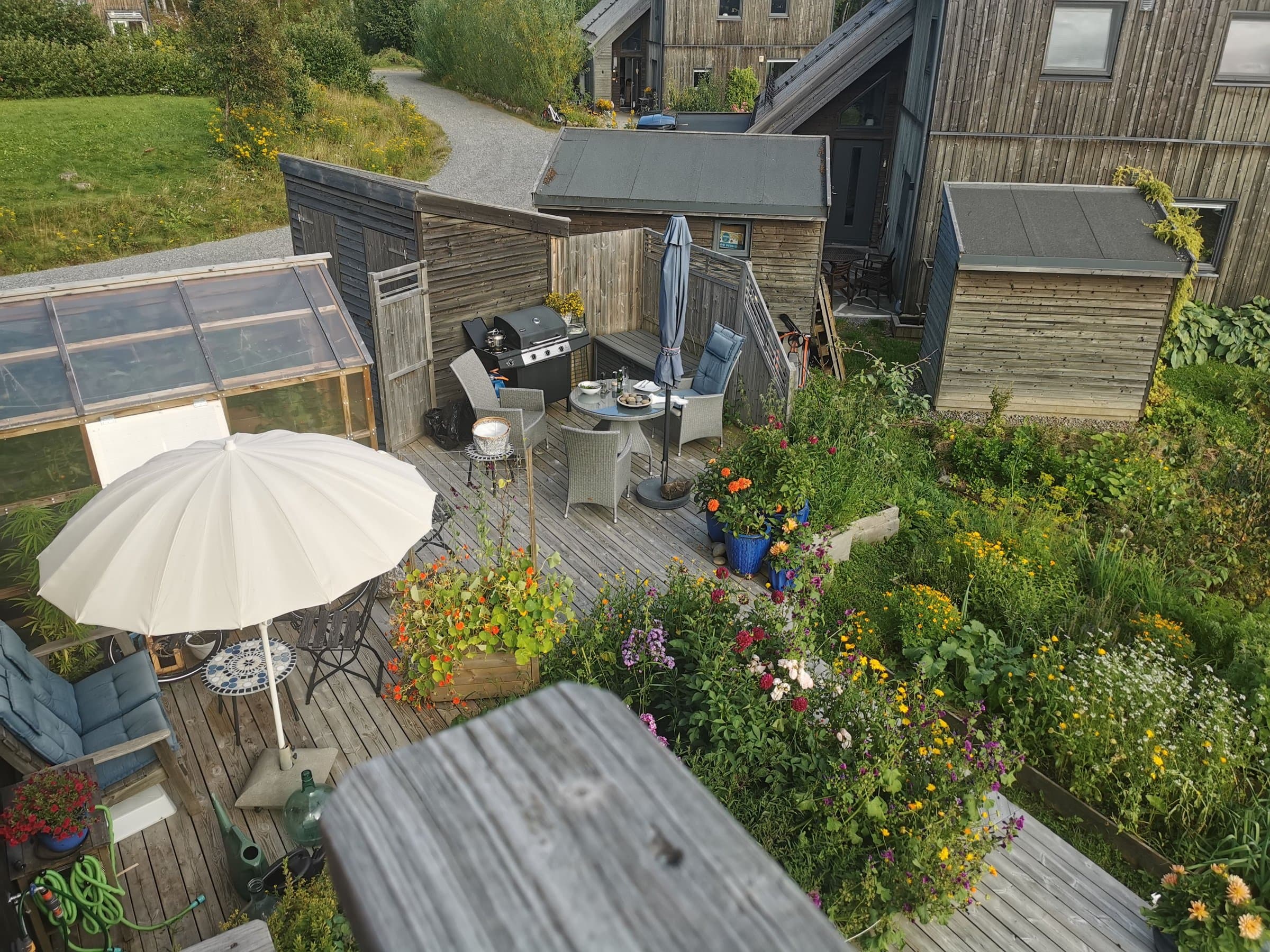 Denne leiligheten er i 2.etg. Det er hyggelige naboer i første og vi deler den 782 kvadratmeter store tomta. Området foran inngangene våre har vi definert som fellesareal, men hver av oss har ansvar for halvparten av plantekassene foran huset. Andre etasje har bruksrett til hele tomta fra husveggen i sør, opp til veien, og til nabotomta. Ved siden av plattingen i hagen er det flere pallekarmer med mulighet for dyrking av urter og grønnsaker. Videre er tomta til andre egt. definert fra leveggen ved trappa opp til verandaen - og helt ned til gjerdet til nabohusene i Nøkkefaret. På den nederst delen av tomta er det også satt opp flere pallekarmer til dyrking i tillegg til at det er bærbusker der nede.